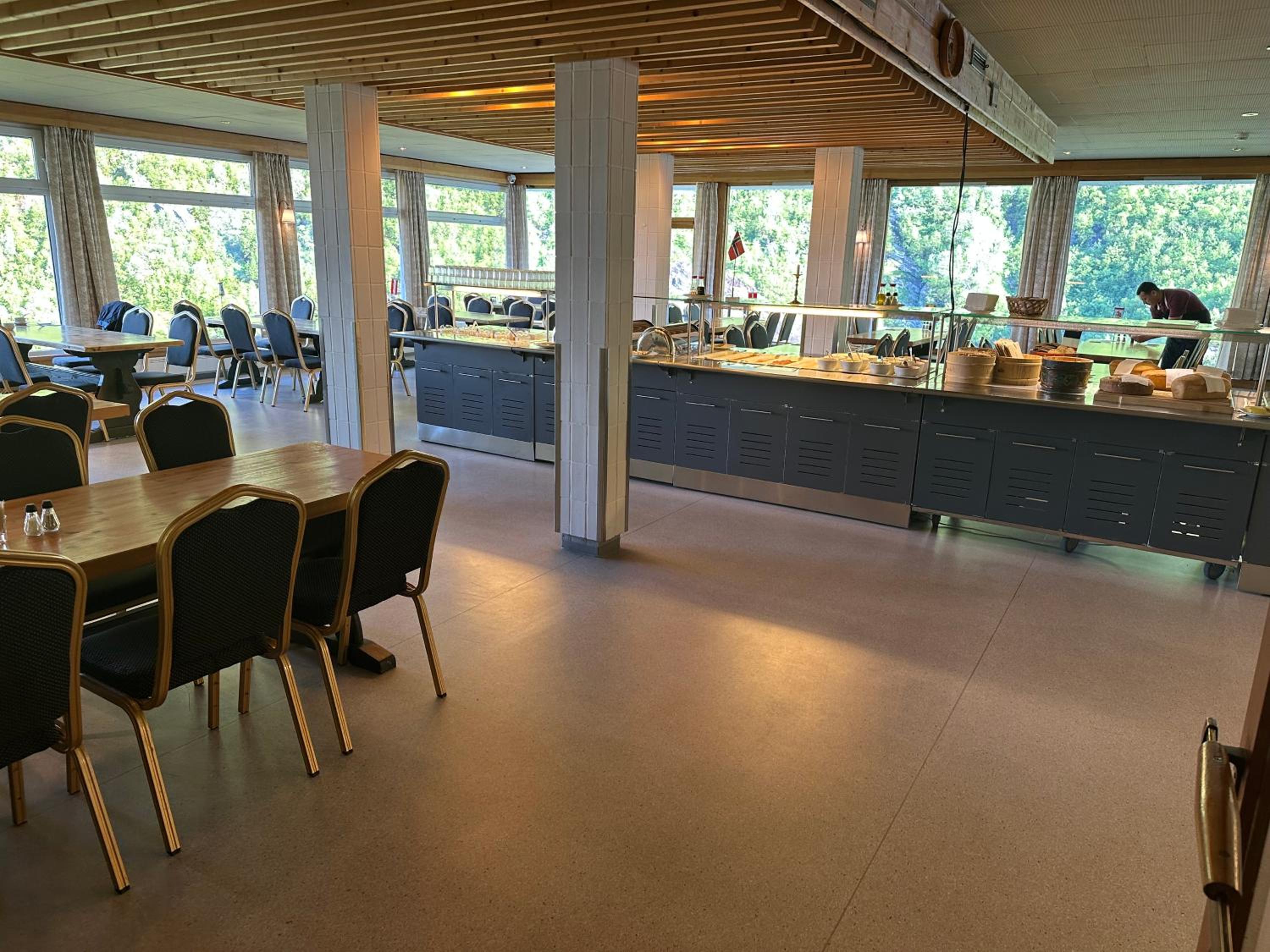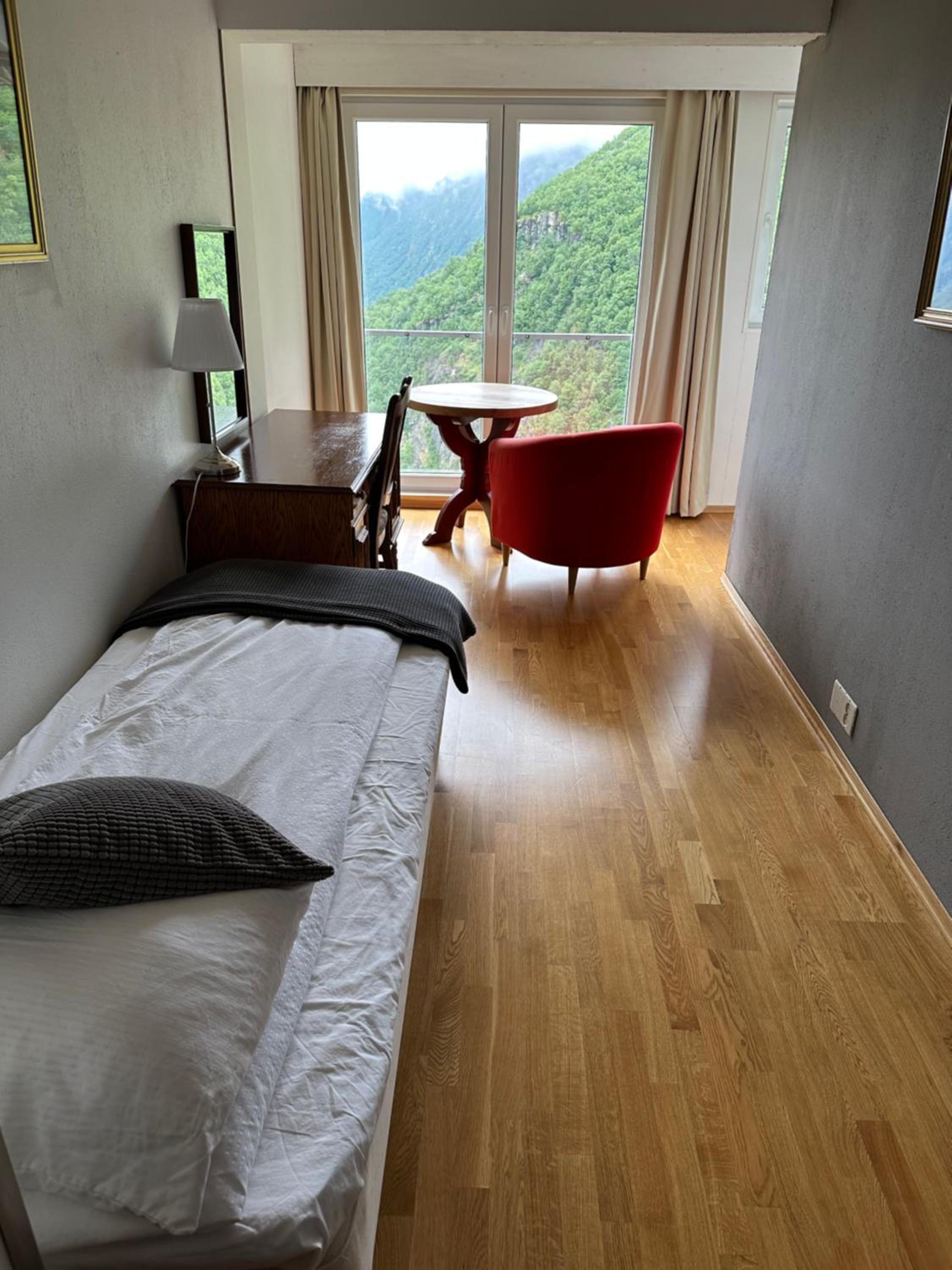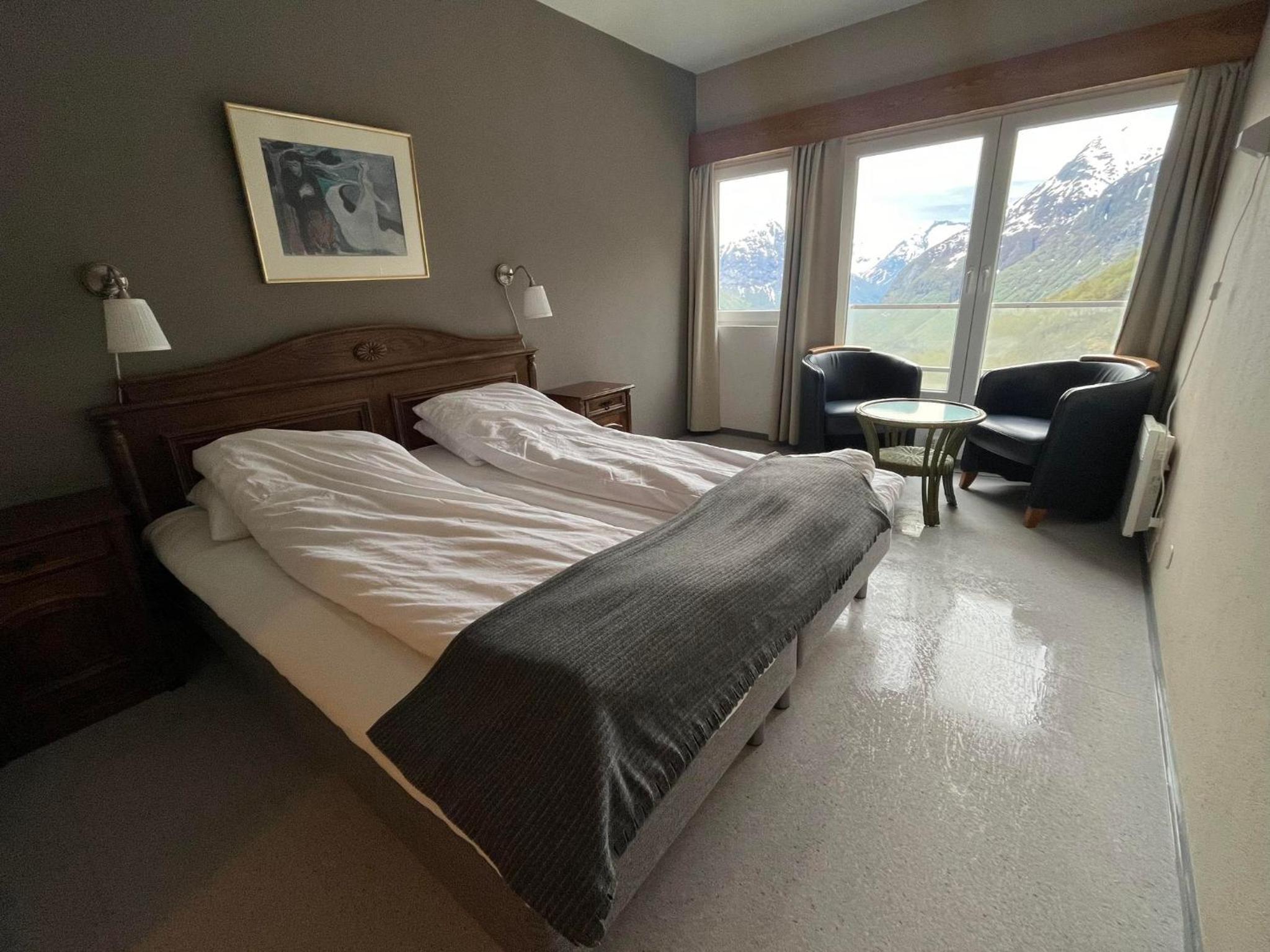 Het terras op de 1e etage was in renovatie, dus niet toegankelijk. Geen lift. Het hotel is wel toe aan een renovatie van de kamers. Prijskwaliteit van diner en ontbijt niet in orde. A la carte diner was redelijk, dinerbuffet slecht, alles lauw. Ontbijt in kleine zaal niet ok, beperkte keuze, wat warm had moeten zijn was koud en uitgedroogd. Ontbijt buffet redelijk. Diner kan je beter in Stryn doen.