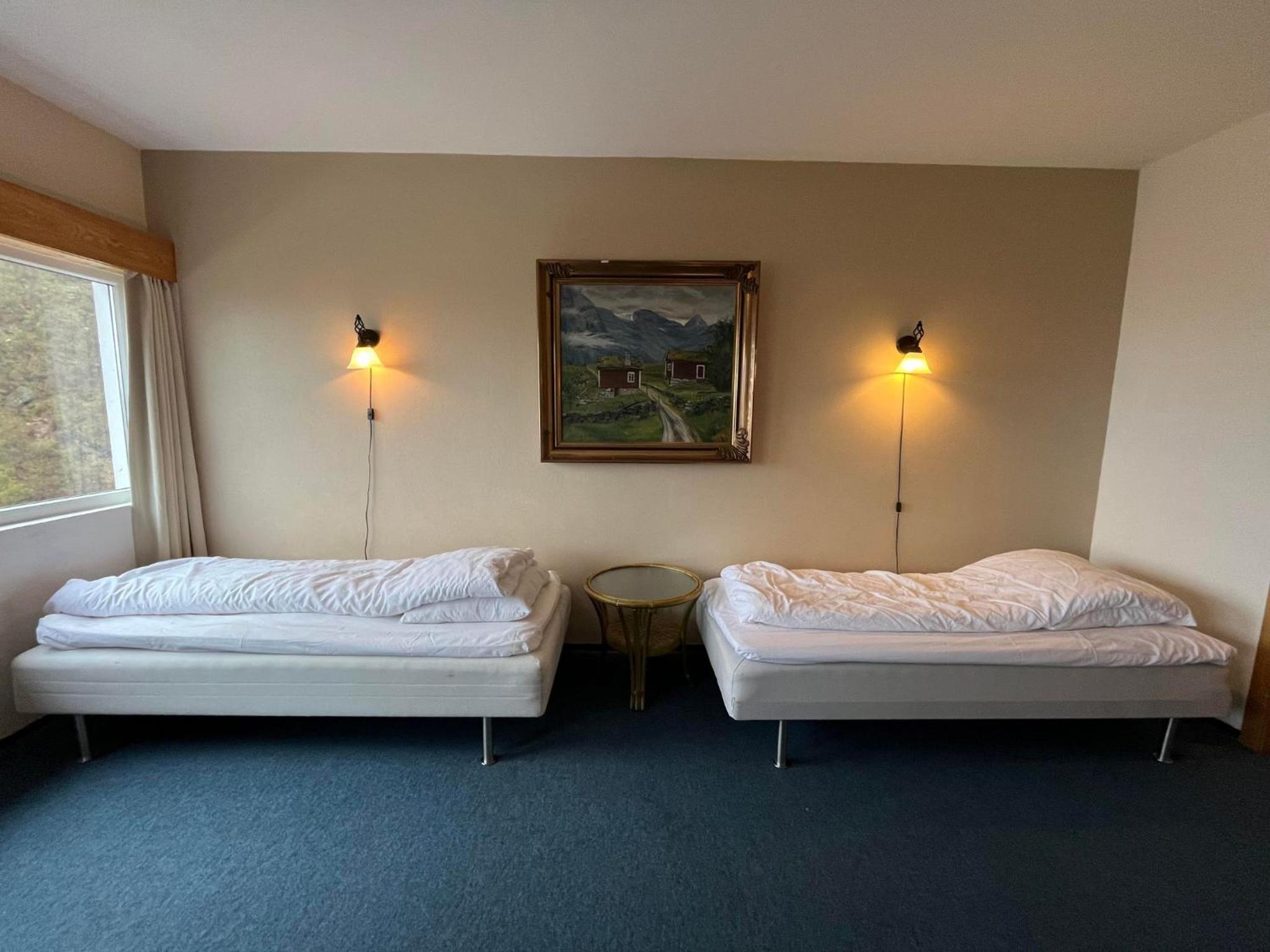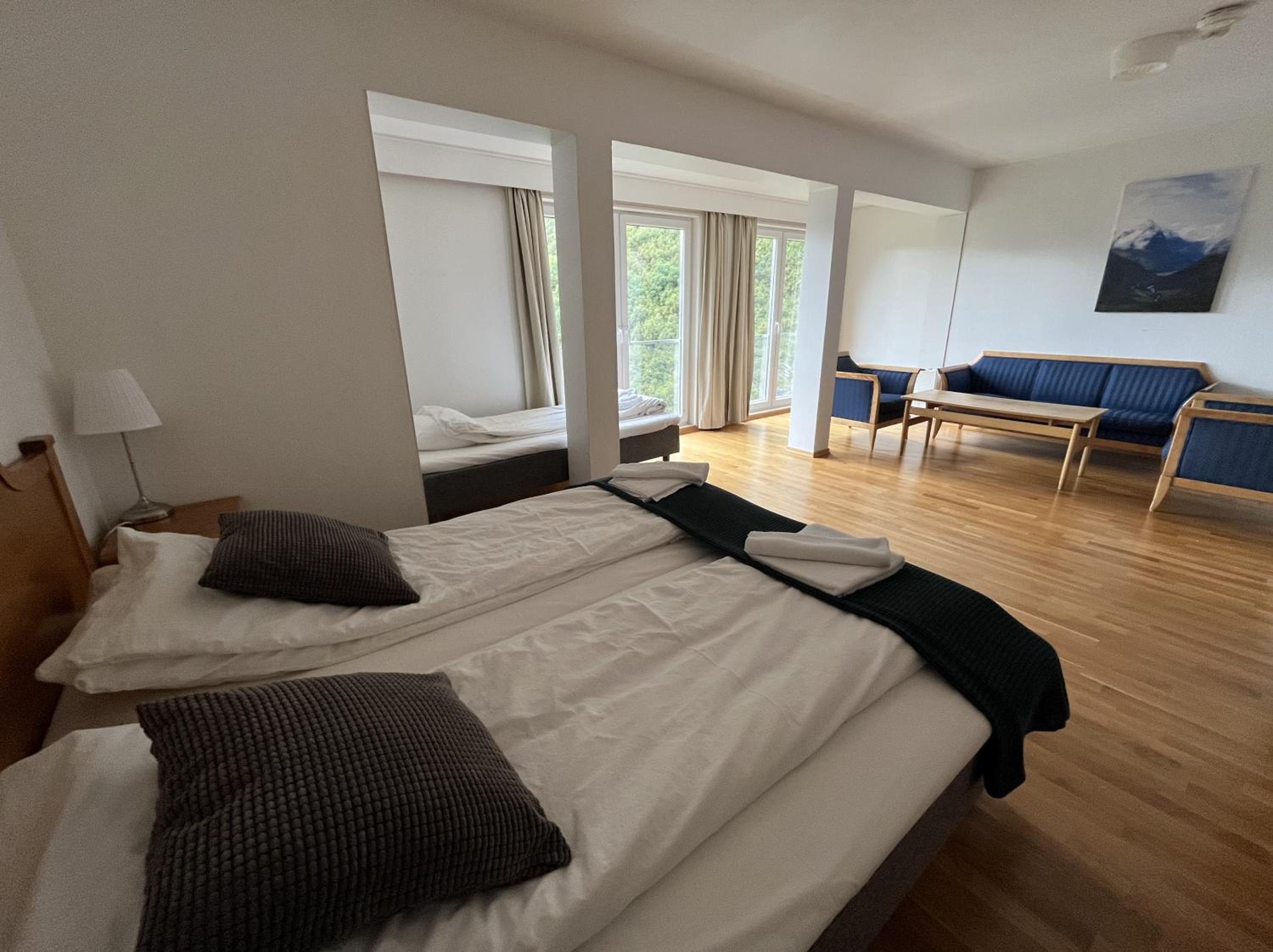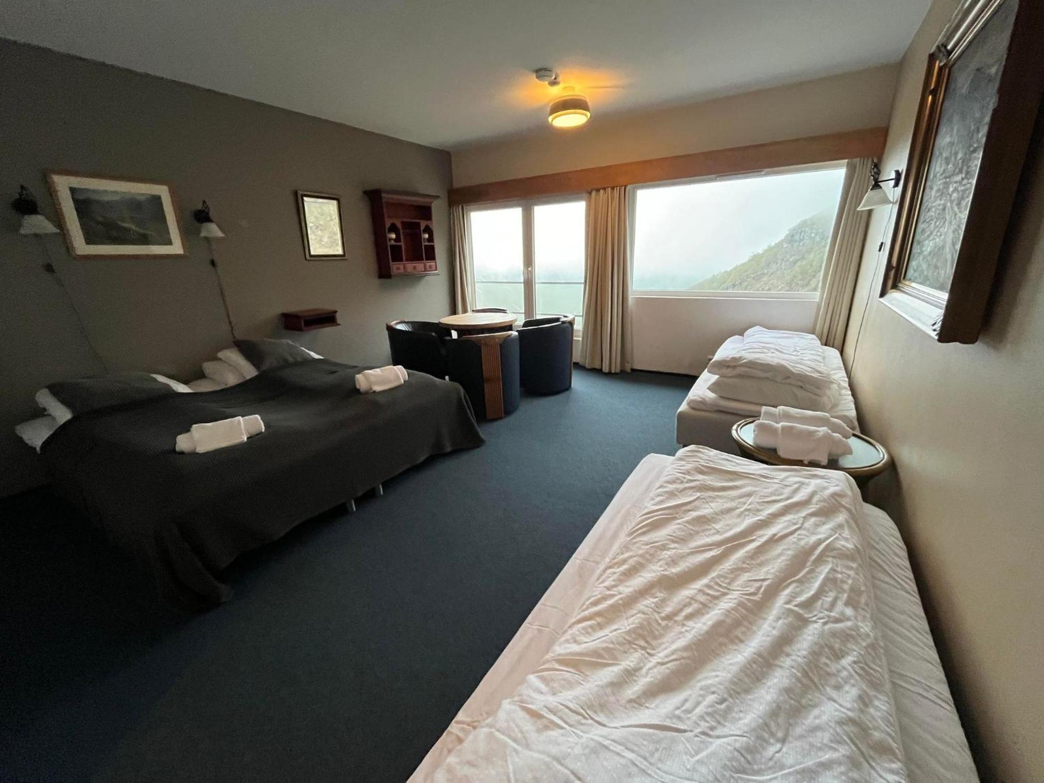 Het terras op de 1e etage was in renovatie, dus niet toegankelijk. Geen lift. Het hotel is wel toe aan een renovatie van de kamers. Prijskwaliteit van diner en ontbijt niet in orde. A la carte diner was redelijk, dinerbuffet slecht, alles lauw. Ontbijt in kleine zaal niet ok, beperkte keuze, wat warm had moeten zijn was koud en uitgedroogd. Ontbijt buffet redelijk. Diner kan je beter in Stryn doen.