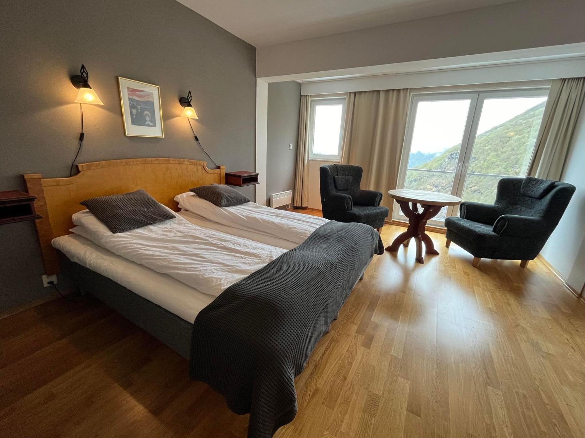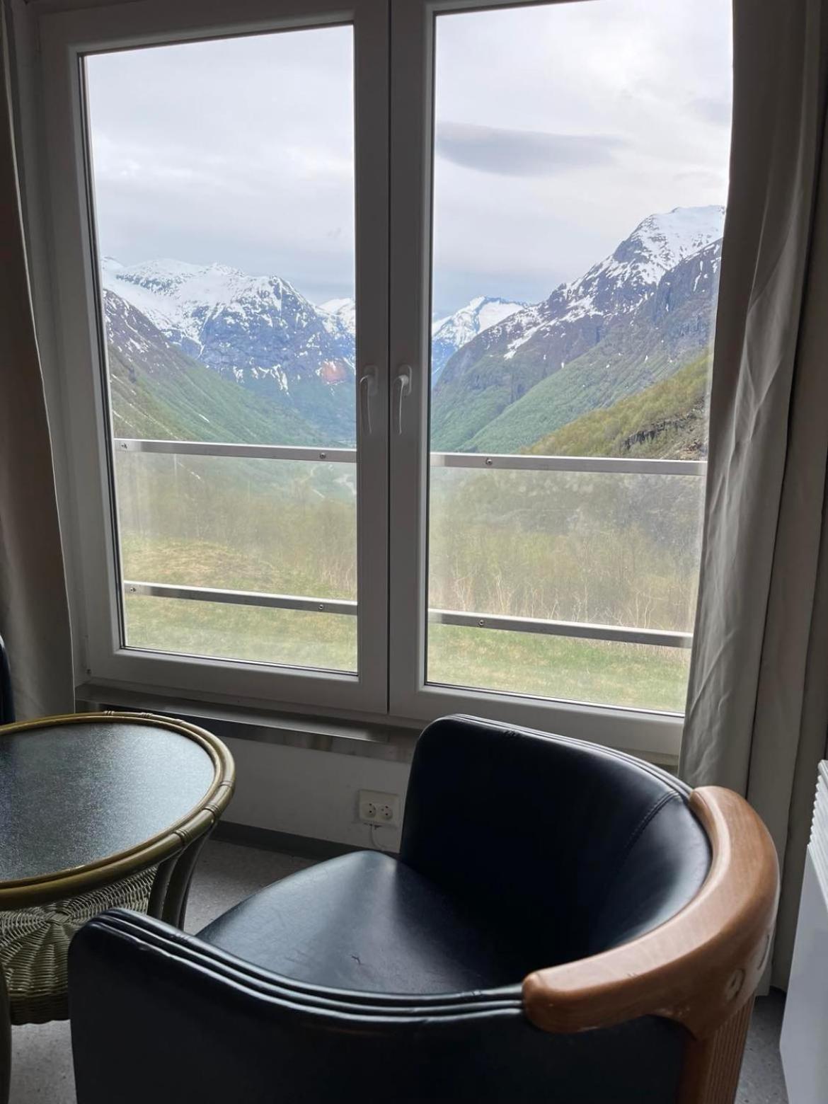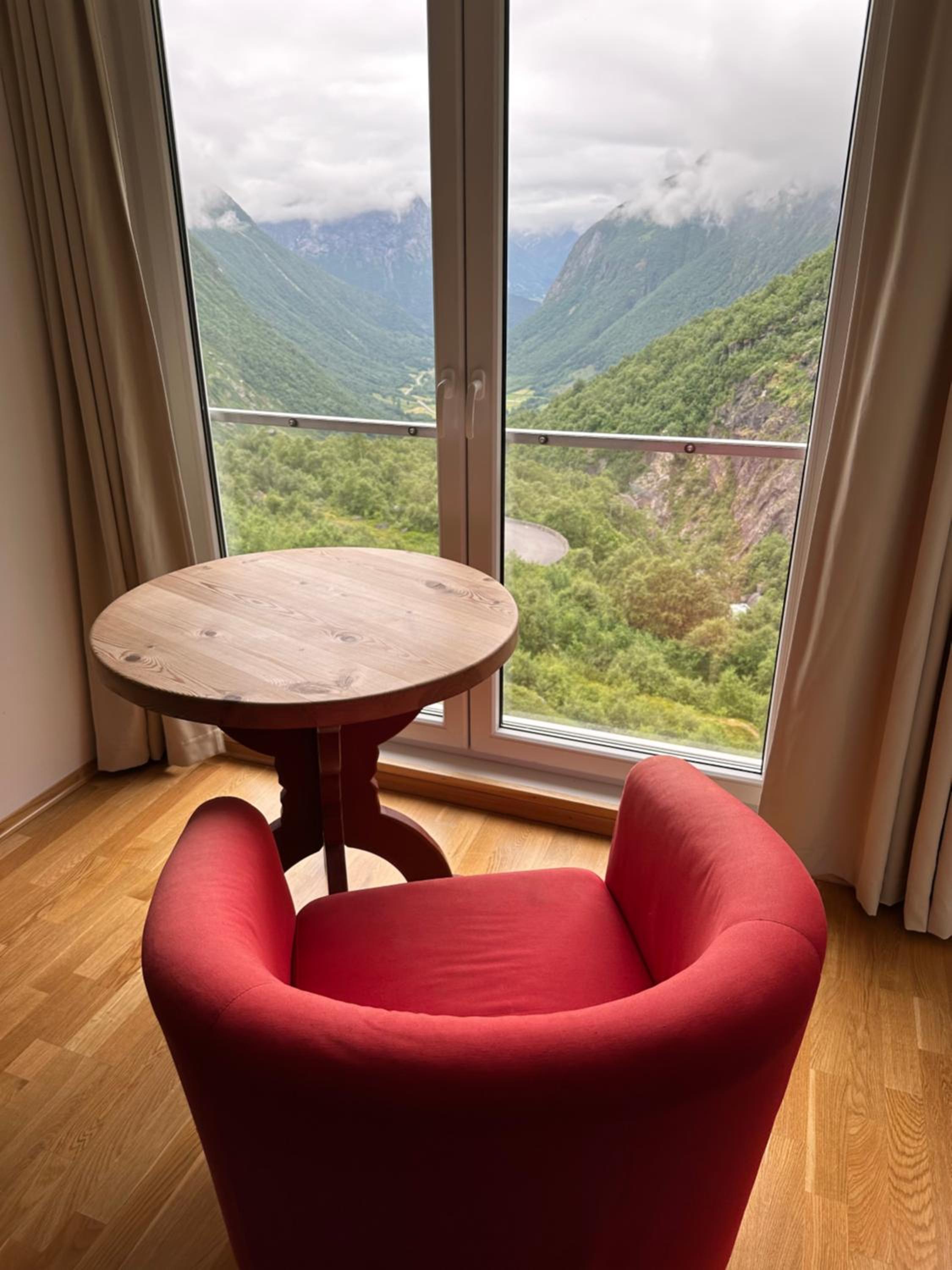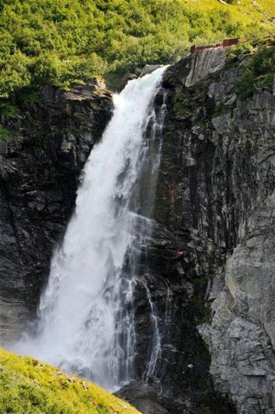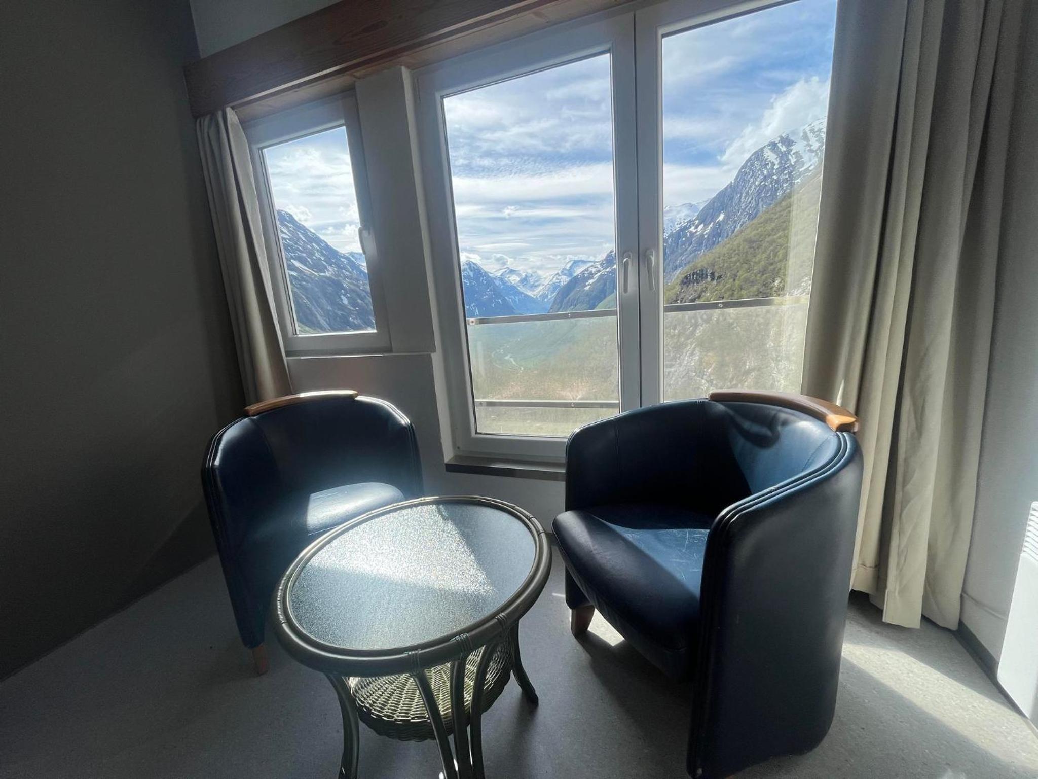 Prachtig uitzicht op het dal vanuit de kamer met comfortabele stoelen. Naast de Videfossen waterval. De andere waterval Ovstefoss vlakbij was nog mooier. Ligt aan het begin van turistveger Gamle Strynefjellvegen, prachtige route naar Grotli, deels gravel.