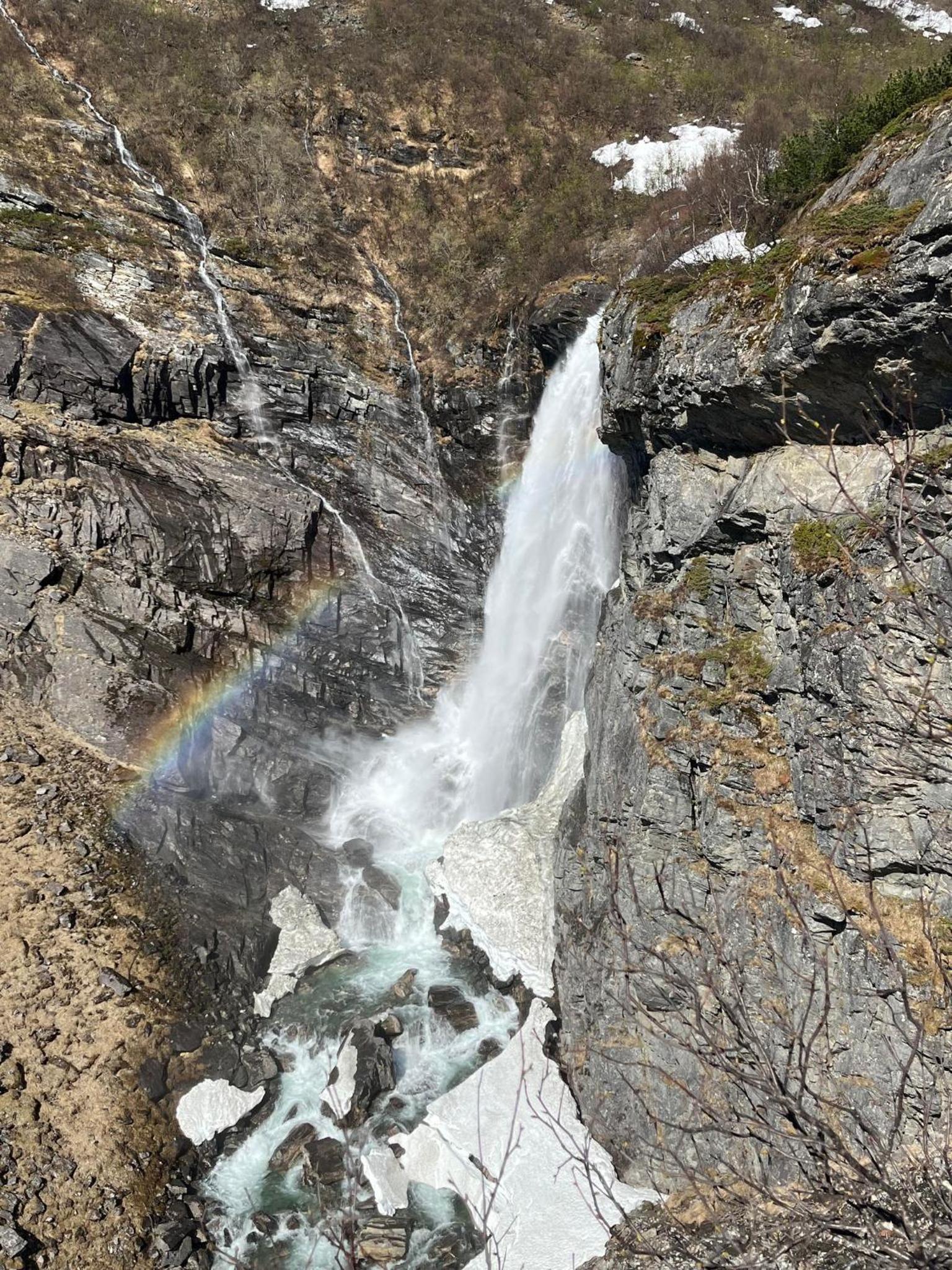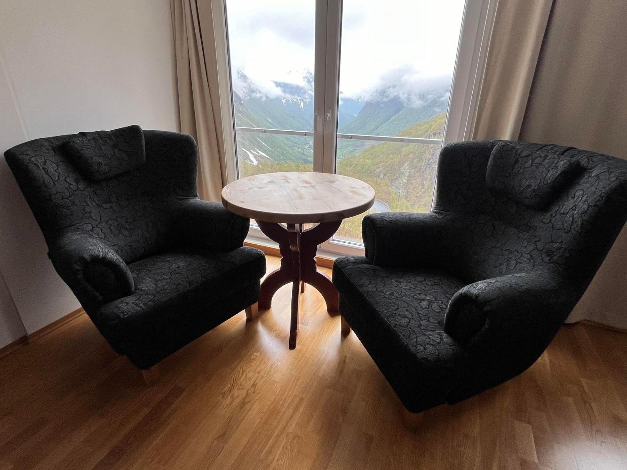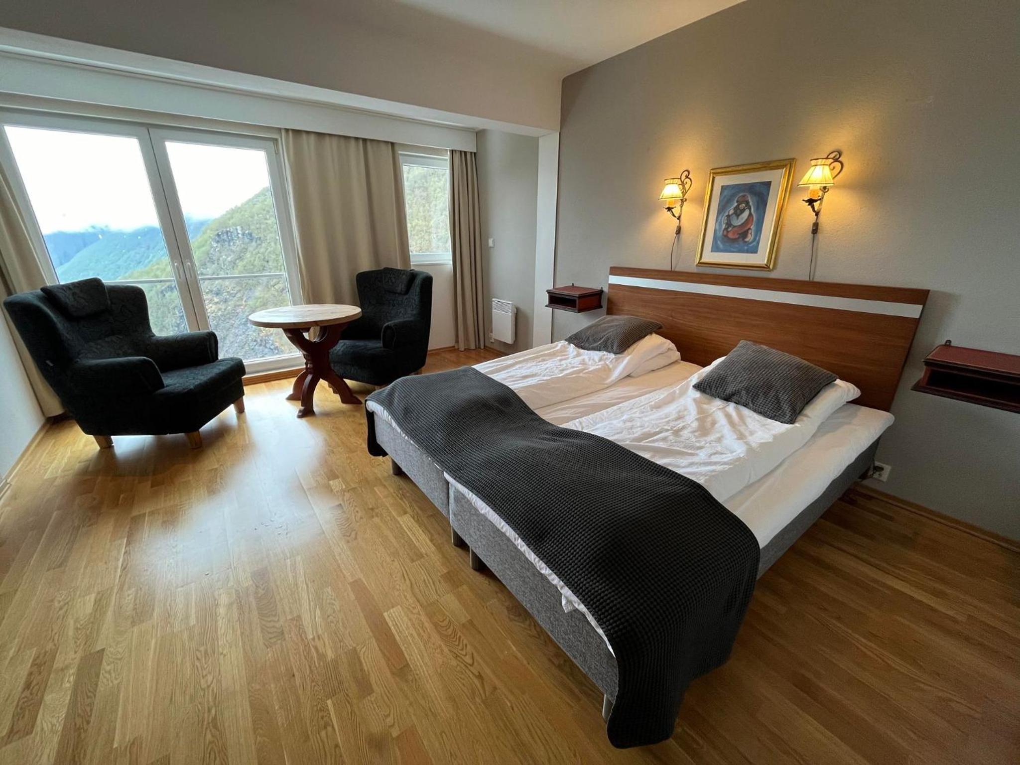 Prachtig uitzicht op het dal vanuit de kamer met comfortabele stoelen. Naast de Videfossen waterval. De andere waterval Ovstefoss vlakbij was nog mooier. Ligt aan het begin van turistveger Gamle Strynefjellvegen, prachtige route naar Grotli, deels gravel.
