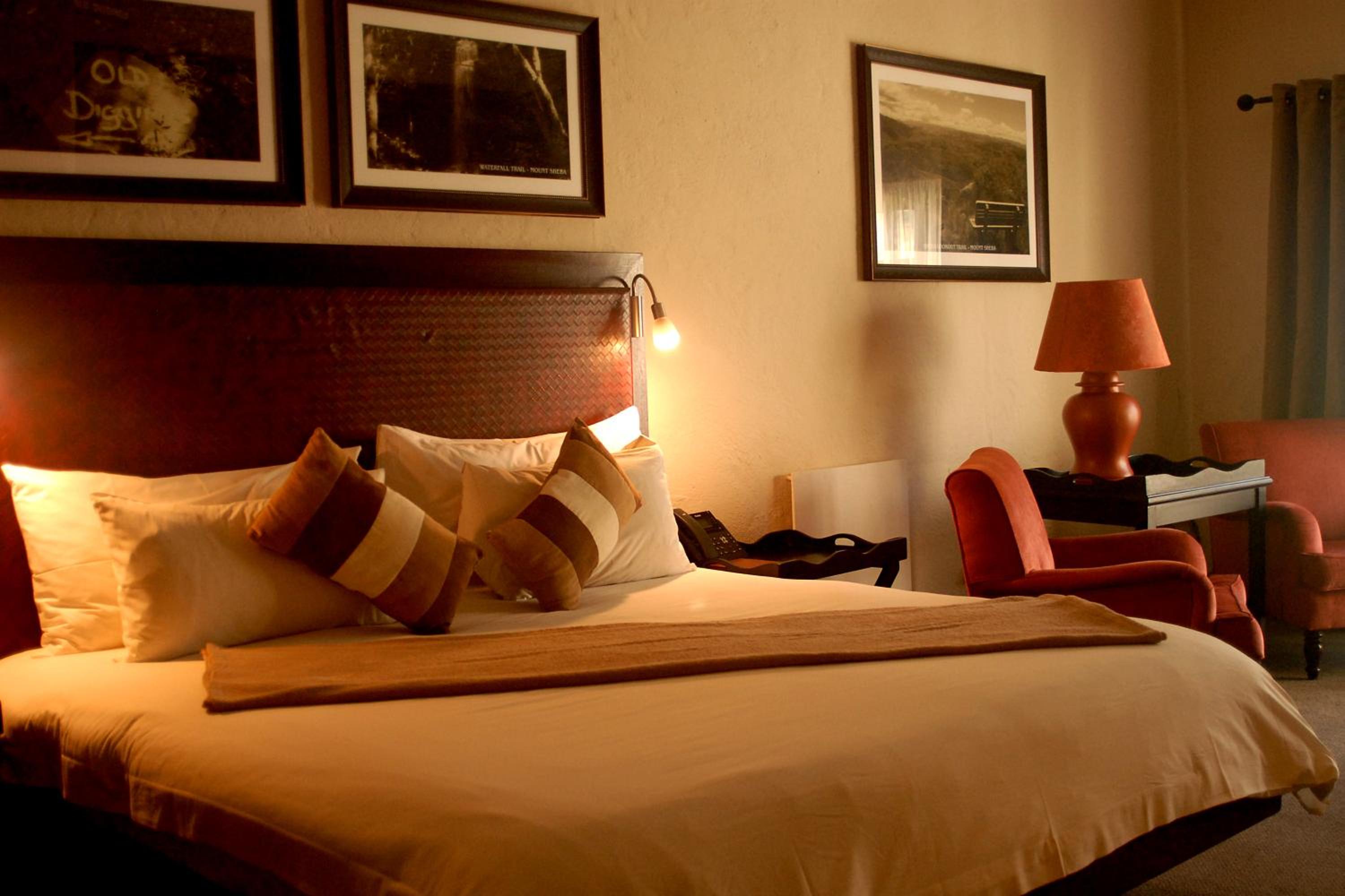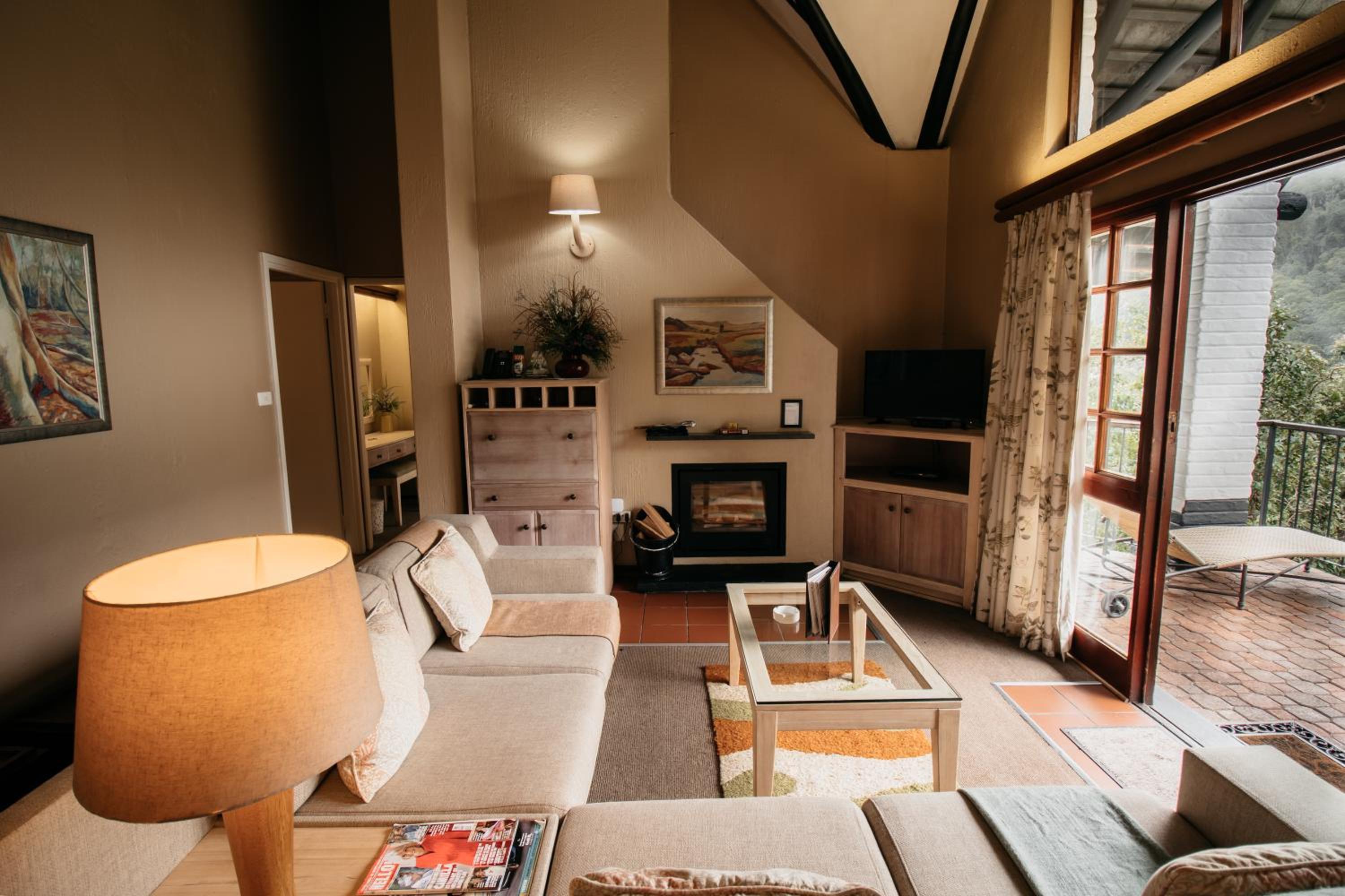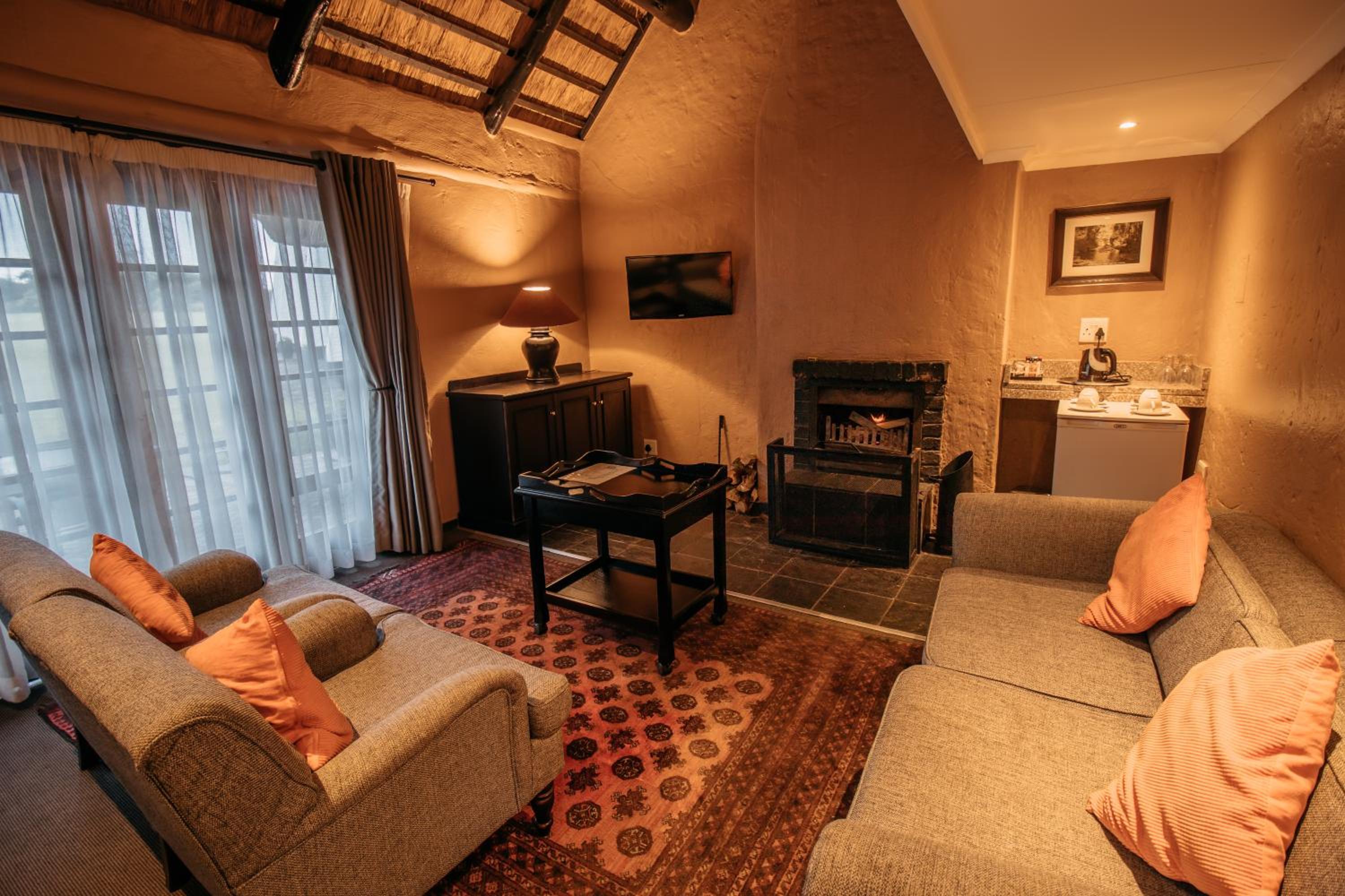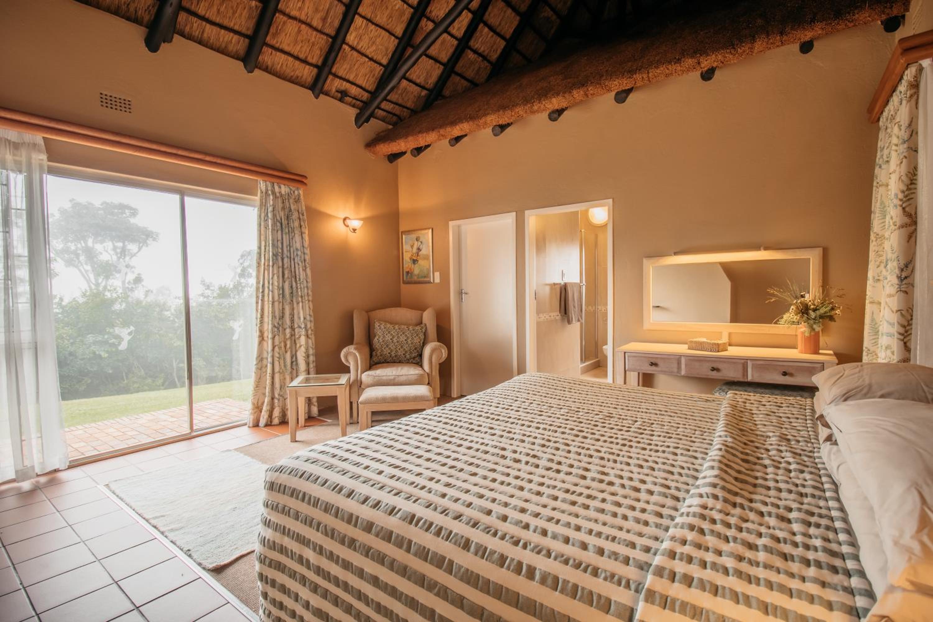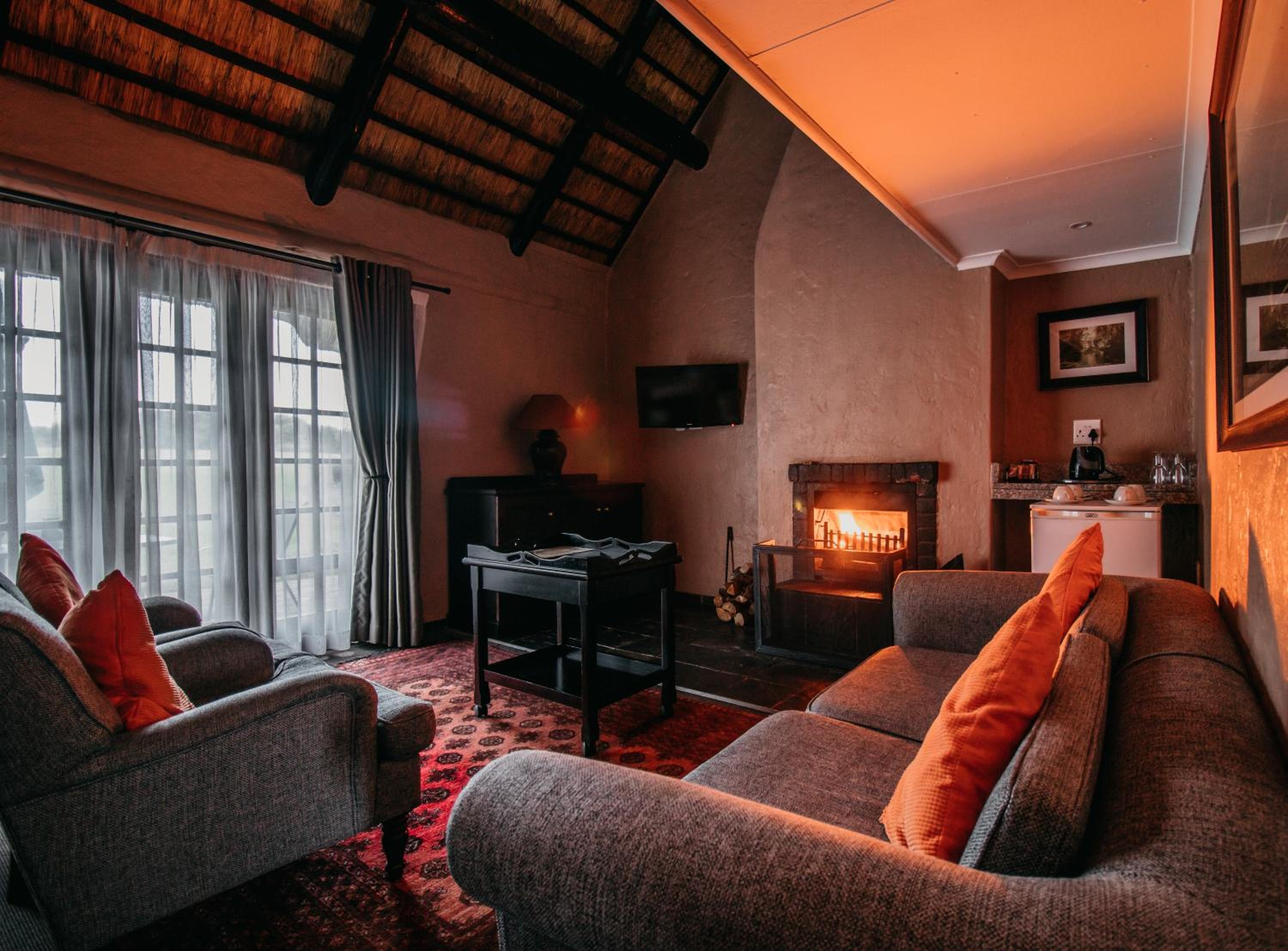 Indulge in the charm of thatched rooms at Mount Sheba, complete with modern amenities and a touch of rustic elegance. Relax by the cosy fireplace or enjoy the views from your private patio.