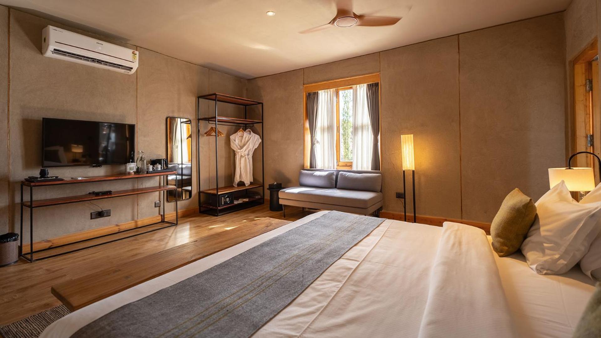 Chospa Hotel in Leh offers a luxurious stay with modern amenities and impeccable service. Each room is elegantly furnished with a flat-screen TV, comfortable bedding, and a private bathroom. The hotel's serene terrace provides a perfect spot to unwind and enjoy the breathtaking views of the surrounding landscapes.