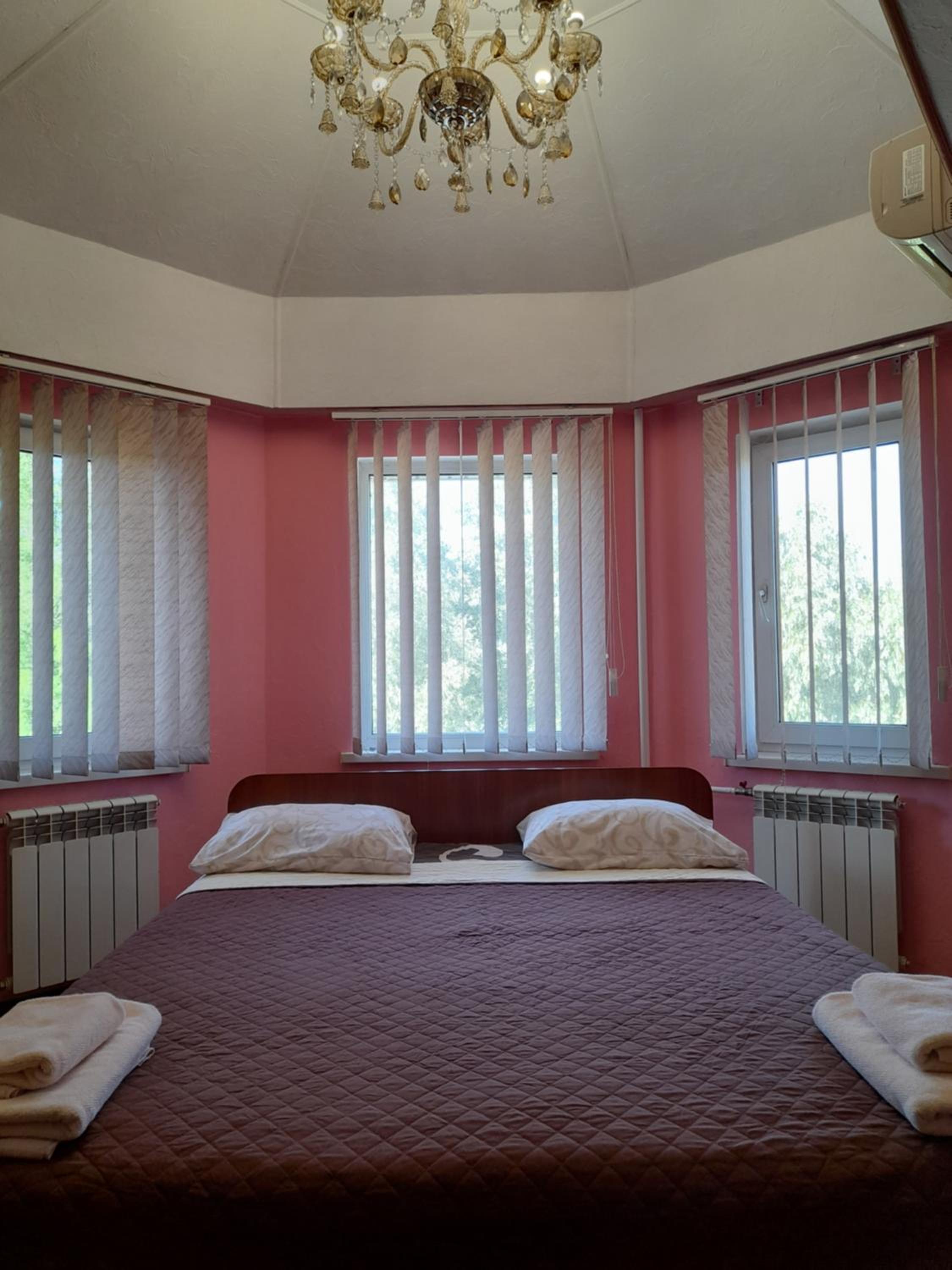 There was a spacious room, parking for many cars, and a good design of the room. It was clean and warm. The territory was small but beautiful, with a lake. Three windows and a French balcony.