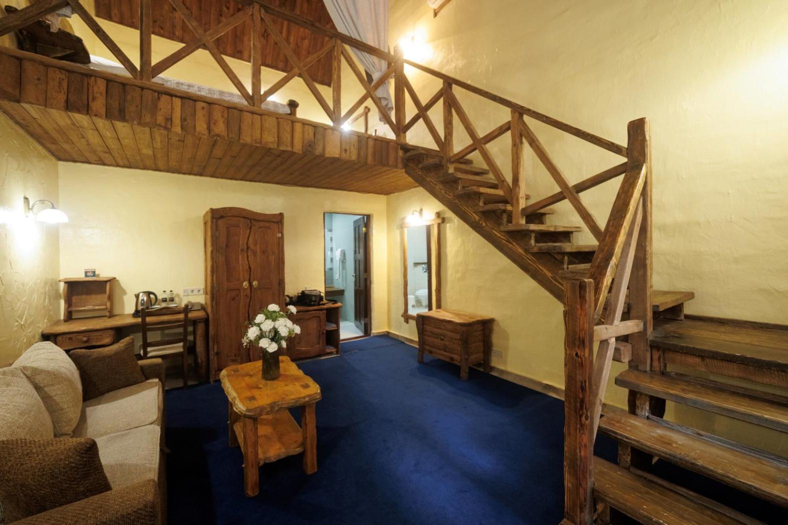 Cozy Rooms with Balconies: Experience a stay in rooms adorned with wood furniture and outdoor balconies, complete with modern amenities like satellite TV and work desks.