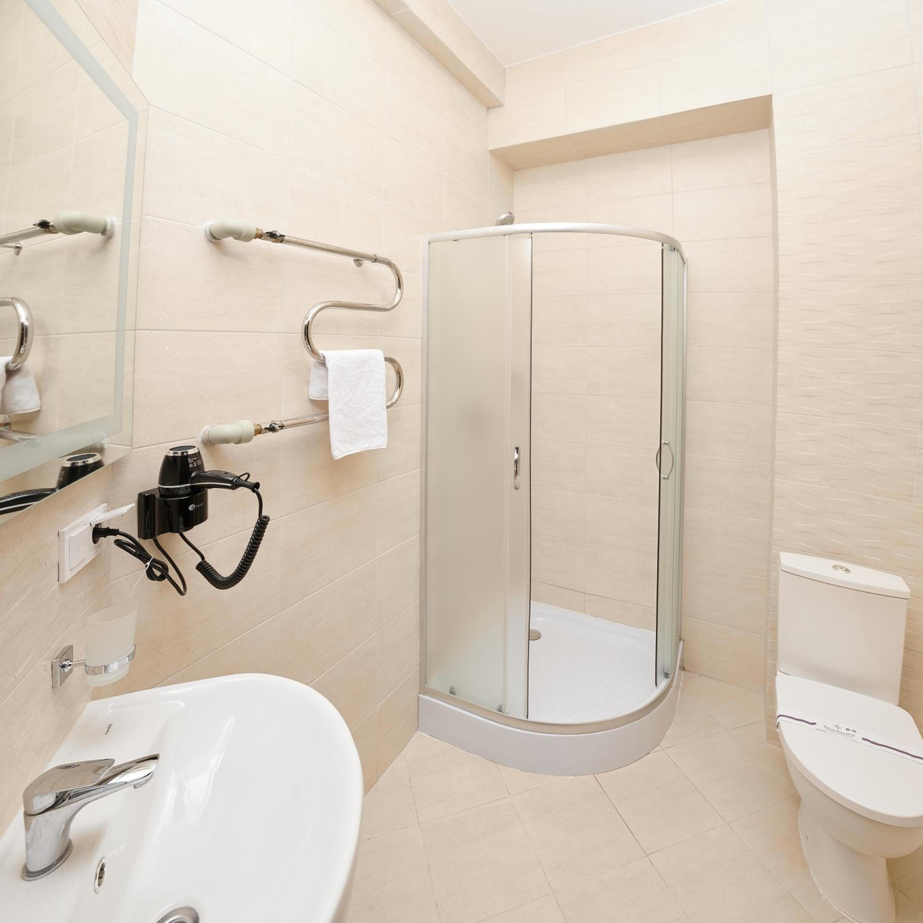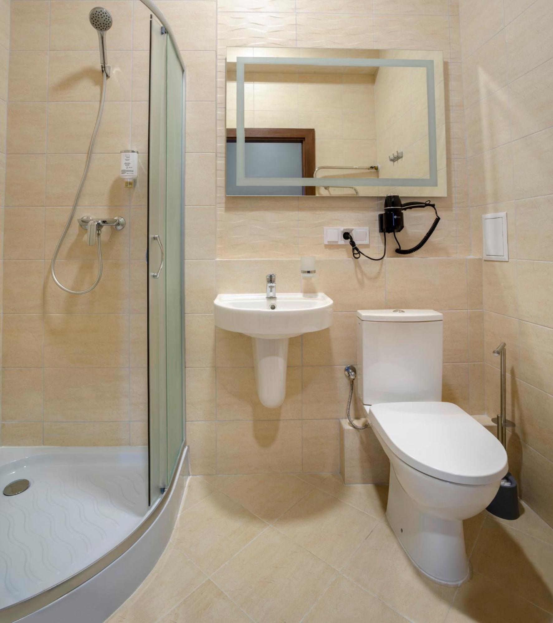 Ванна кімната не дуже зручна, в душі дверцята не закриваються повністю, через це після прийому душу є вода на підлозі