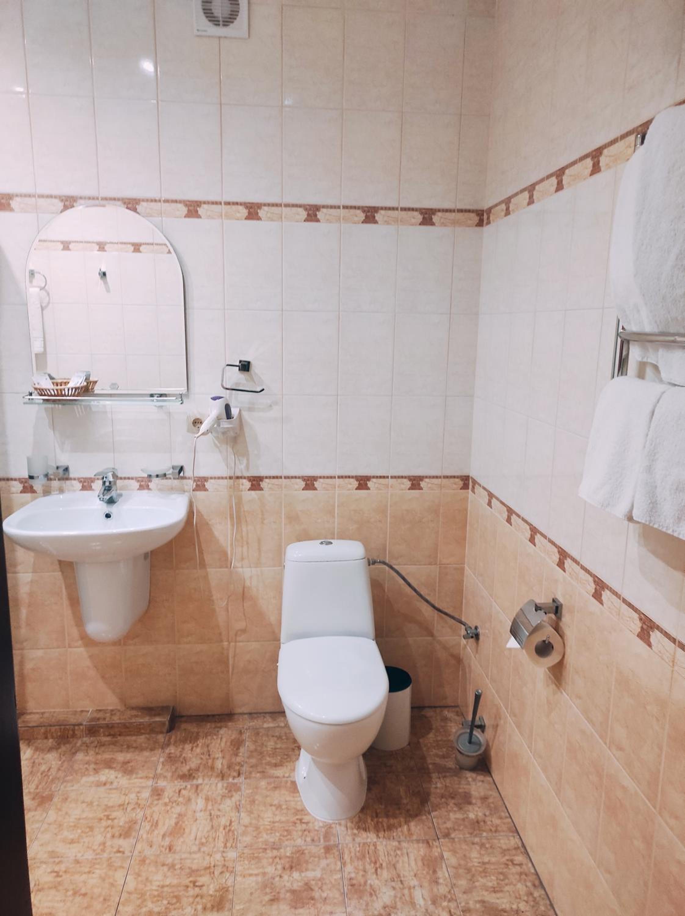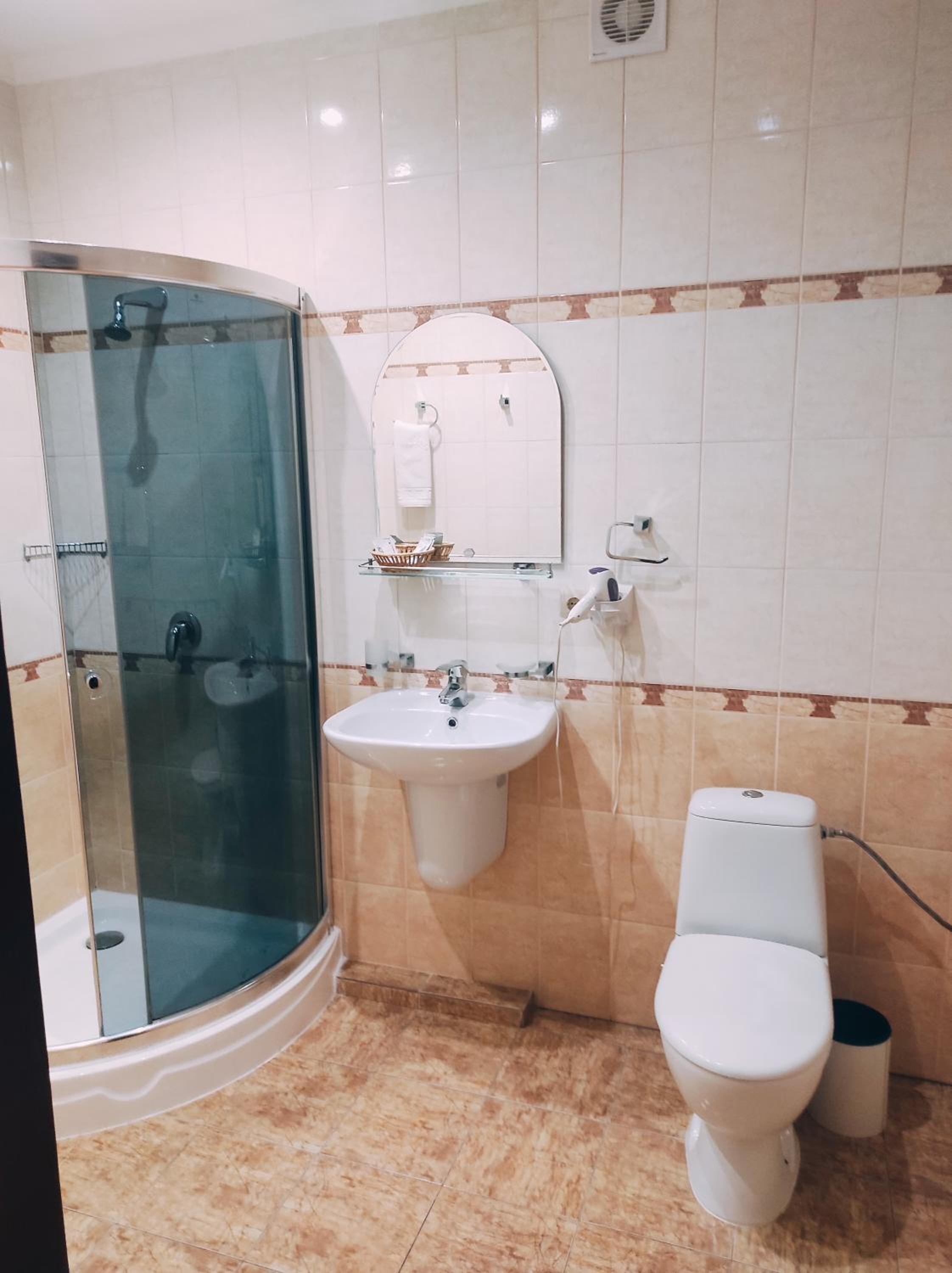 Погане освітлення в душовій. Витяжка вмикається разом з освітленням, що дуже дратує. Злив в душі не функціонує, погано змивається. Відсутність ліфту. Готель без сніданків
