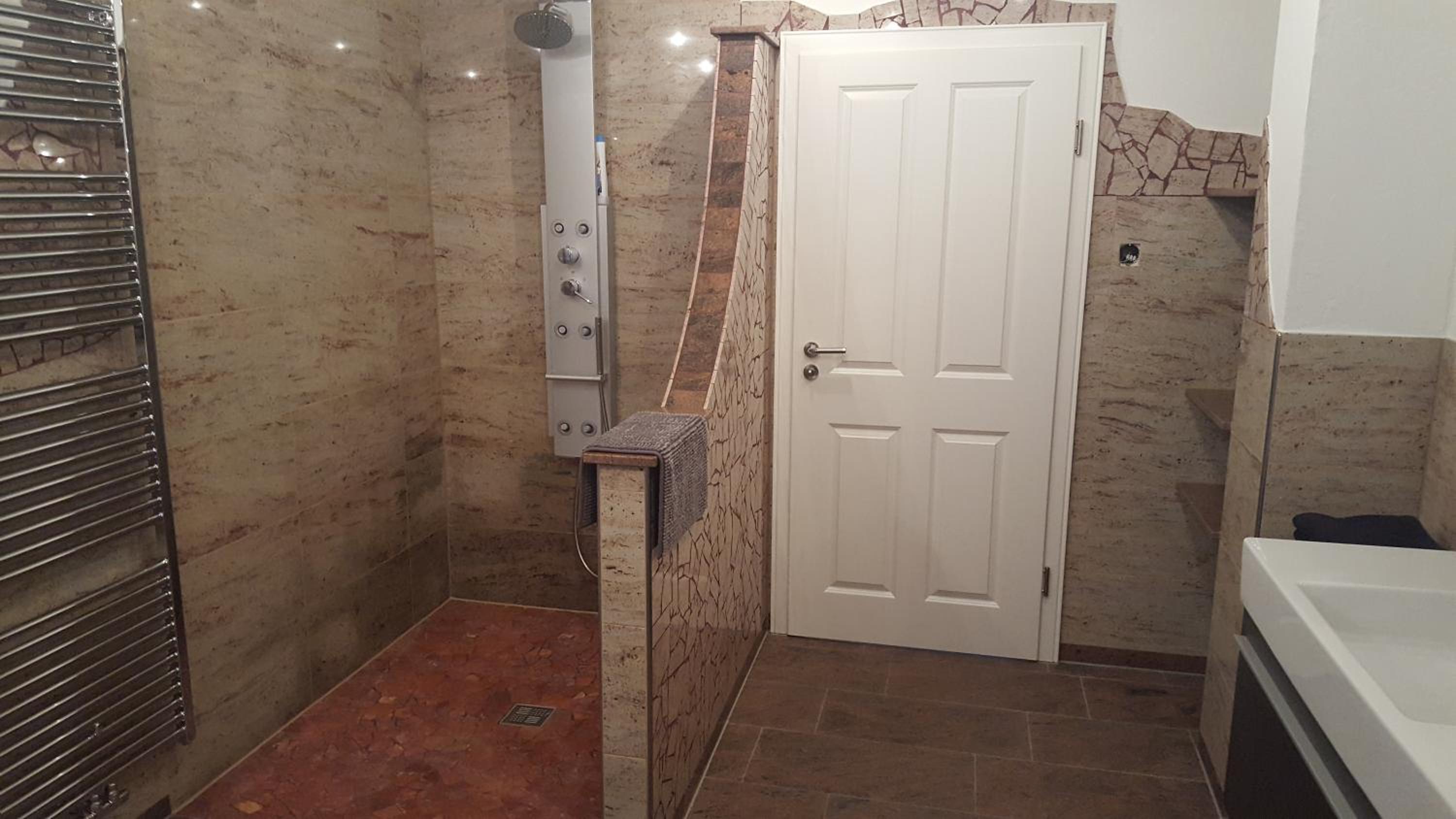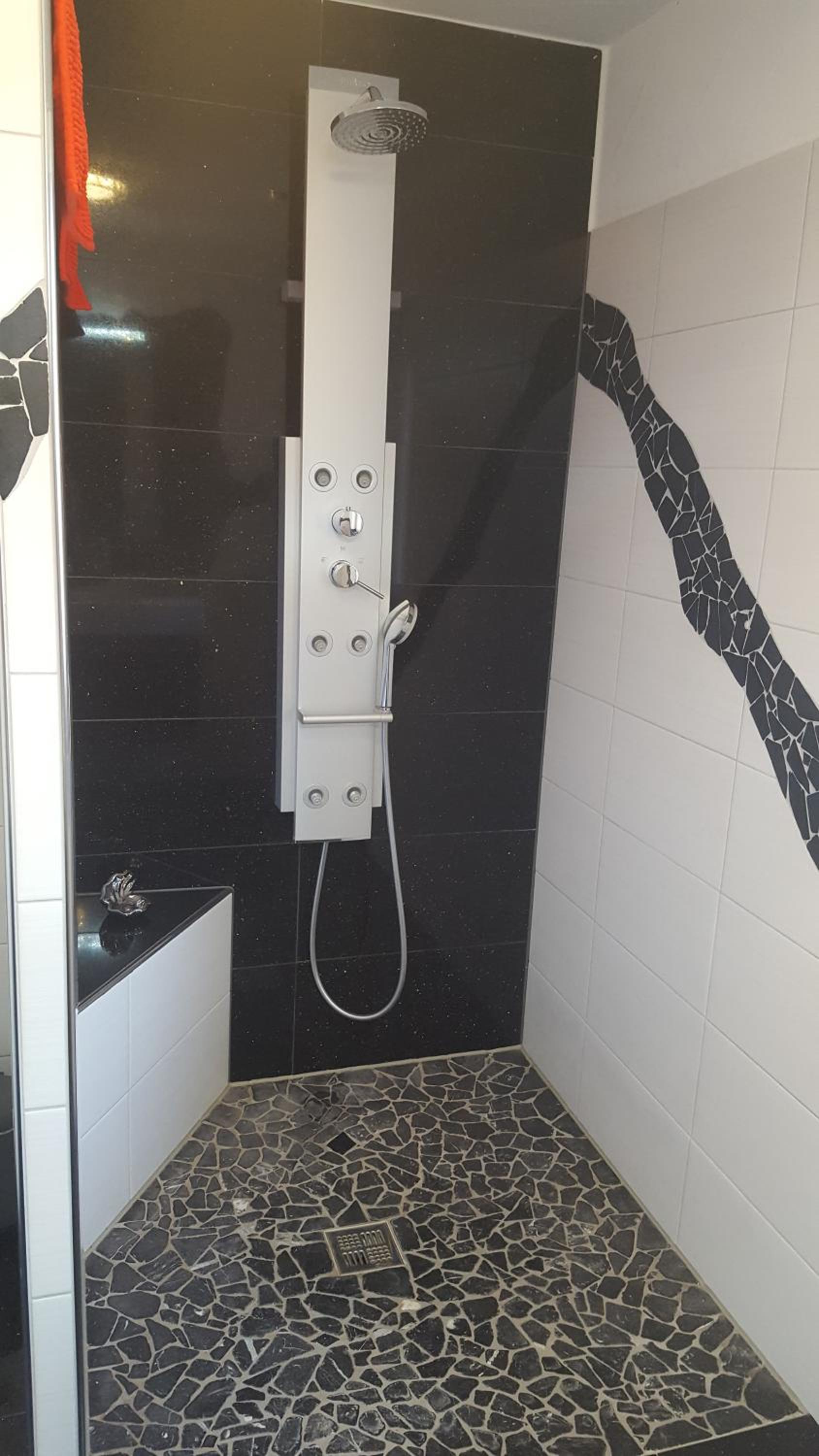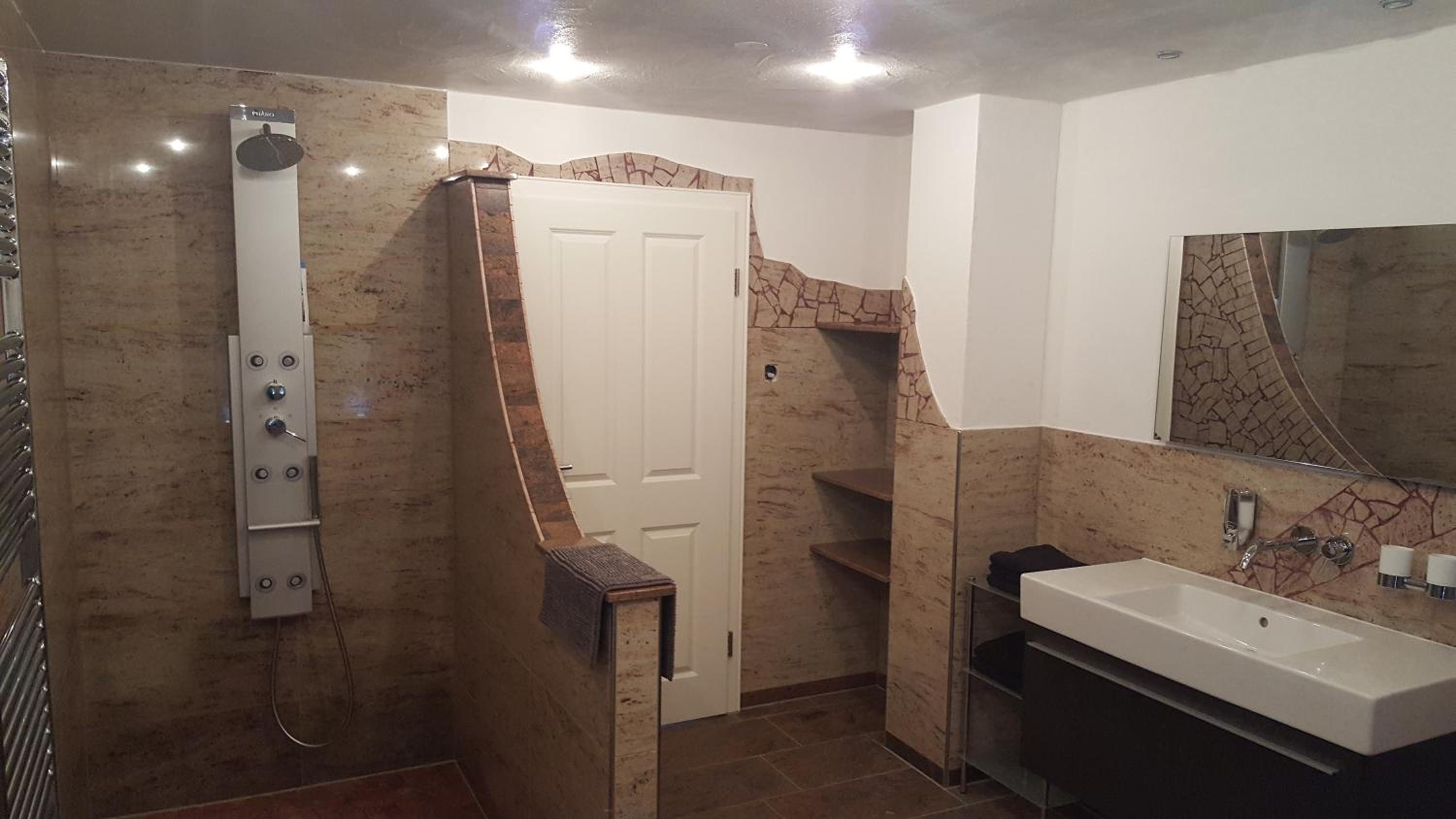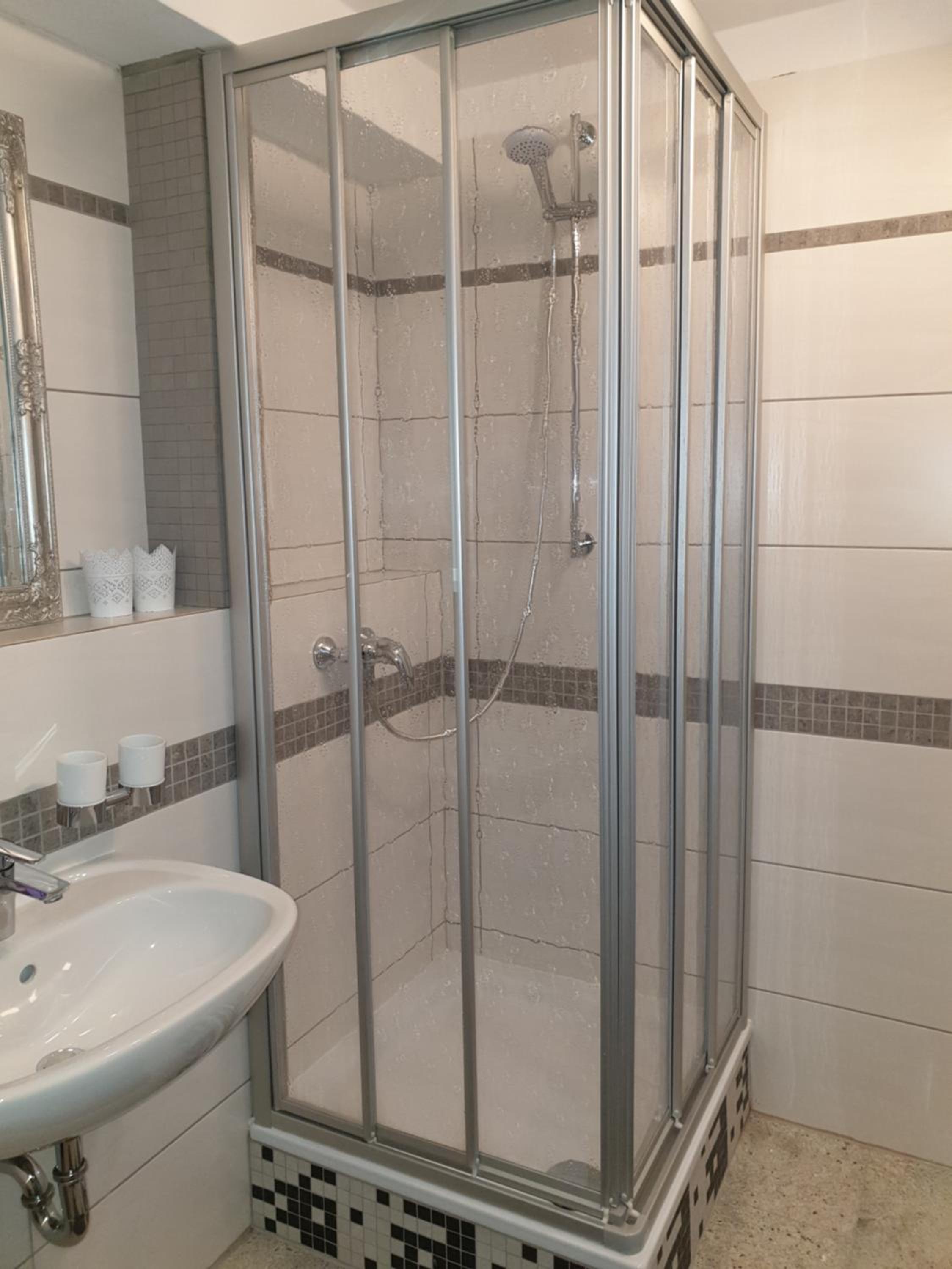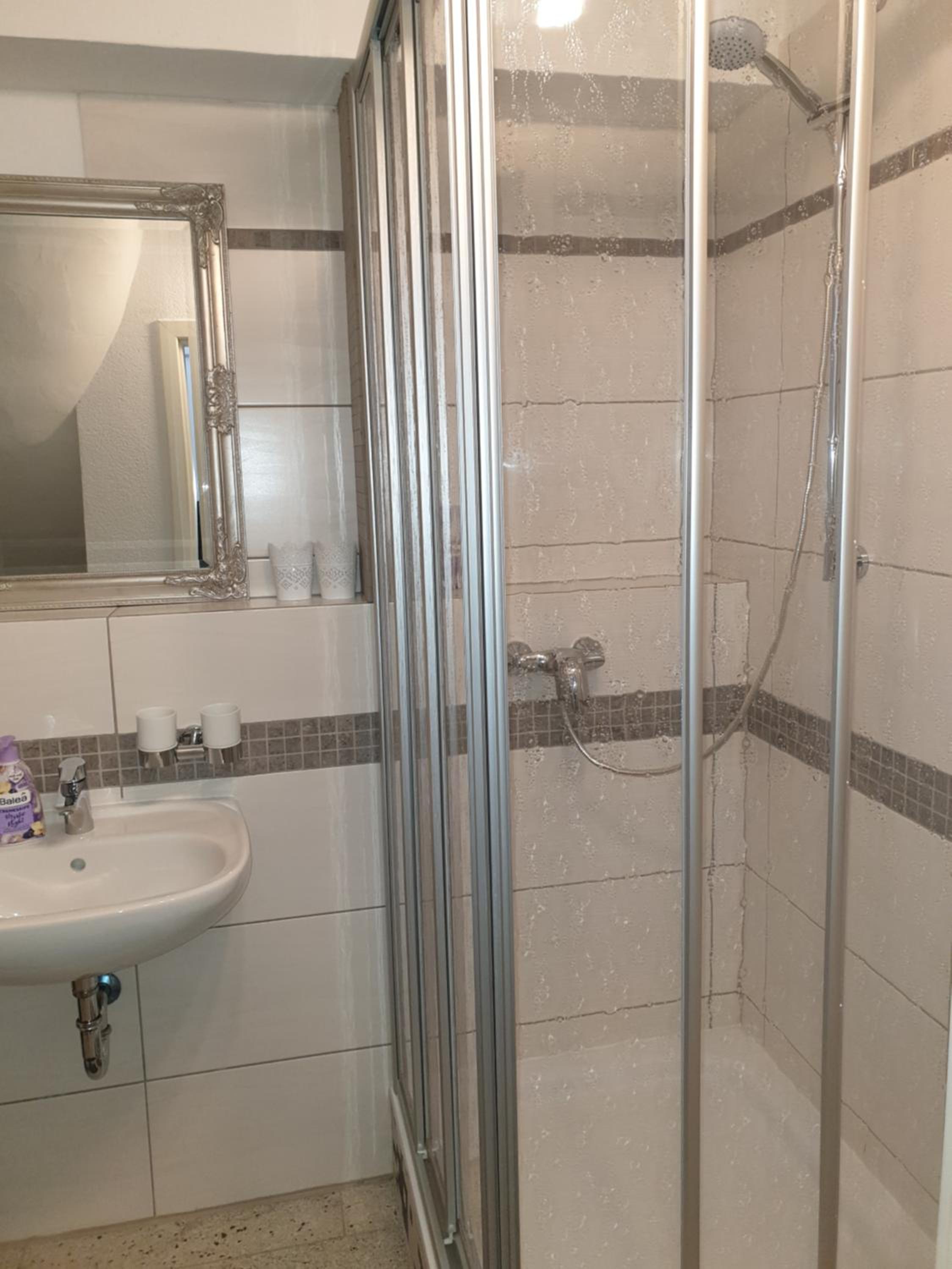 Der Regendusche-Duschkopf im unteren Badezimmer ist leider sehr verkalkt, sodass das Wasser nicht gut abläuft