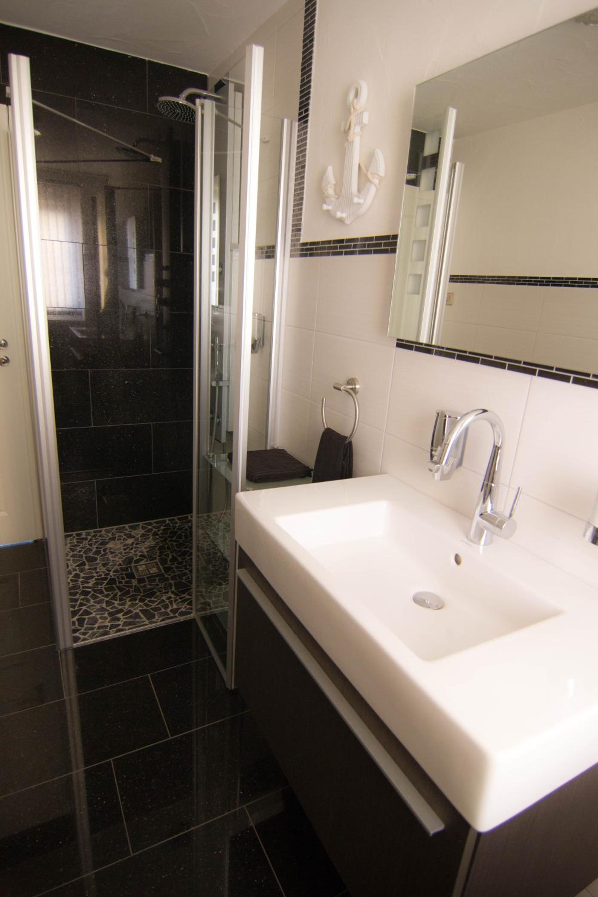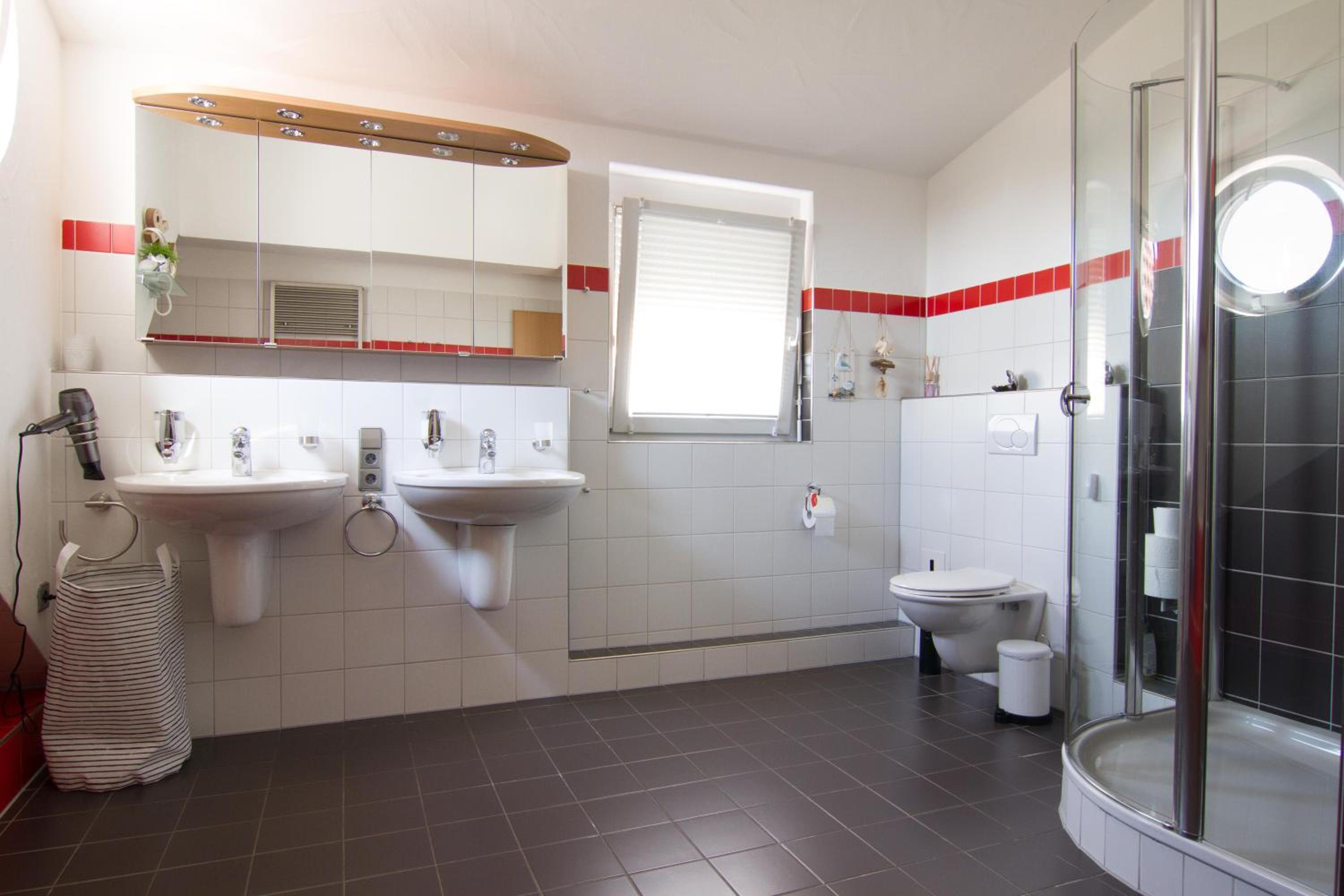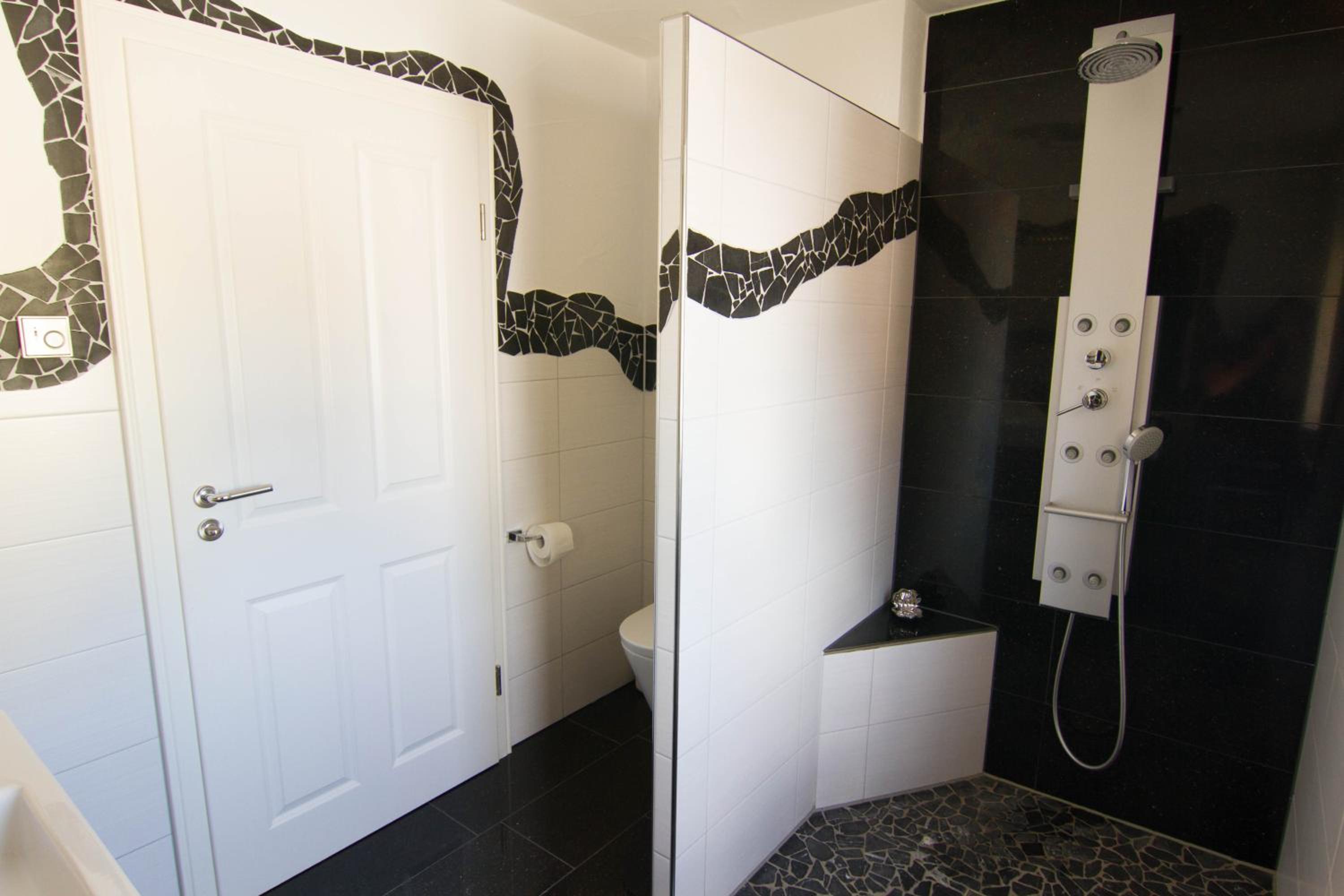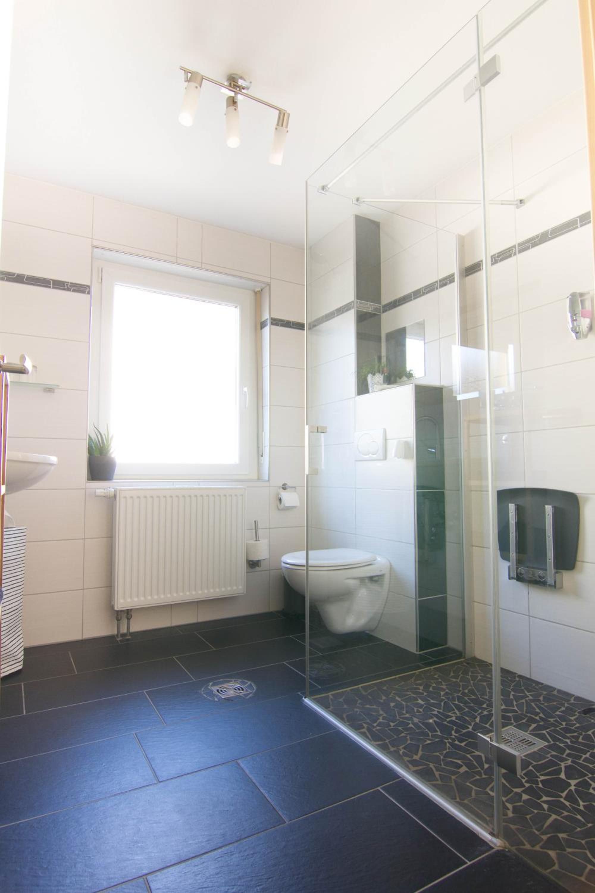 Der Regendusche-Duschkopf im unteren Badezimmer ist leider sehr verkalkt, sodass das Wasser nicht gut abläuft