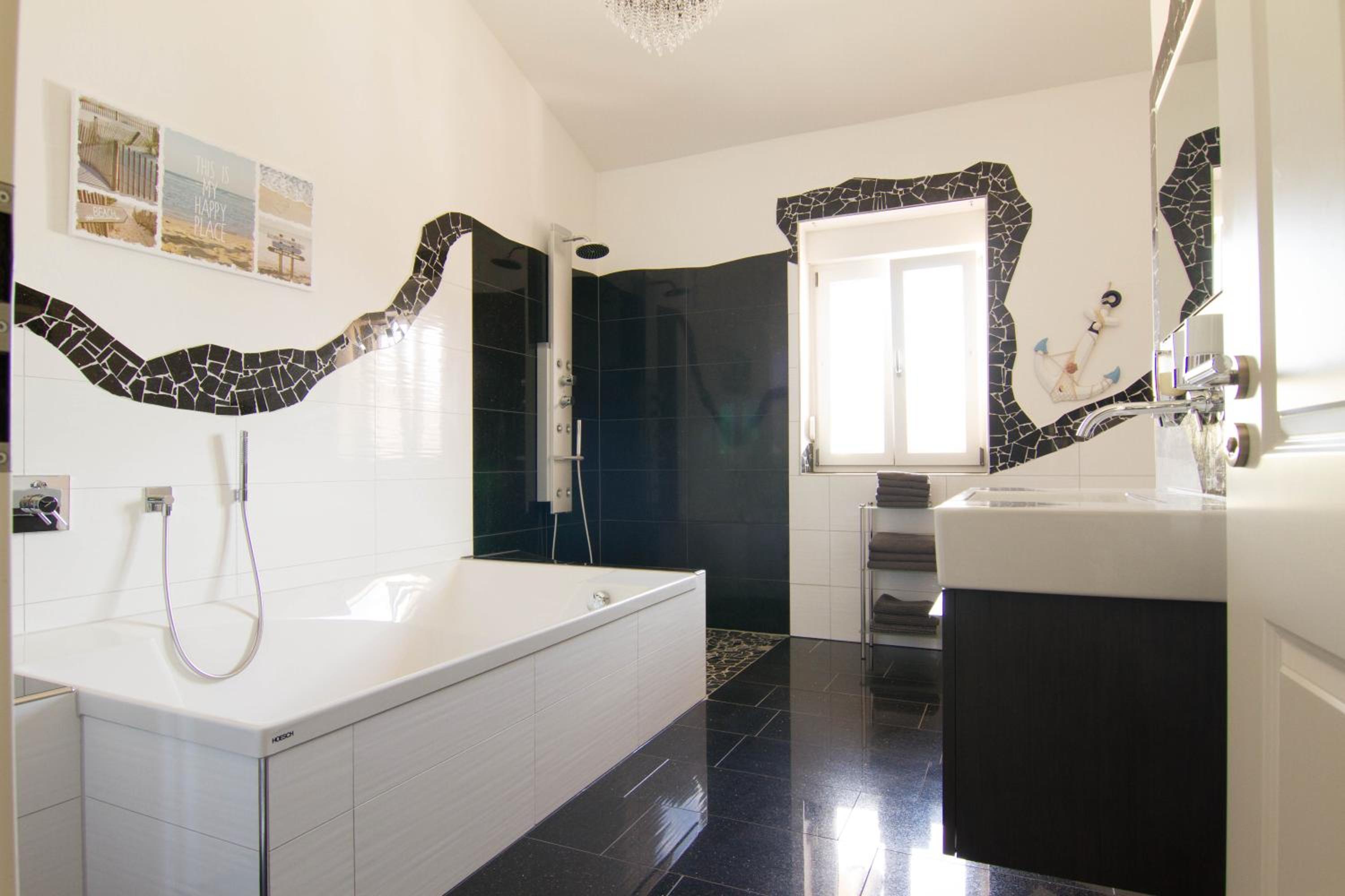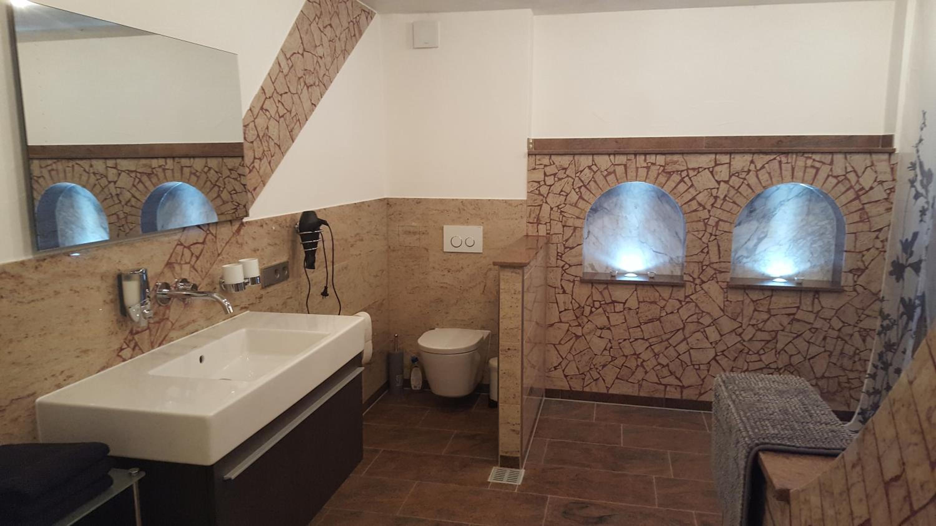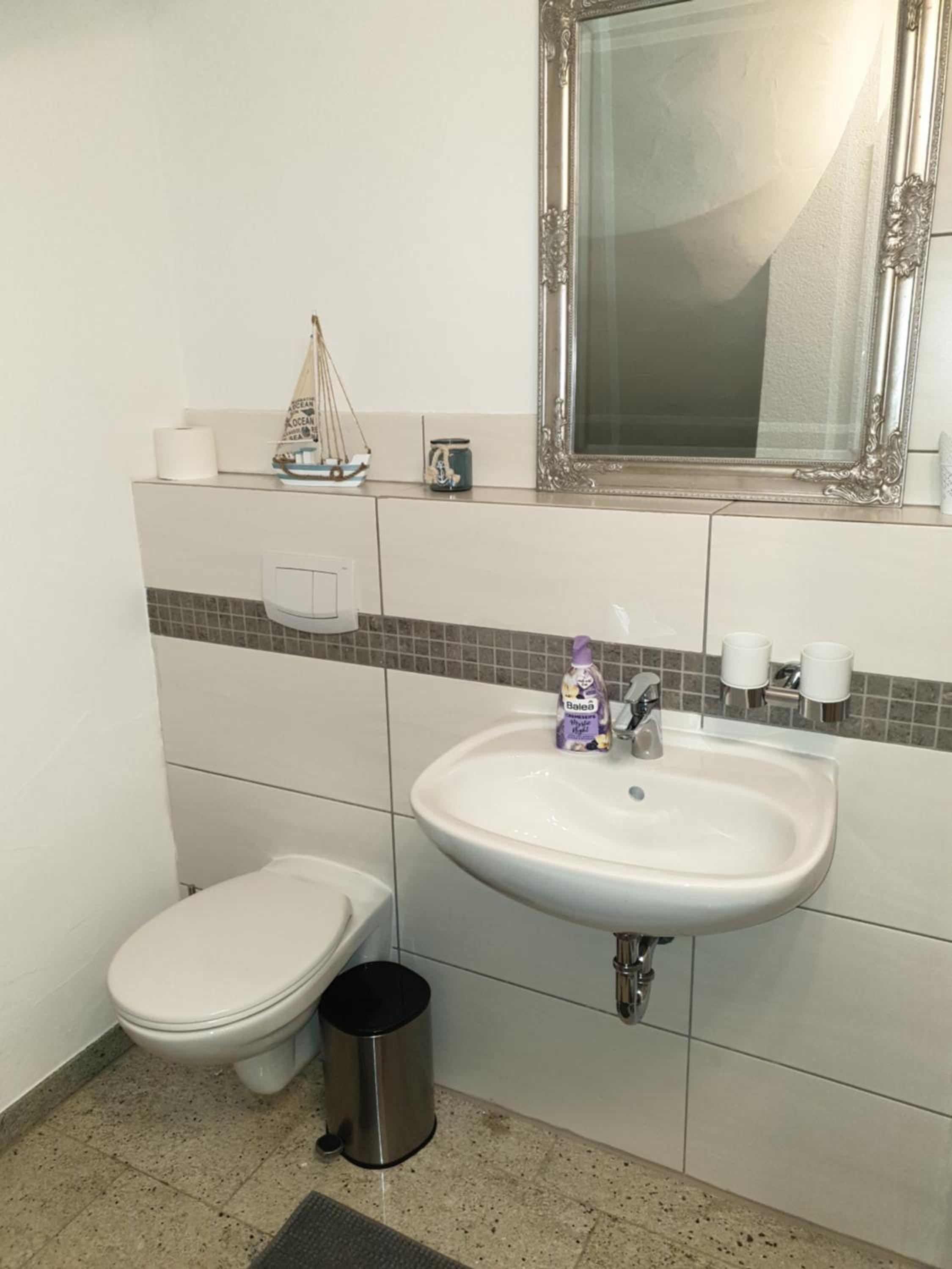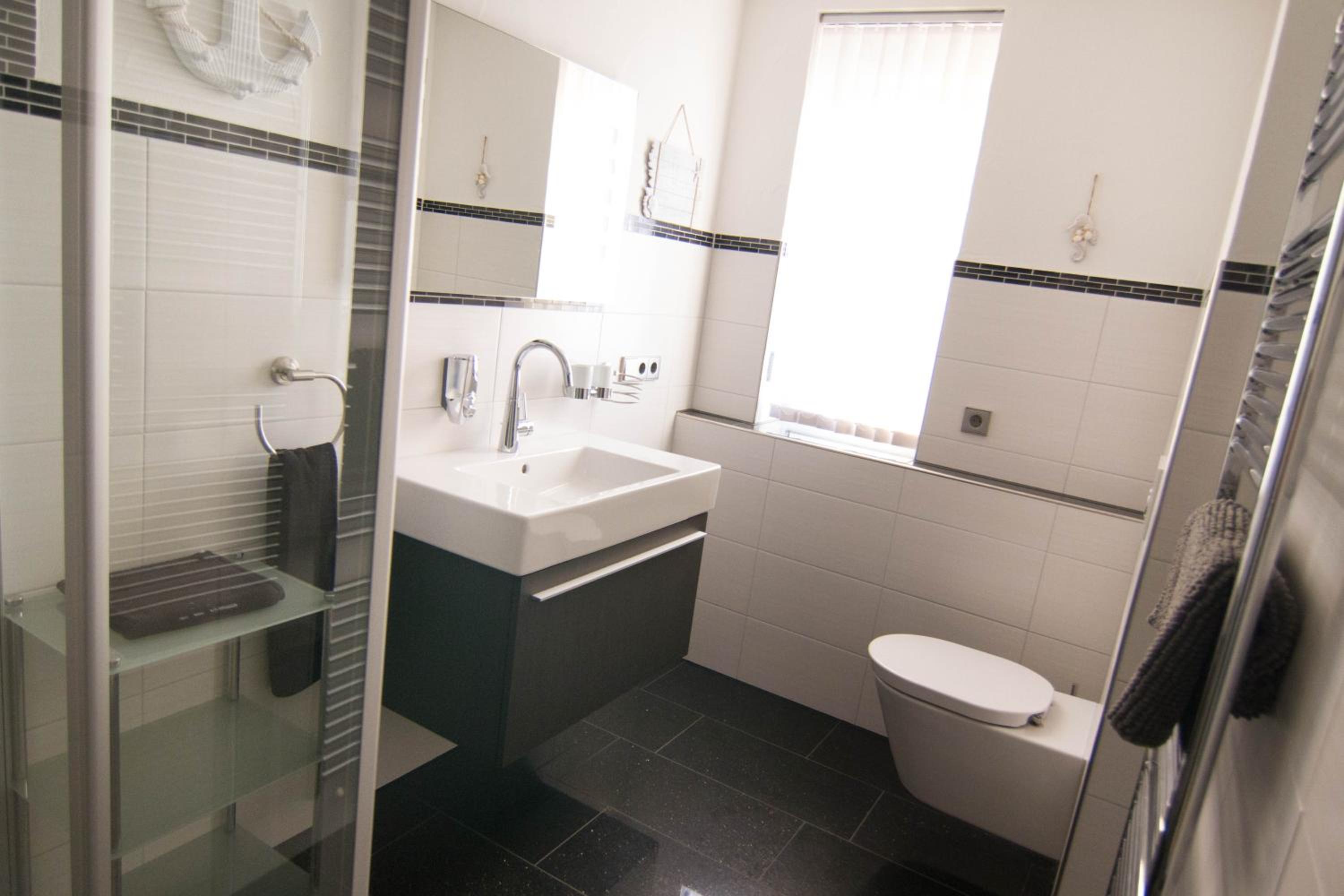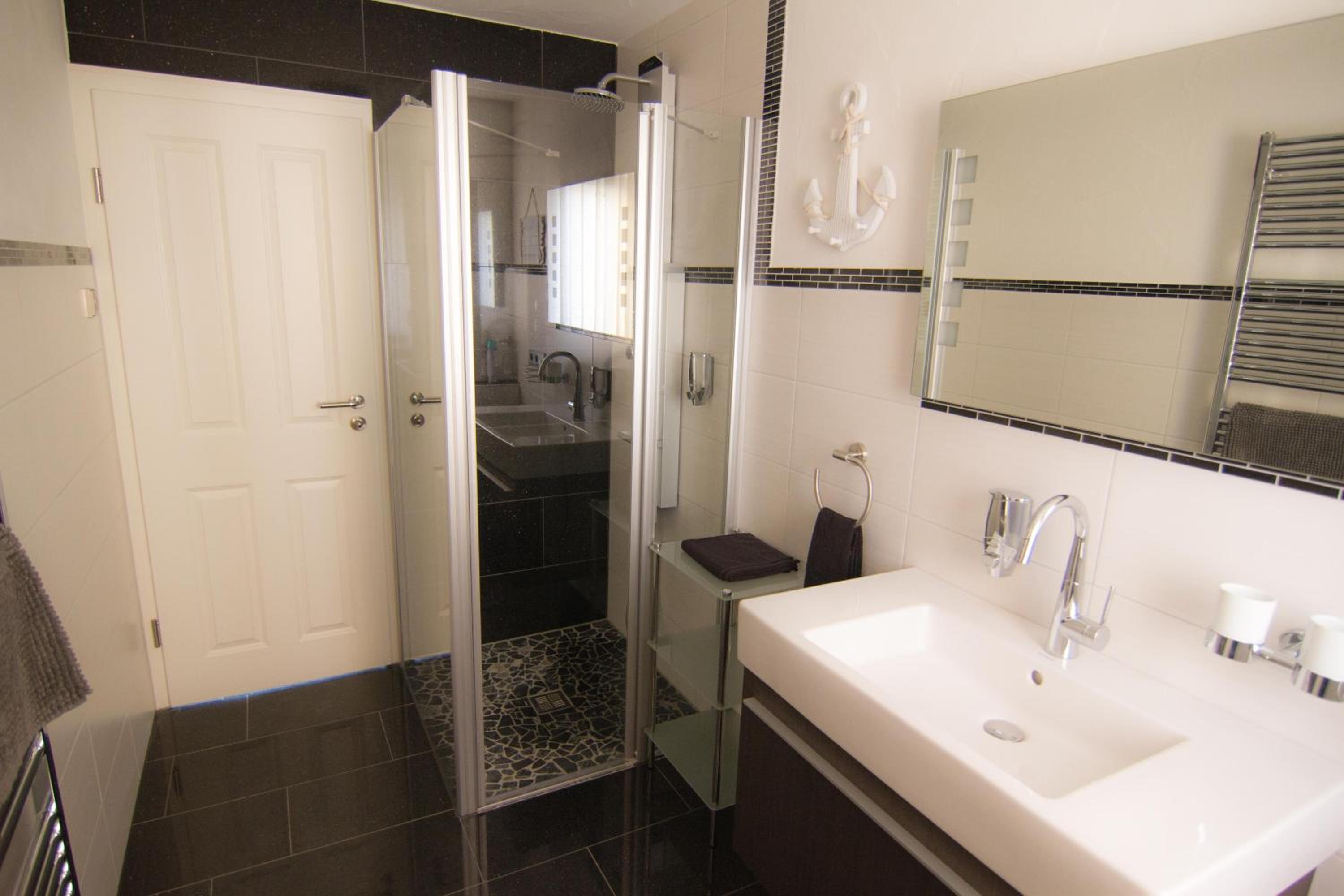 Der Regendusche-Duschkopf im unteren Badezimmer ist leider sehr verkalkt, sodass das Wasser nicht gut abläuft