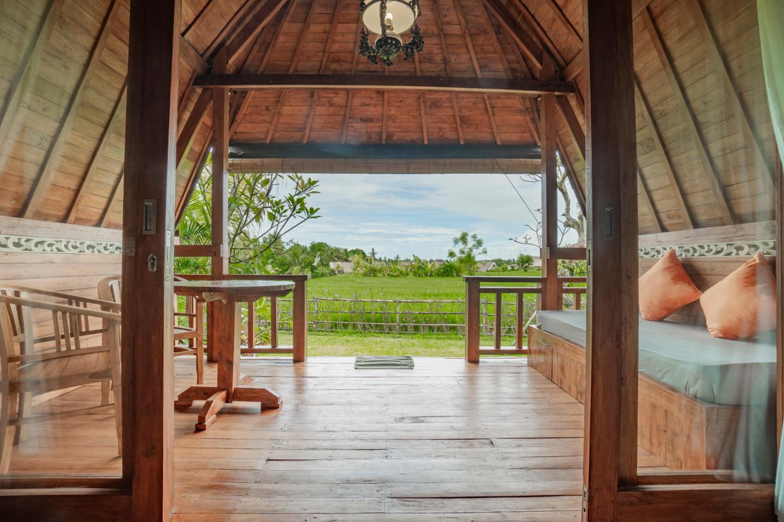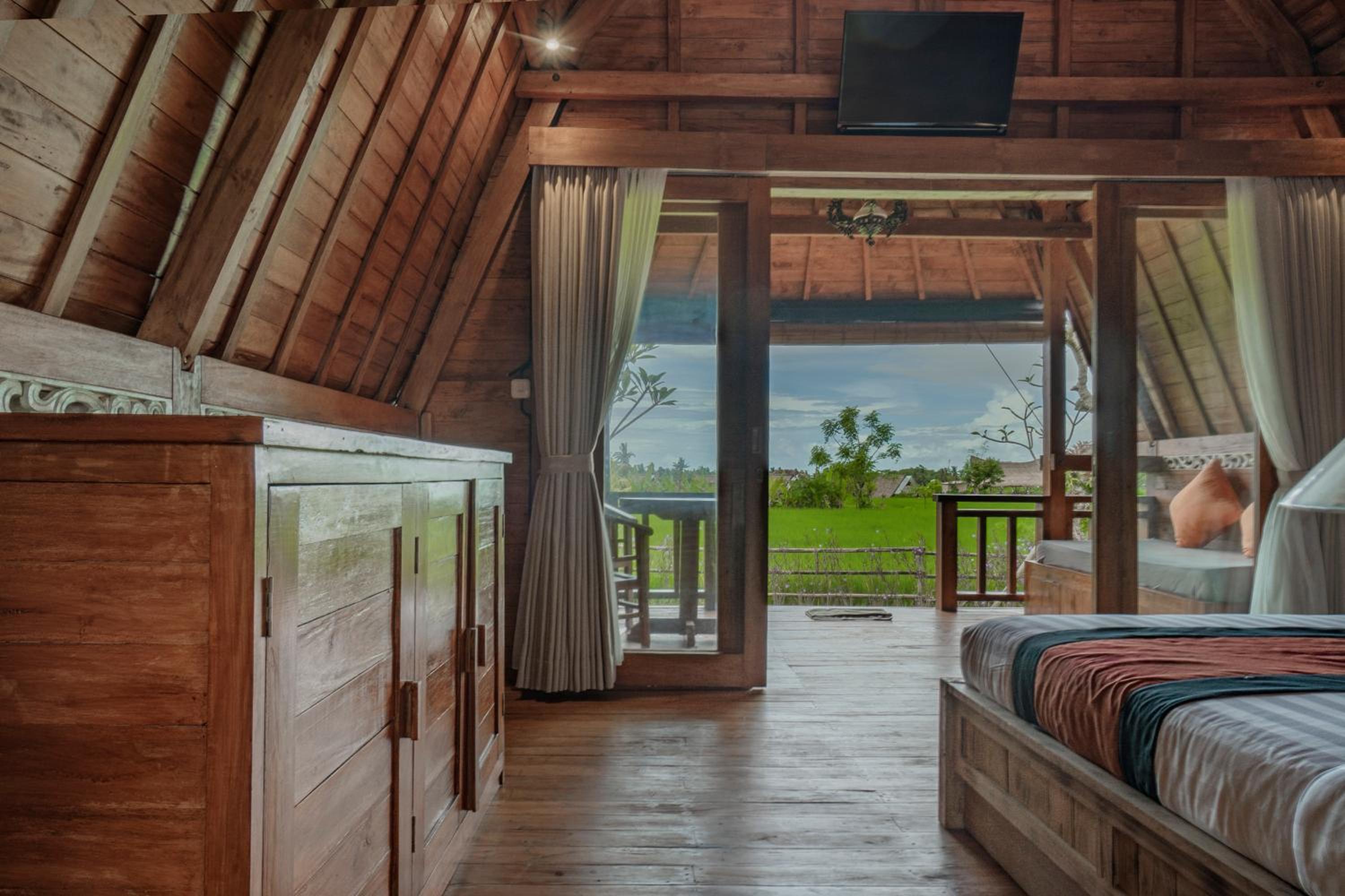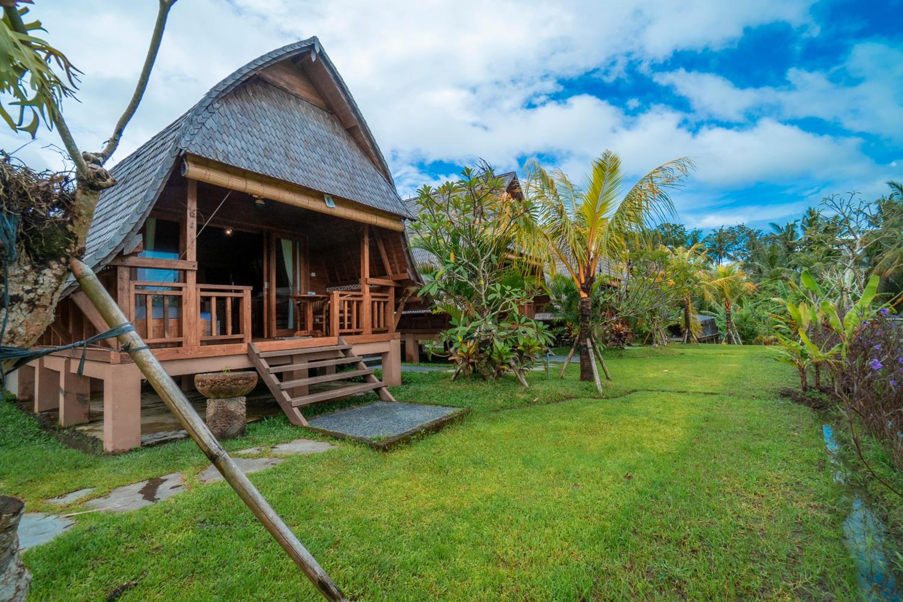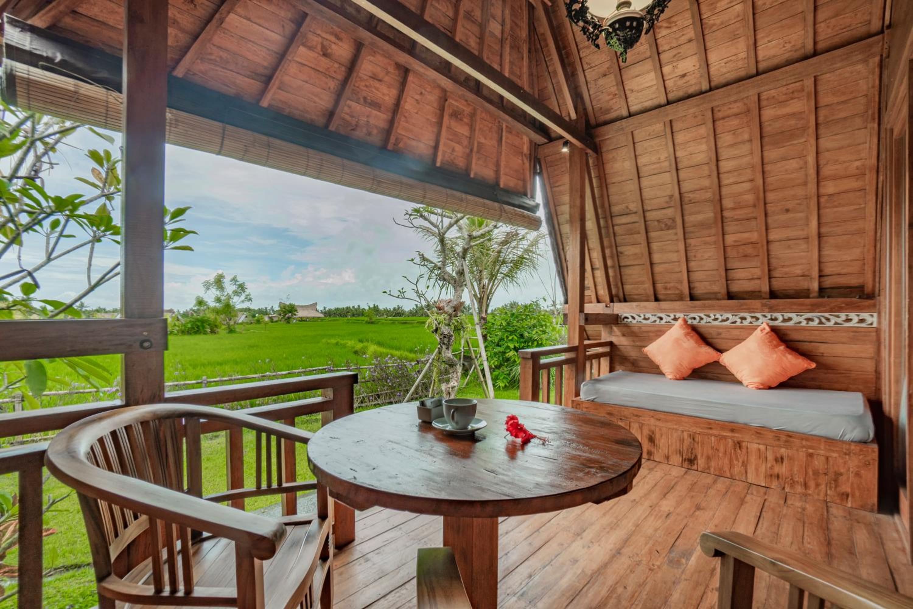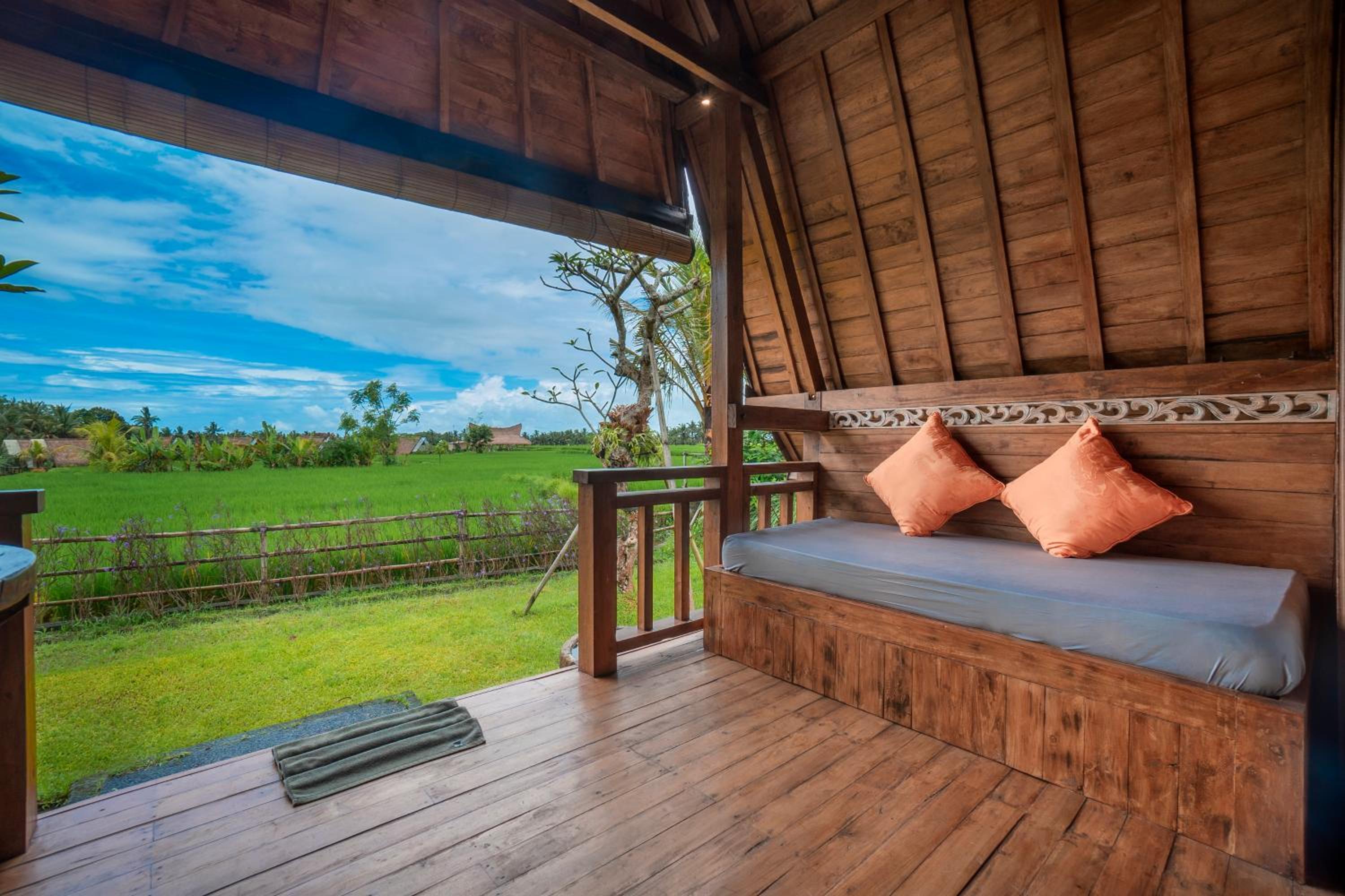 Quiet, nature-oriented, well-built hut, well-equipped (air conditioning, hot shower, bath tub, hair dryer, small refrigerator), clean and smelled nice. The small patio just outside the room is a great place to just relax and experience nature. The walk towards the property is a gorgeous expanse of rice fields.