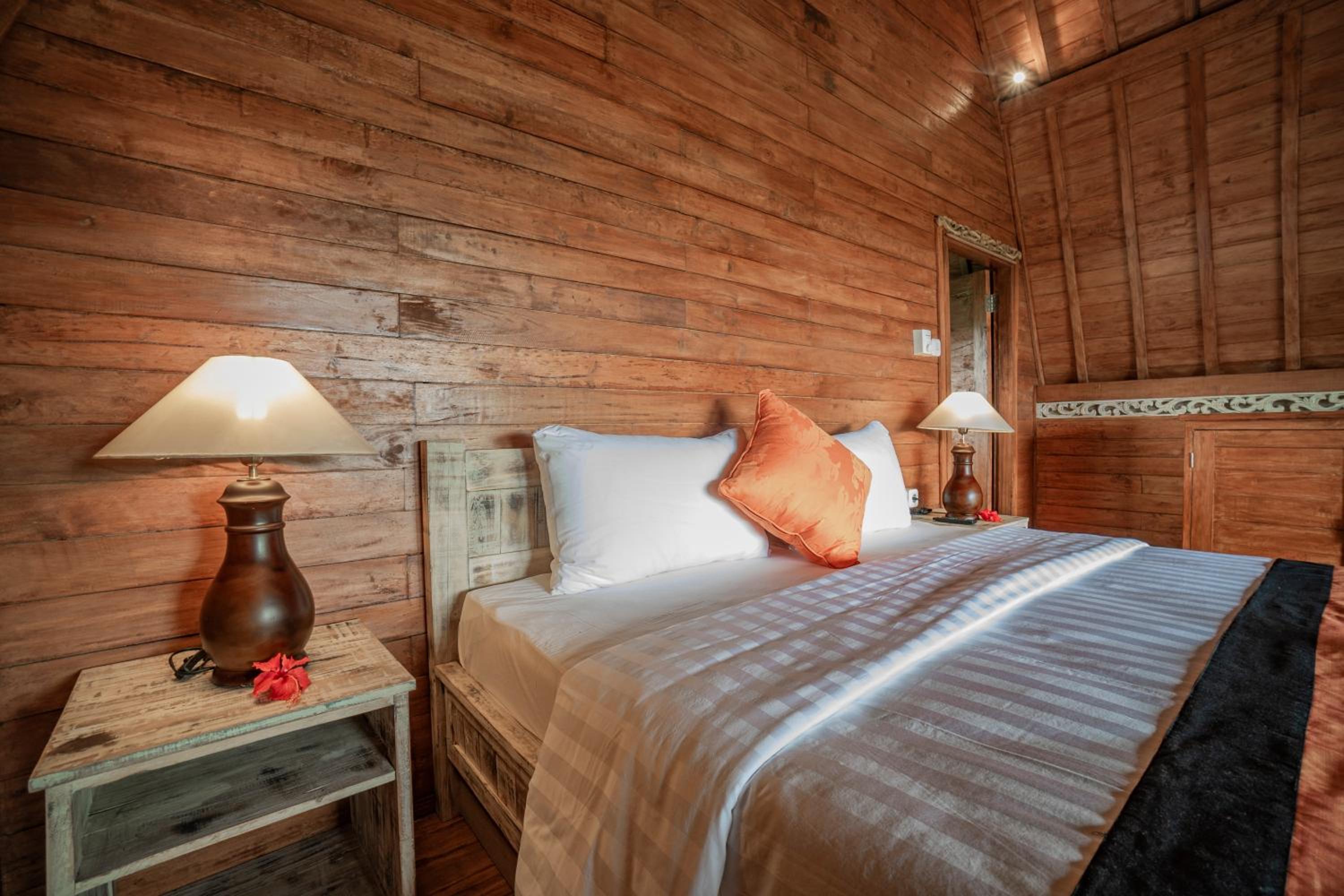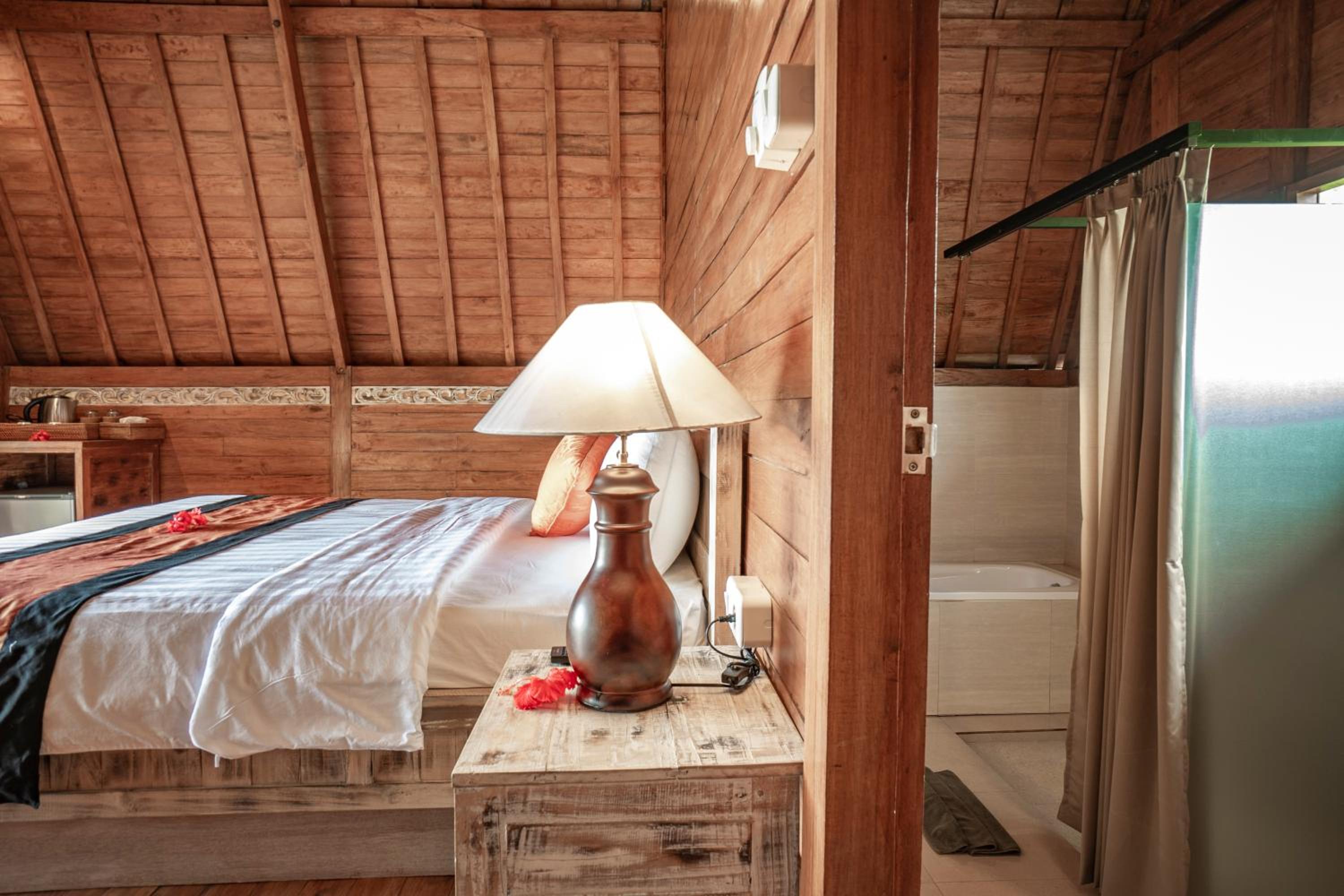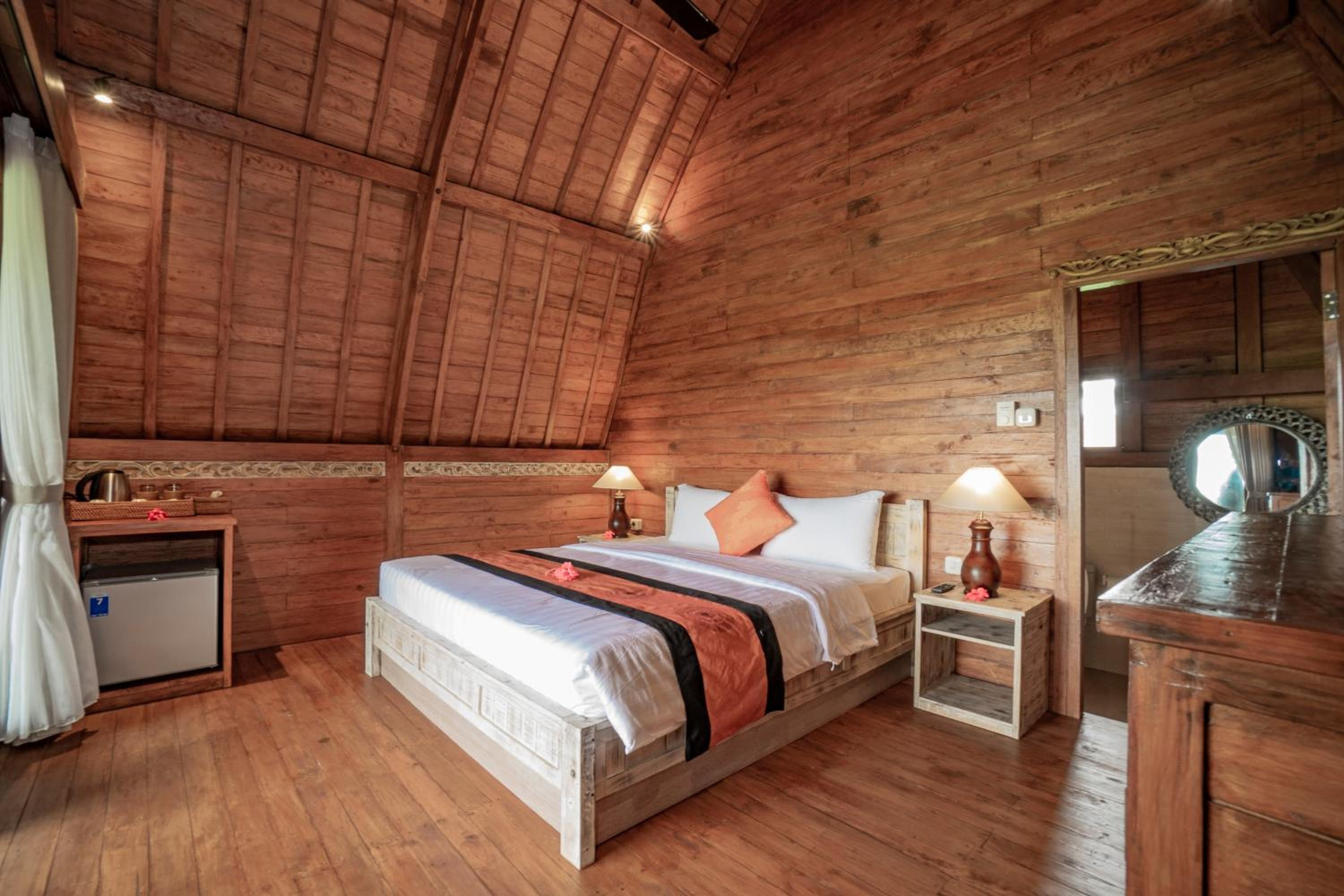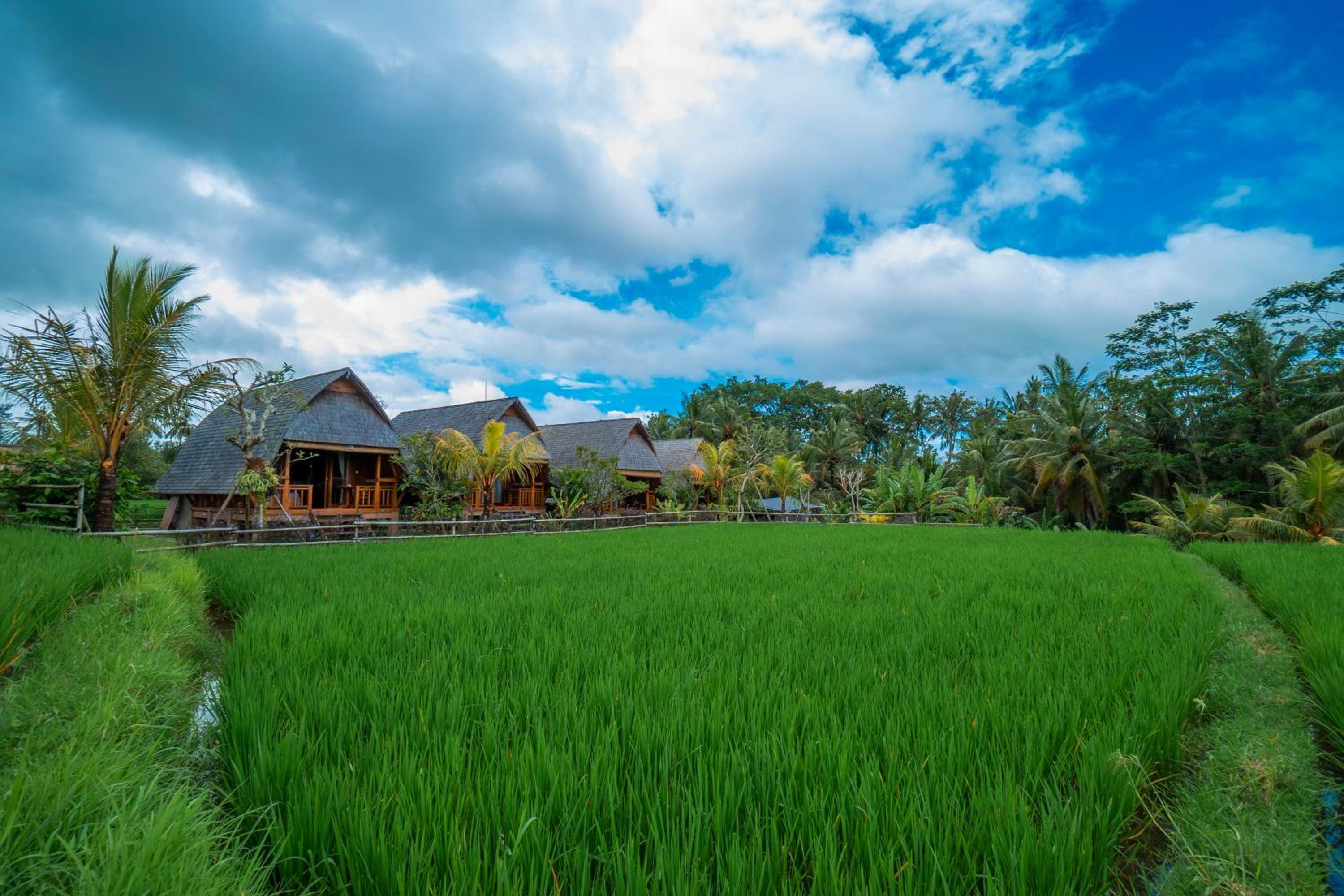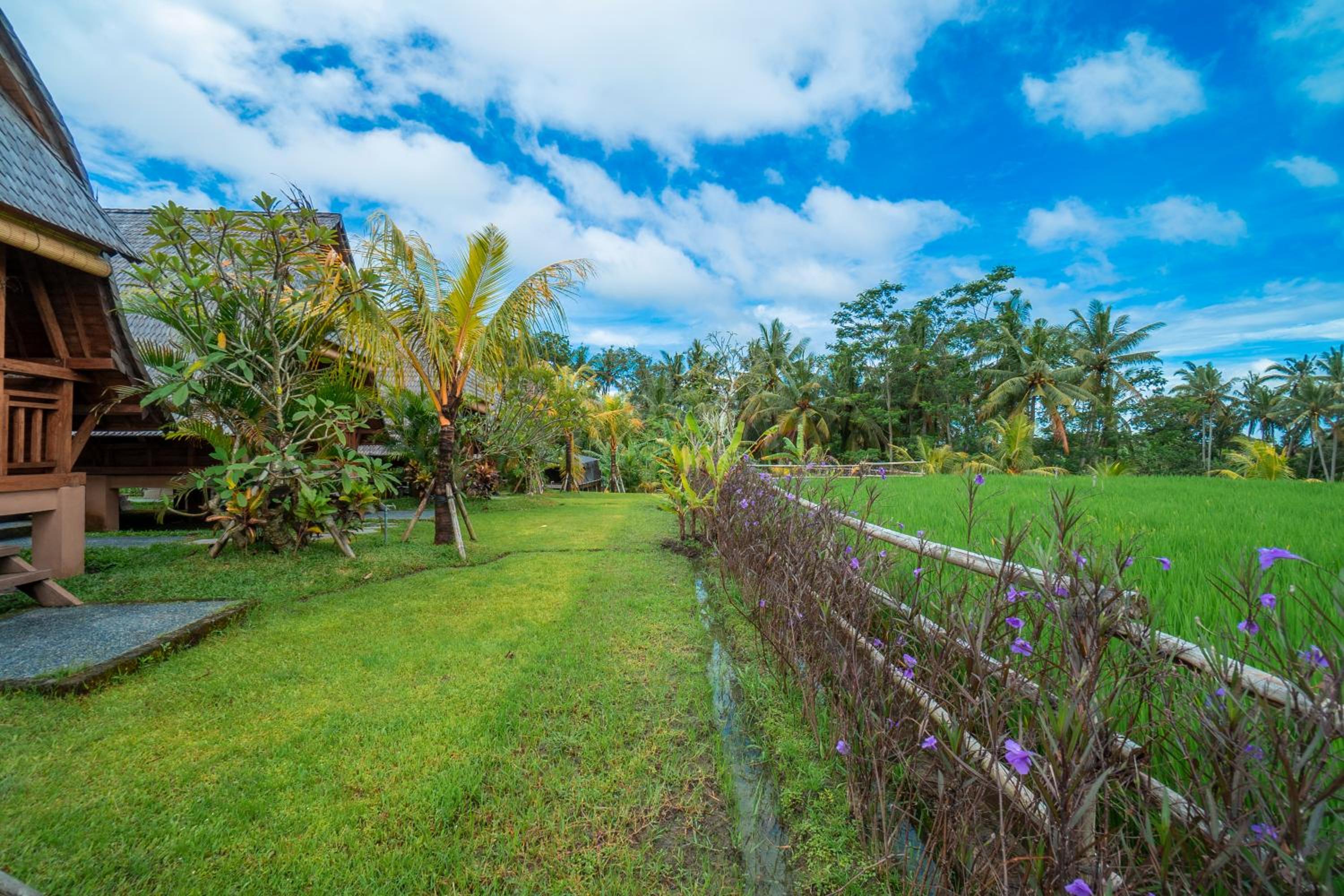 Quiet, nature-oriented, well-built hut, well-equipped (air conditioning, hot shower, bath tub, hair dryer, small refrigerator), clean and smelled nice. The small patio just outside the room is a great place to just relax and experience nature. The walk towards the property is a gorgeous expanse of rice fields.