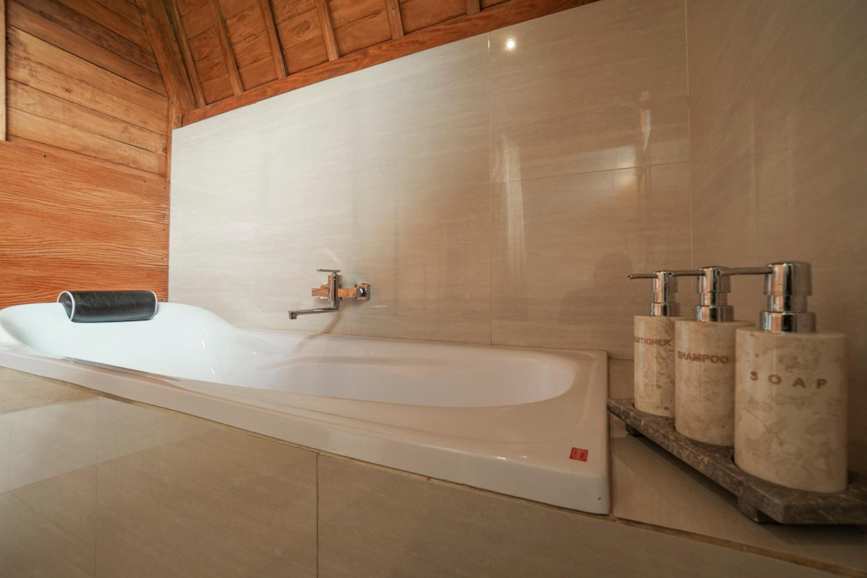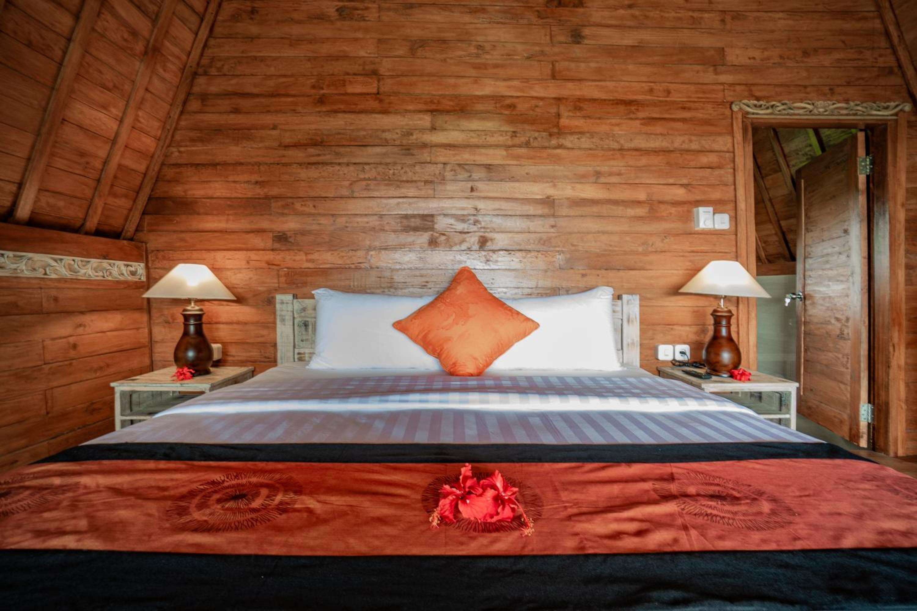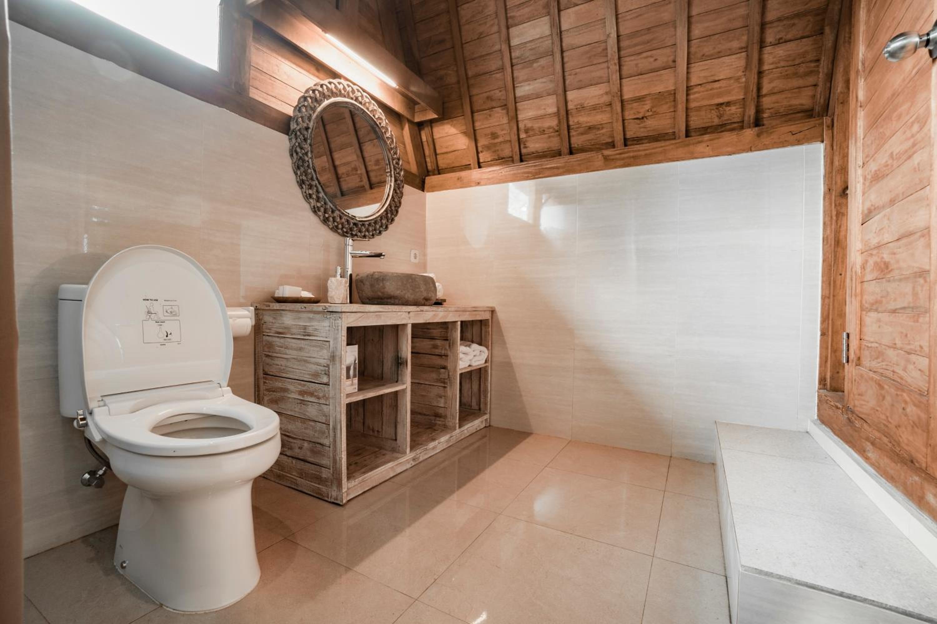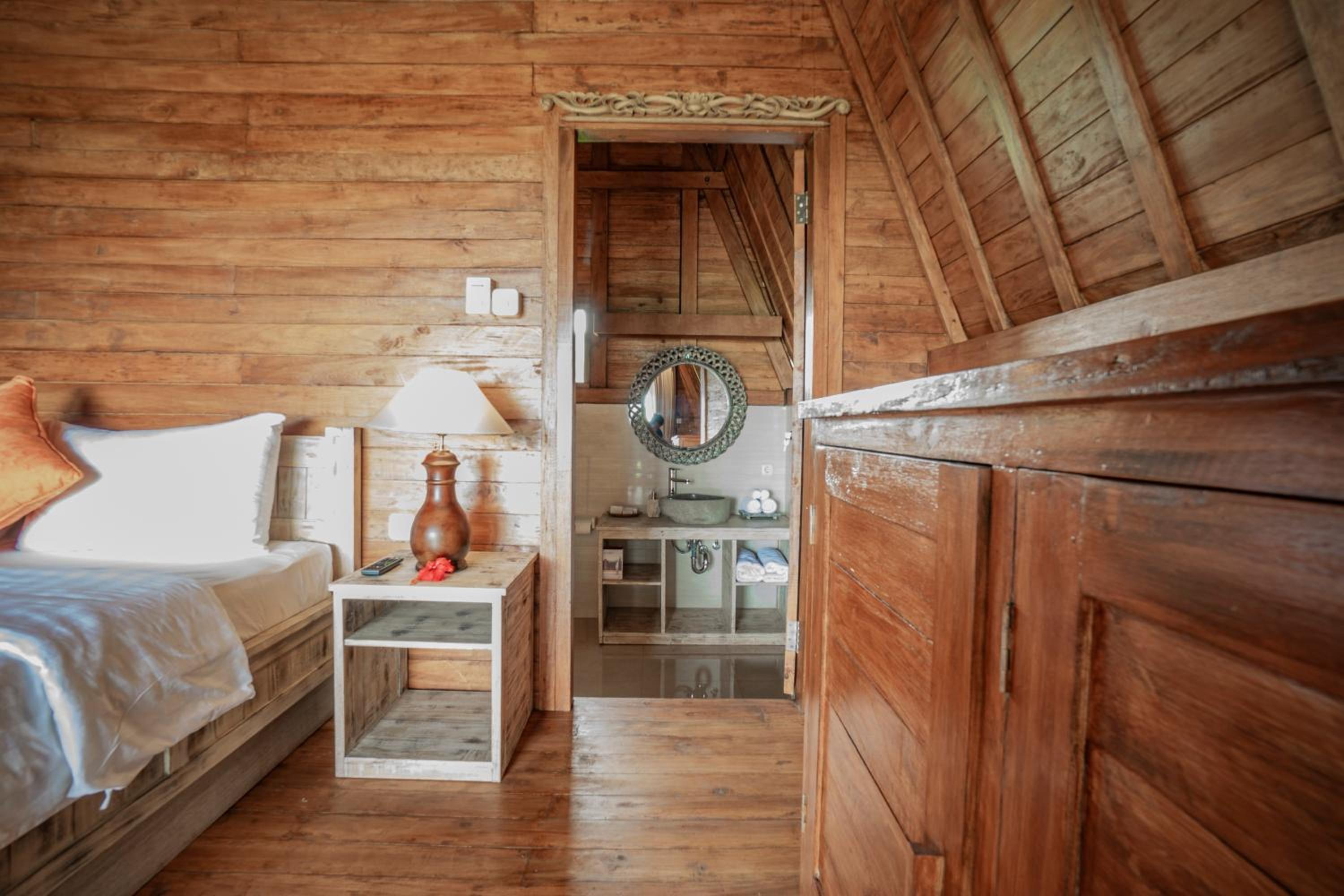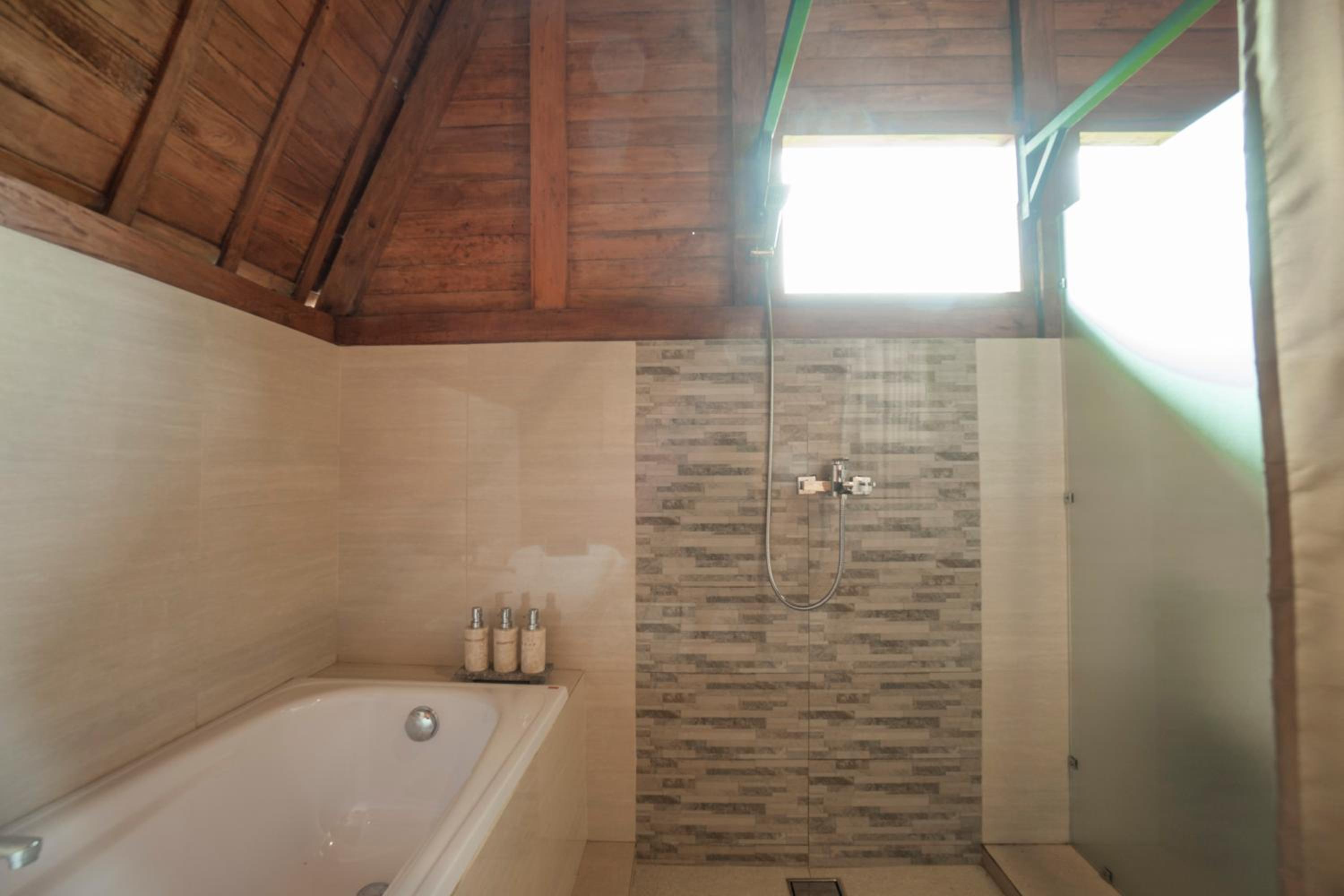 Quiet, nature-oriented, well-built hut, well-equipped (air conditioning, hot shower, bath tub, hair dryer, small refrigerator), clean and smelled nice. The small patio just outside the room is a great place to just relax and experience nature. The walk towards the property is a gorgeous expanse of rice fields.