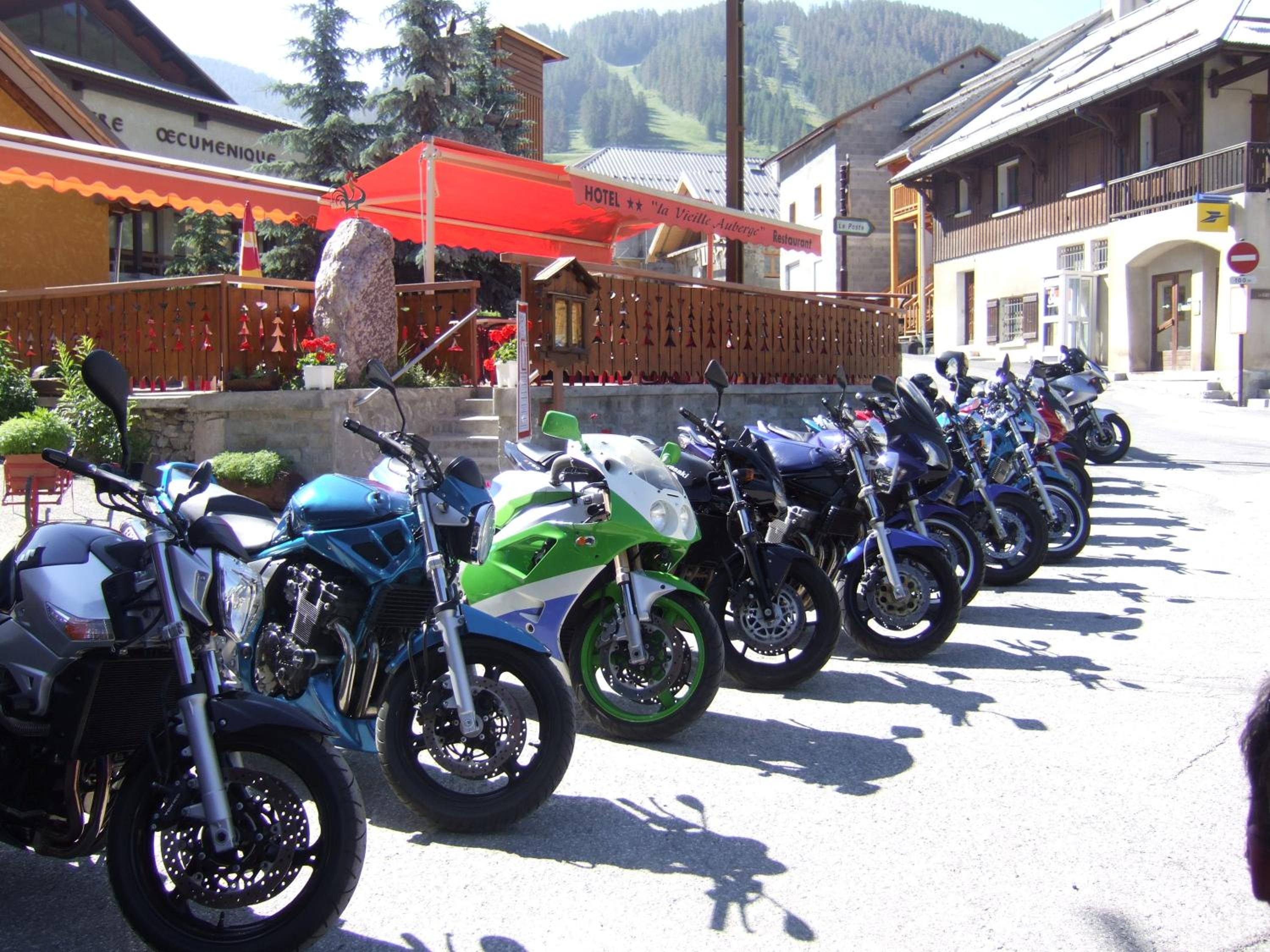 Bonne ambiance au bar, jolie terrasse au centre du village, garage fermé pour notre moto et bon restaurant (menu unique).