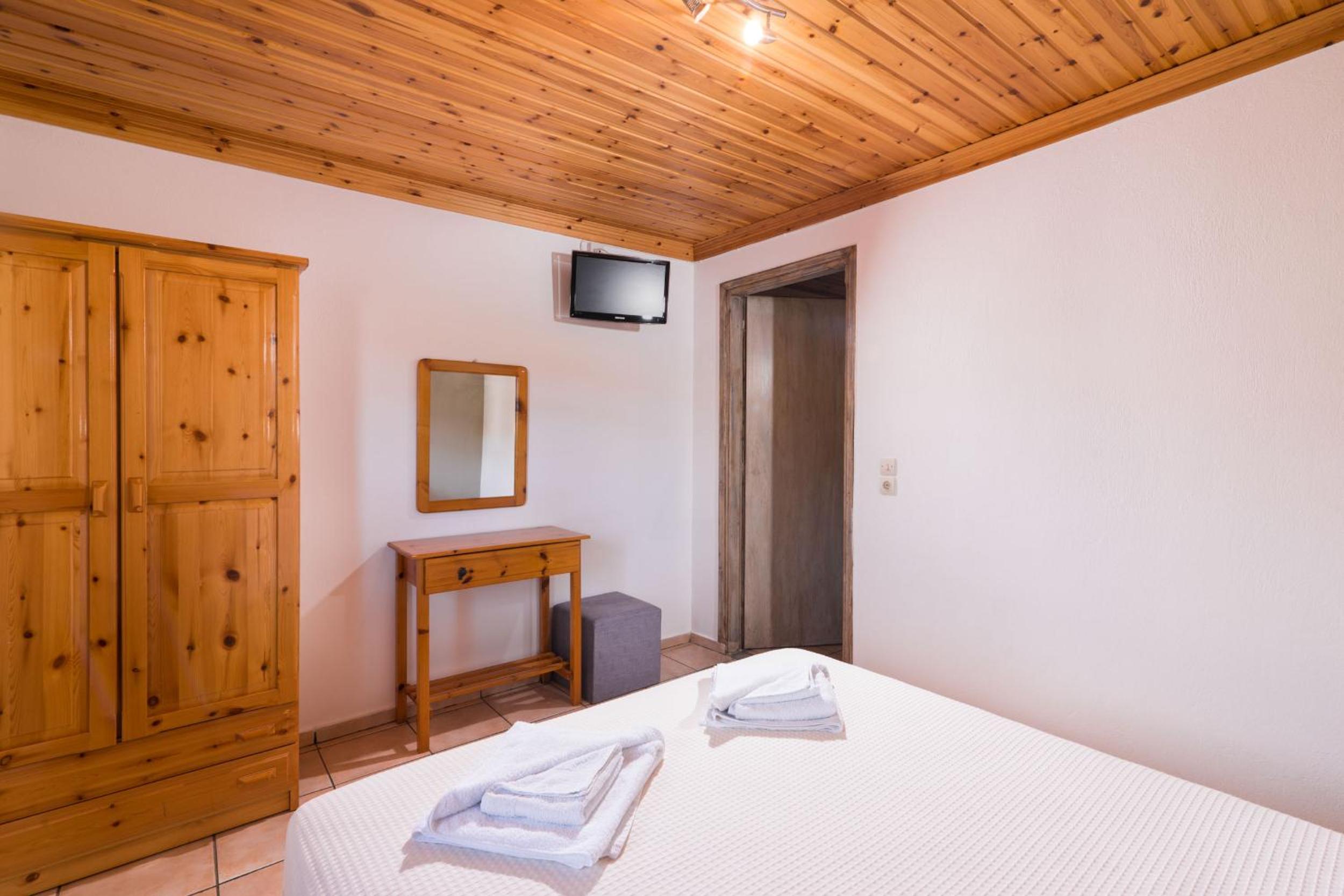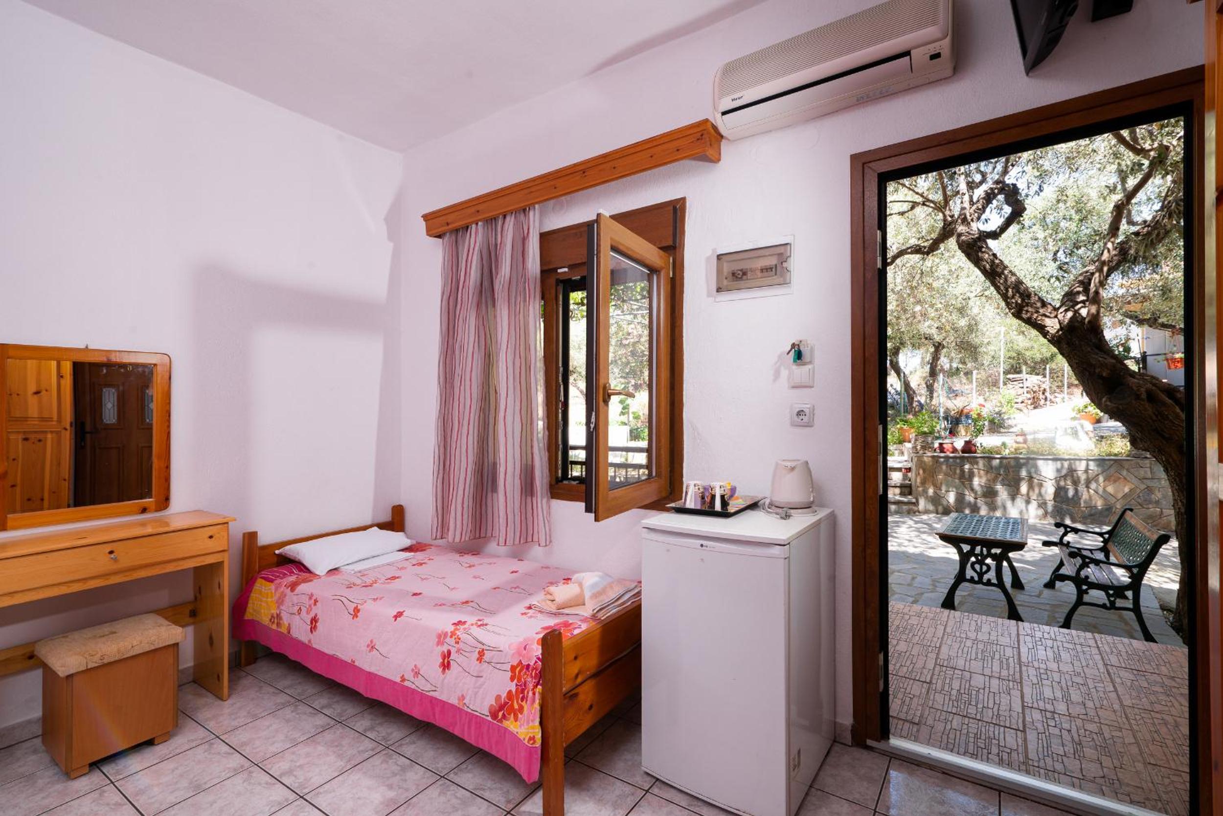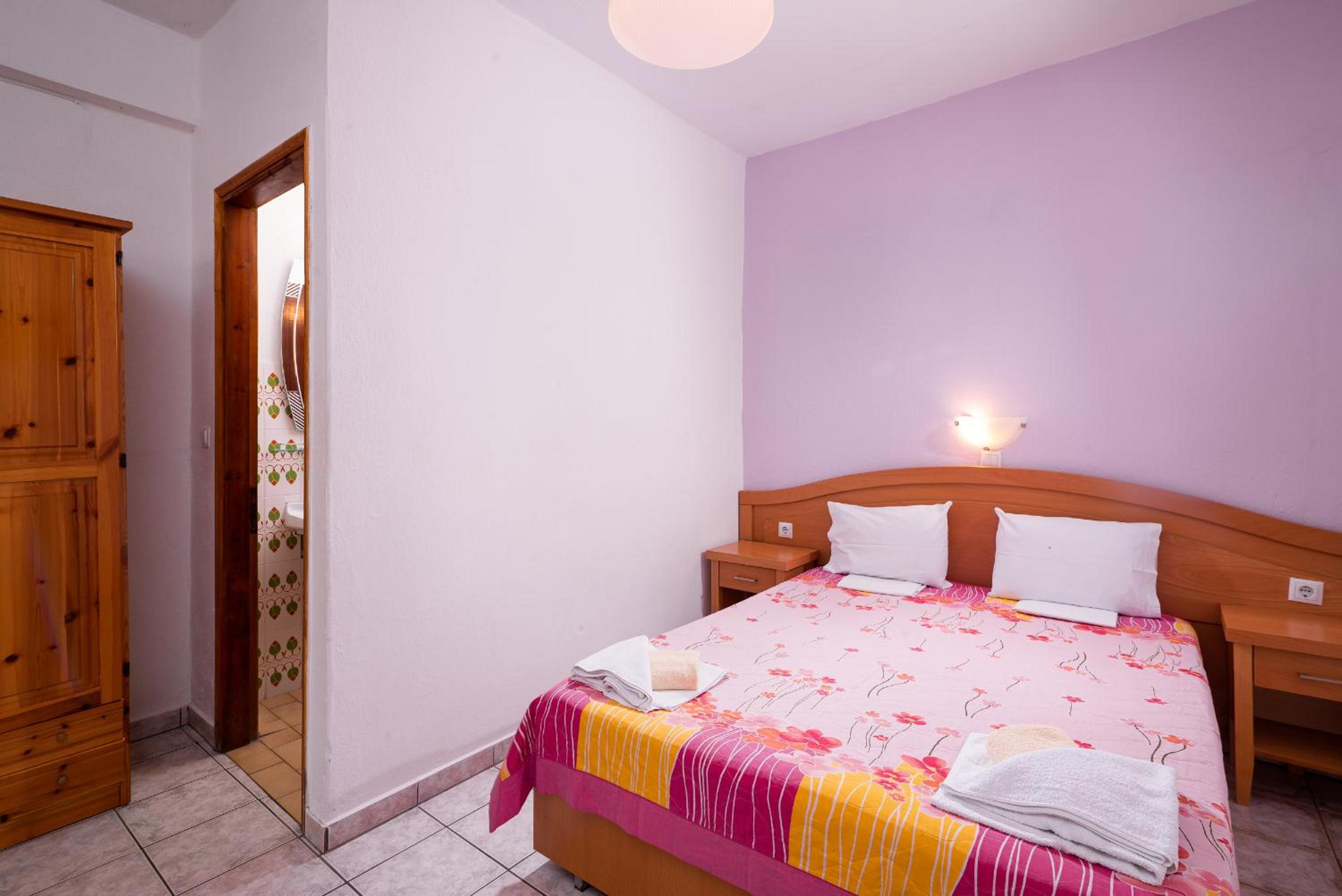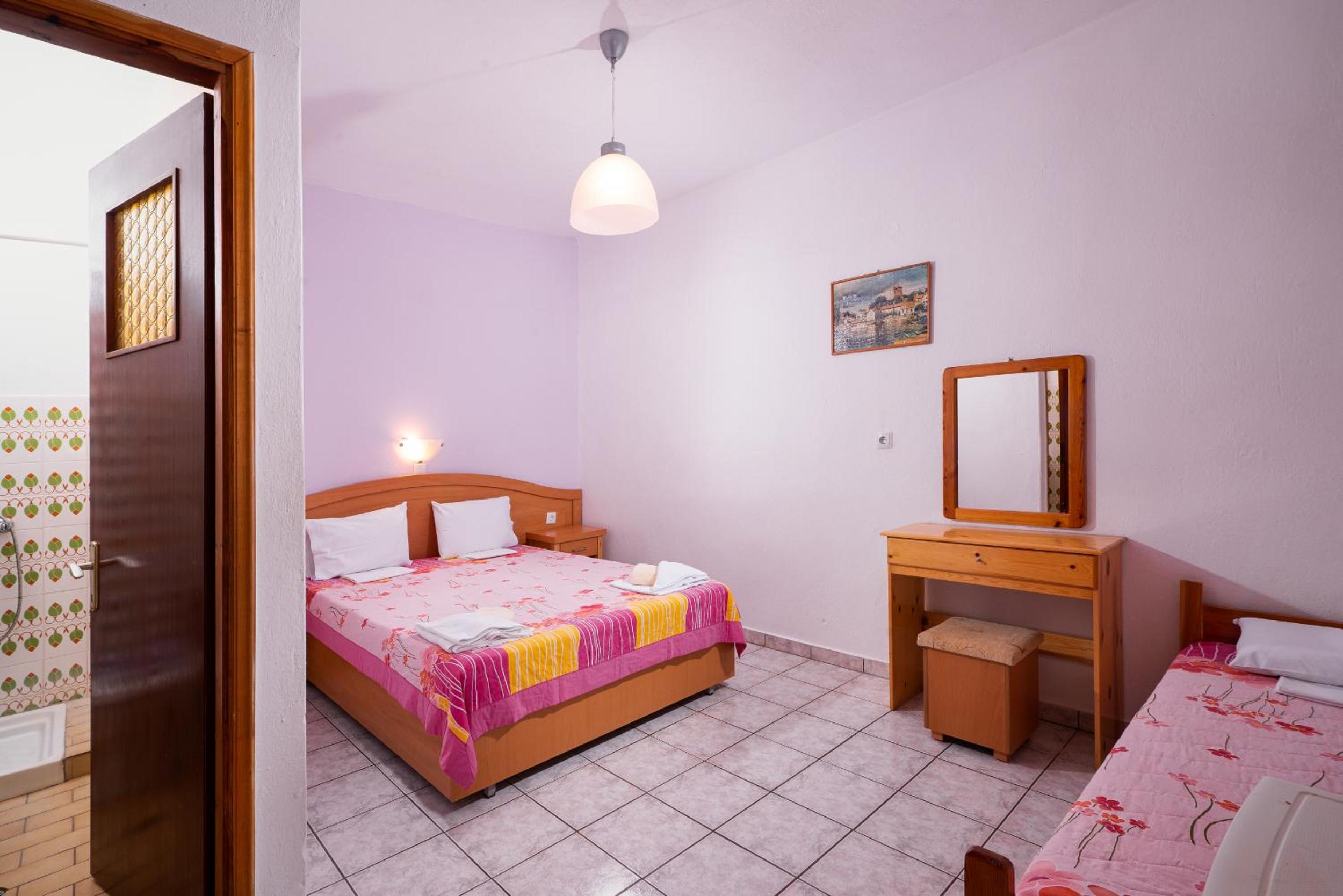 Nu este pt pretentiosi. Baia f mica ,cu gresie si faianta f veche. Usa de la baie foarte veche si murdara..Clima era veche,perdeaua din geaam parea murdara sau poate era doar f veche. Tot in camera pare vechi. Usa de la camera nu se poate deschide ziua ca intra viespi. Pe terasa nu poti sa stai sa iei o gustare ca vin viespile. La plaja de langa cazare este f greu accesul. Am fost doar in prima zi. Plaja Aliki este putin mai departe si se merge cu masina dar este f aglomerata. Paradise beach este la cativa km si am profitat de asta. Pretul pe noapte mi se pare prea mare pt conditiile pe care le ofera.