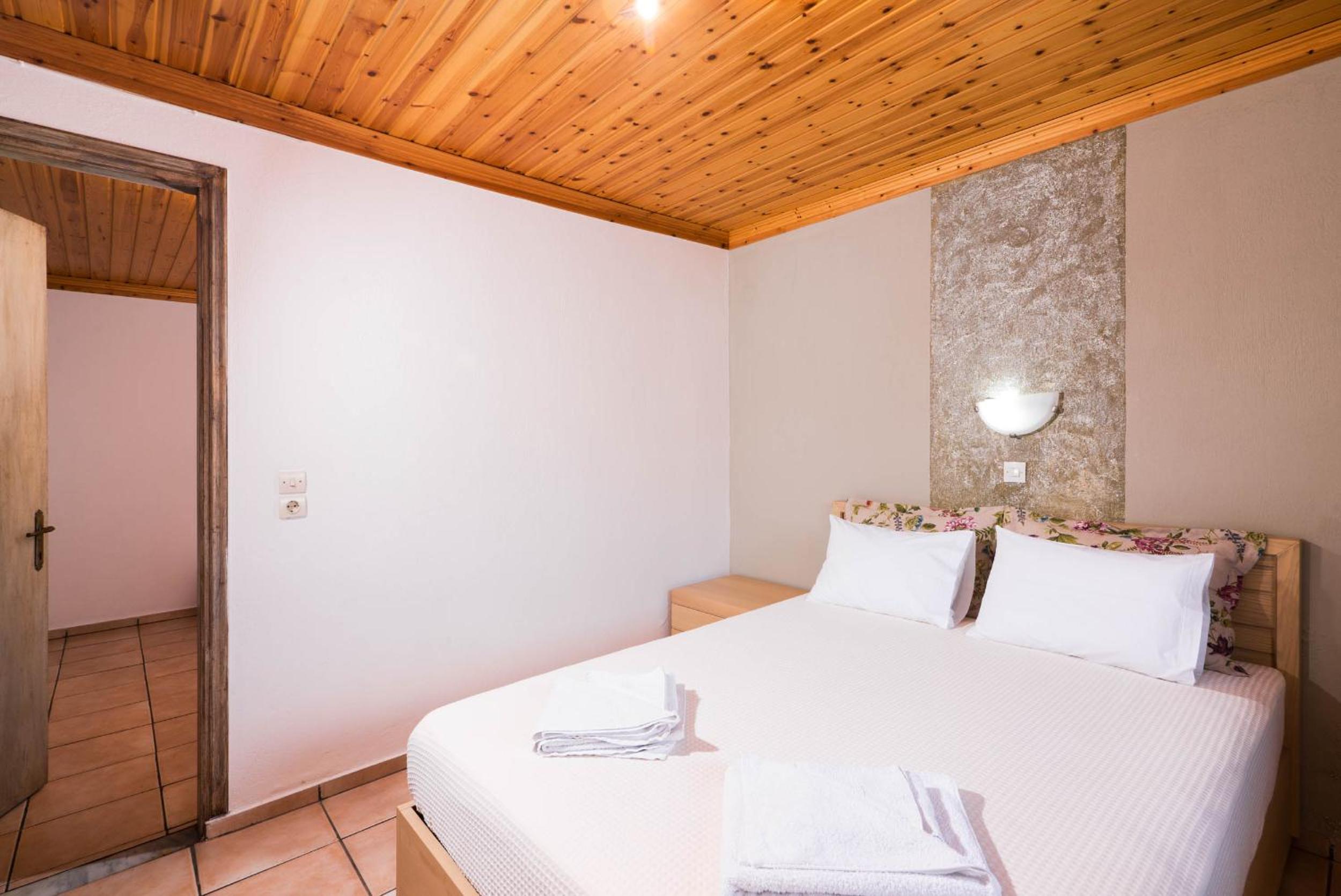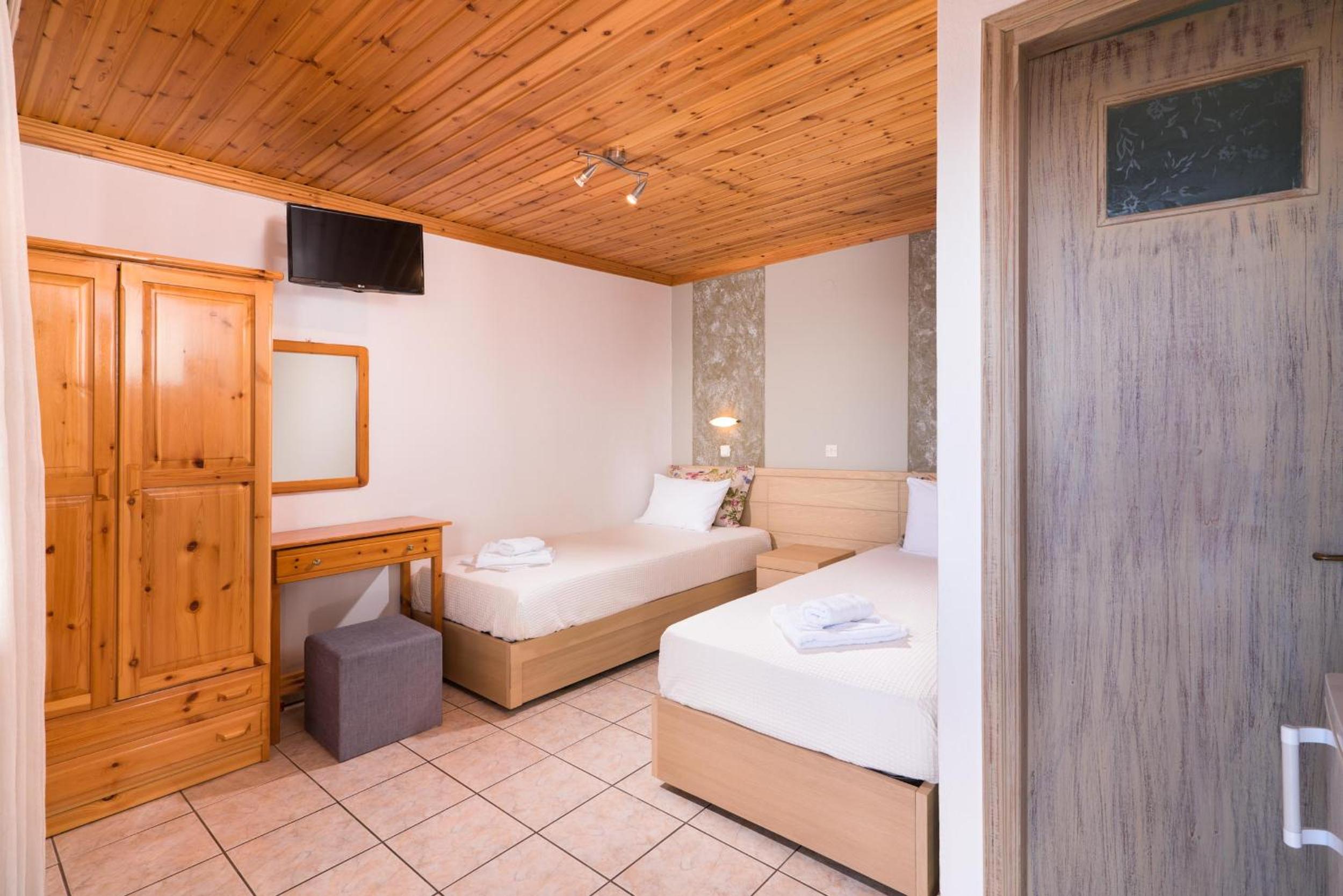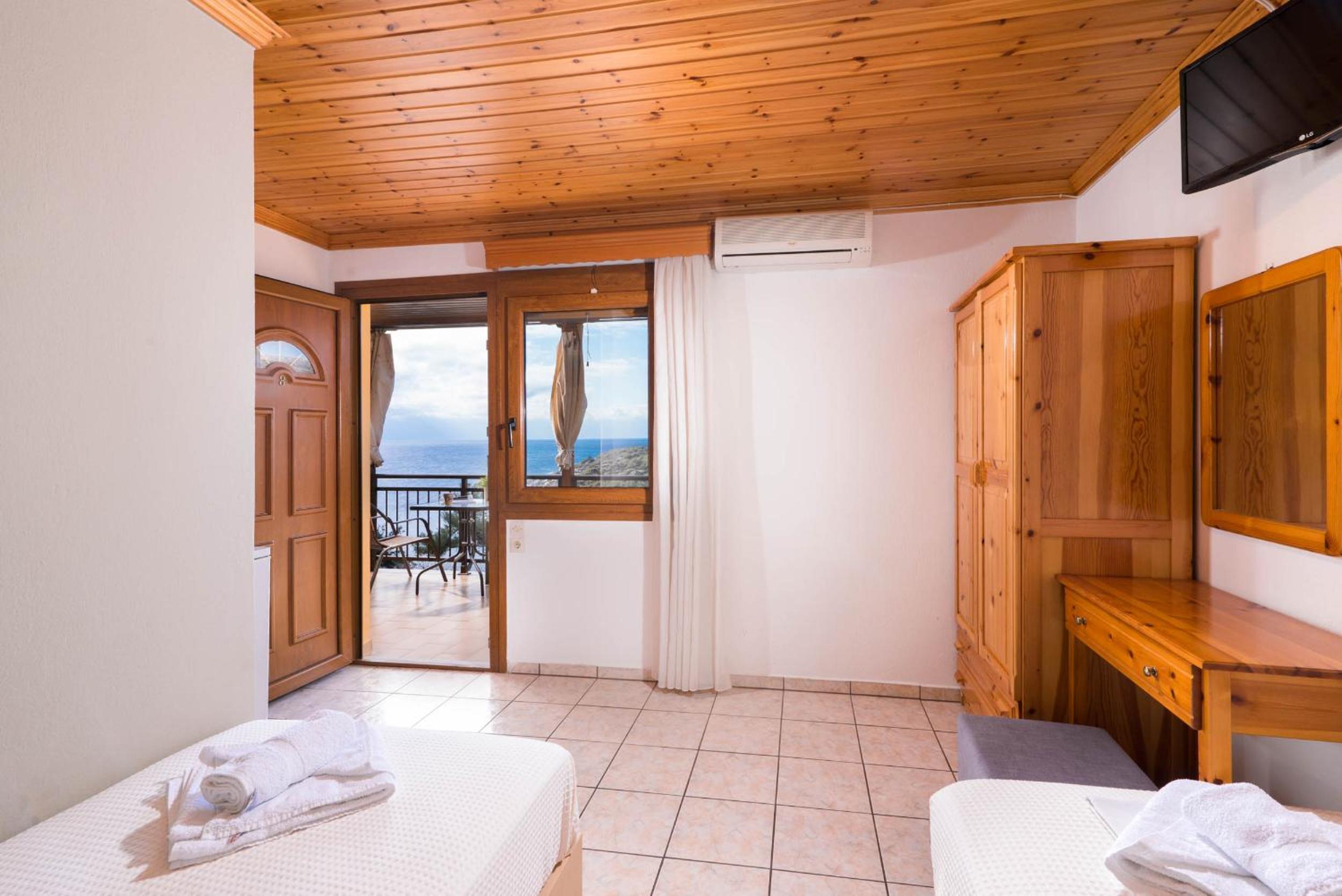 Nu este pt pretentiosi. Baia f mica ,cu gresie si faianta f veche. Usa de la baie foarte veche si murdara..Clima era veche,perdeaua din geaam parea murdara sau poate era doar f veche. Tot in camera pare vechi. Usa de la camera nu se poate deschide ziua ca intra viespi. Pe terasa nu poti sa stai sa iei o gustare ca vin viespile. La plaja de langa cazare este f greu accesul. Am fost doar in prima zi. Plaja Aliki este putin mai departe si se merge cu masina dar este f aglomerata. Paradise beach este la cativa km si am profitat de asta. Pretul pe noapte mi se pare prea mare pt conditiile pe care le ofera.