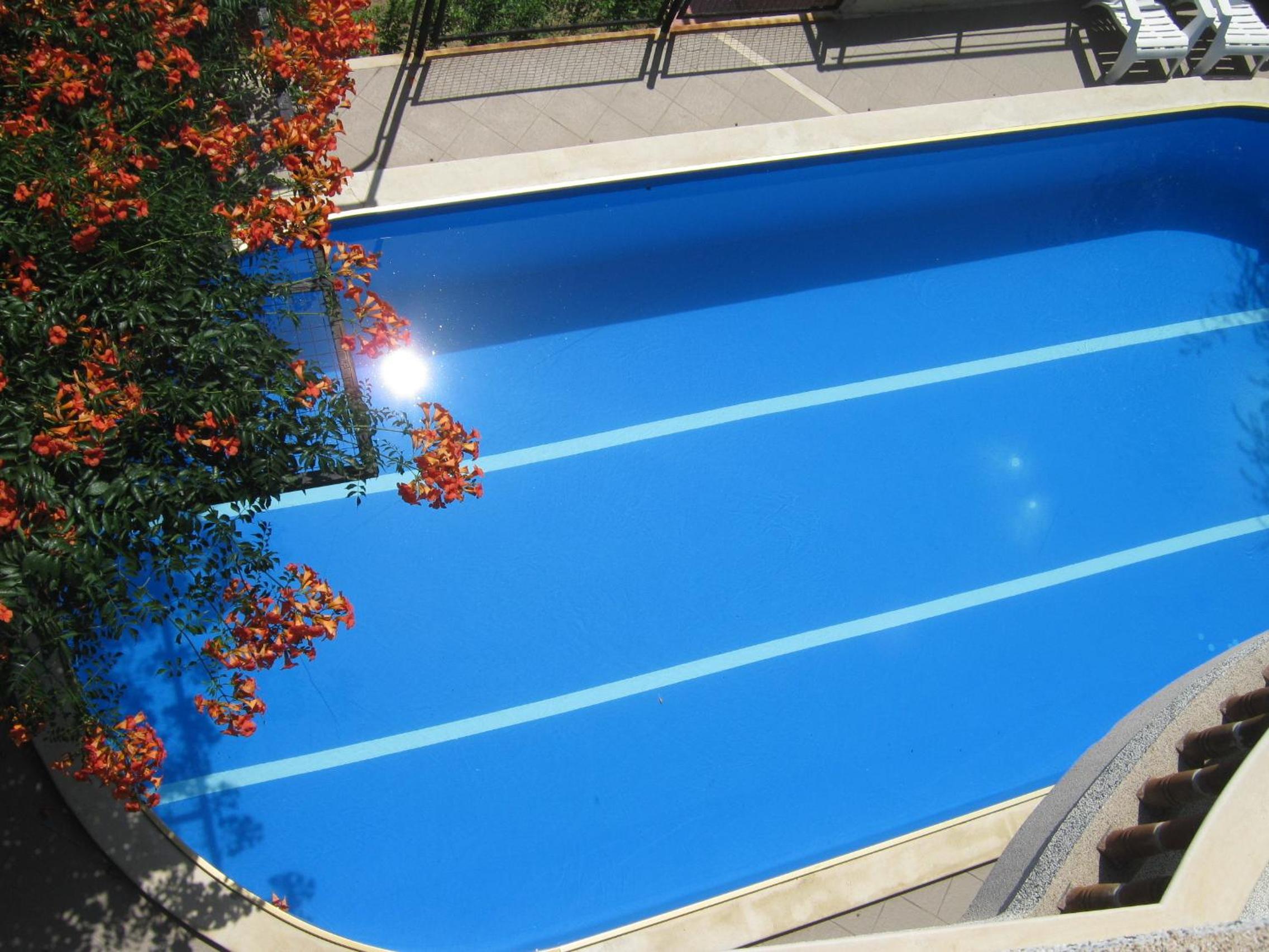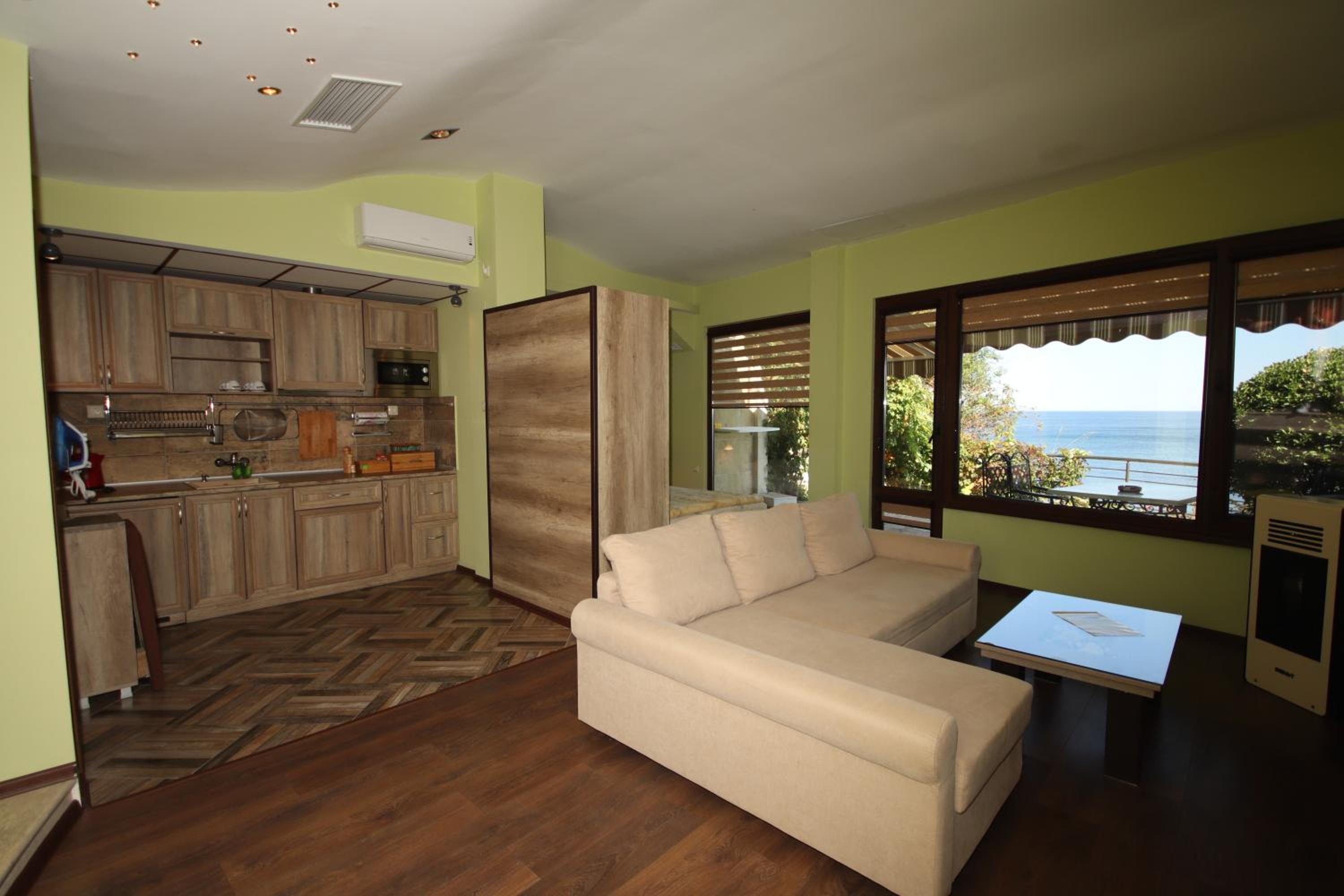 The view is amazing, right onto the sea front. Literally a couple of minutes walk to the beach. I stayed in one of the large apartments which are downstairs from the reception. The room was immaculately clean and very comfortable. The terrace was a good size with a paved area plus grass, so there would be plenty of room for a group of people outside at the same time. The bathroom was a very good size and the shower was always nice and hot.