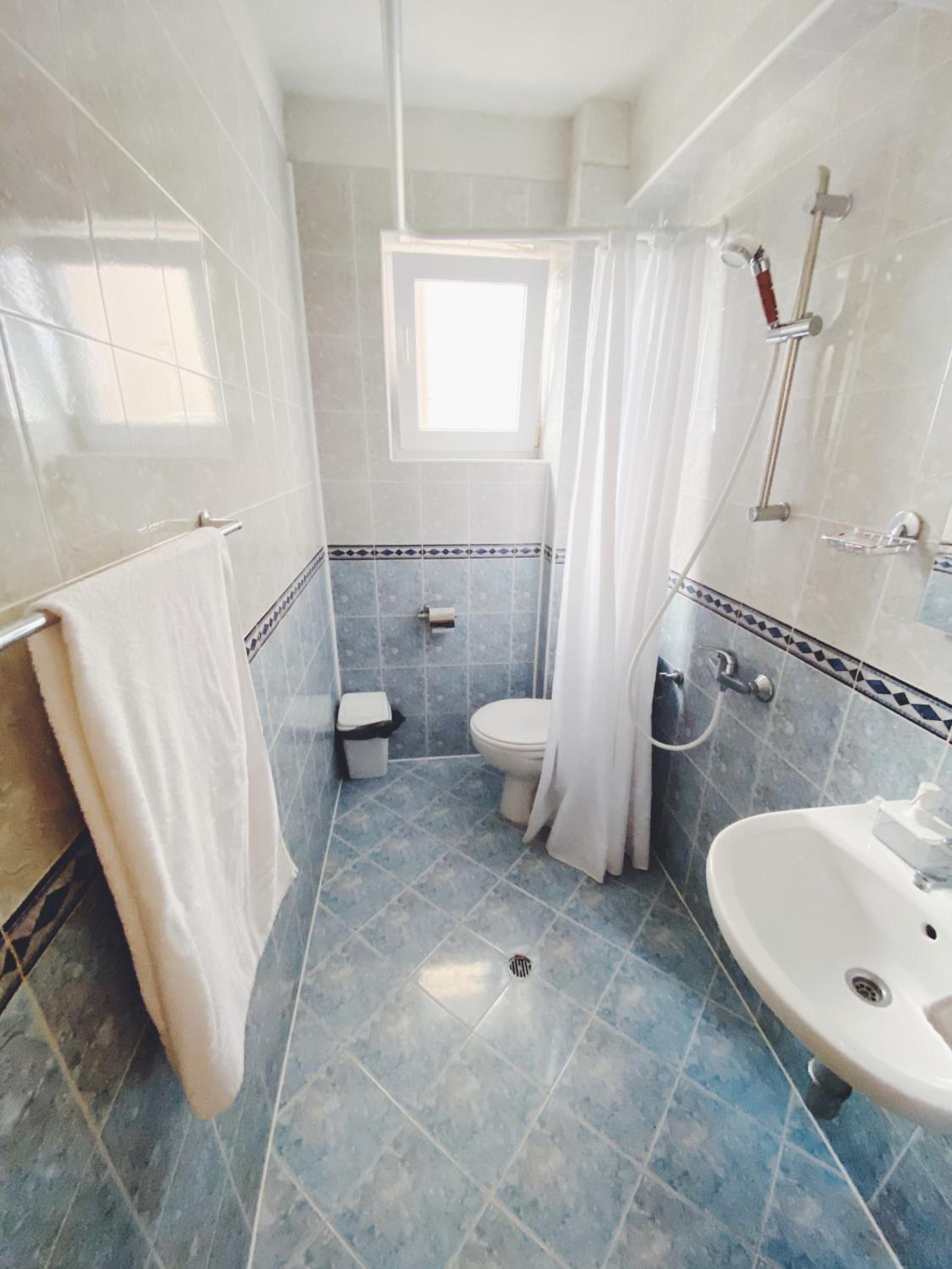 The water in the sink is brown, the sink is not fixed, there’s strong sewage smell in the bathroom, the shower is not separated from the toilet bowl, the whole room and appliances are very old, the AC is visibly dirty and not serviced. There’s barking of the dogs in the neighborhood throughout the whole night.