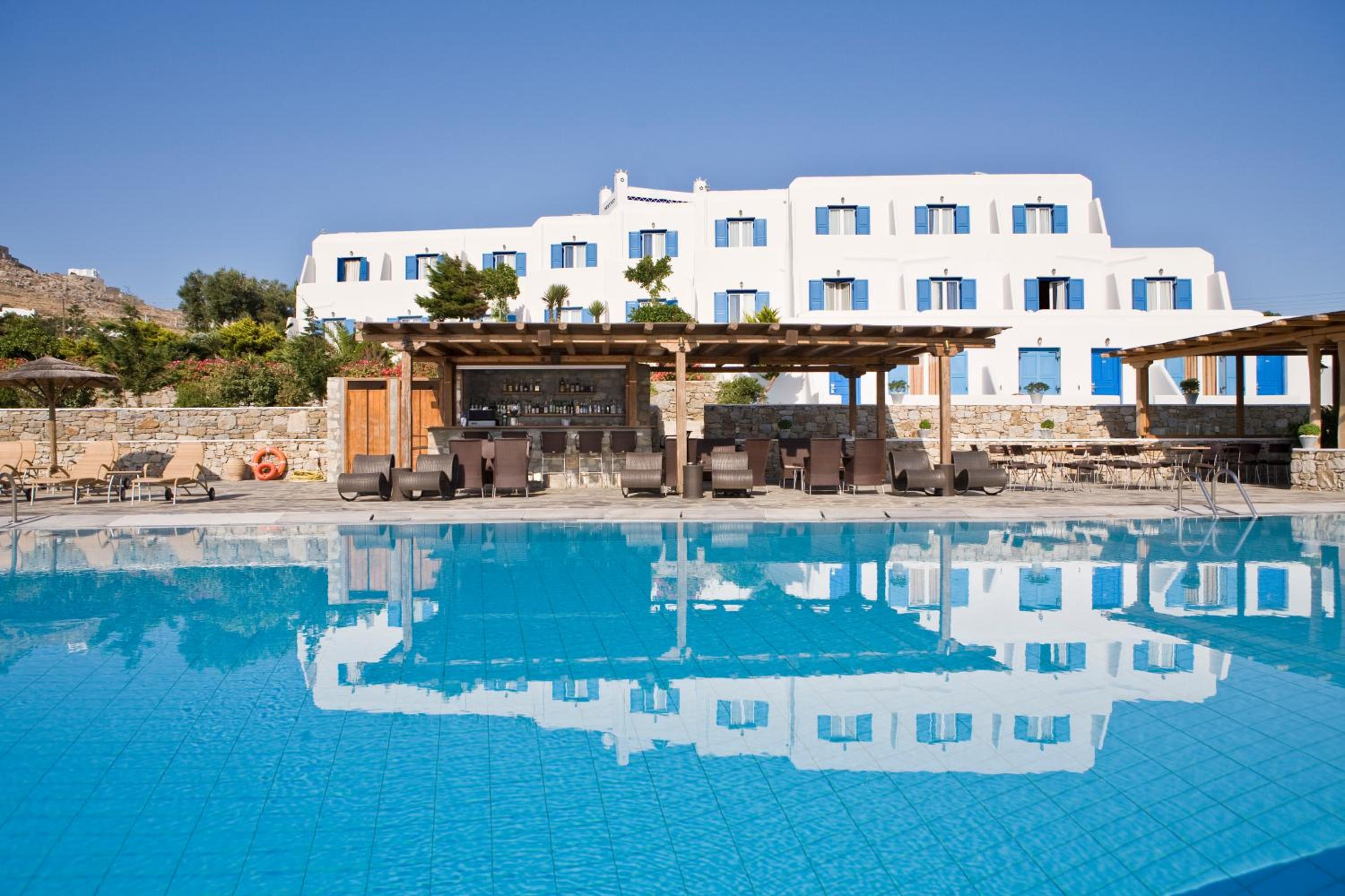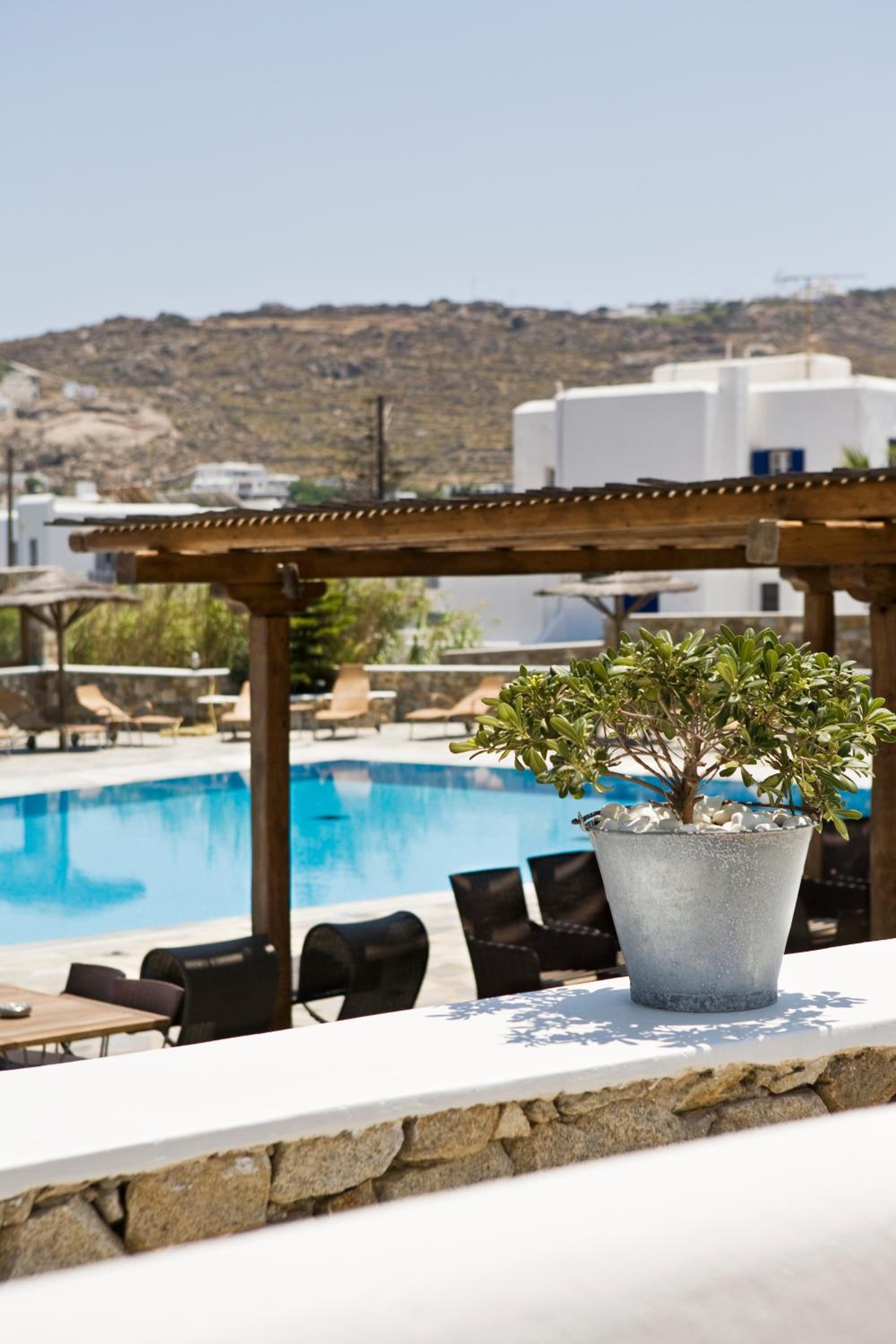 The location is nice and the walk into the town of Mykonos is long, 35-45mins, but there is a bus stop close to the hotel that is 2 euro into town. They have a nice pool and in walking distance to the beach and restaurants.