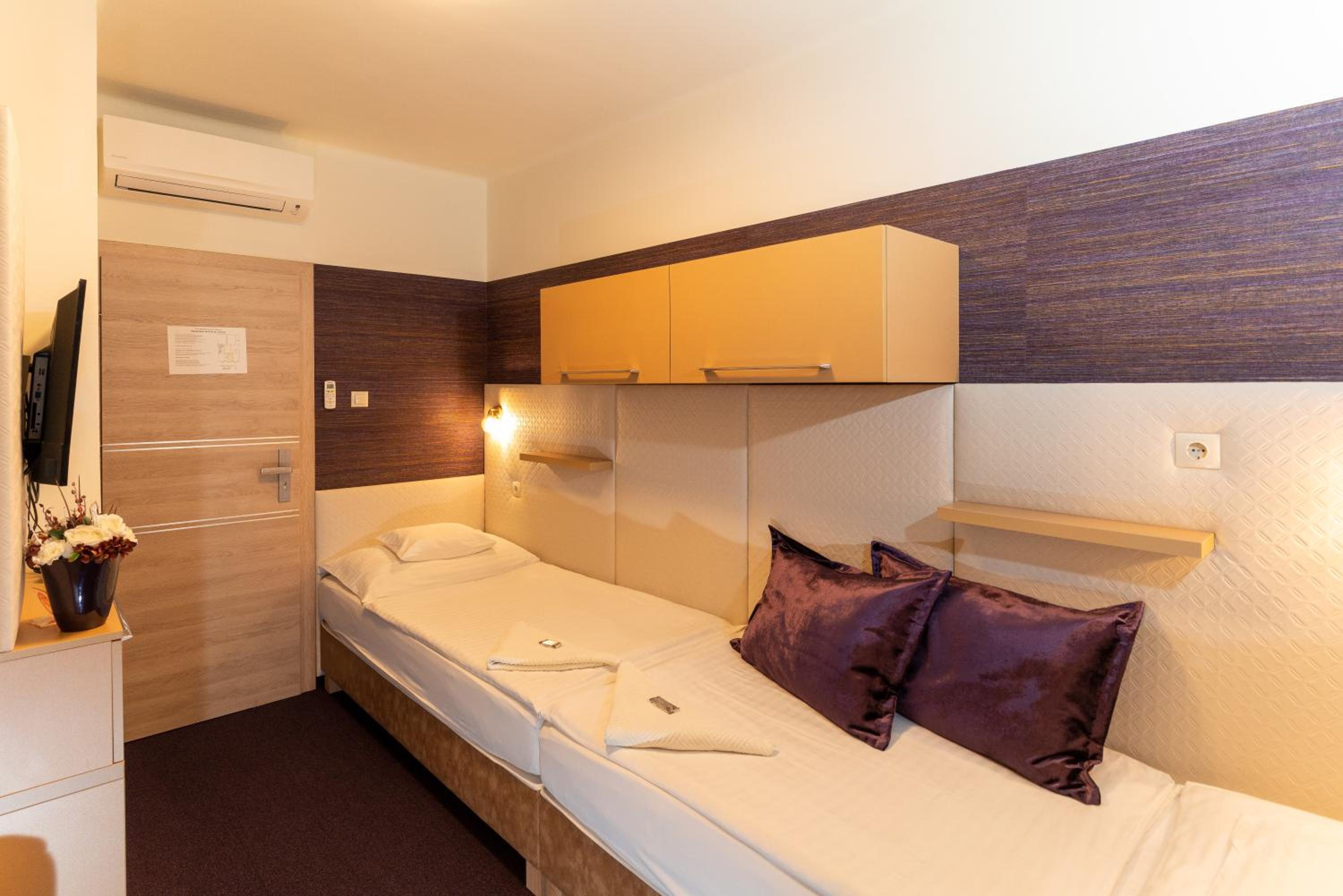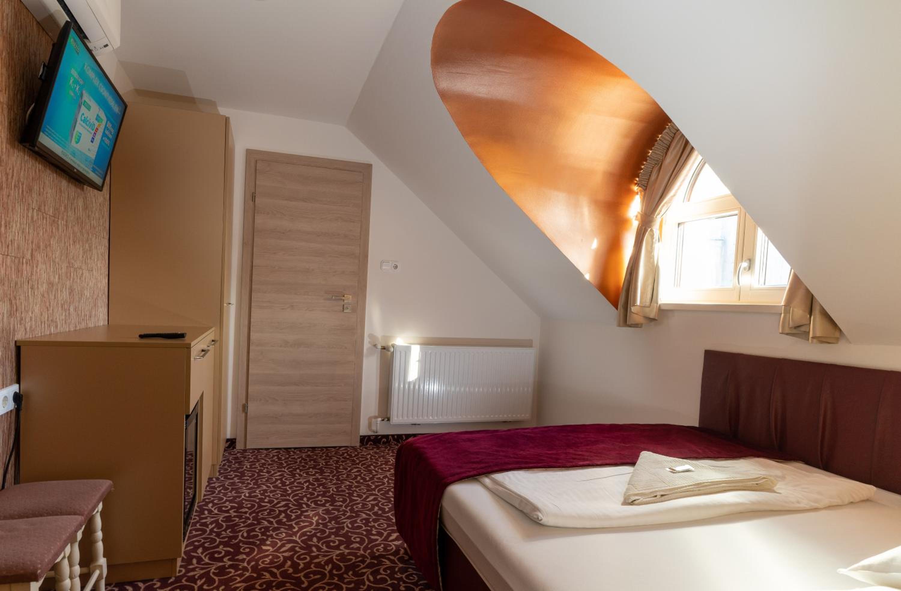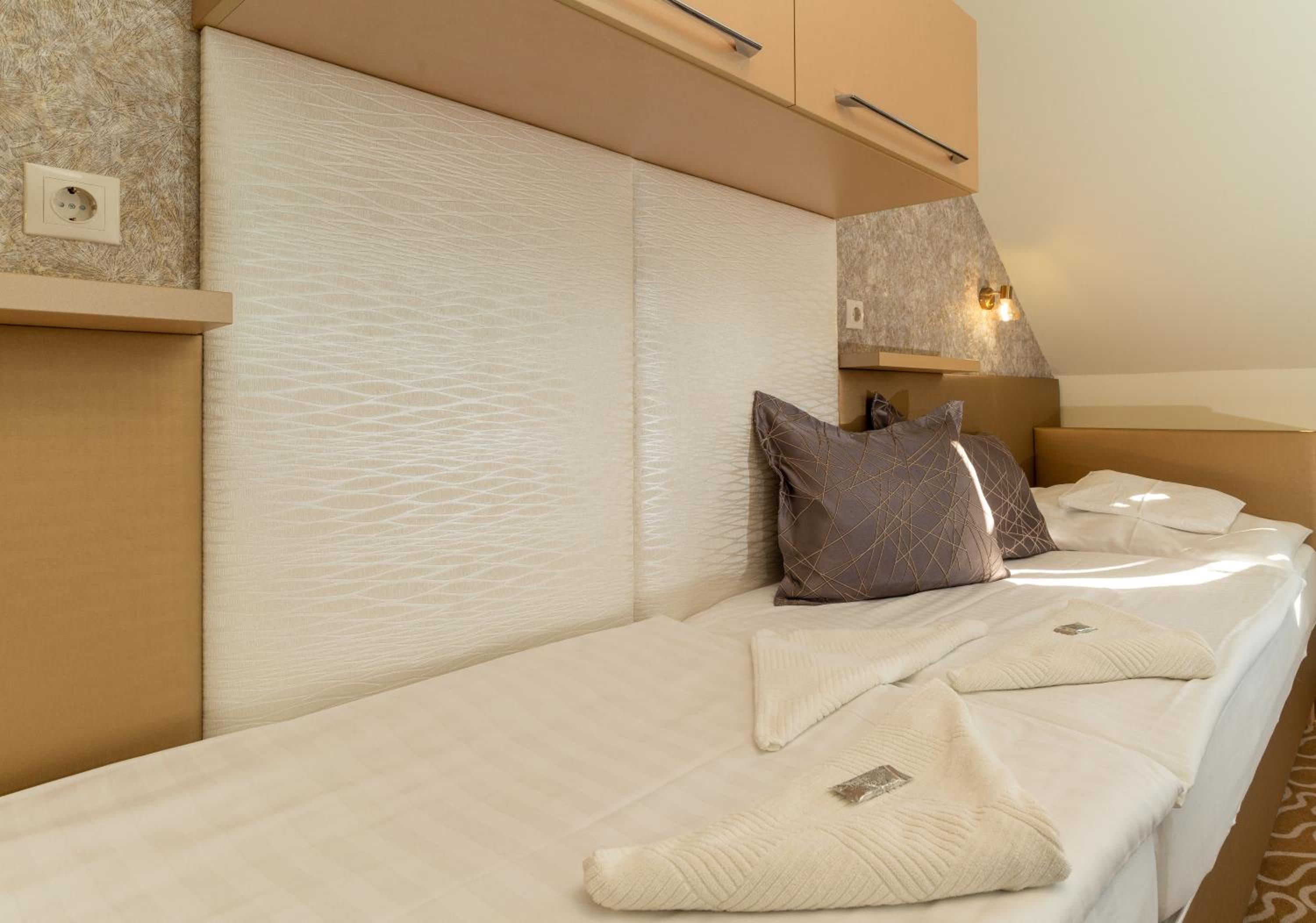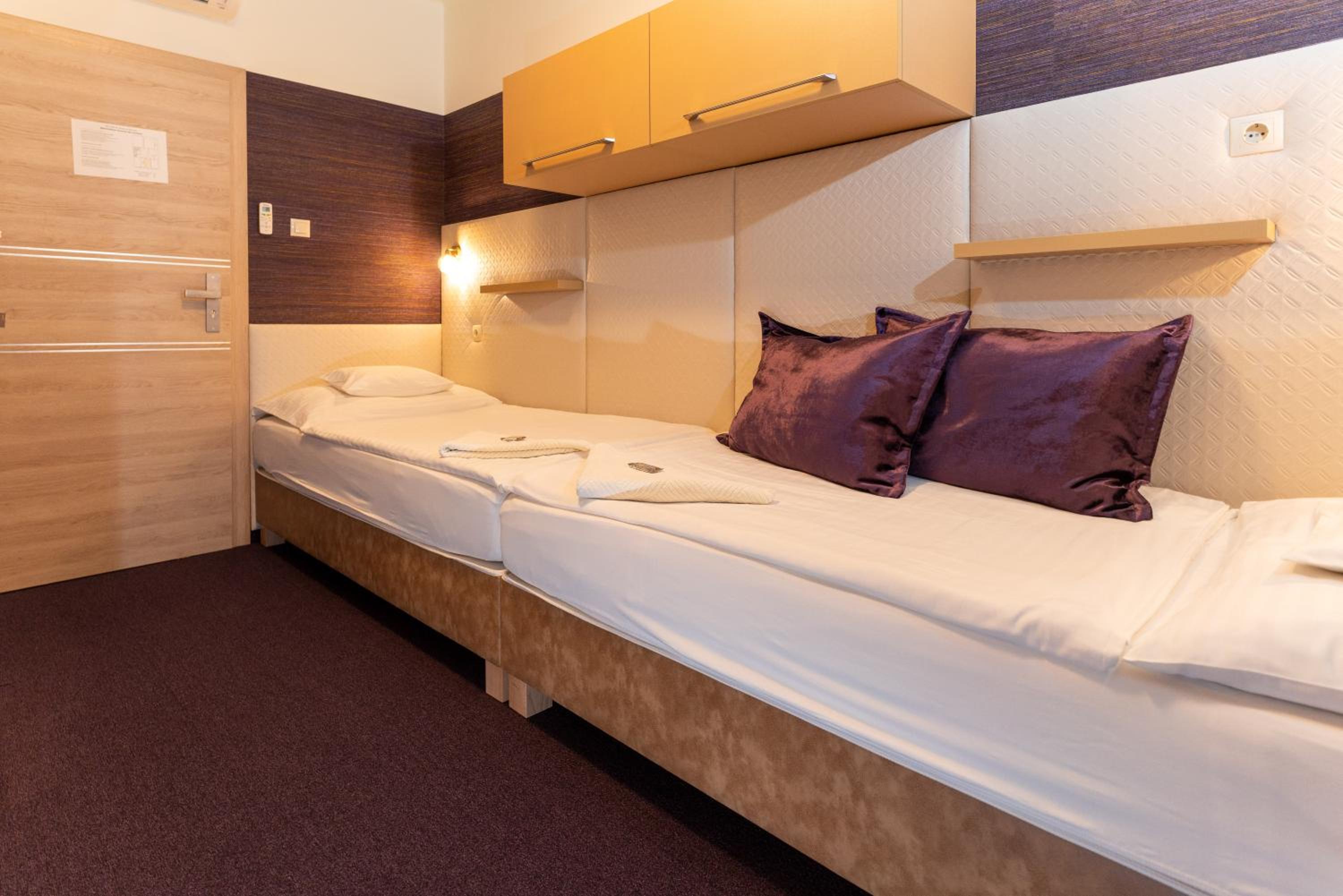 Bár úgy tűnt hogy miénken kívűl nem sok szoba volt foglalt, mi mégis egy tetőtéri szobát kaptunk ami a legfelső szinten volt amivel összeségében semmi gond nincsen viszont a szobával kapcsolatban volt némi negatív észrevételem, a radiátorok hidegek voltak nem is lehetett őket feljebb tekerni a szobába volt klíma azt el tudtuk indítani de a fürdőbe nagyon hideg volt. Fürdőszobában törött volt a járólap, szerintem kicsit baleset veszélyes .