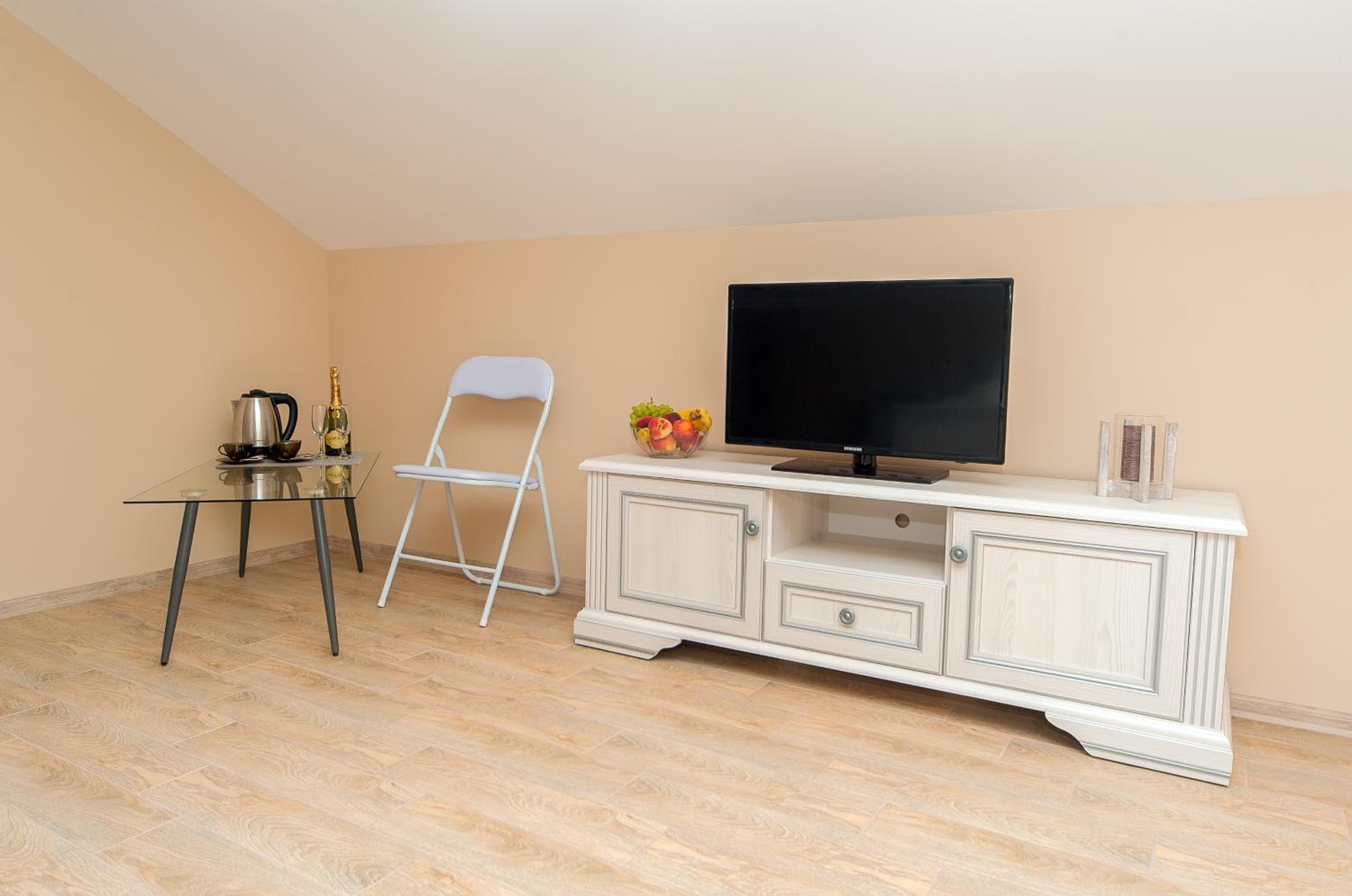 В номері немає праски (принесуть, якщо попросити), не достатньо кухонних приборів (є овочева дошка, але немає ножа, немає виделок), і мінус - немає мікрохвильової печі