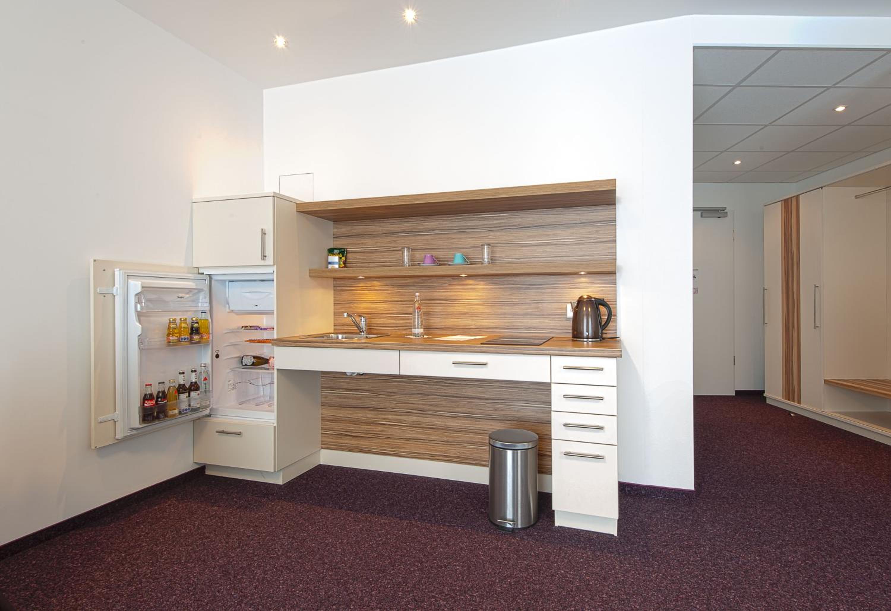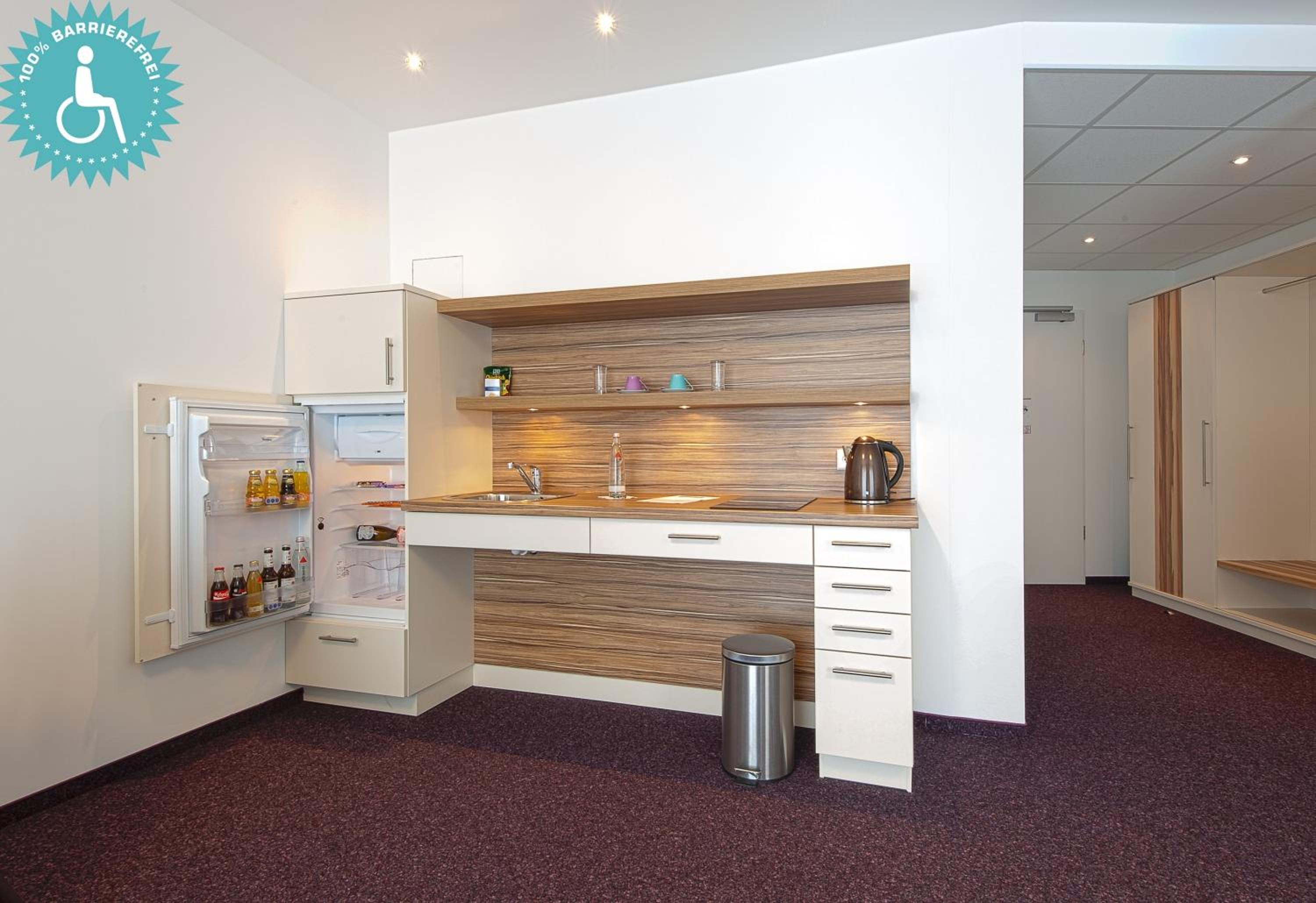 Enjoy the comfort of our spacious rooms at Lichtblick Hotel Garni, each equipped with a convenient kitchenette for your convenience. Relax in style with a flat-screen TV and a private en suite bathroom.