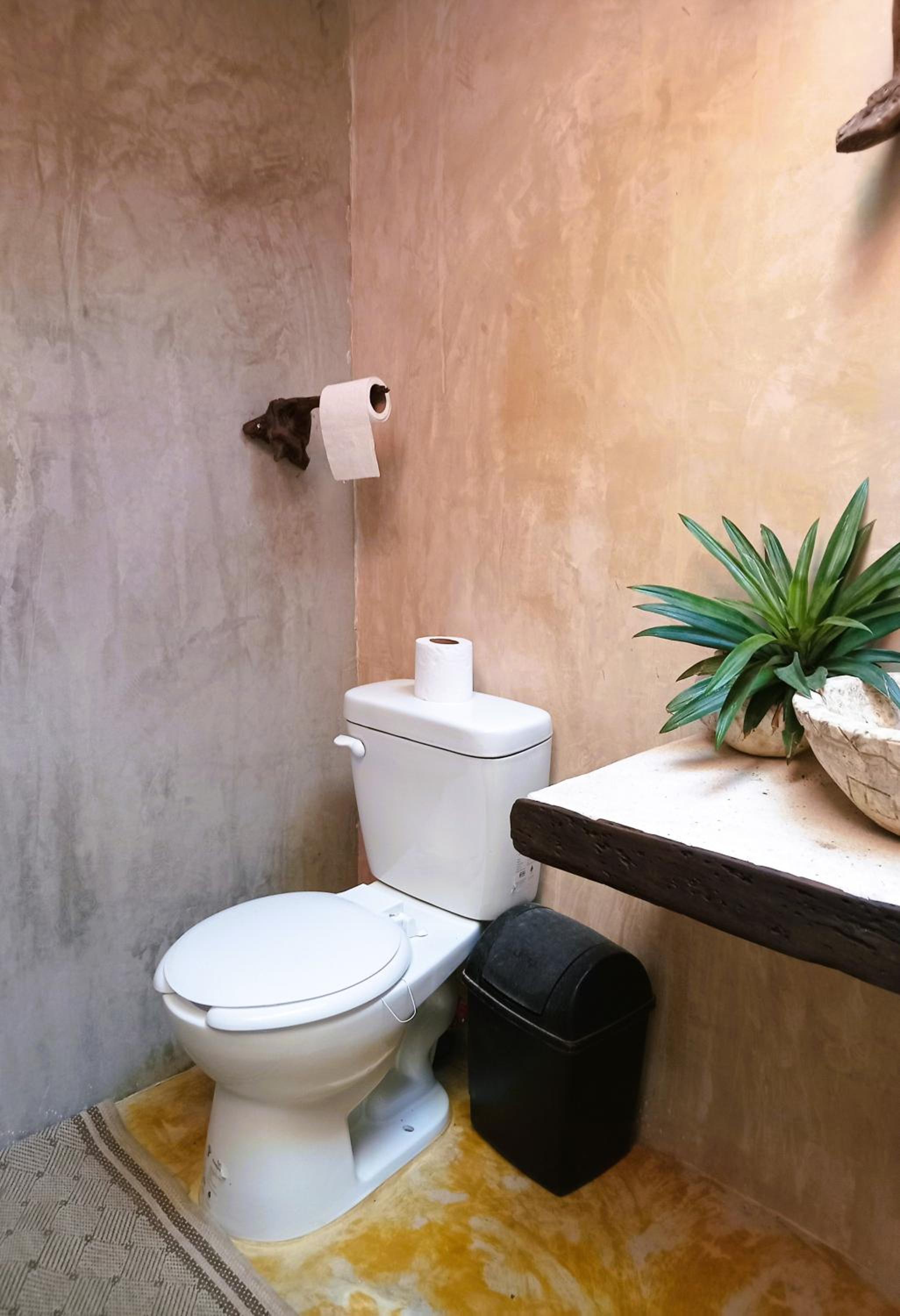 Onze badkamer was nog buiten onze cabana. Wel hadden we het hele gebouwtje voor onszelf. Mauricio is momenteel in alle cabanas een privé badkamer en suite aan het maken.