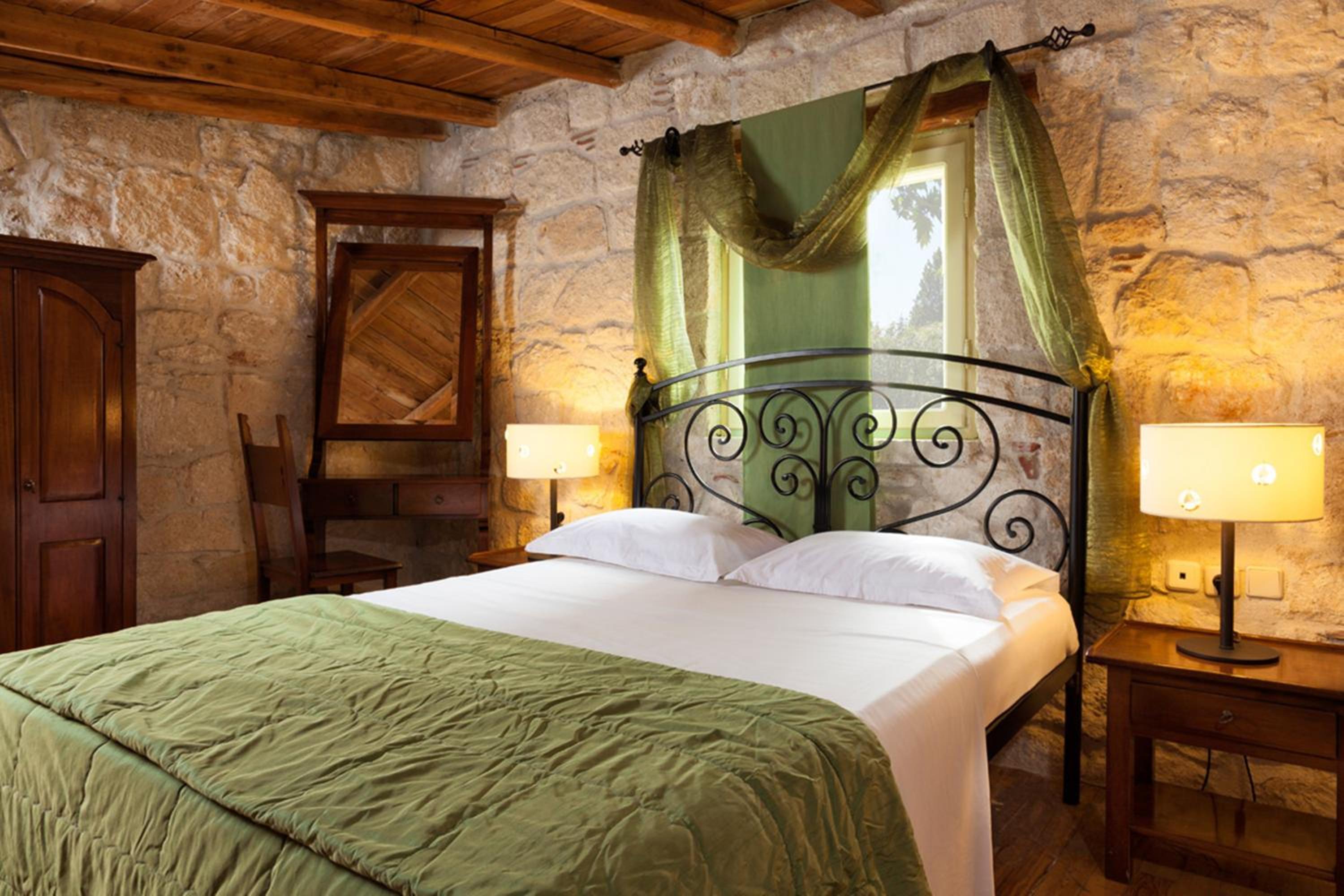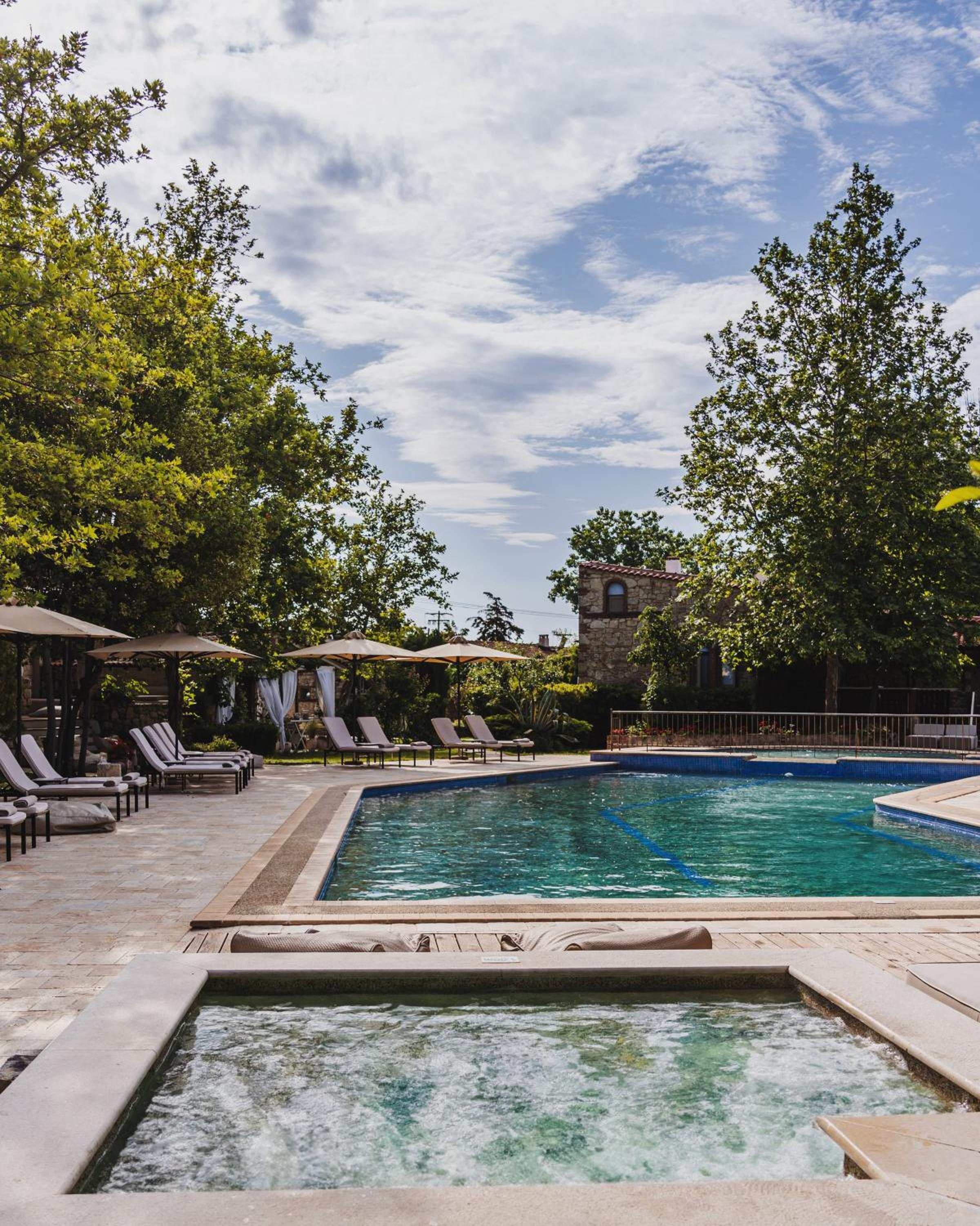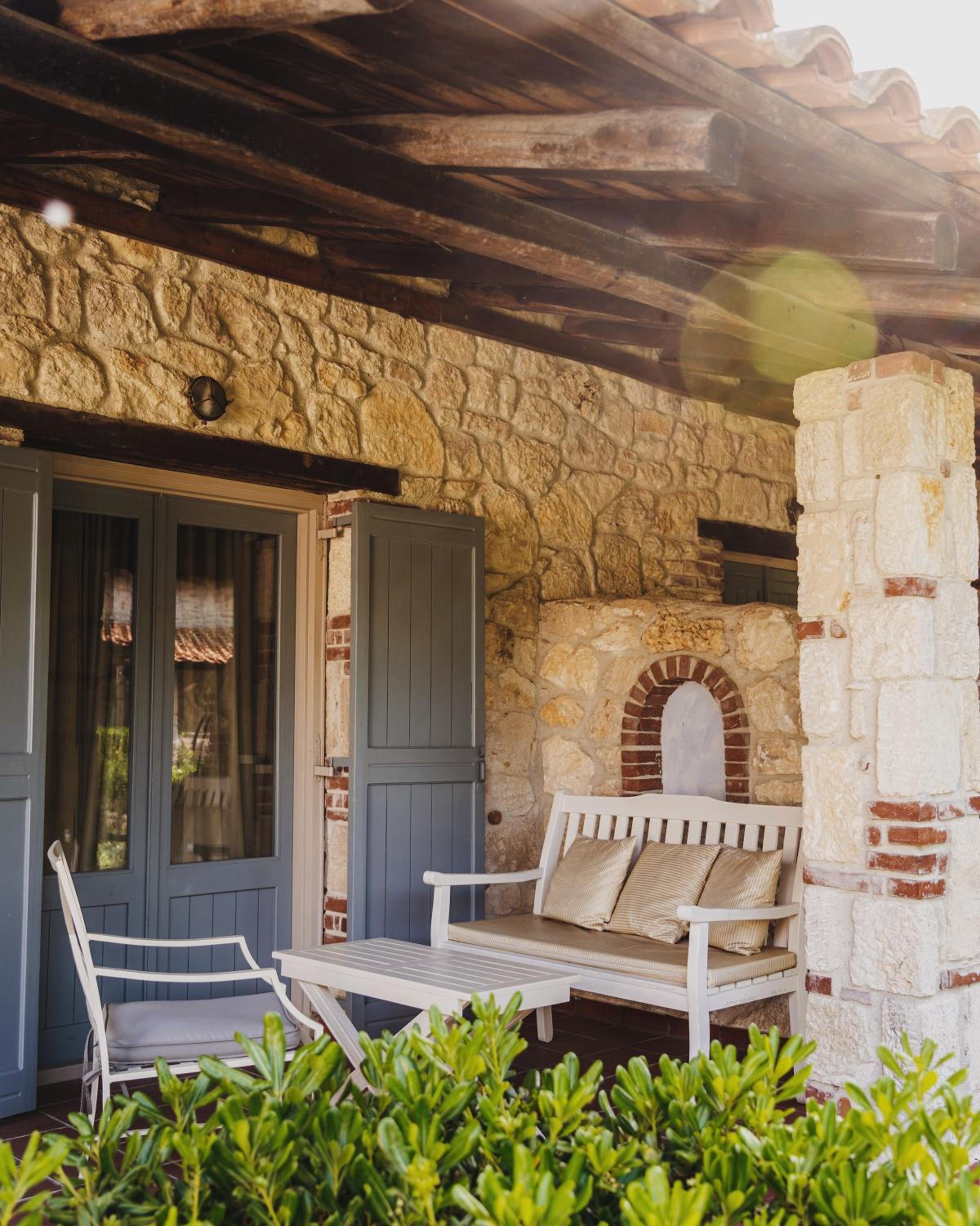 Secluded Gardens and Eco-Friendly Construction: Nestled among gardens with olive and fruit trees, this stone and wood hotel blends seamlessly with nature.