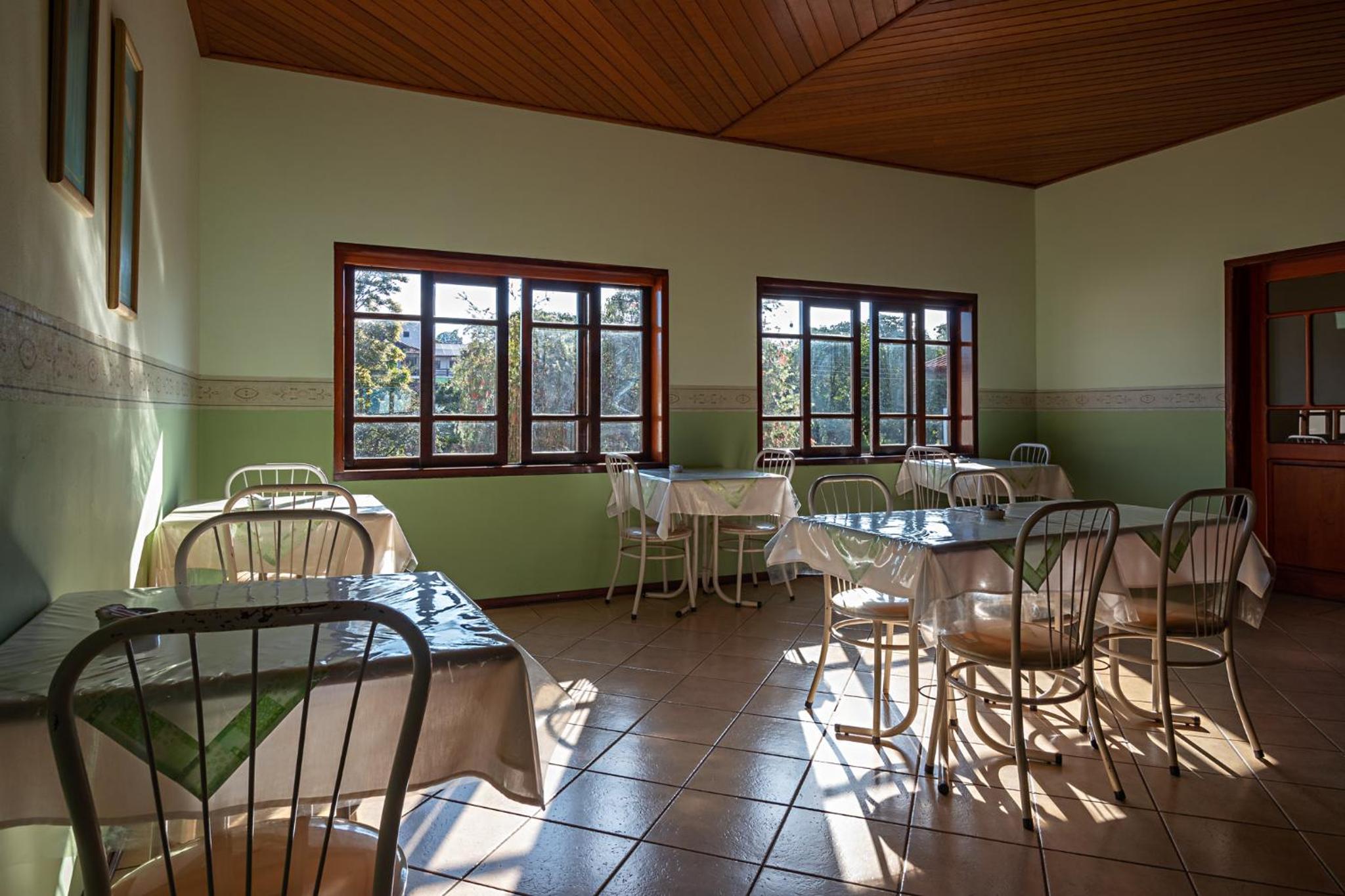 O café da manhã havia pratos quebrados os recipientes de armazenamento dos sucos e.paes são de plástico algo bem hilario para os dias atuais segundo estudos que mostram o quanto é prejudicial a saude resumi do cafe bem simples