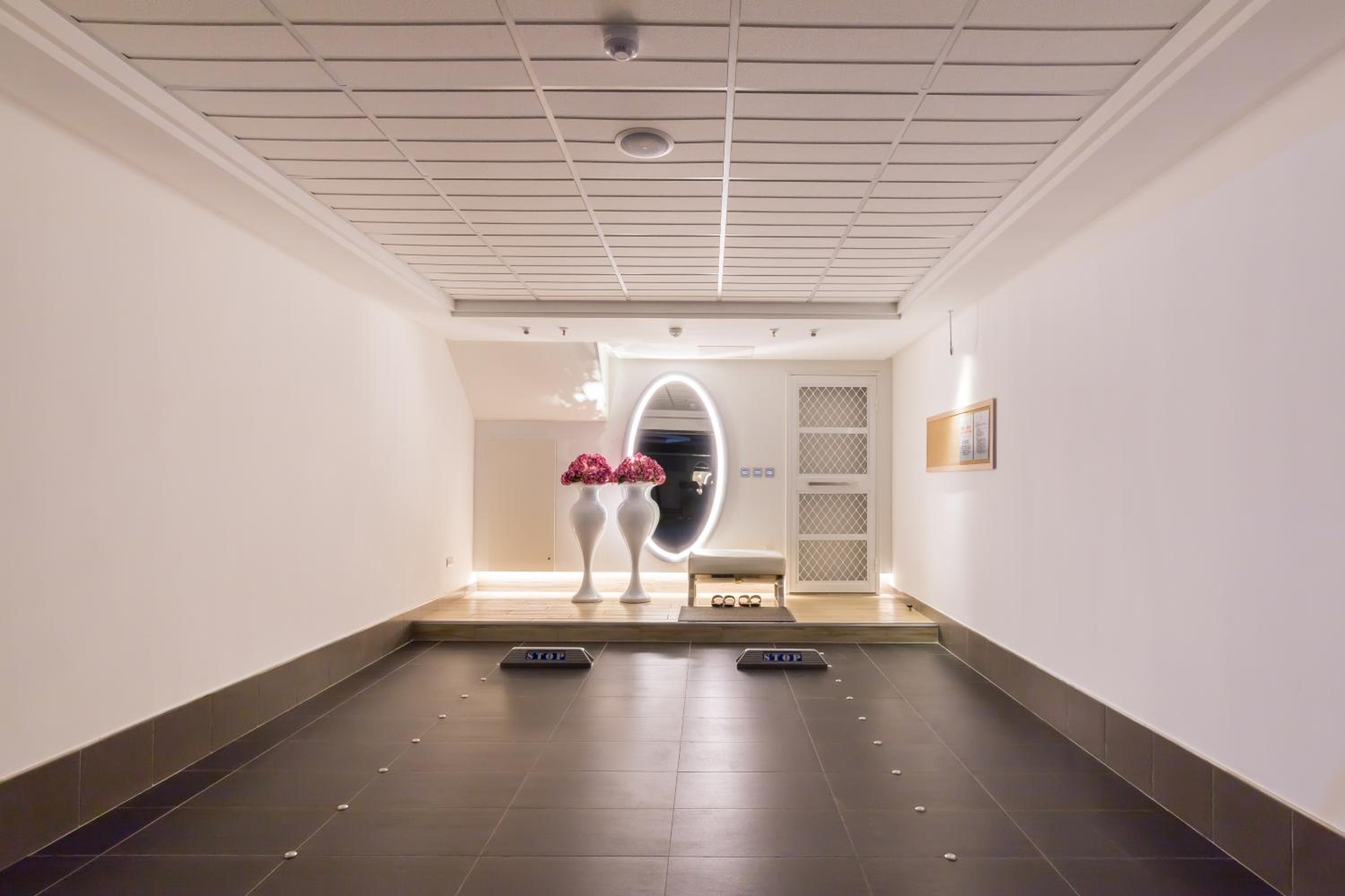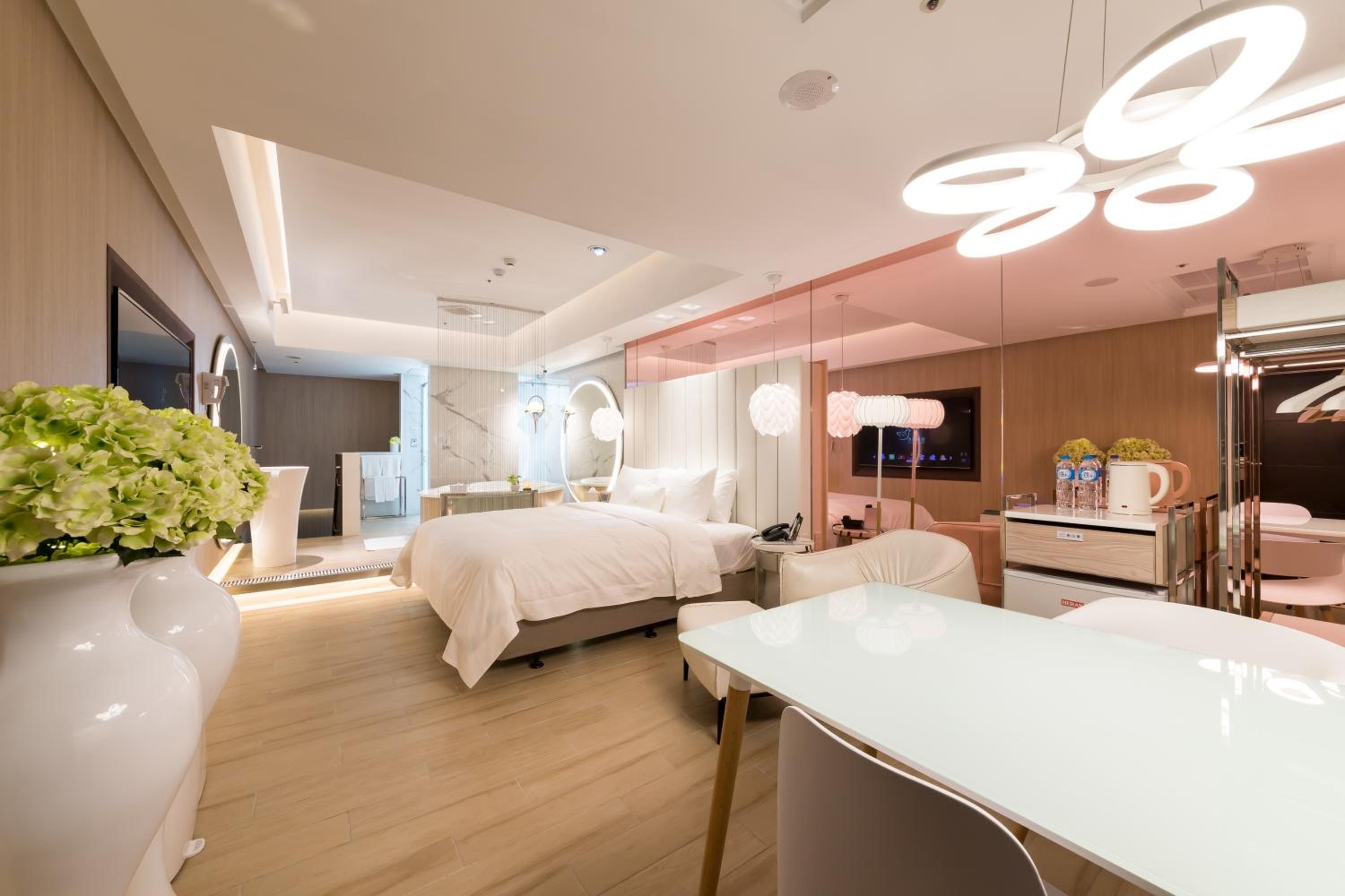 + Spacious rooms, clean (with air con, dehudifier AND air purifier in room, after check out I noticed many rooms were ventilated with industrial fans) The dehubdifier and air purifer can be turned off at night and the emergency exit signs aren't too bright. No window in the room apart from frosted bathroom one so excellent for sleep in darkness. In fact the whole hotel is pretty dimly litoutside your room for maximum discreetness (super dim hallways to the restaurant area and super dim undercover driveway area to the parking space under your room) I didn't notice the driveway feature till the next morning upon checkout when I was expecting there to be sunlight opening the garage door! The motel is well designed in this aspect allowing both garage and main building access which is pretty cool and convenient for buffet breakfast next morning!