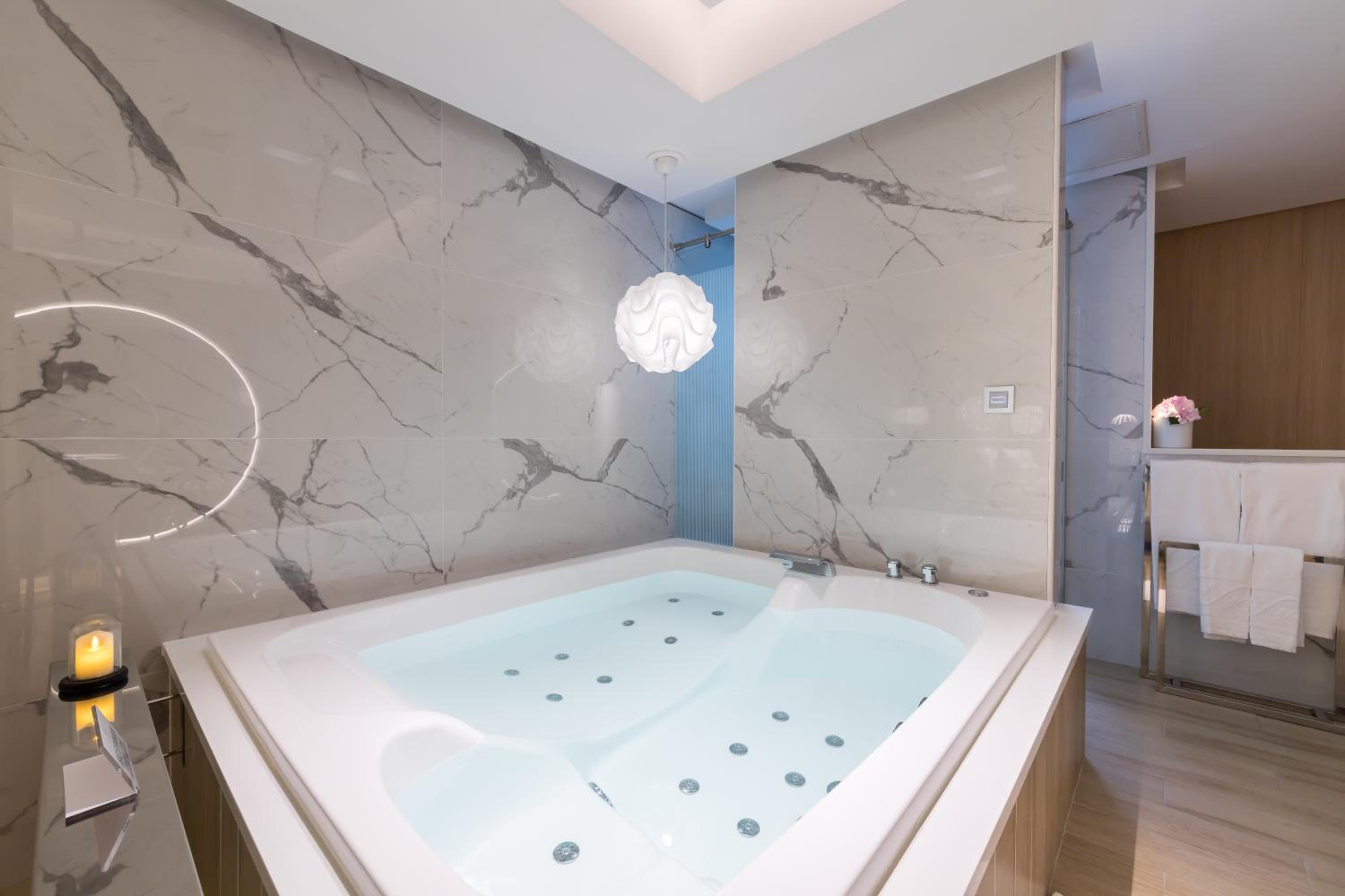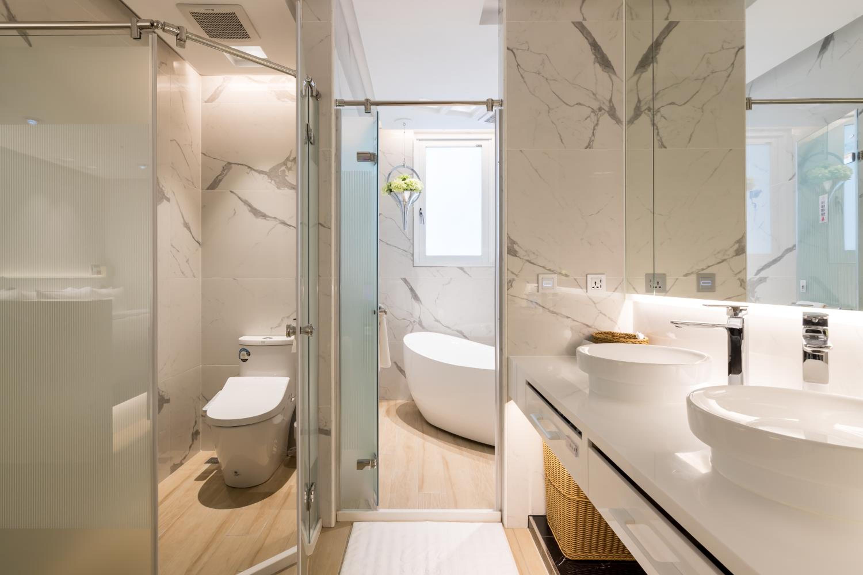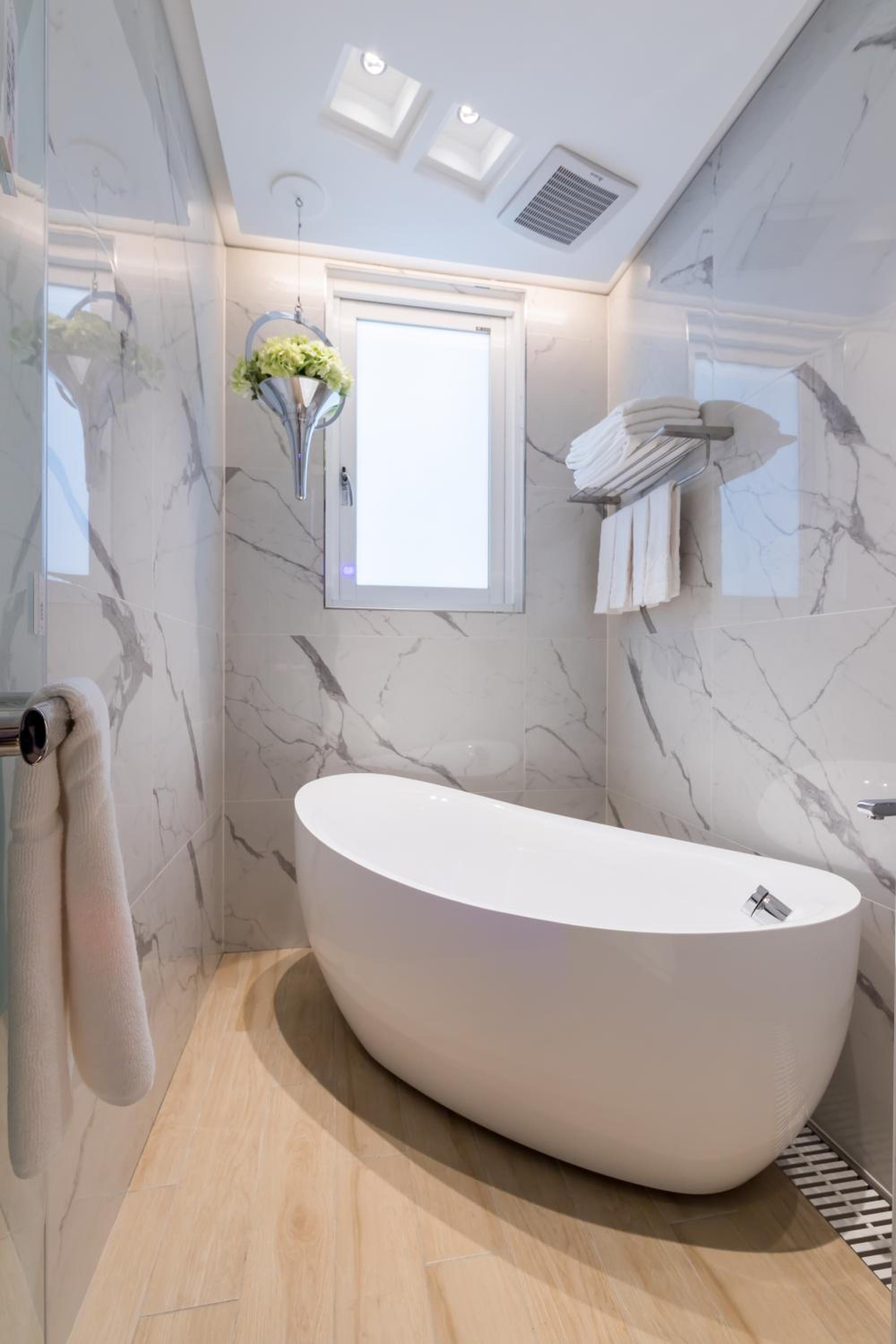 + Comfortable large spa and basin in room, somewhat separated toilet and shower area (by a door) and a nice steam sauna feature in the shower (so blissful)