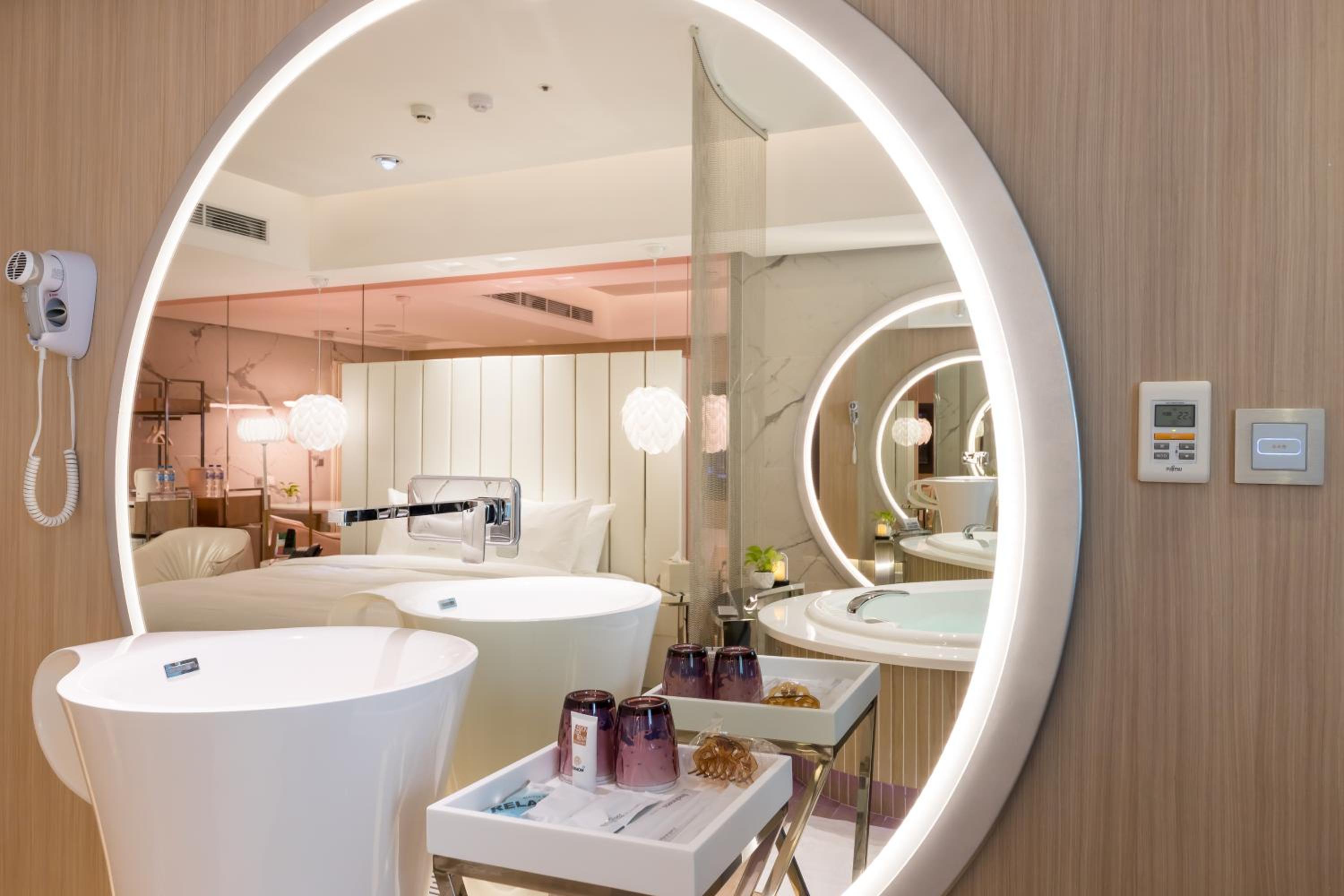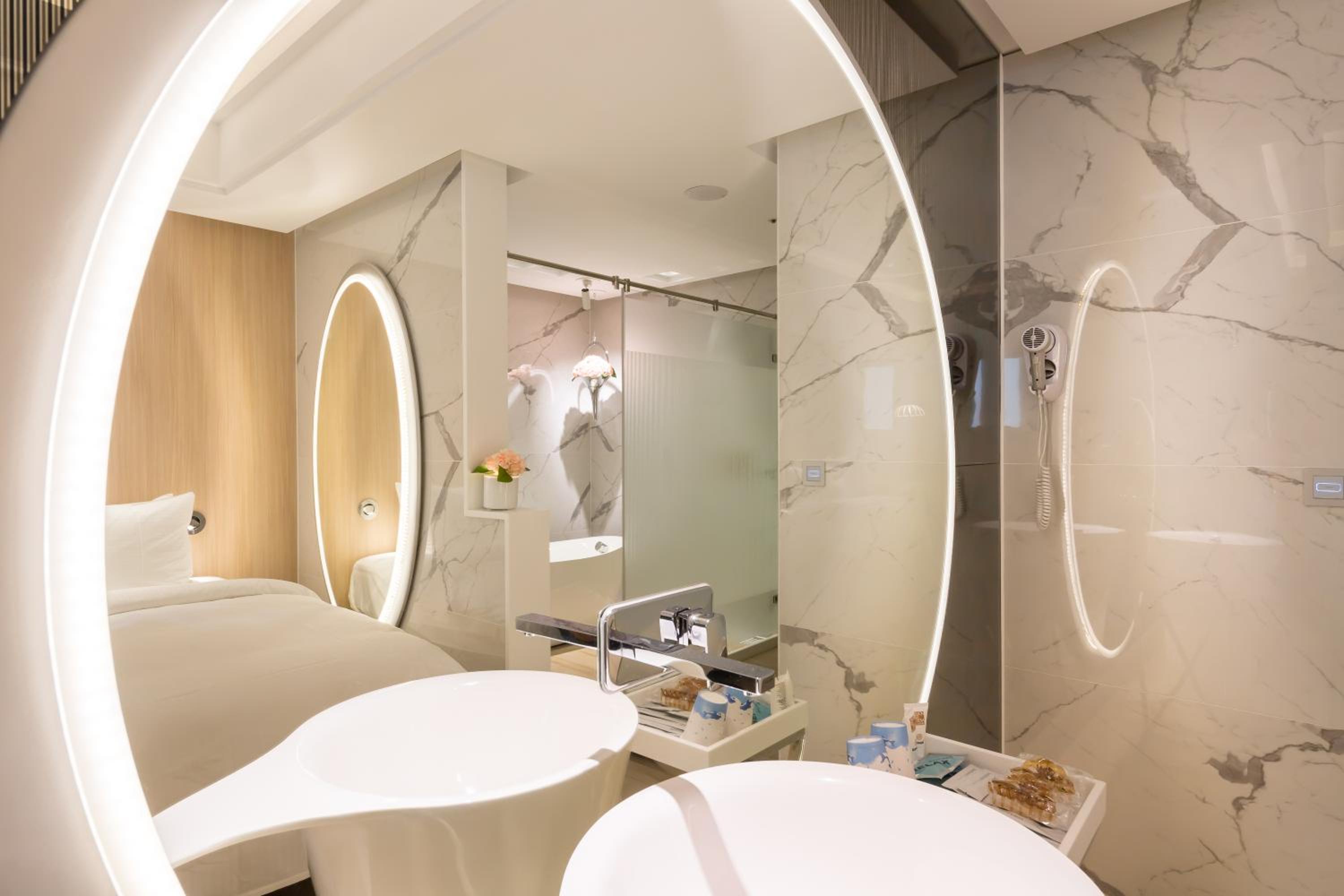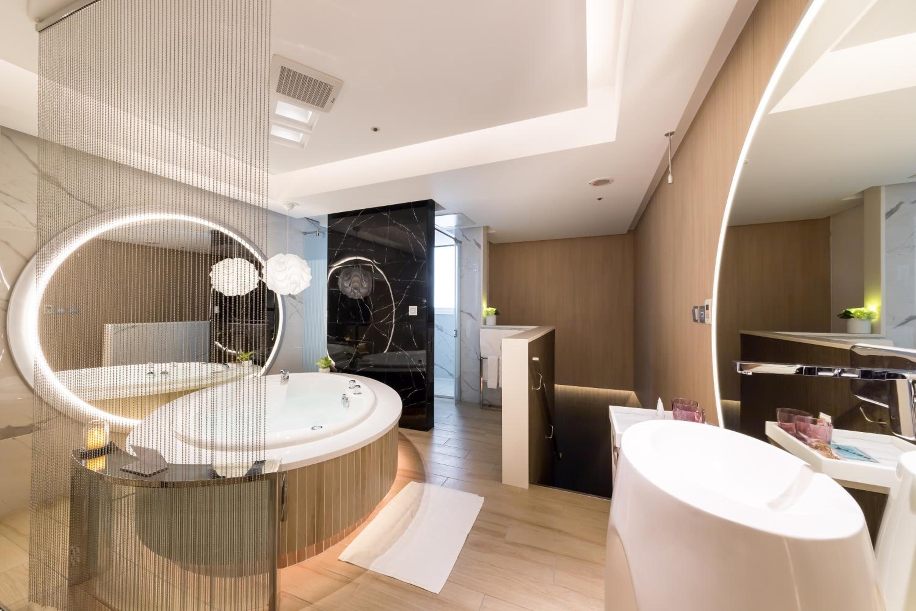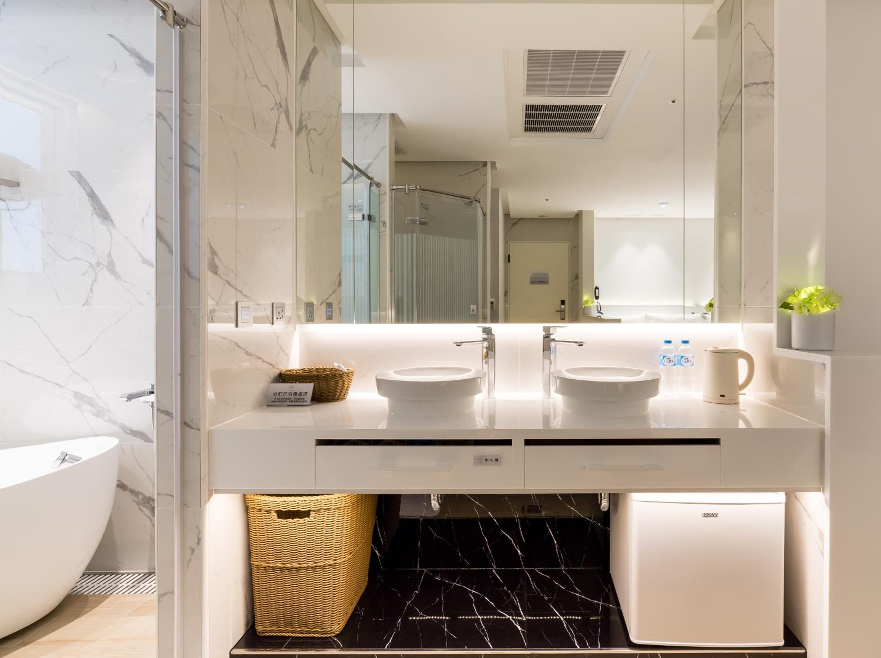 + Comfortable large spa and basin in room, somewhat separated toilet and shower area (by a door) and a nice steam sauna feature in the shower (so blissful)