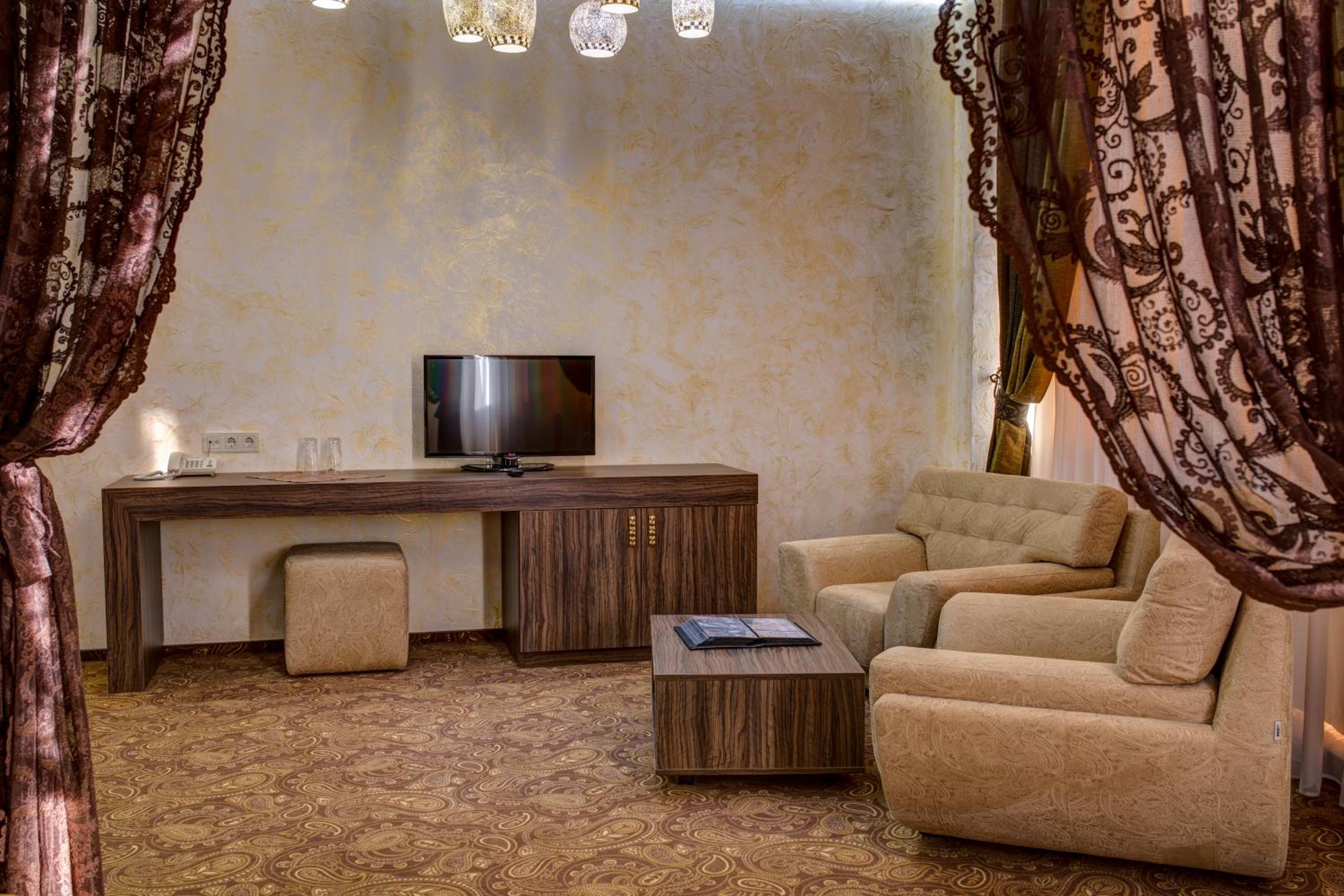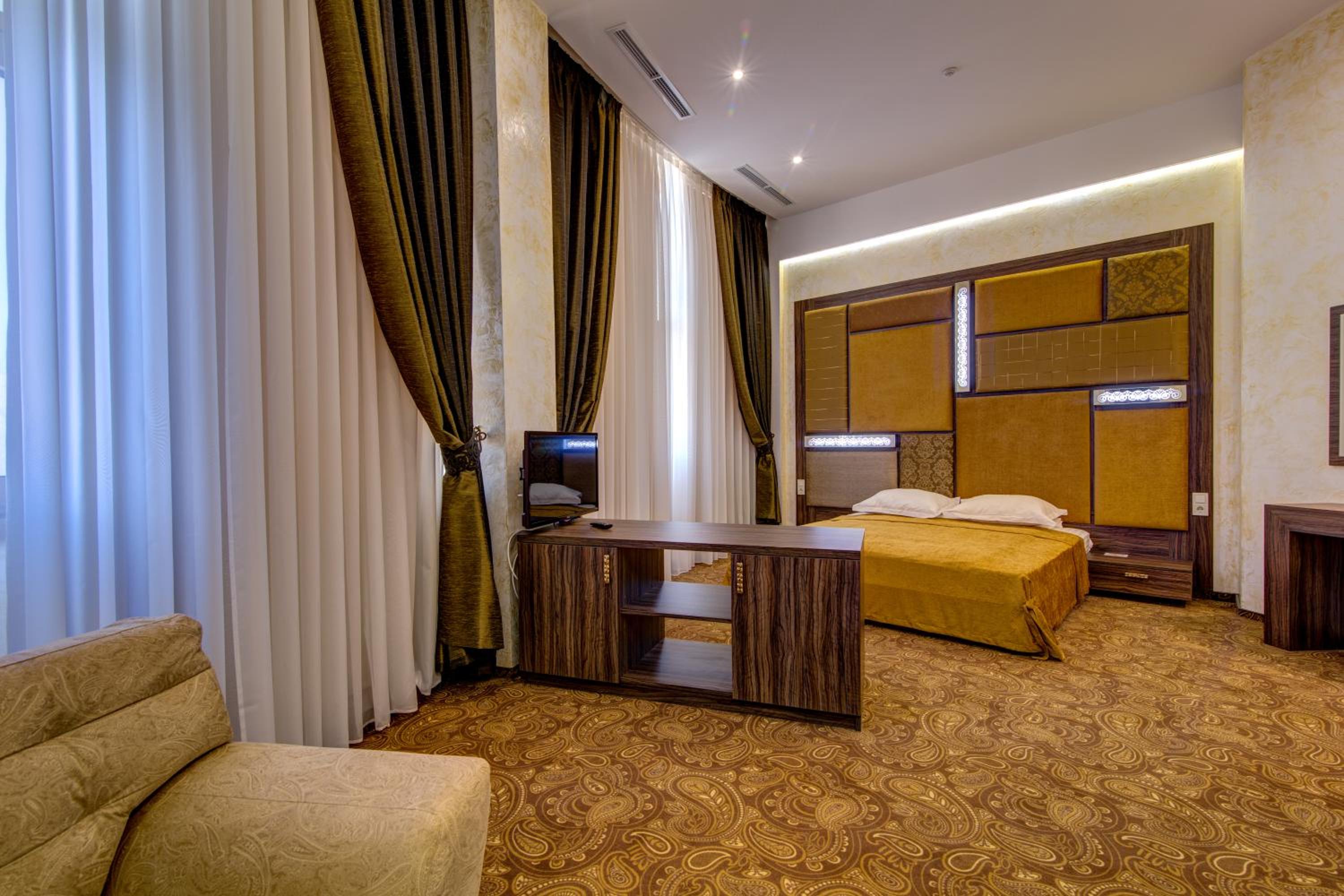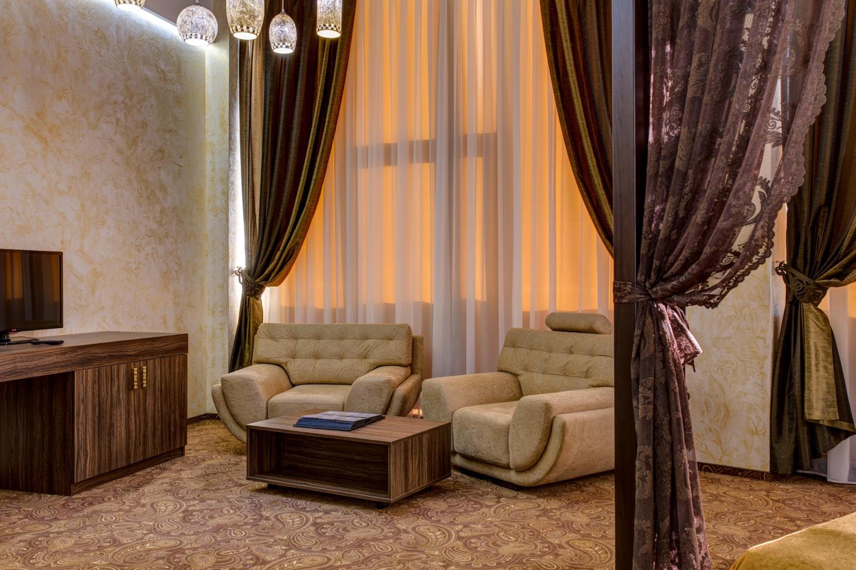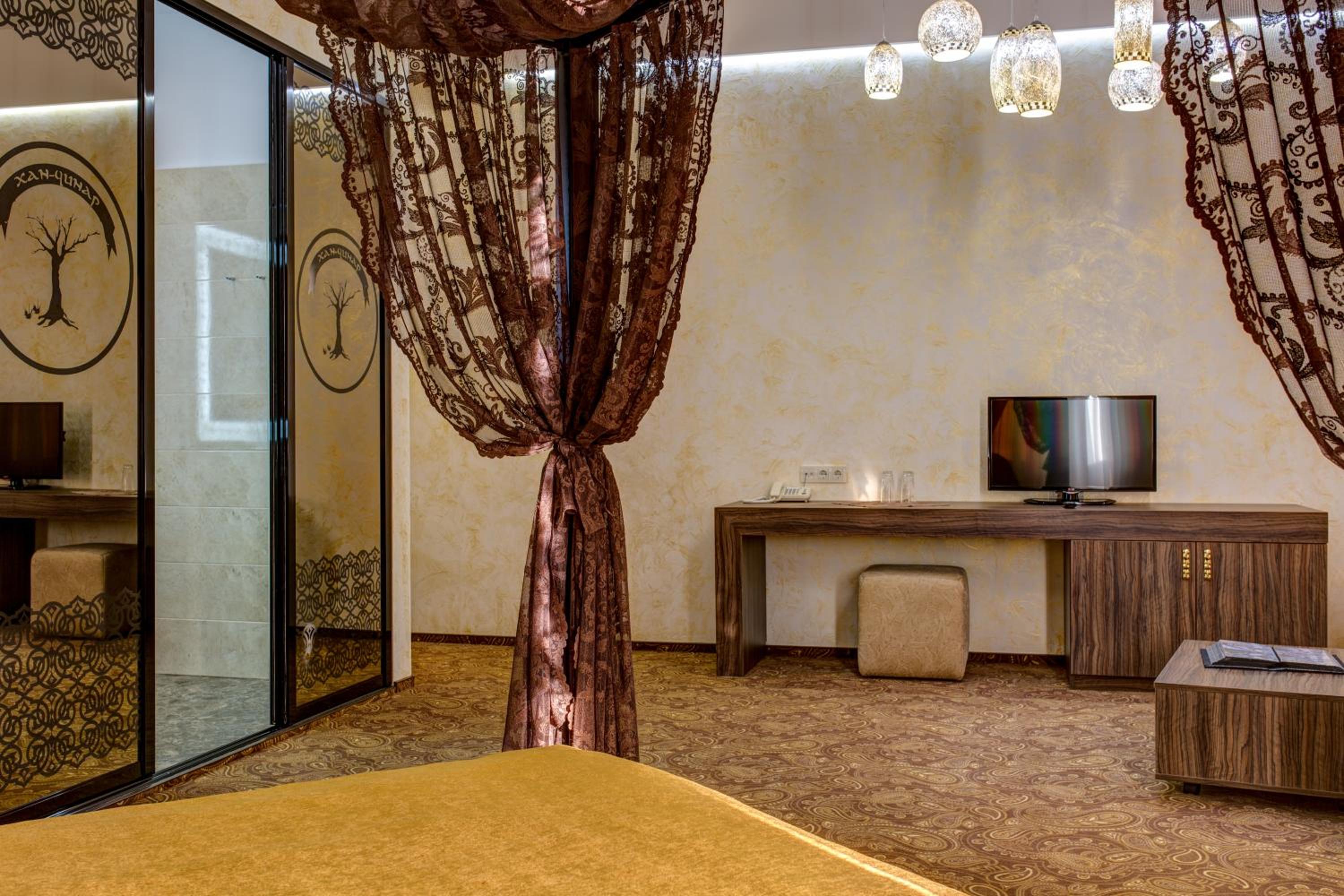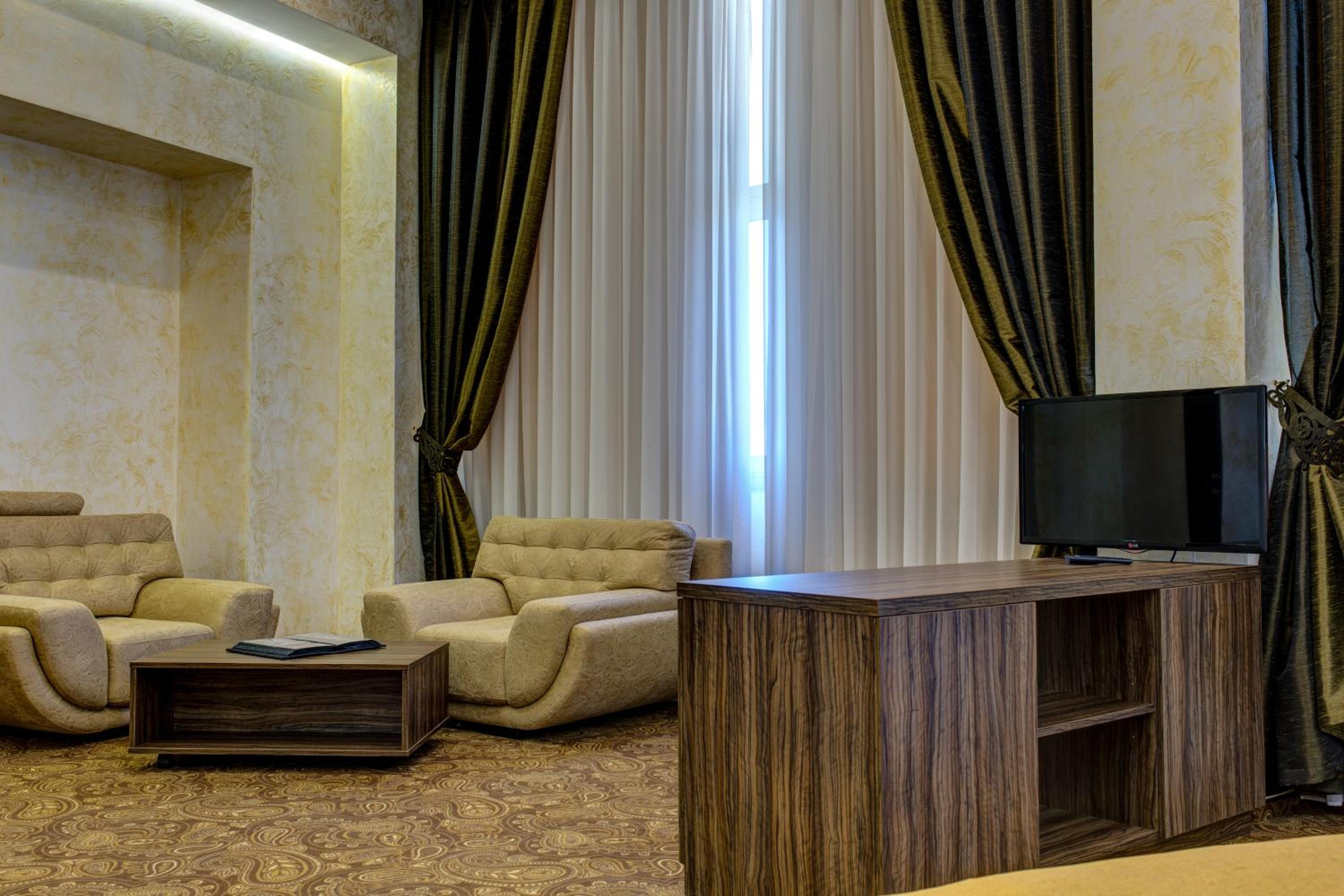 The spacious air-conditioned rooms at Khan-Chinar Hotel offer a comfortable retreat with a minibar, seating area, and flat-screen TV. The elegant design in warm colors creates a welcoming ambiance for guests to unwind.