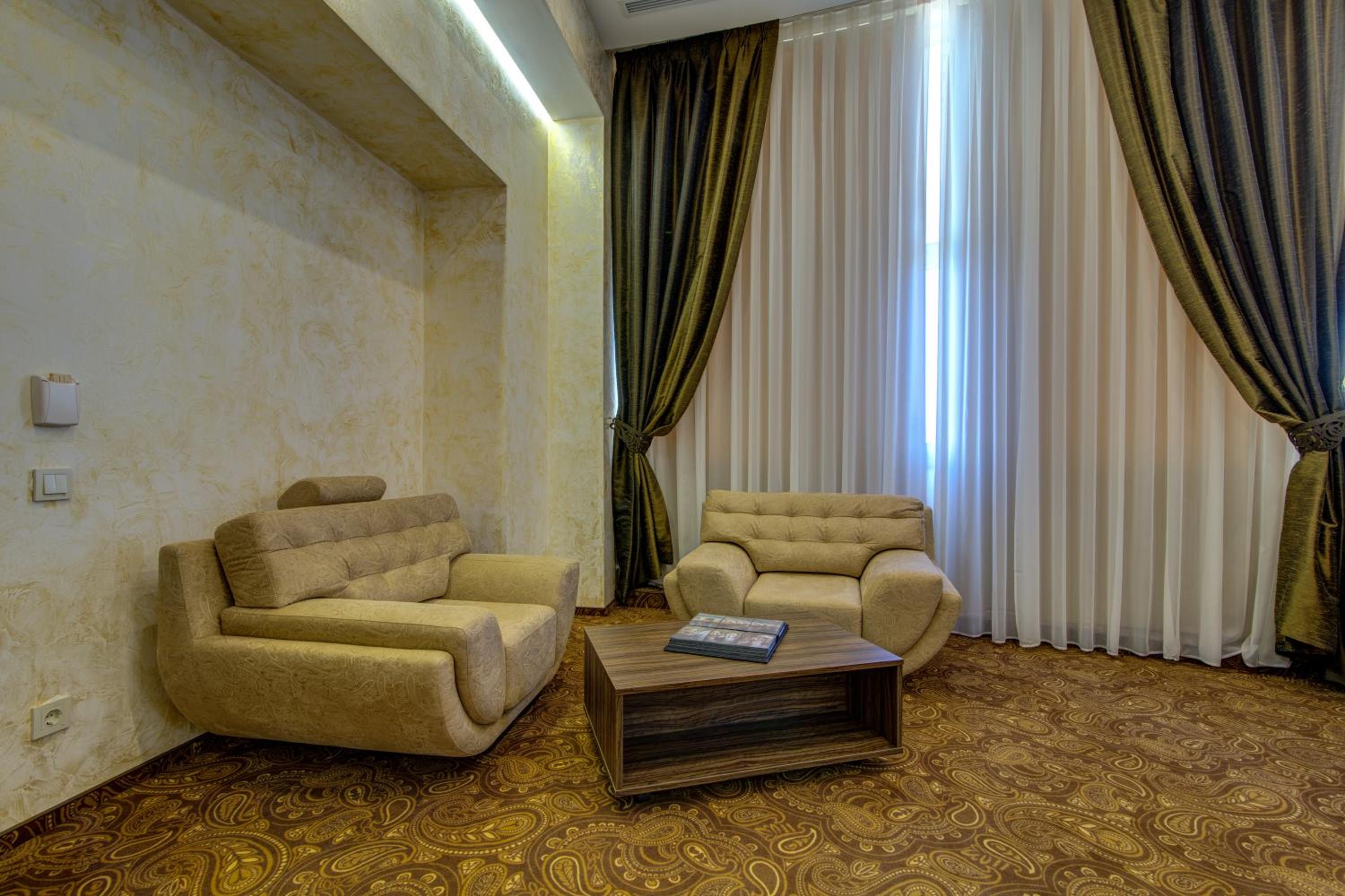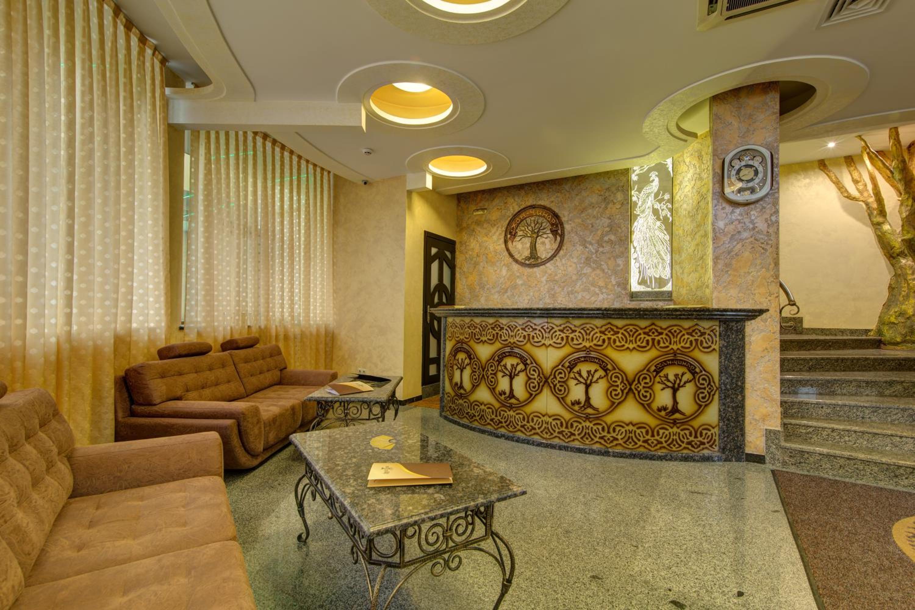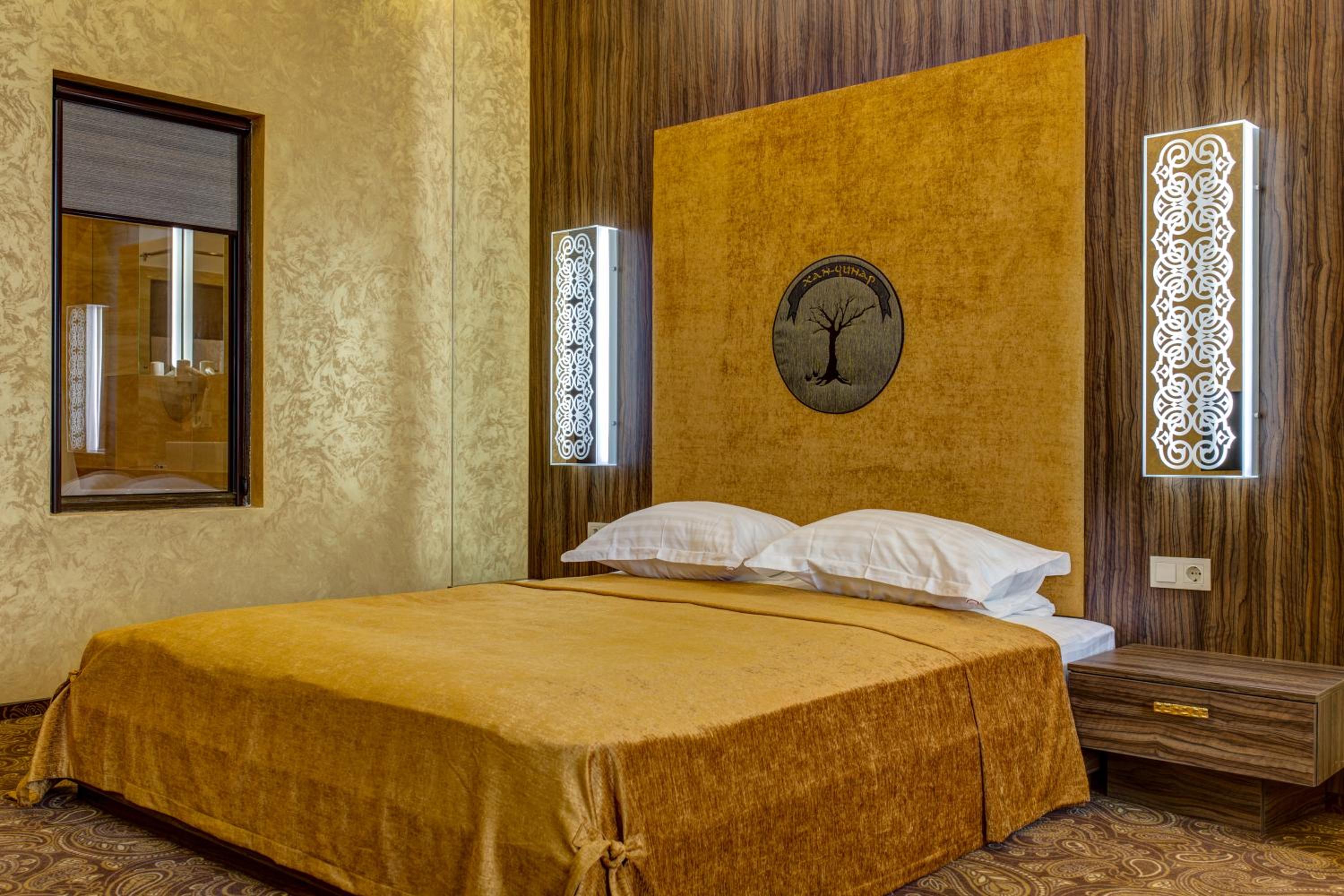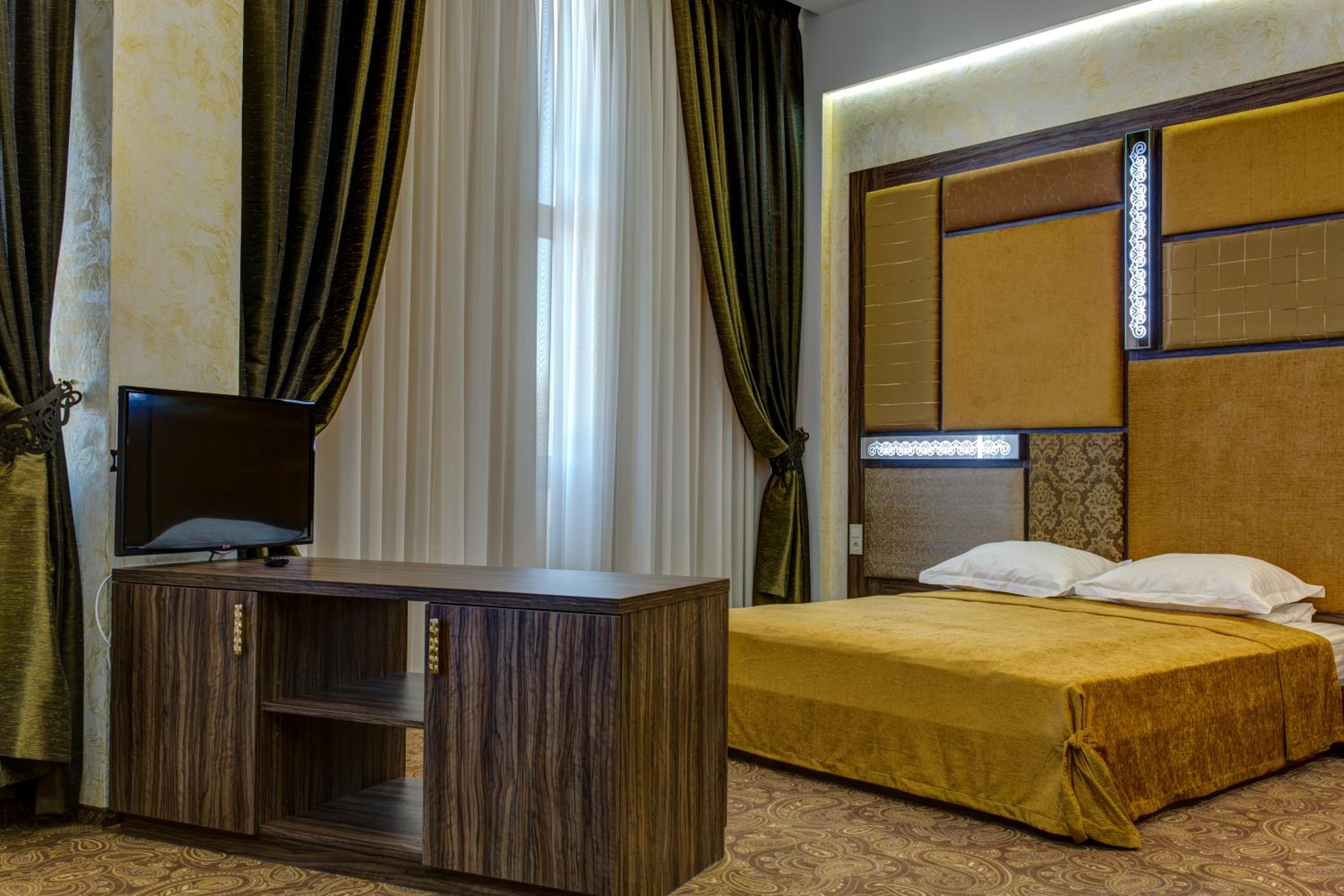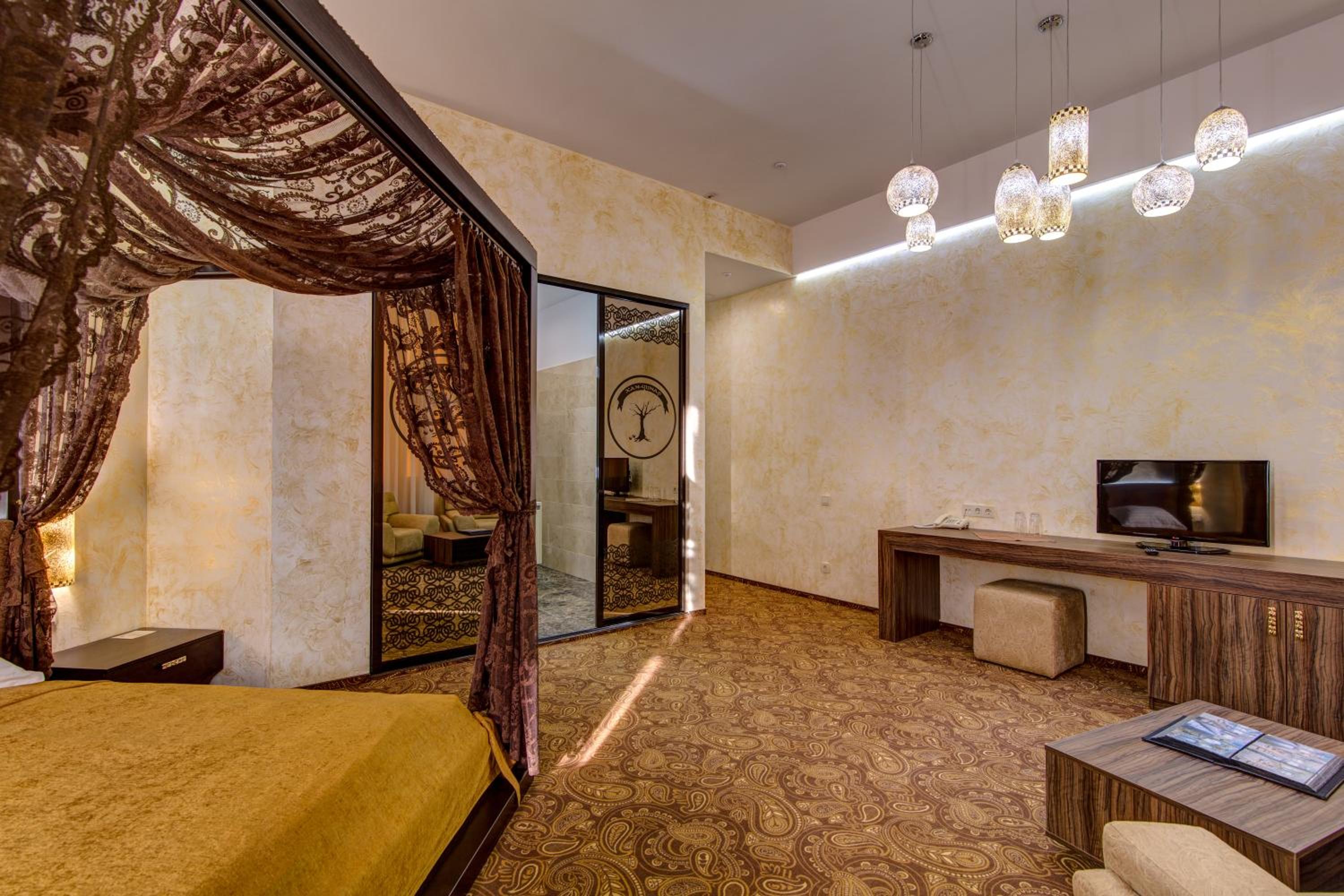 The spacious air-conditioned rooms at Khan-Chinar Hotel offer a comfortable retreat with a minibar, seating area, and flat-screen TV. The elegant design in warm colors creates a welcoming ambiance for guests to unwind.