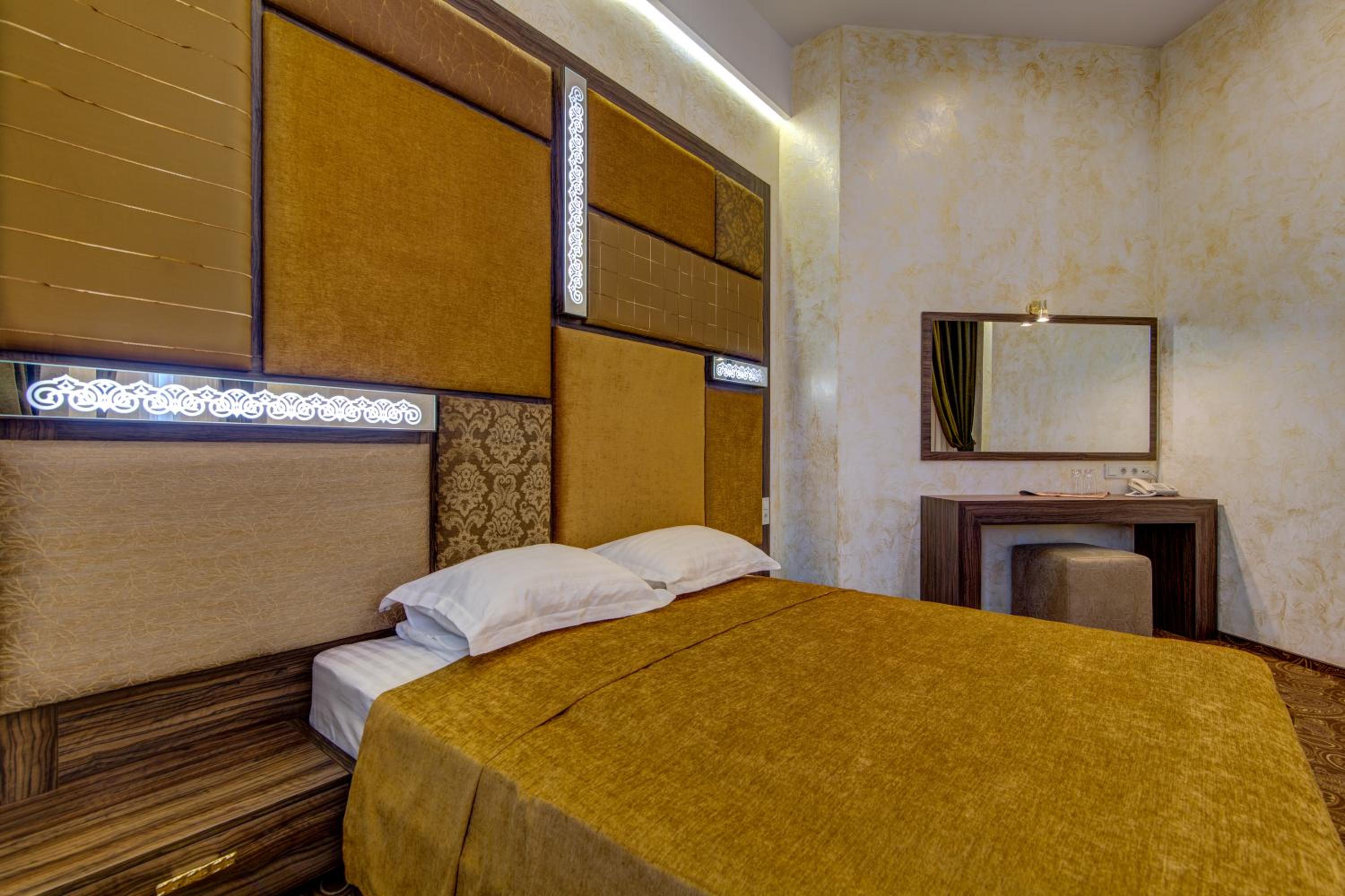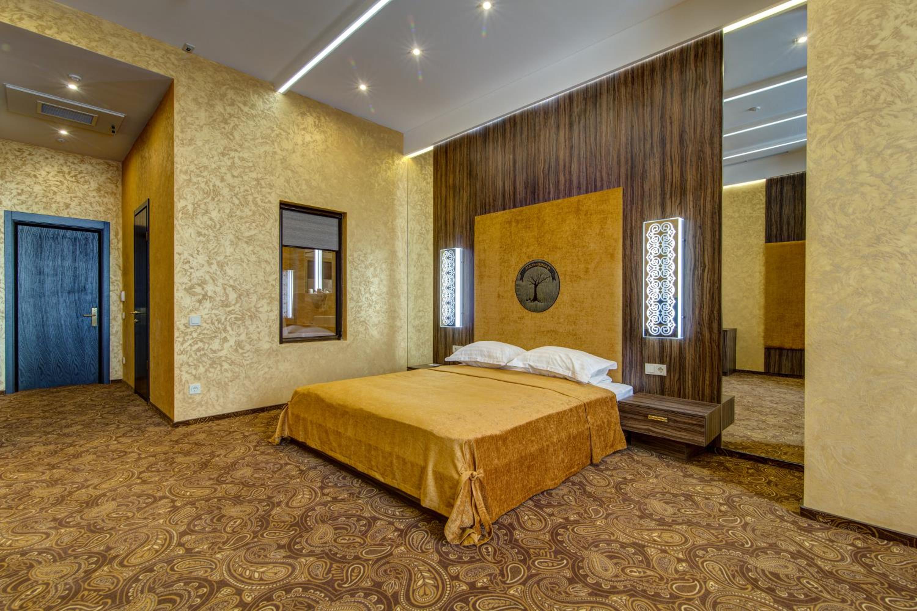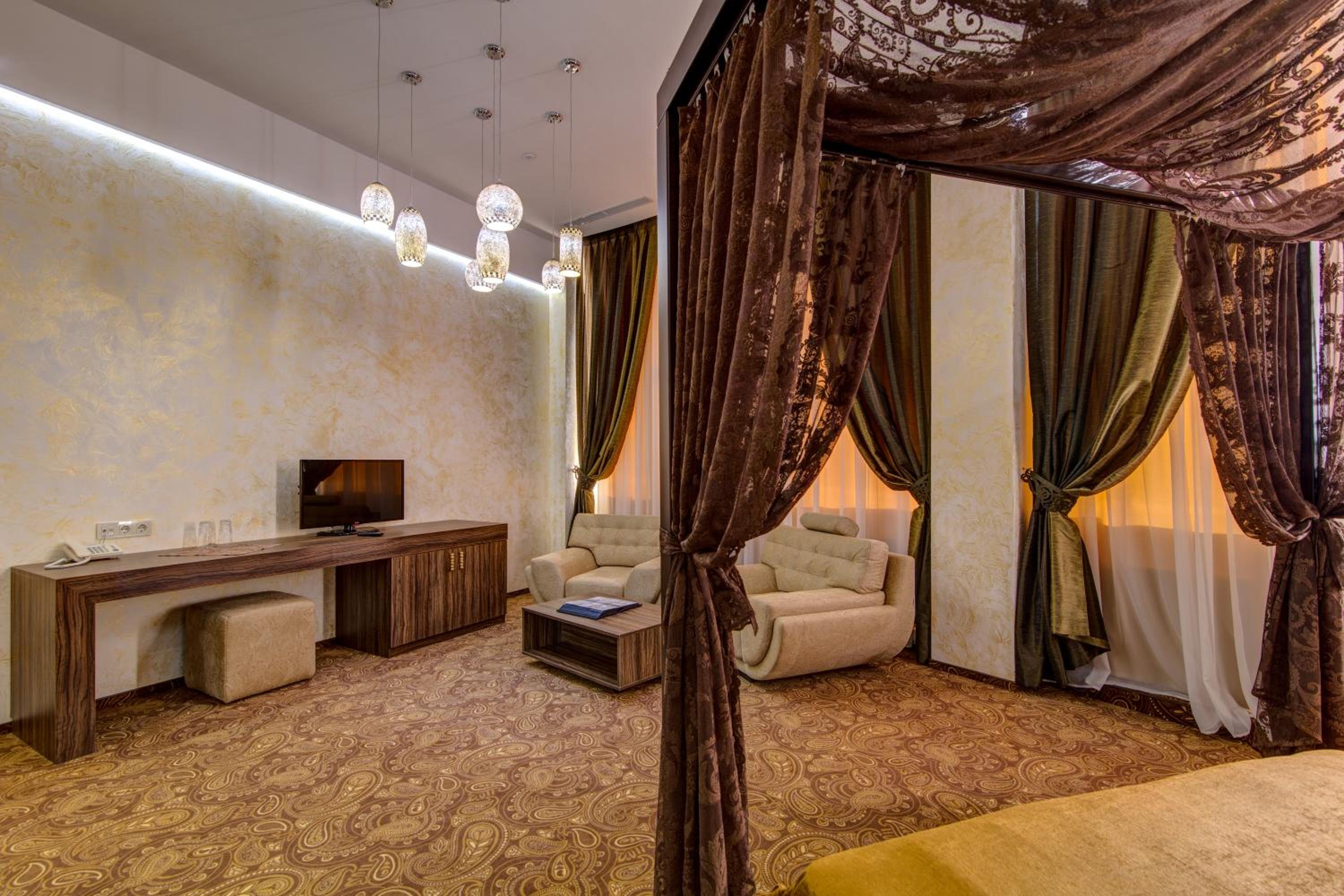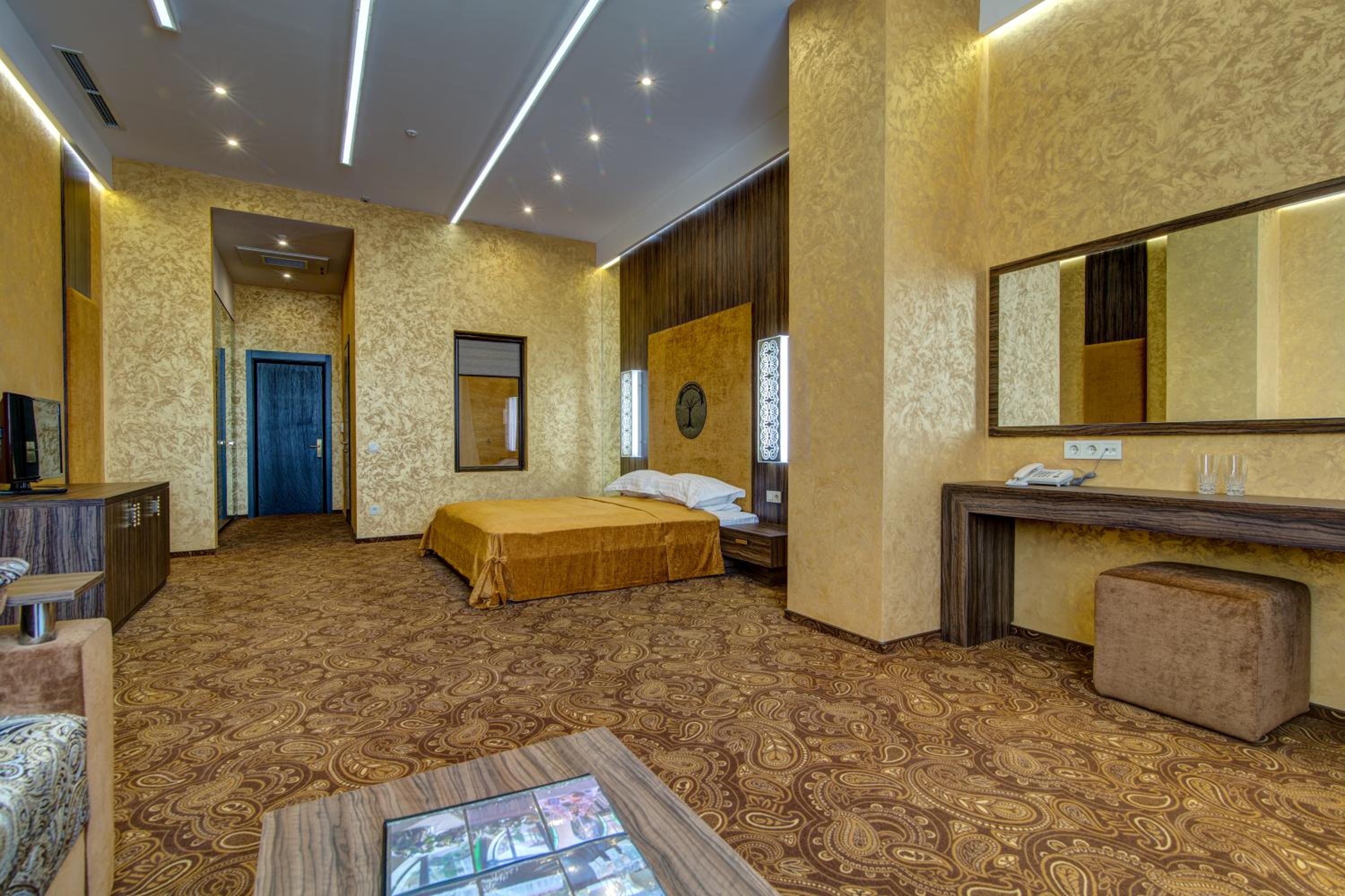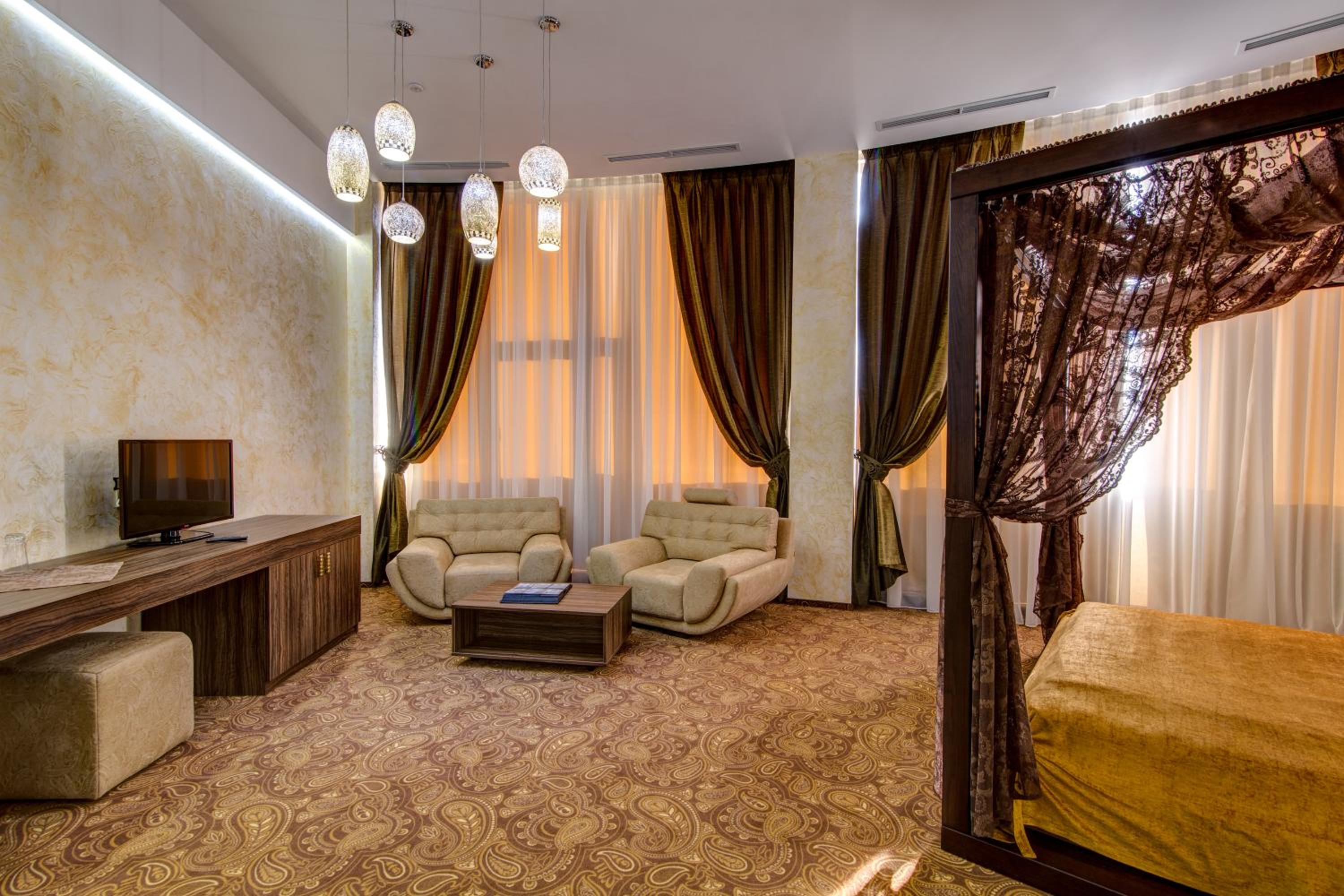 The spacious air-conditioned rooms at Khan-Chinar Hotel offer a comfortable retreat with a minibar, seating area, and flat-screen TV. The elegant design in warm colors creates a welcoming ambiance for guests to unwind.