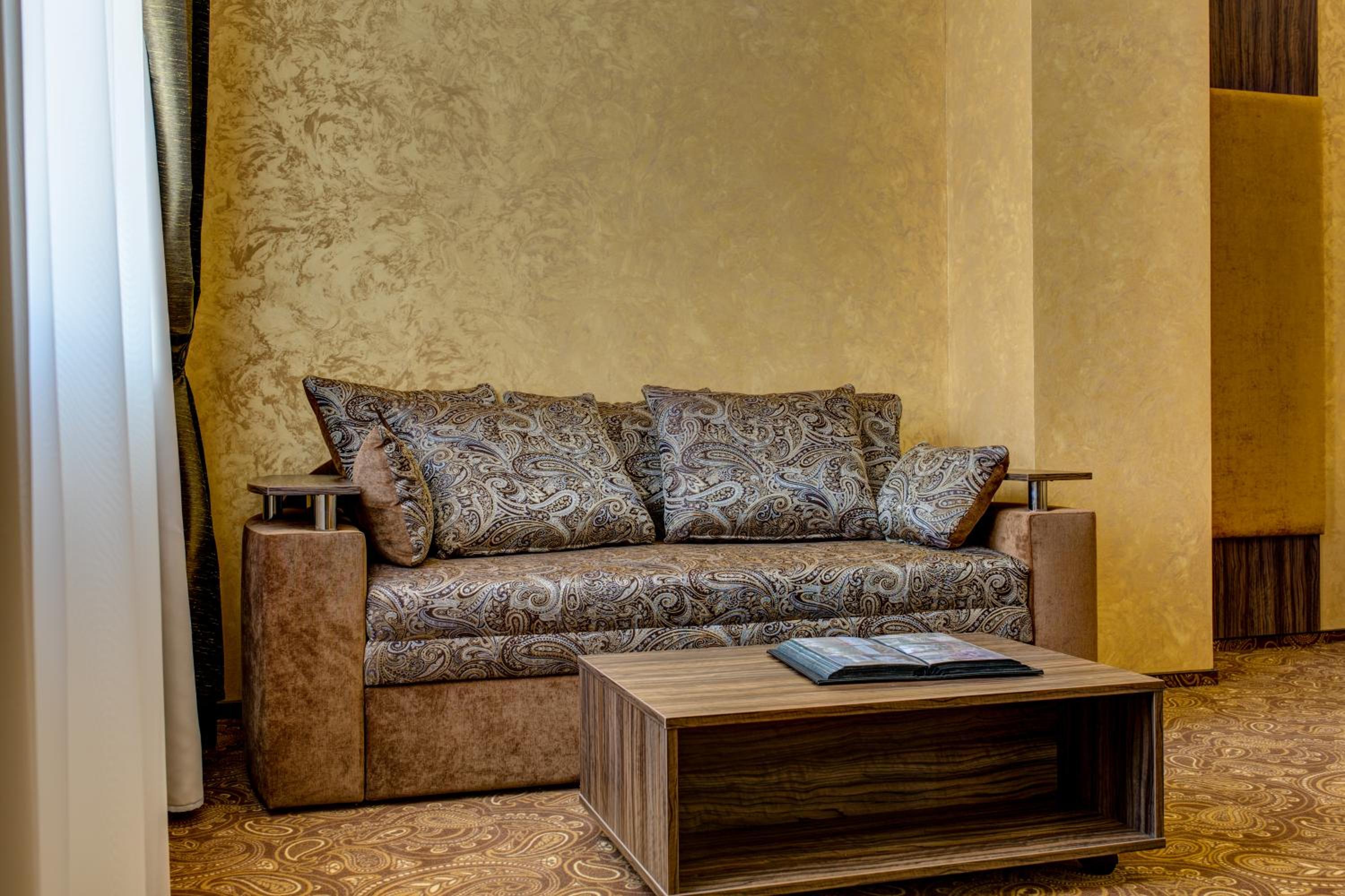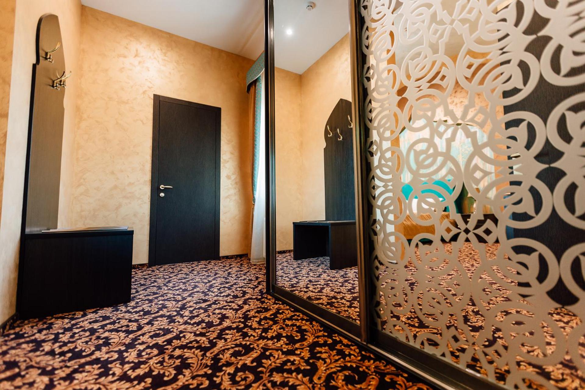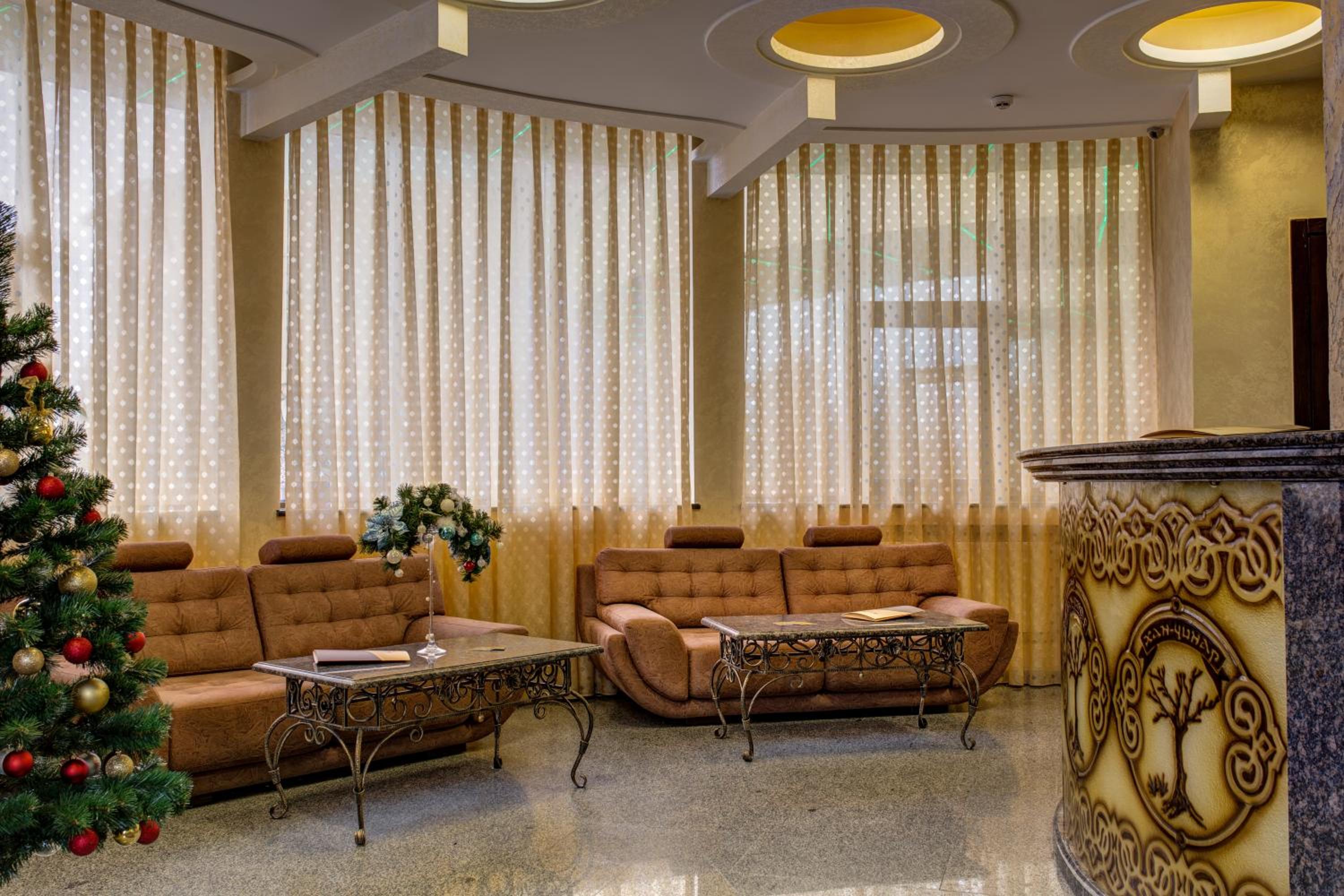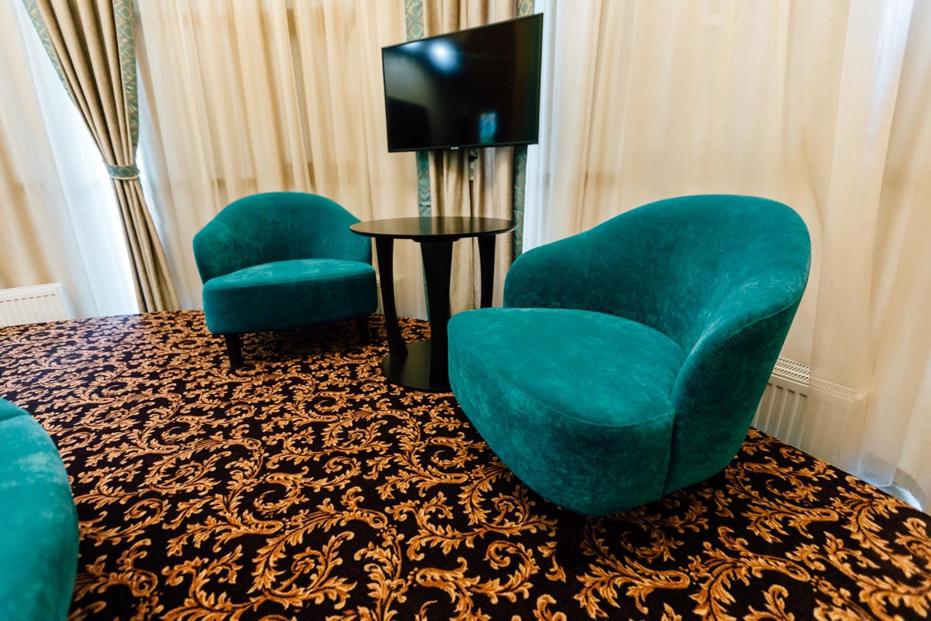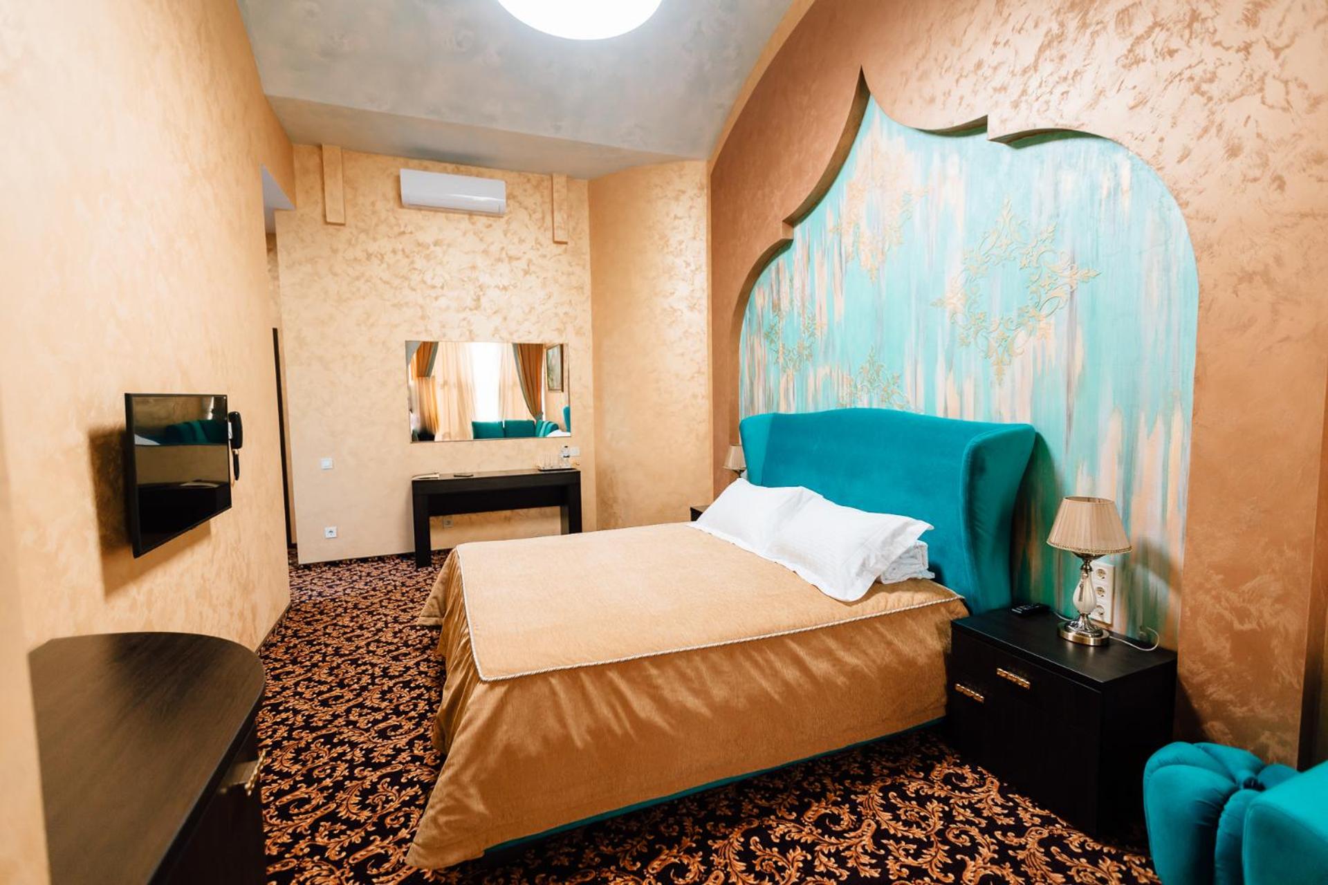 The spacious air-conditioned rooms at Khan-Chinar Hotel offer a comfortable retreat with a minibar, seating area, and flat-screen TV. The elegant design in warm colors creates a welcoming ambiance for guests to unwind.