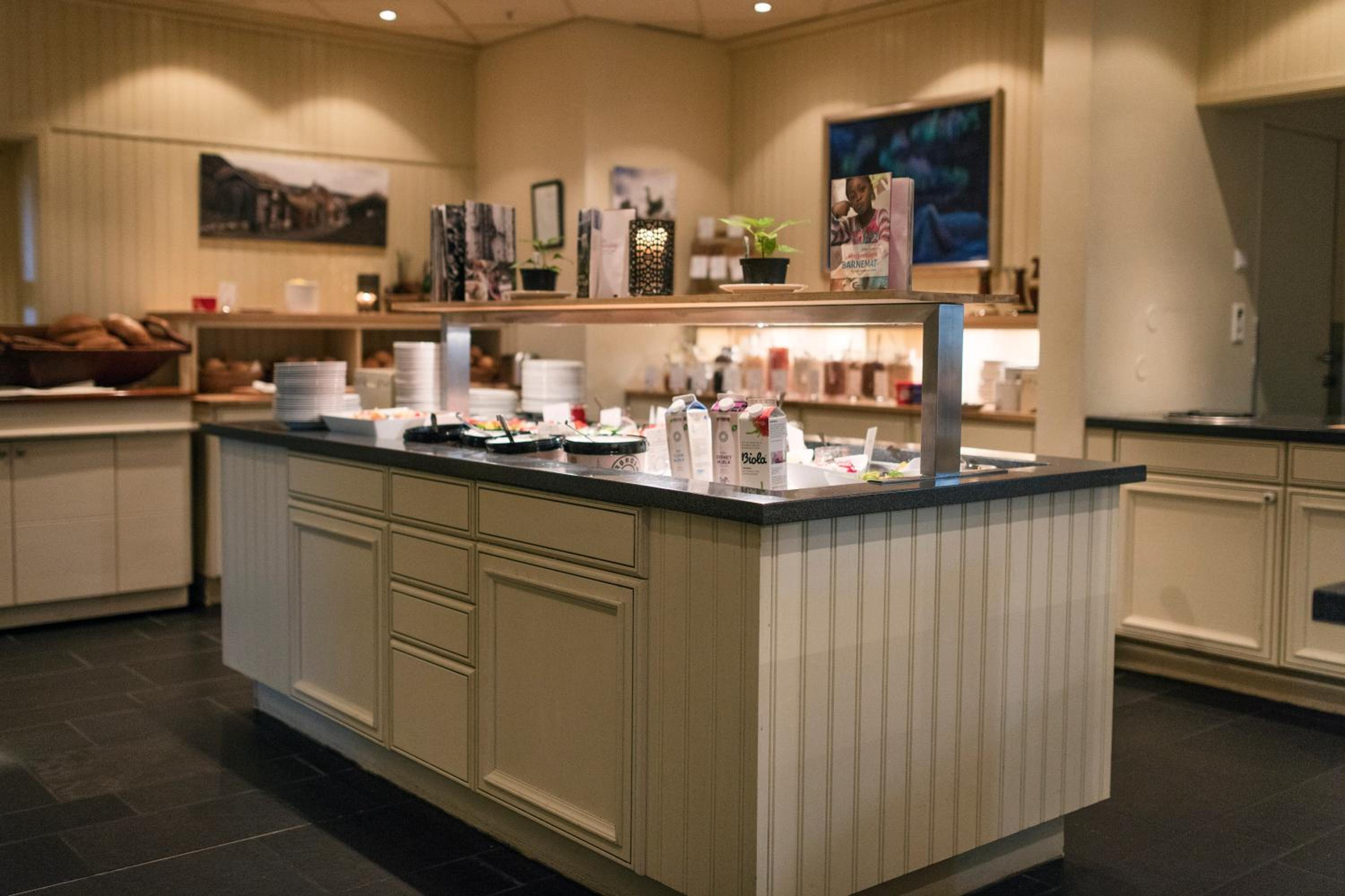 Det har kunnet vært noe satt fram i resepsjonen for i mellom måltidene, f.eks. vann, kaffe og evnt noe enkelt å bite i frukt, kjeks, lage seg en vaffel mm.