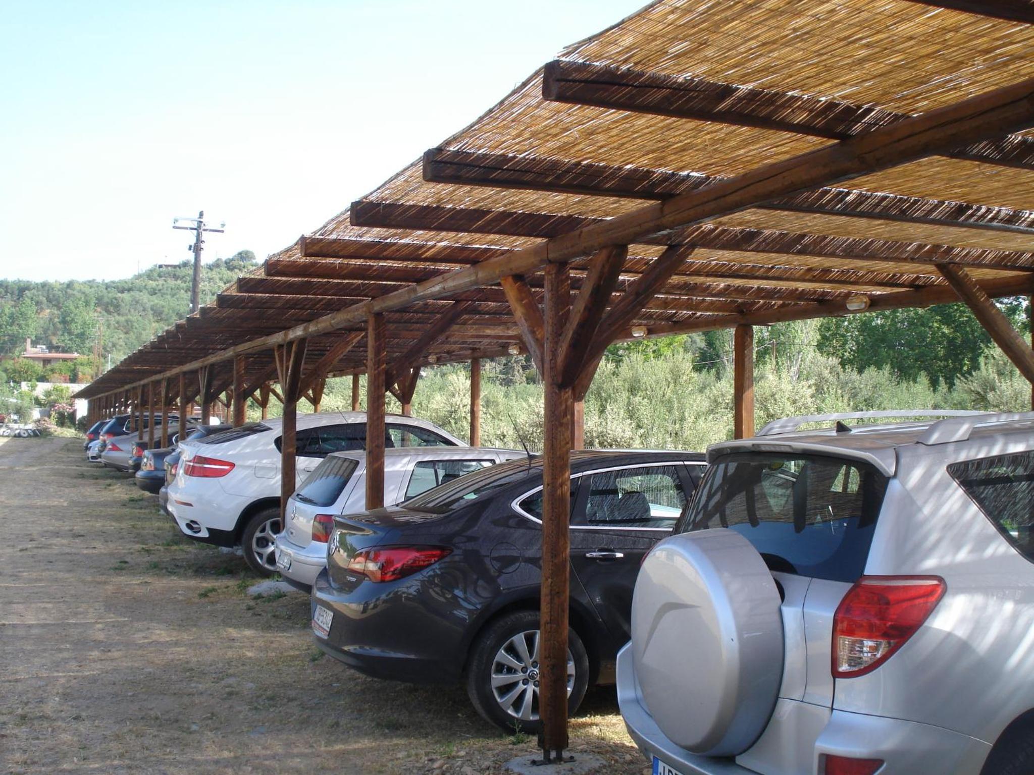The parking area is large enough and provides shade for the cars.