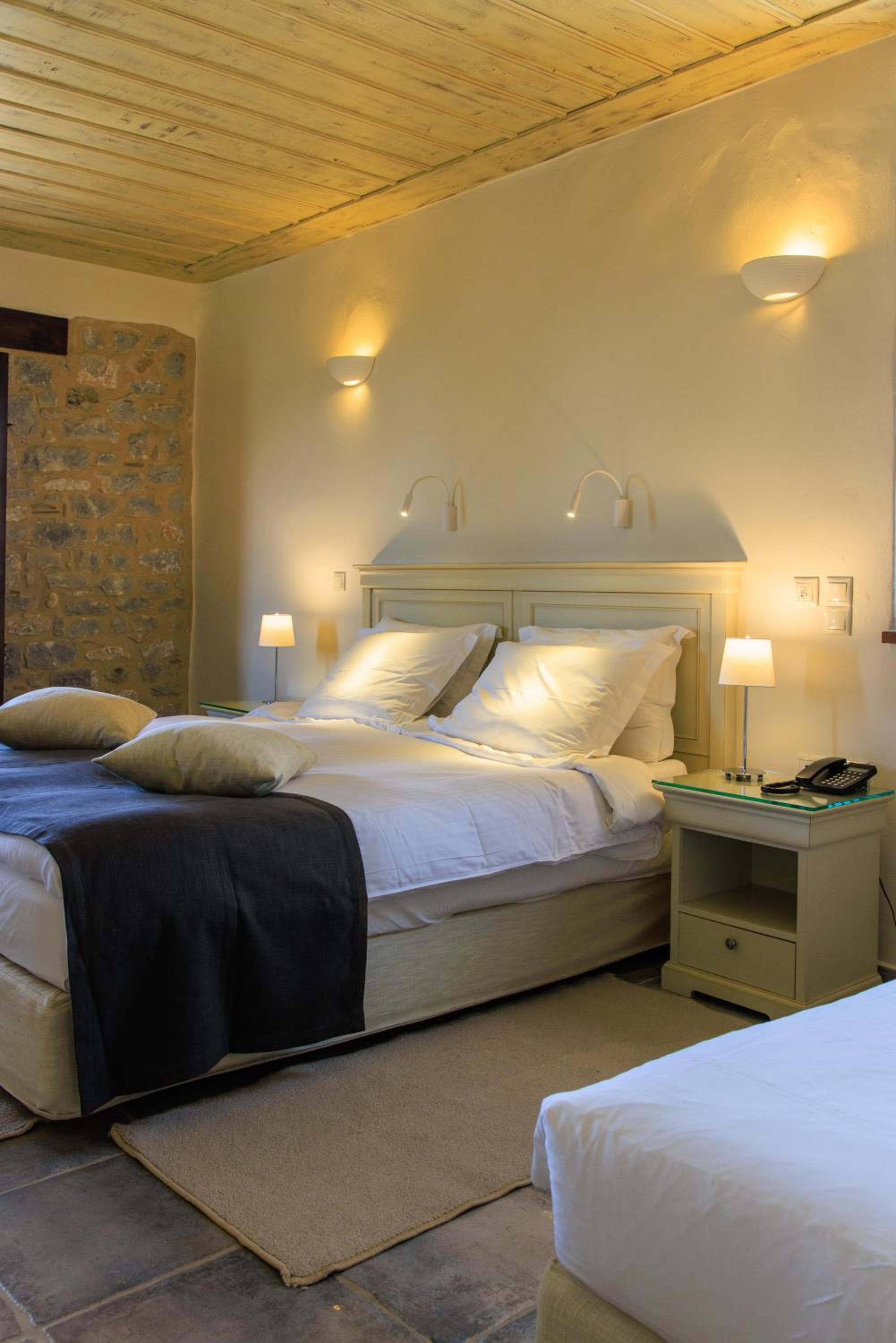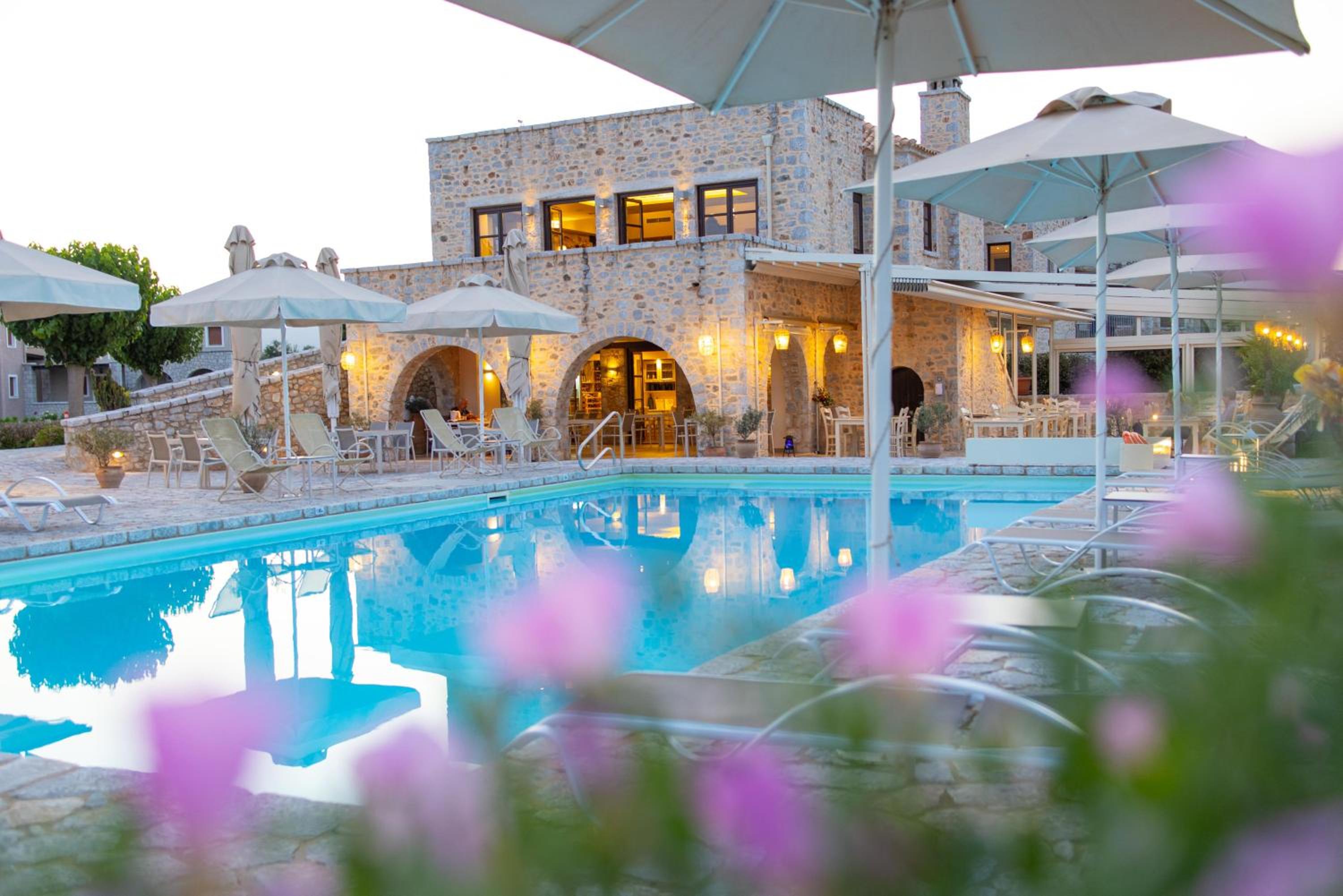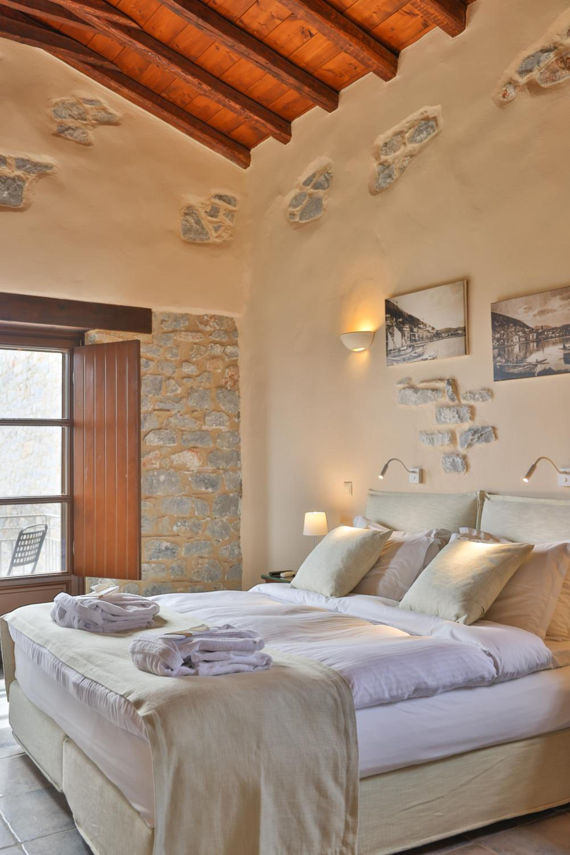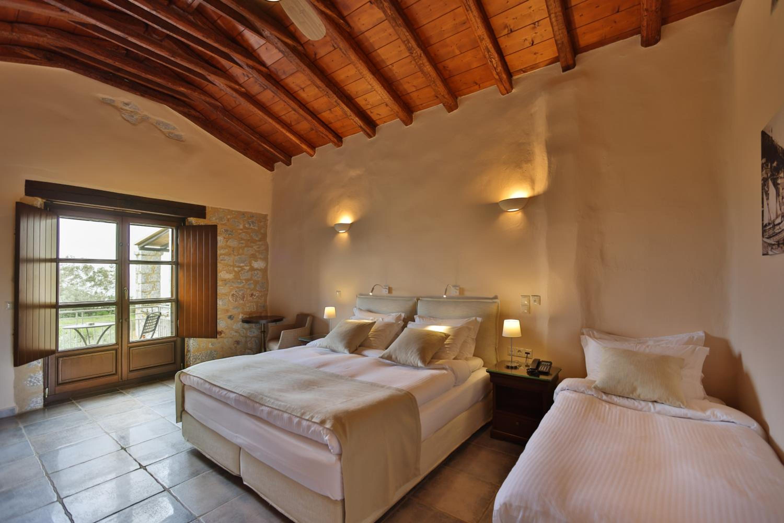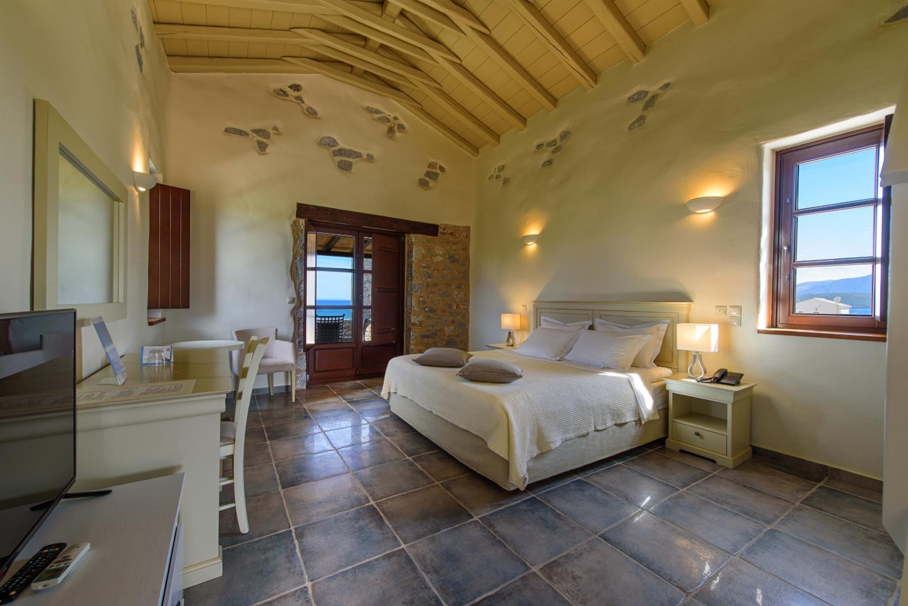 Experience the charm of Mani's architectural style in the traditionally decorated rooms featuring wood and stone elements. Enjoy sunset views across the Laconian Gulf from your furnished balcony.