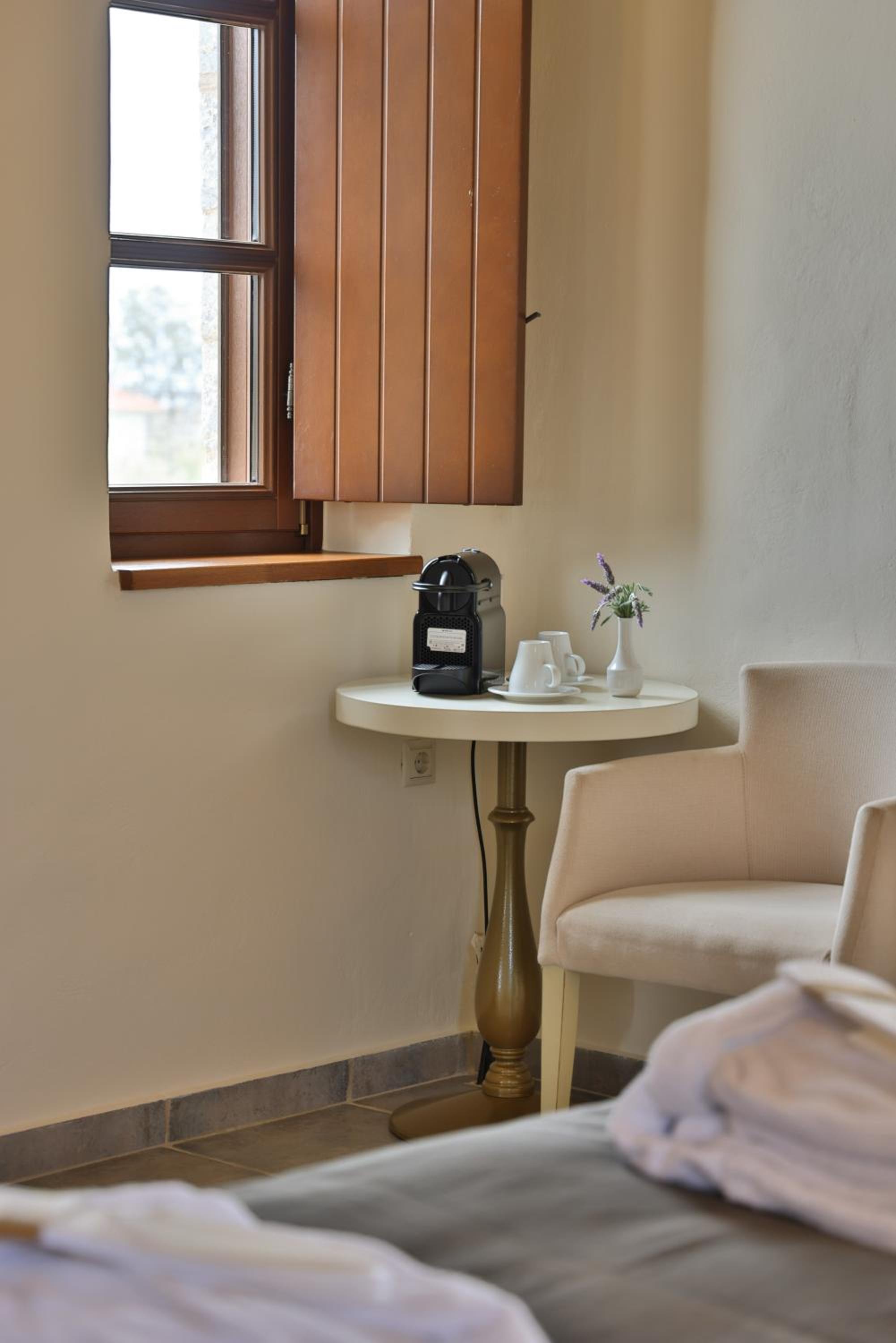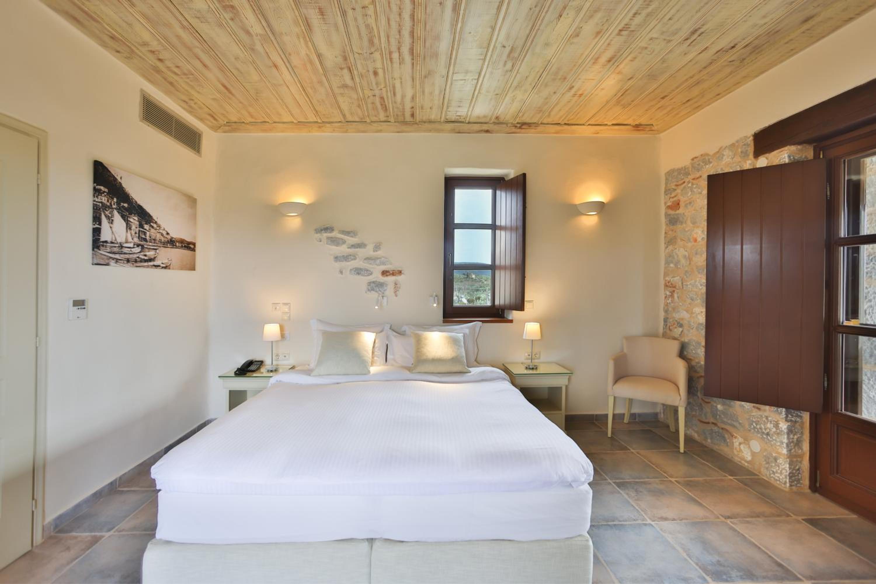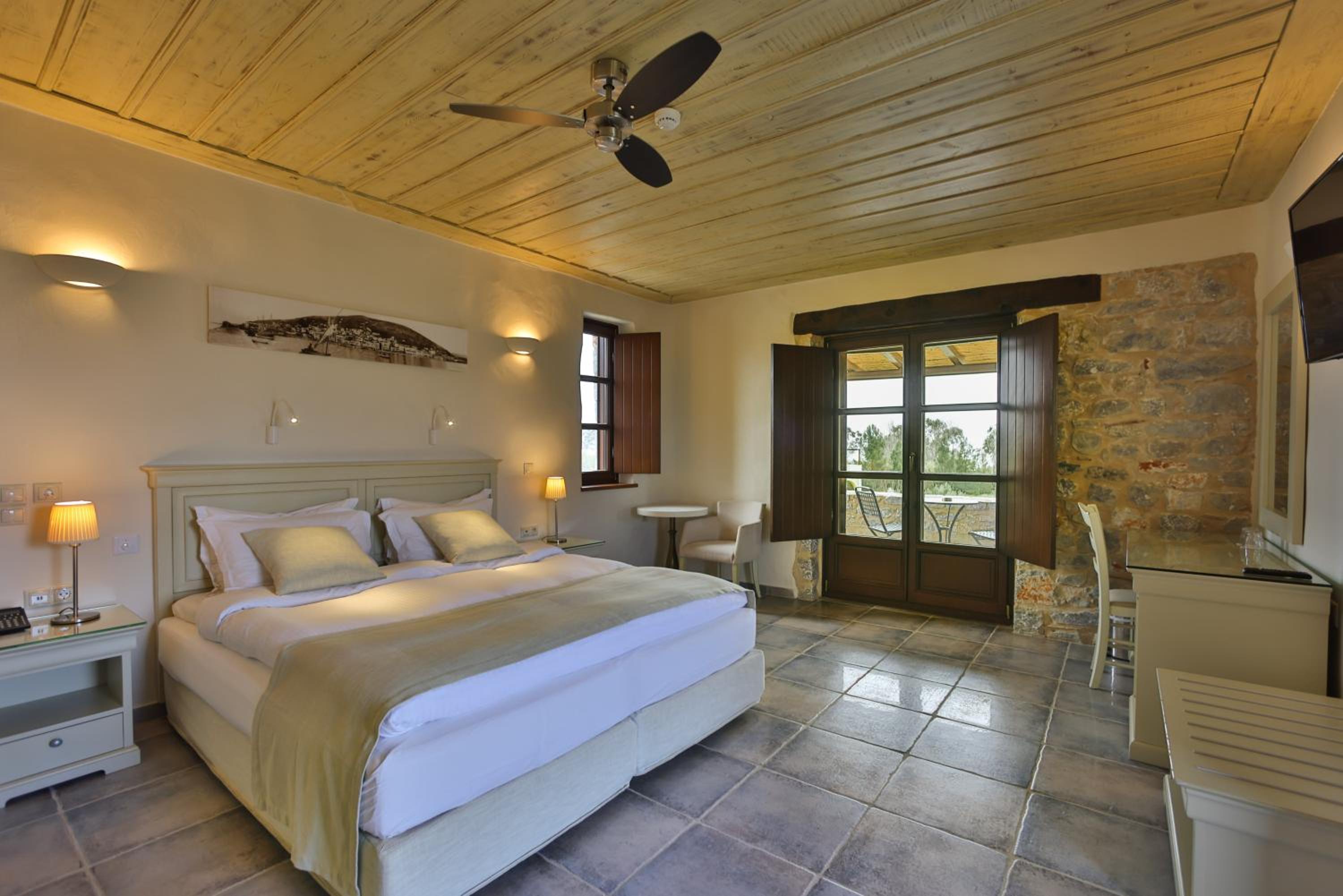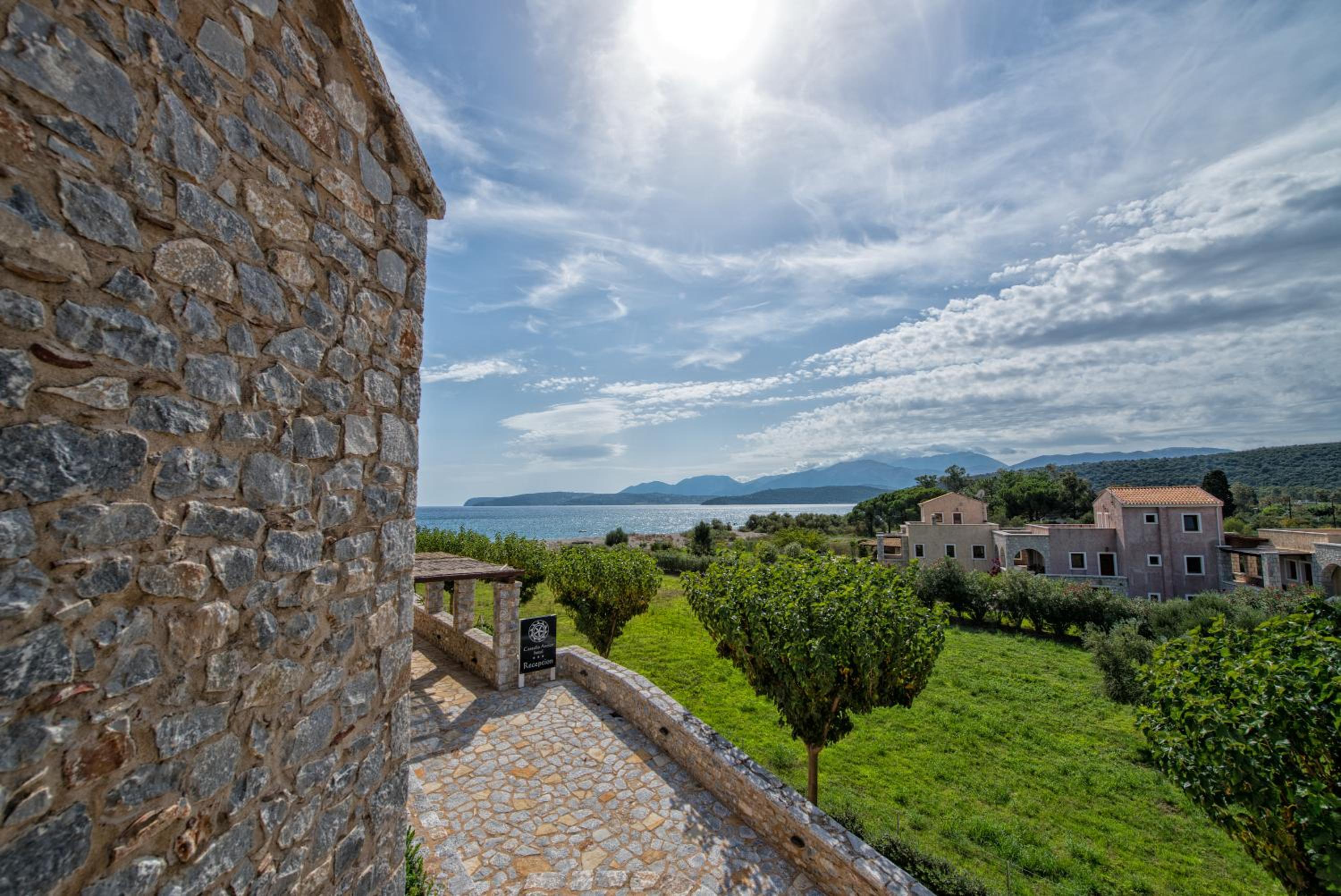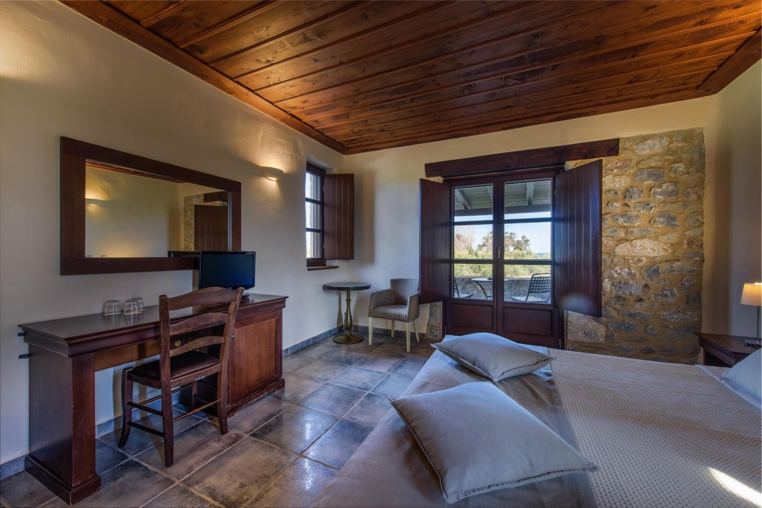 Experience the charm of Mani's architectural style in the traditionally decorated rooms featuring wood and stone elements. Enjoy sunset views across the Laconian Gulf from your furnished balcony.