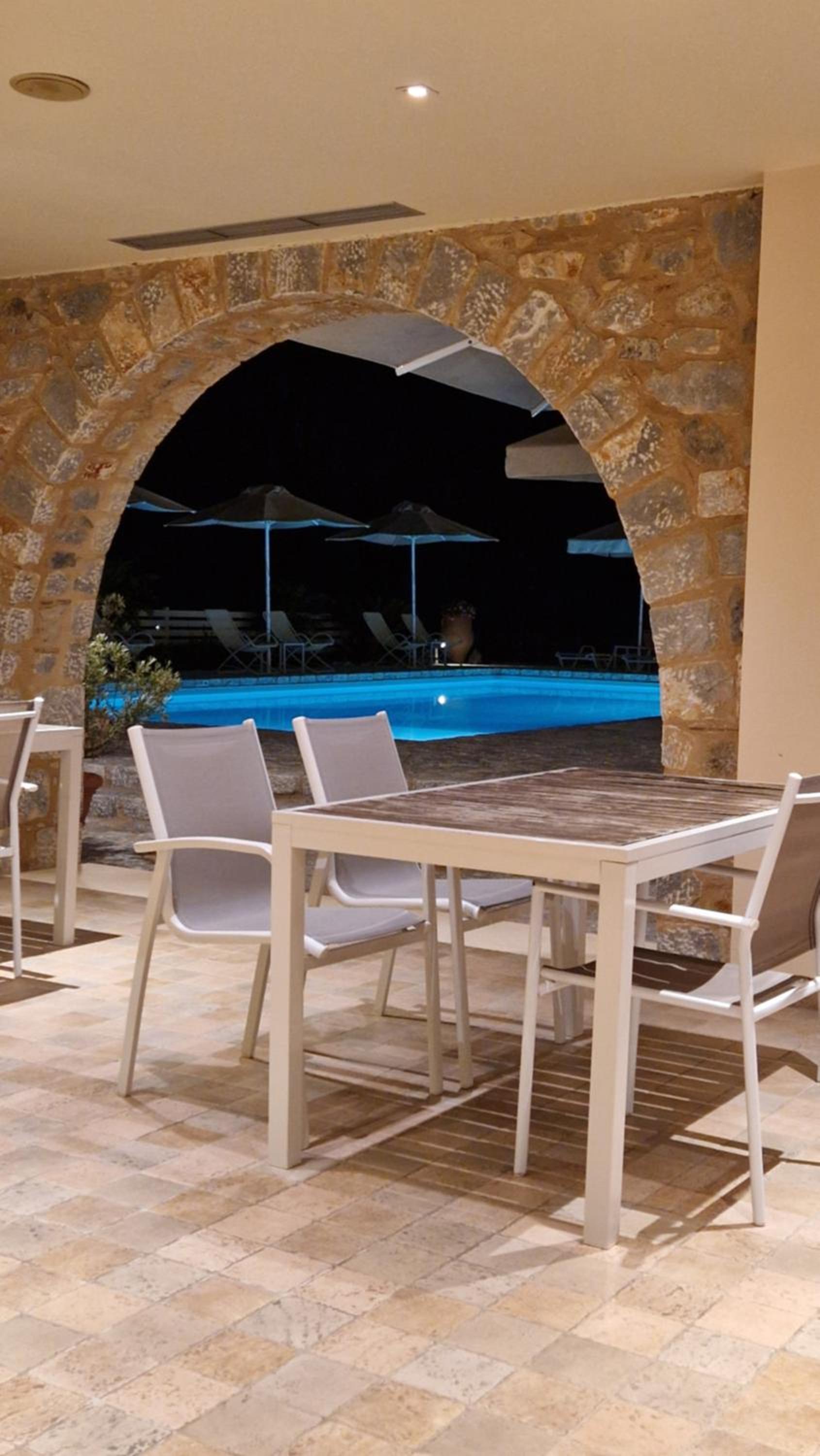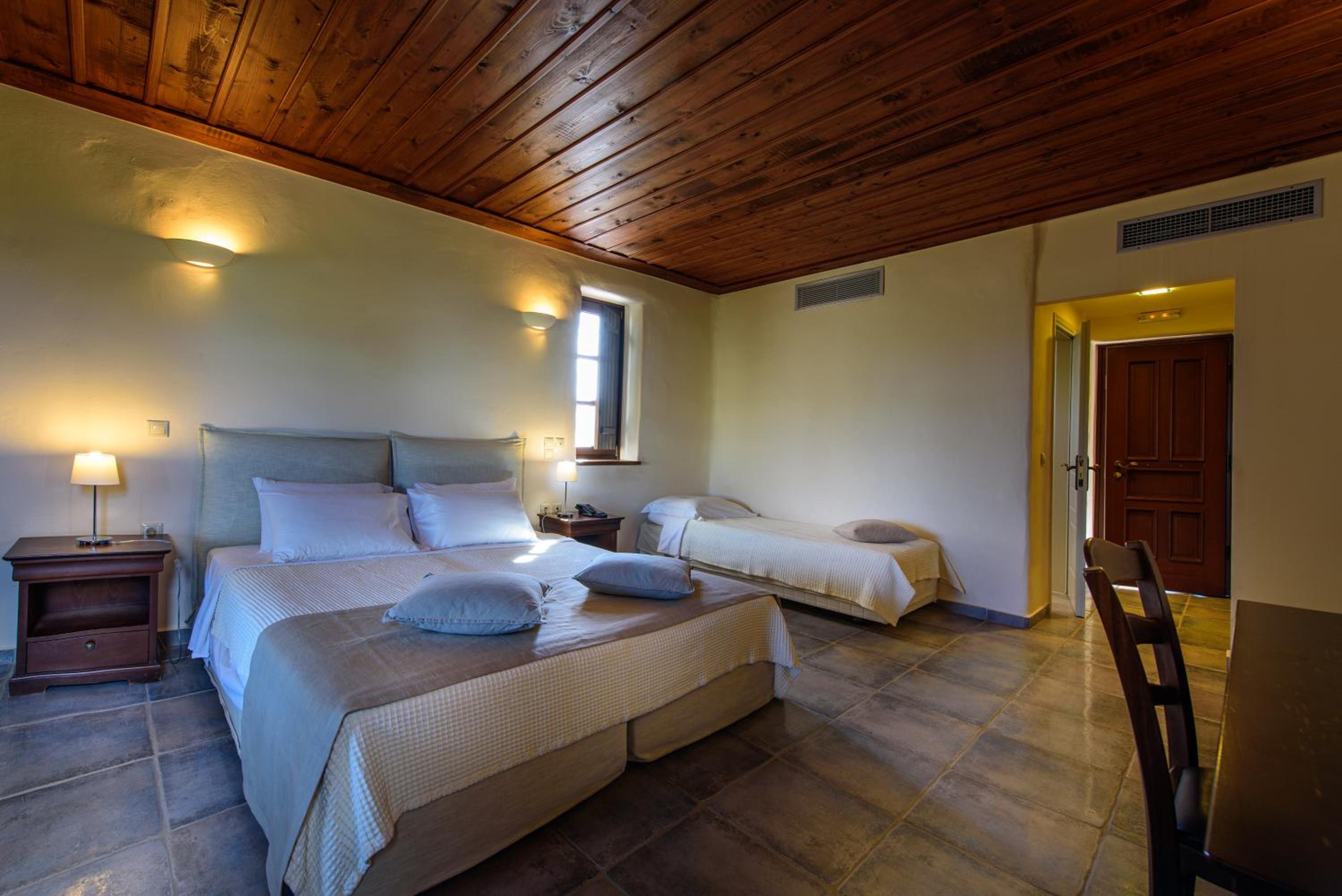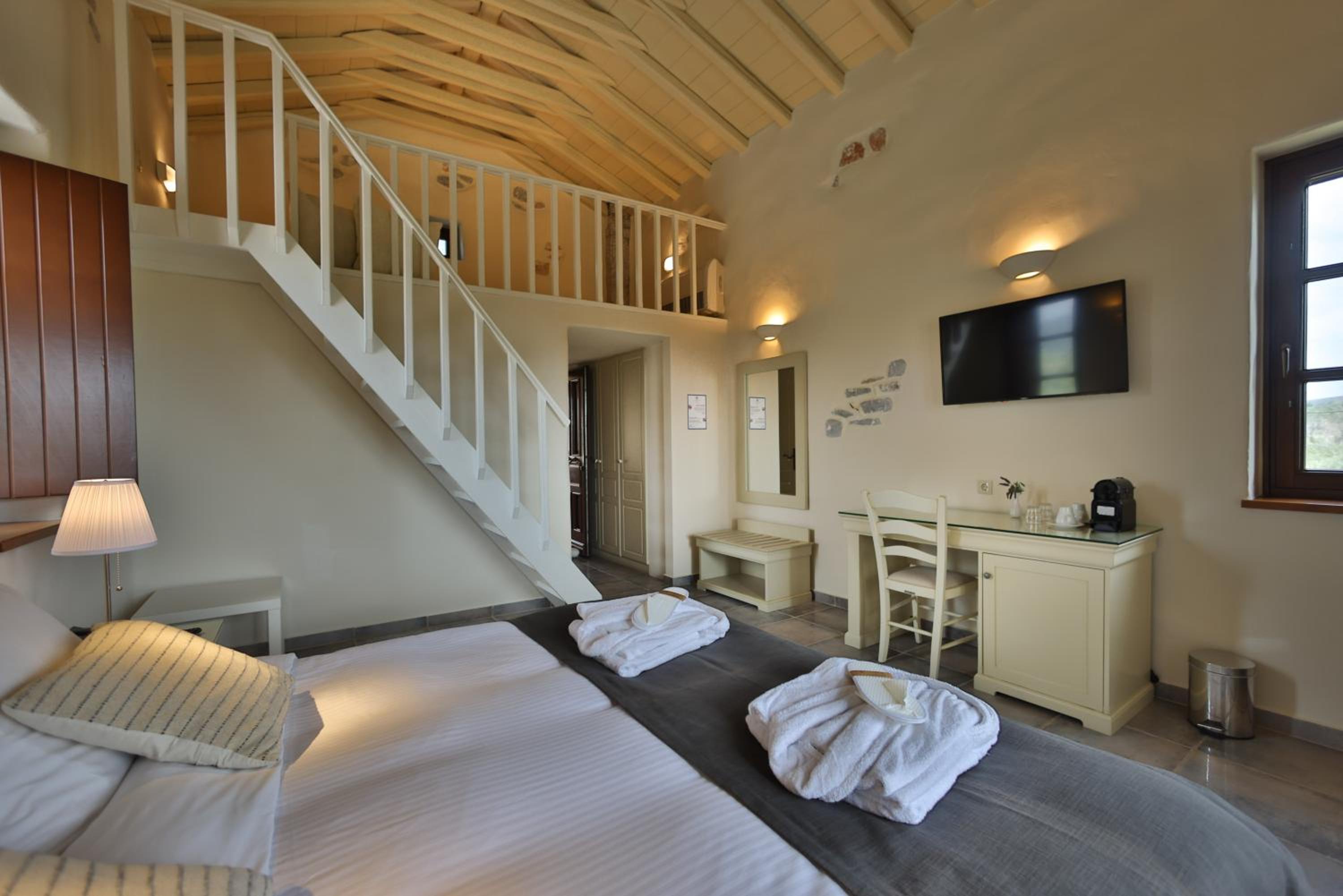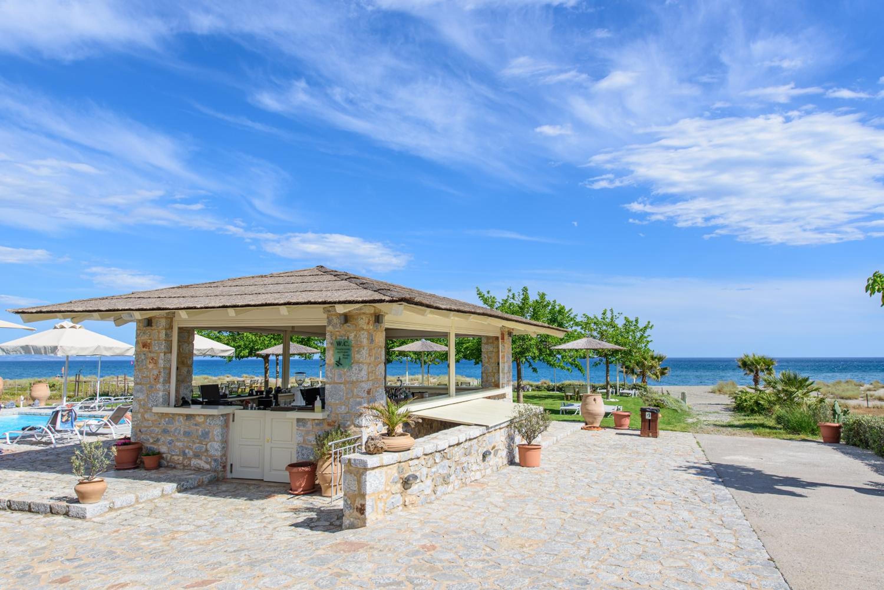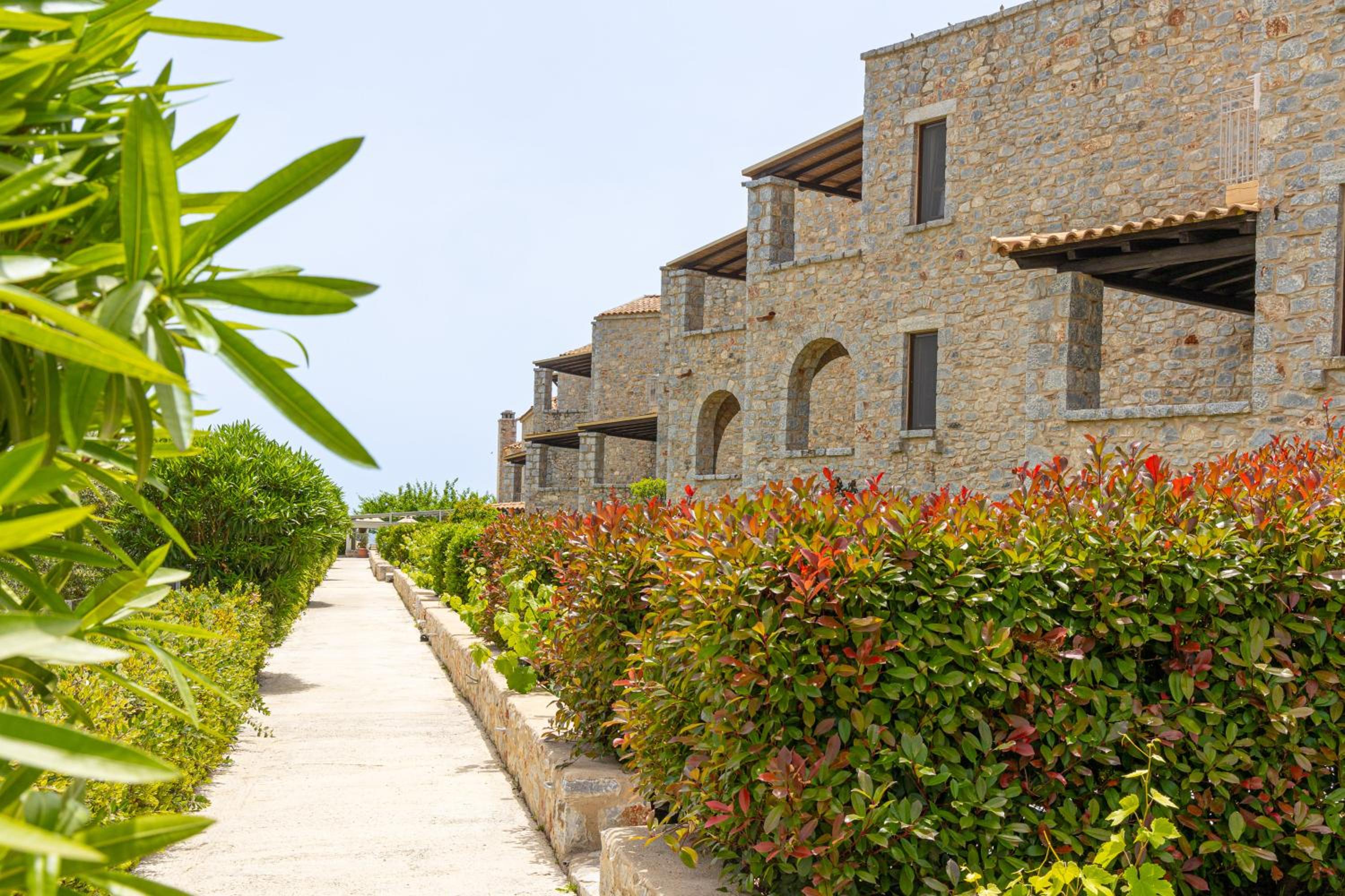 Experience the charm of Mani's architectural style in the traditionally decorated rooms featuring wood and stone elements. Enjoy sunset views across the Laconian Gulf from your furnished balcony.