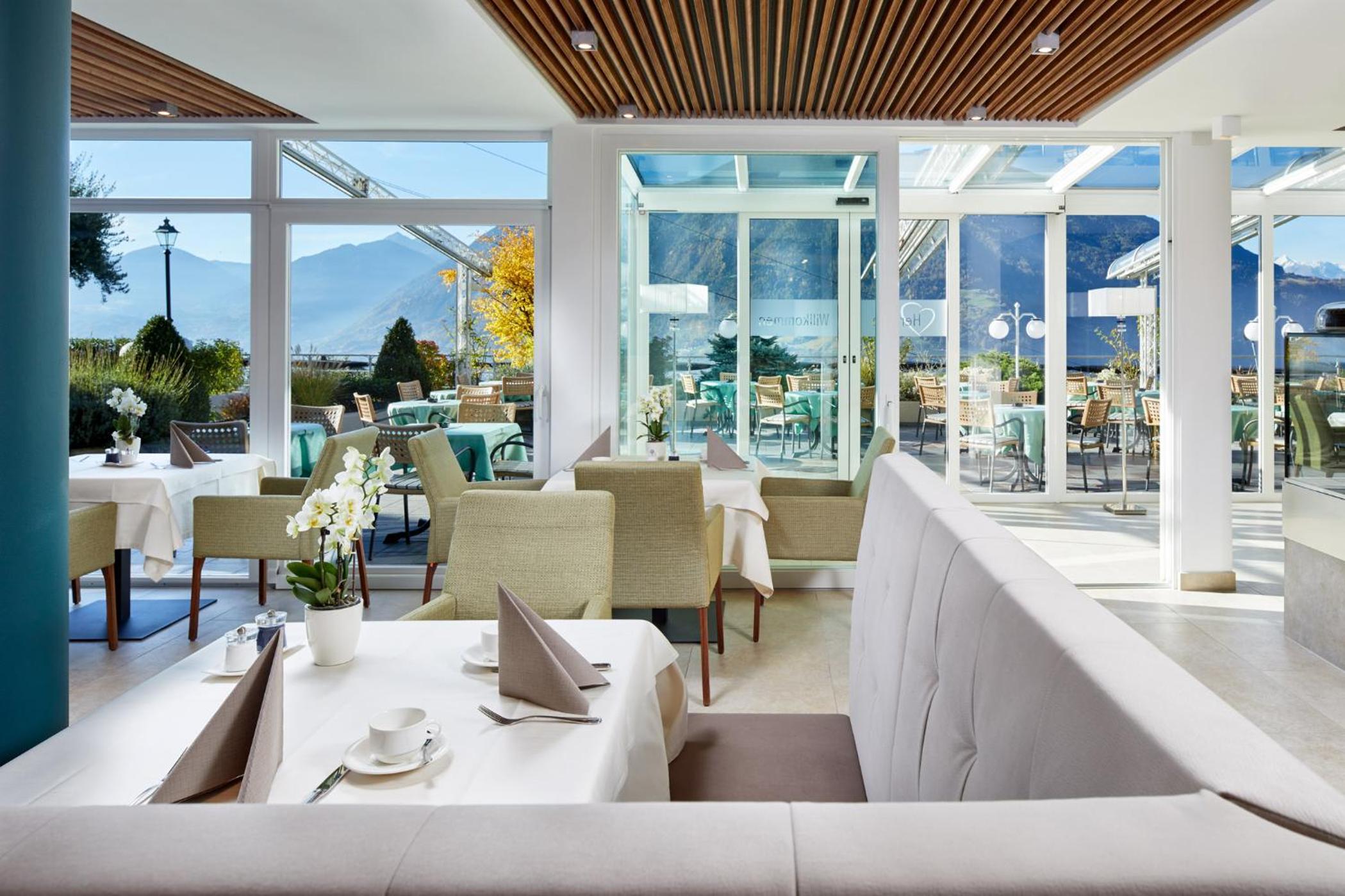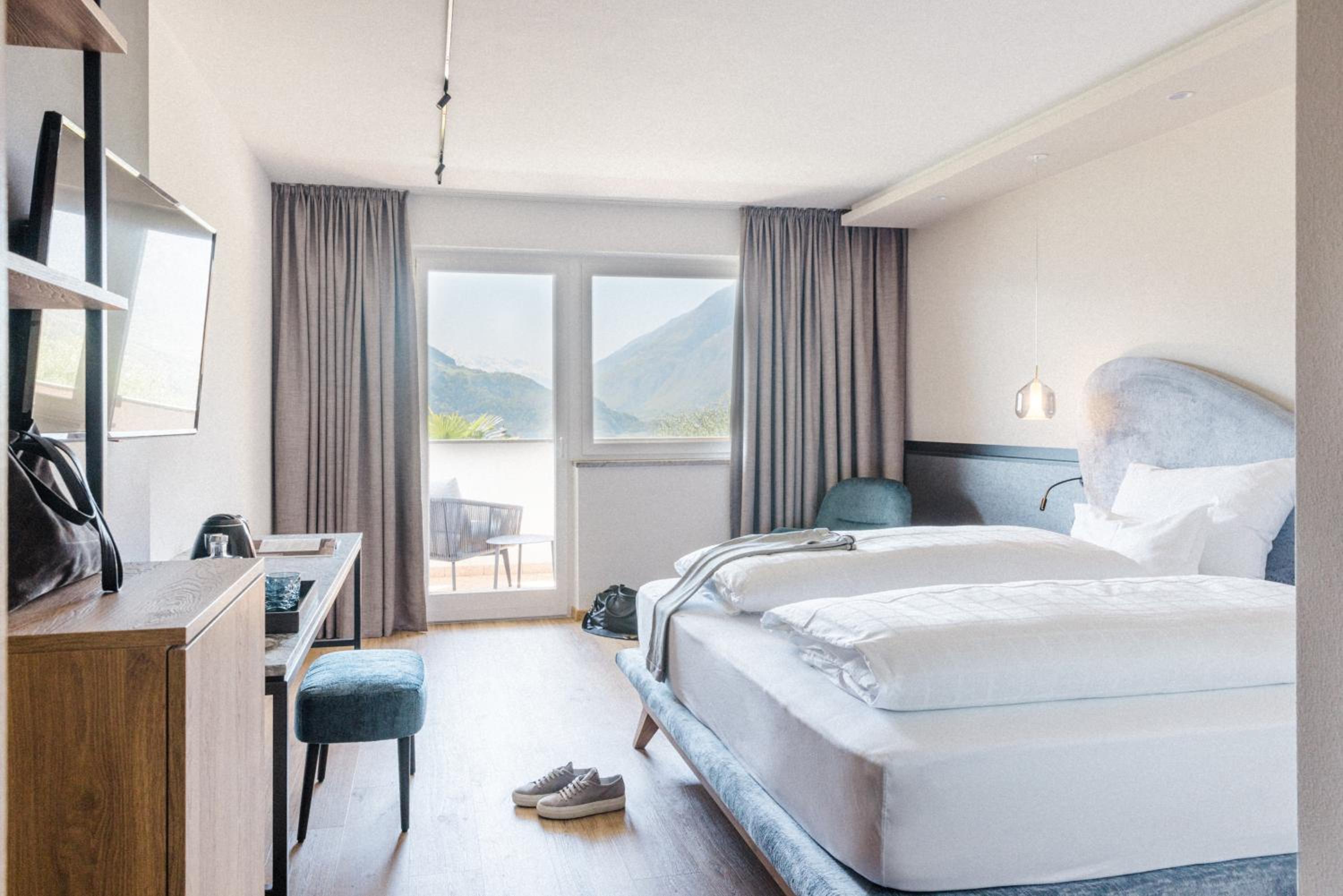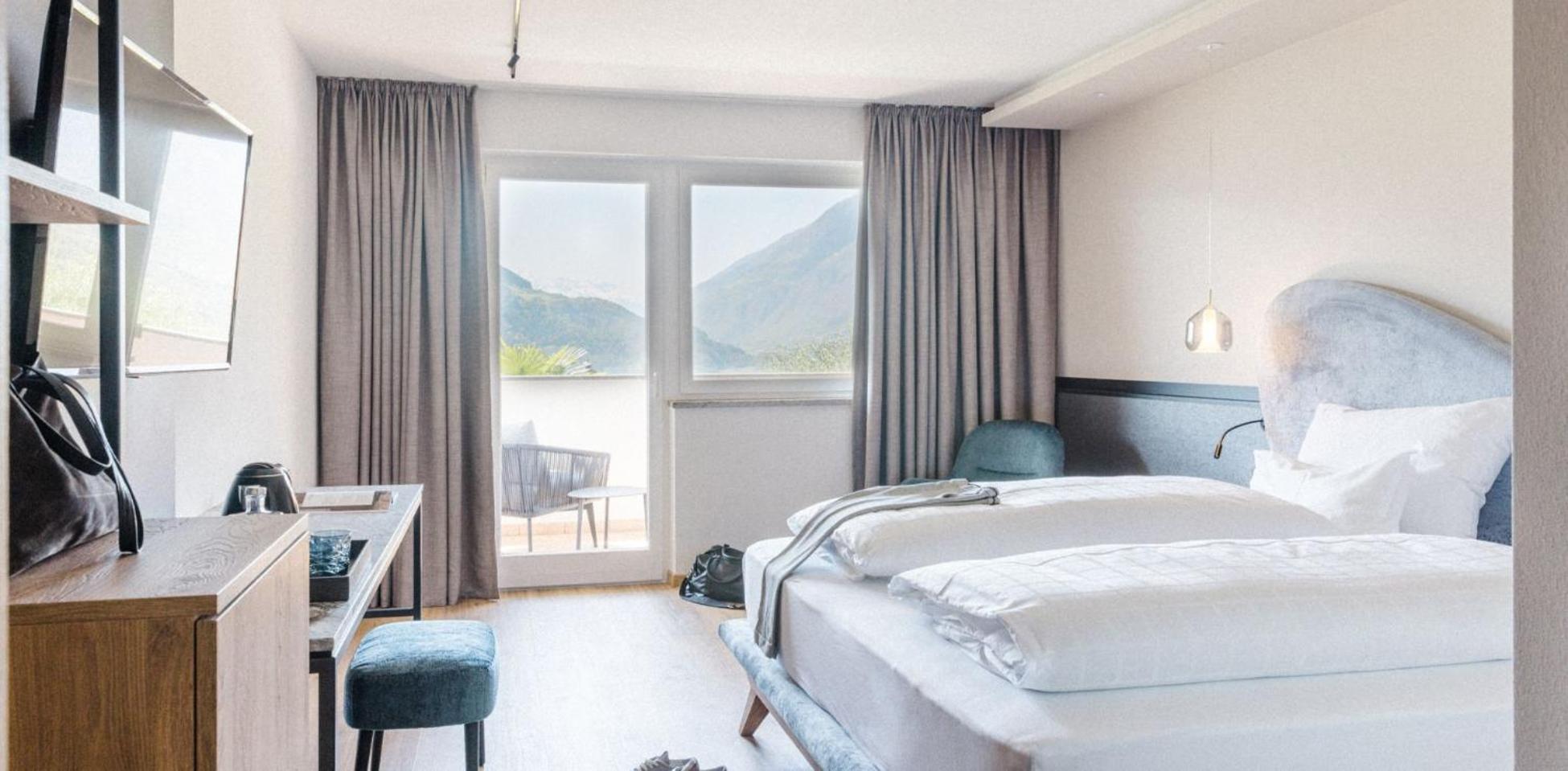 Luxurious Accommodation: Hotel Paradies in Tirolo offers air-conditioned rooms with modern amenities like a coffee machine, minibar, and flat-screen TV. Some rooms even boast stunning city views and balconies for a relaxing stay.