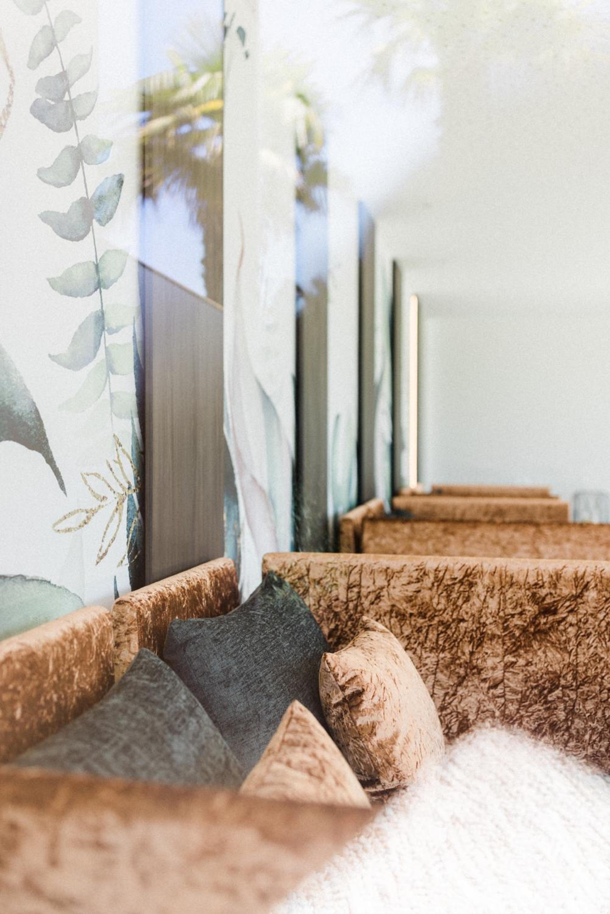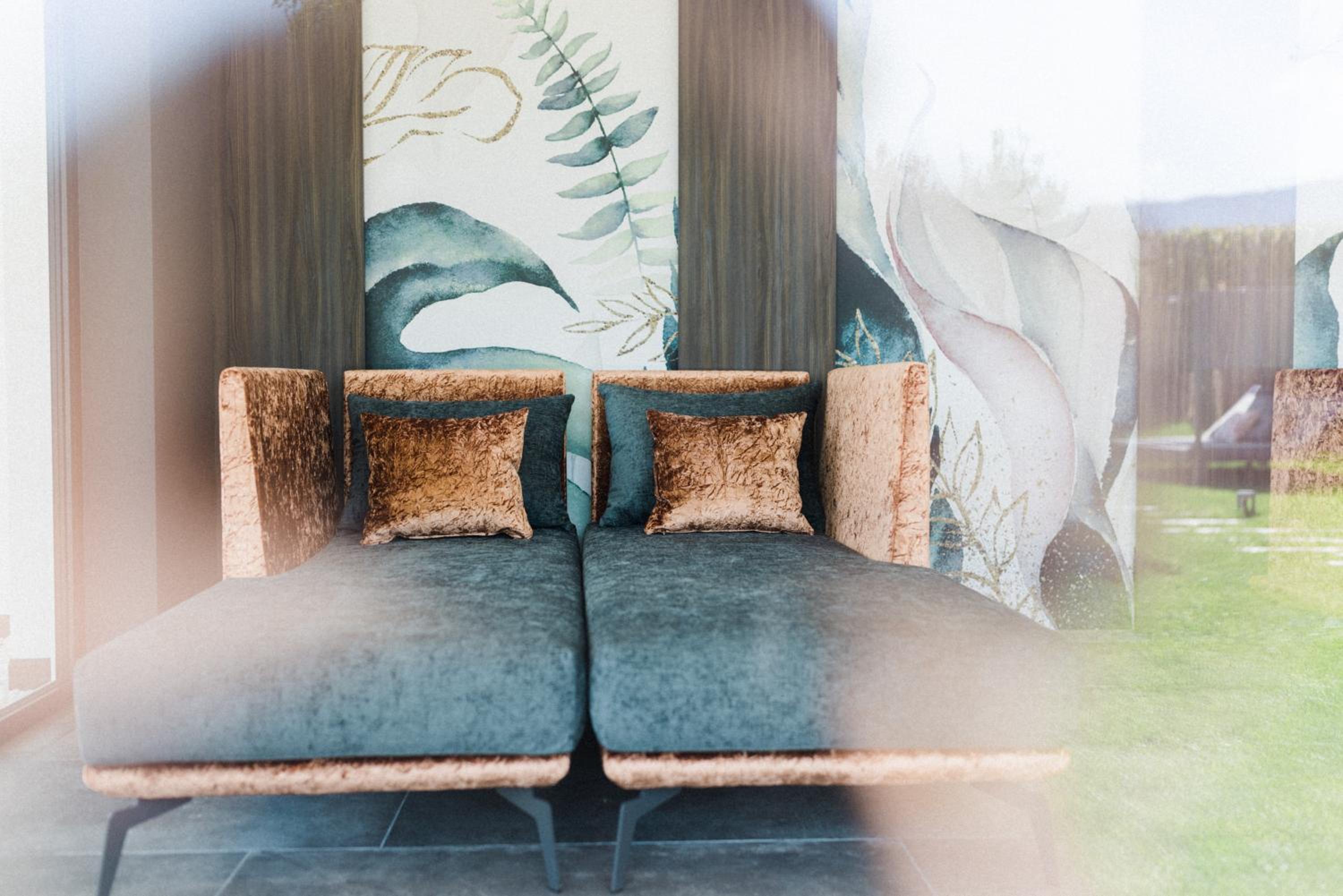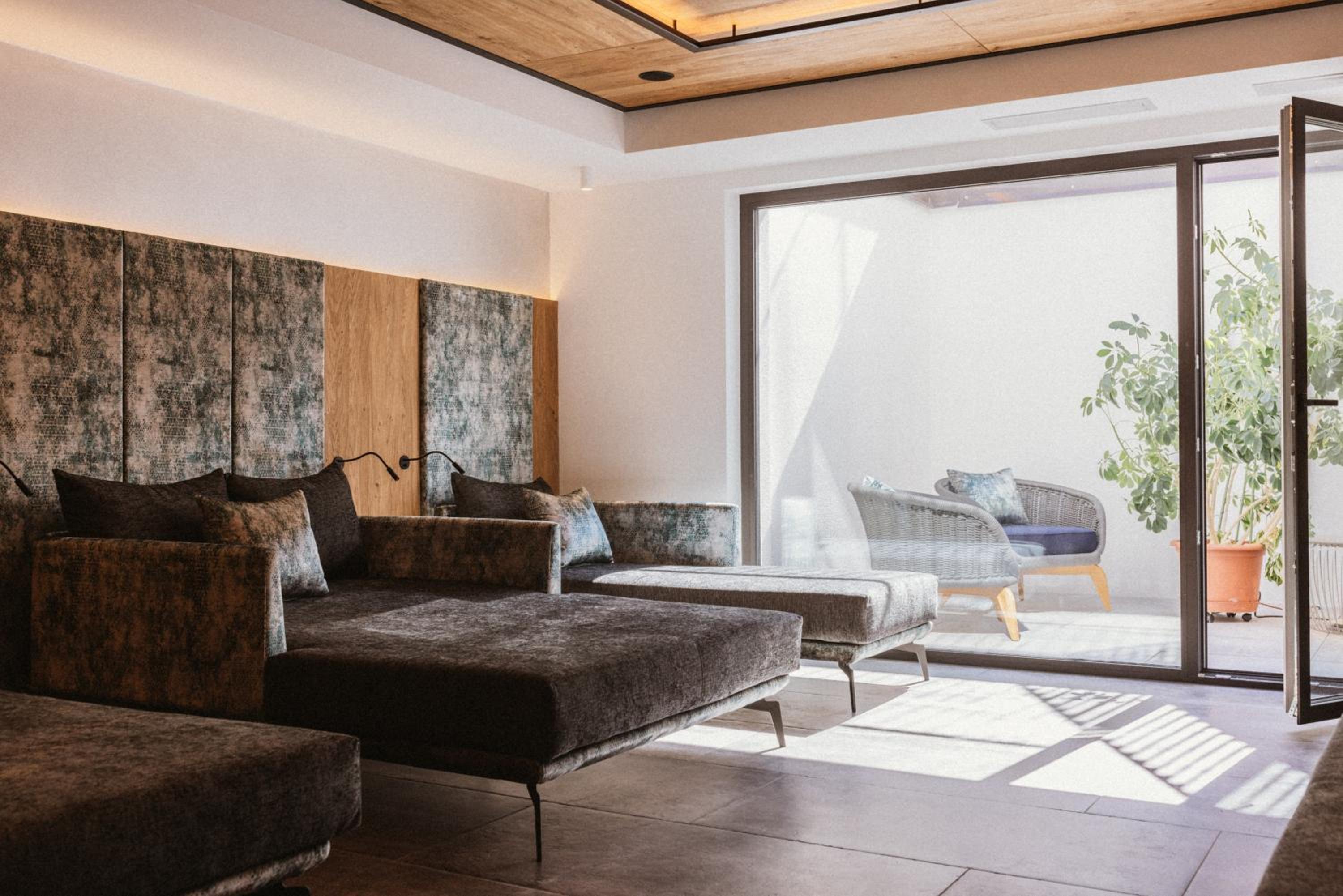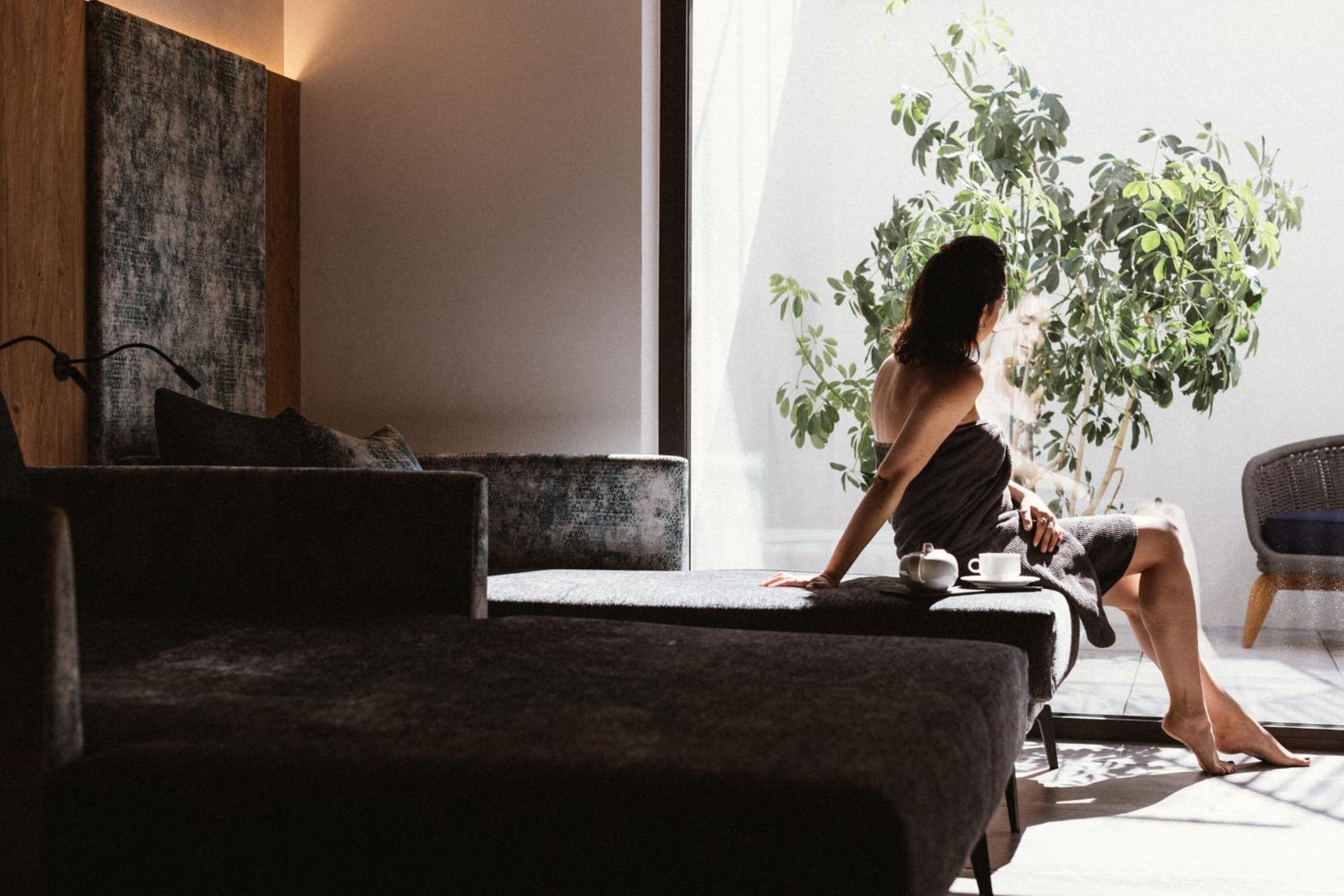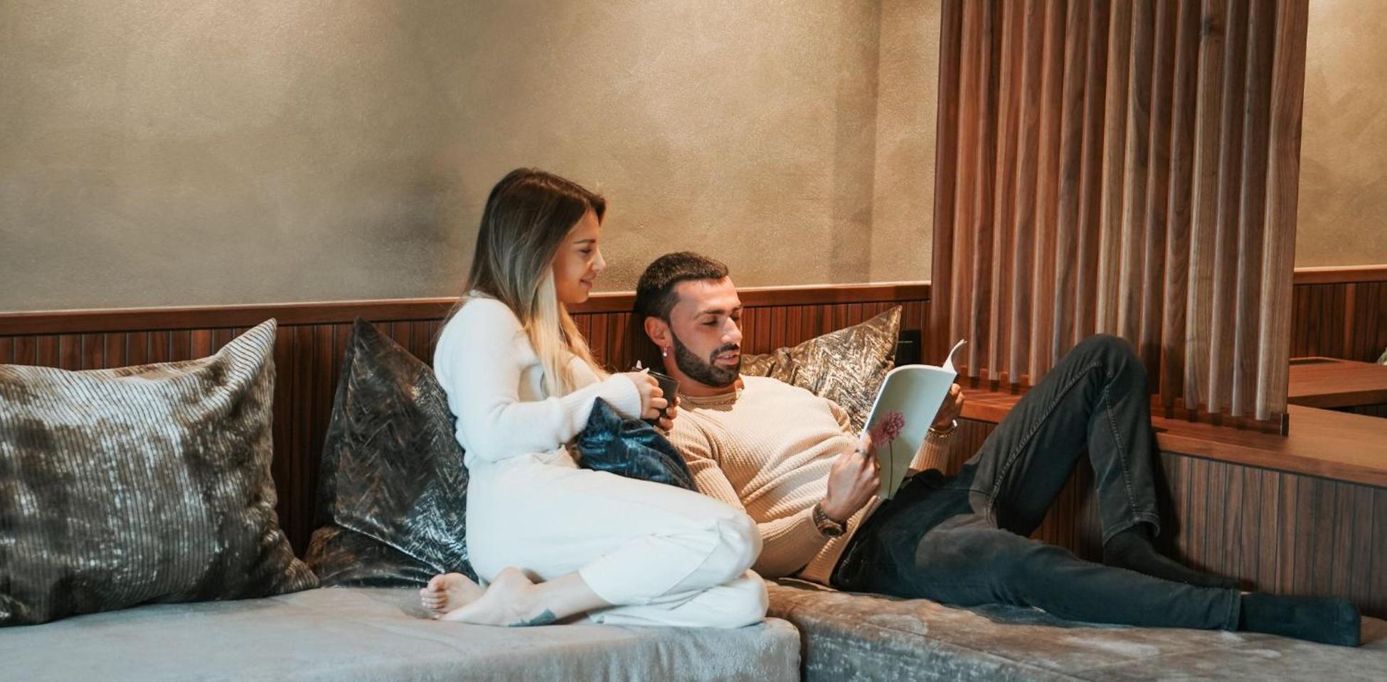 Spa con sauna e bagno turco, angolo tisana e zona relax con divanetti.
