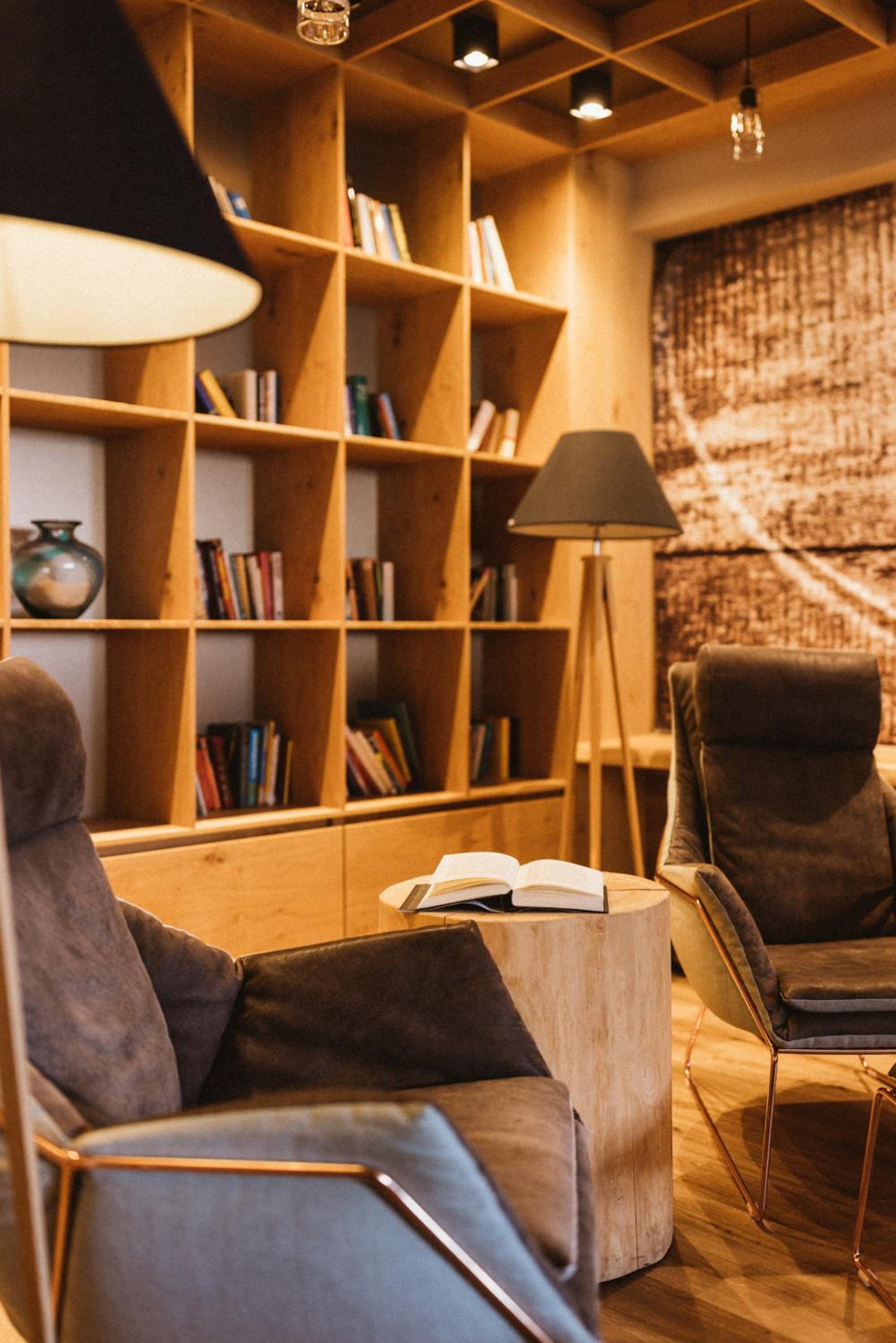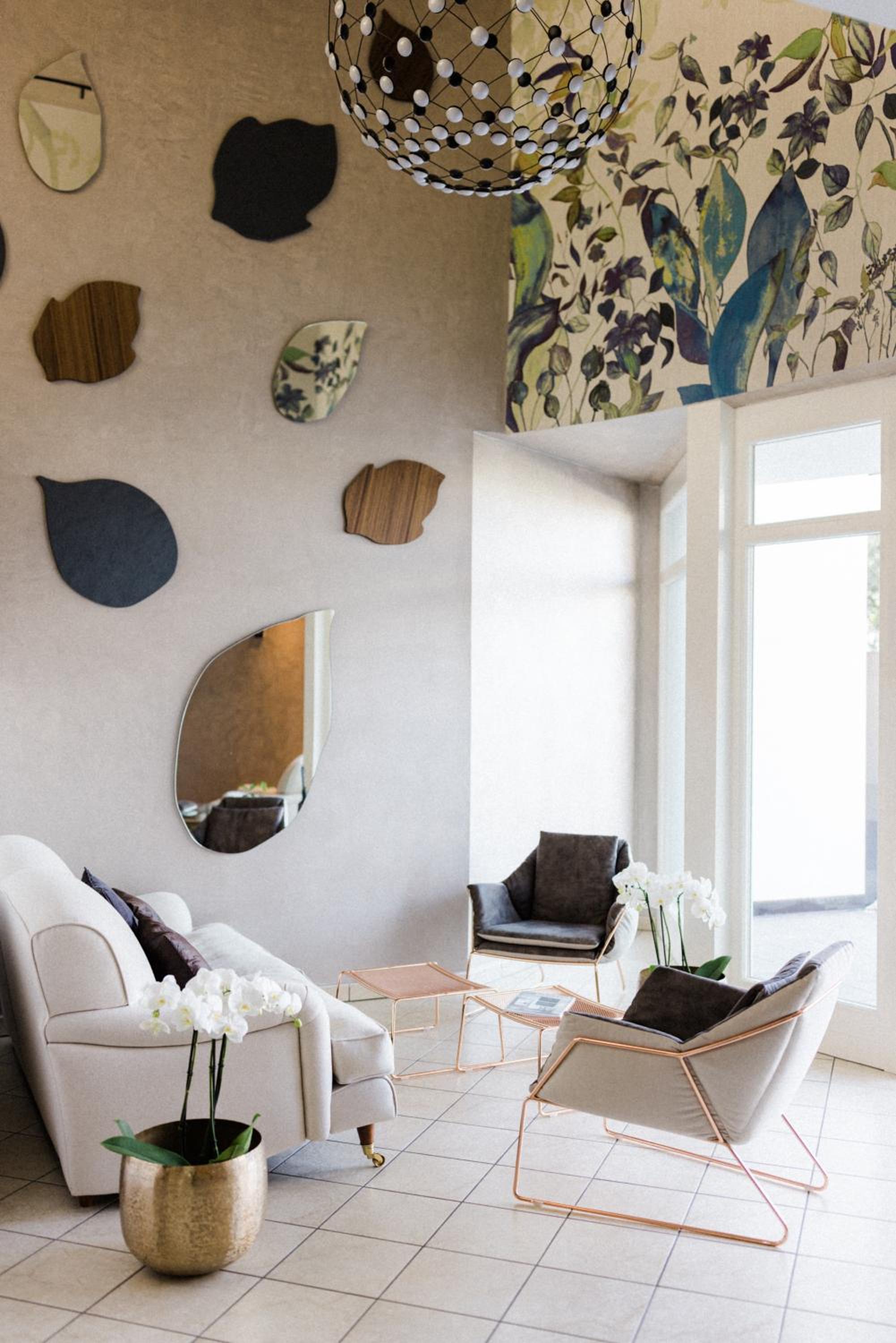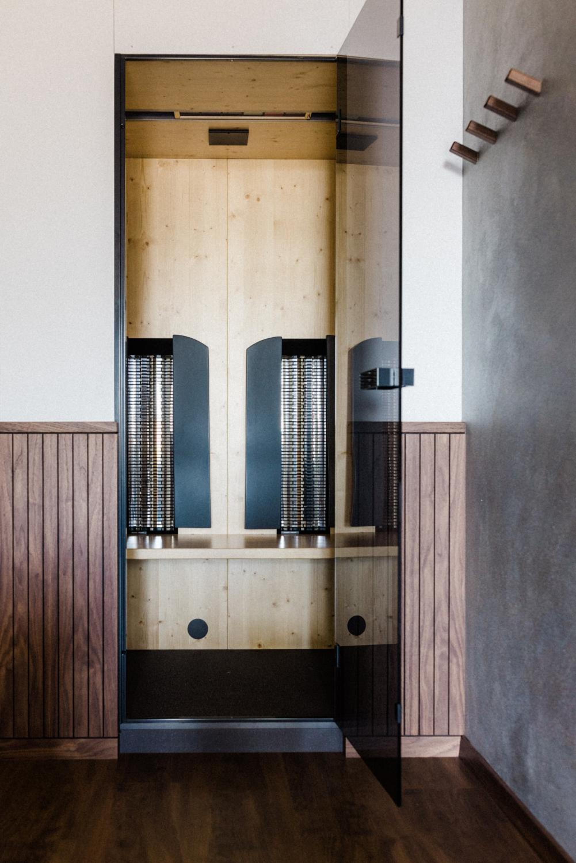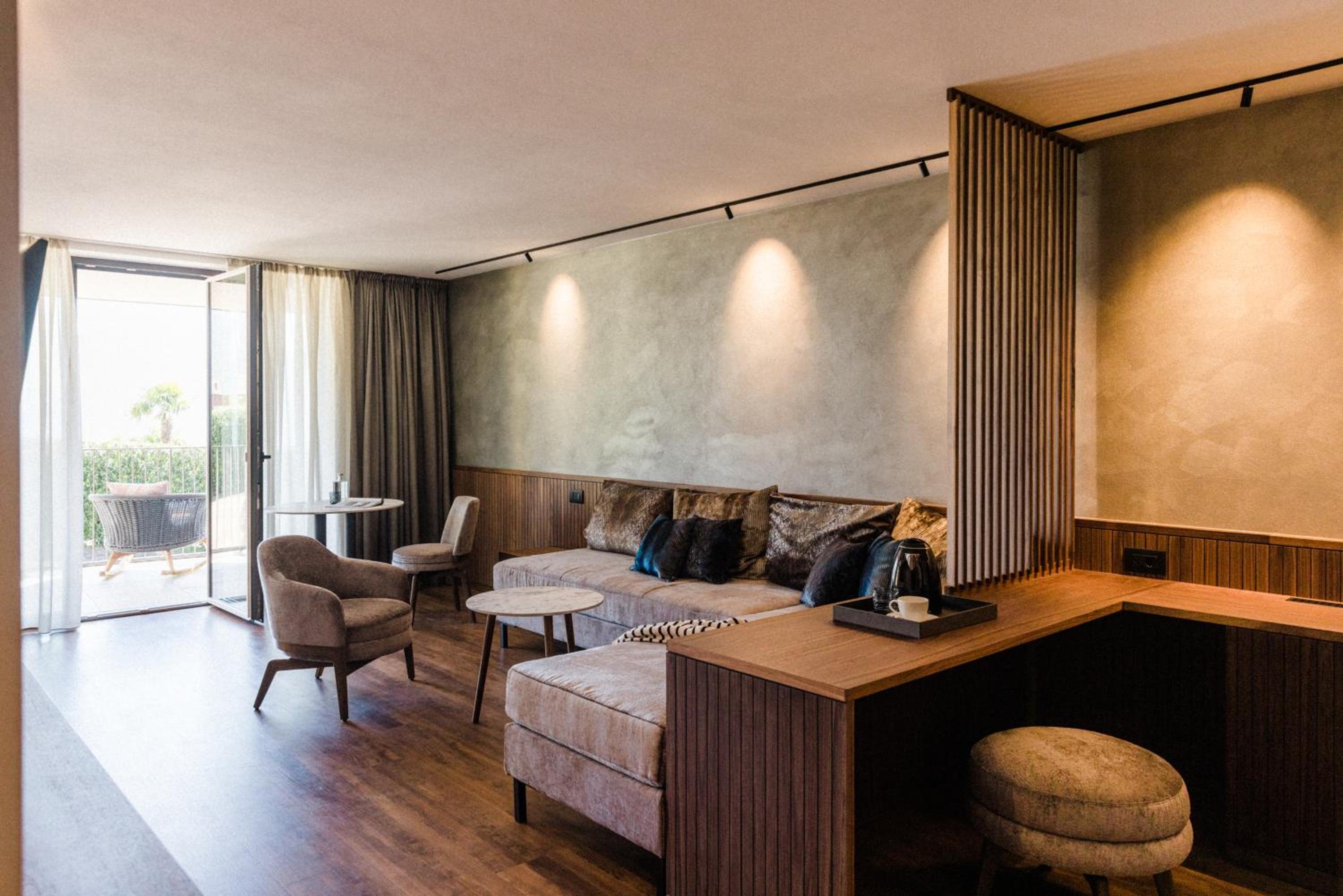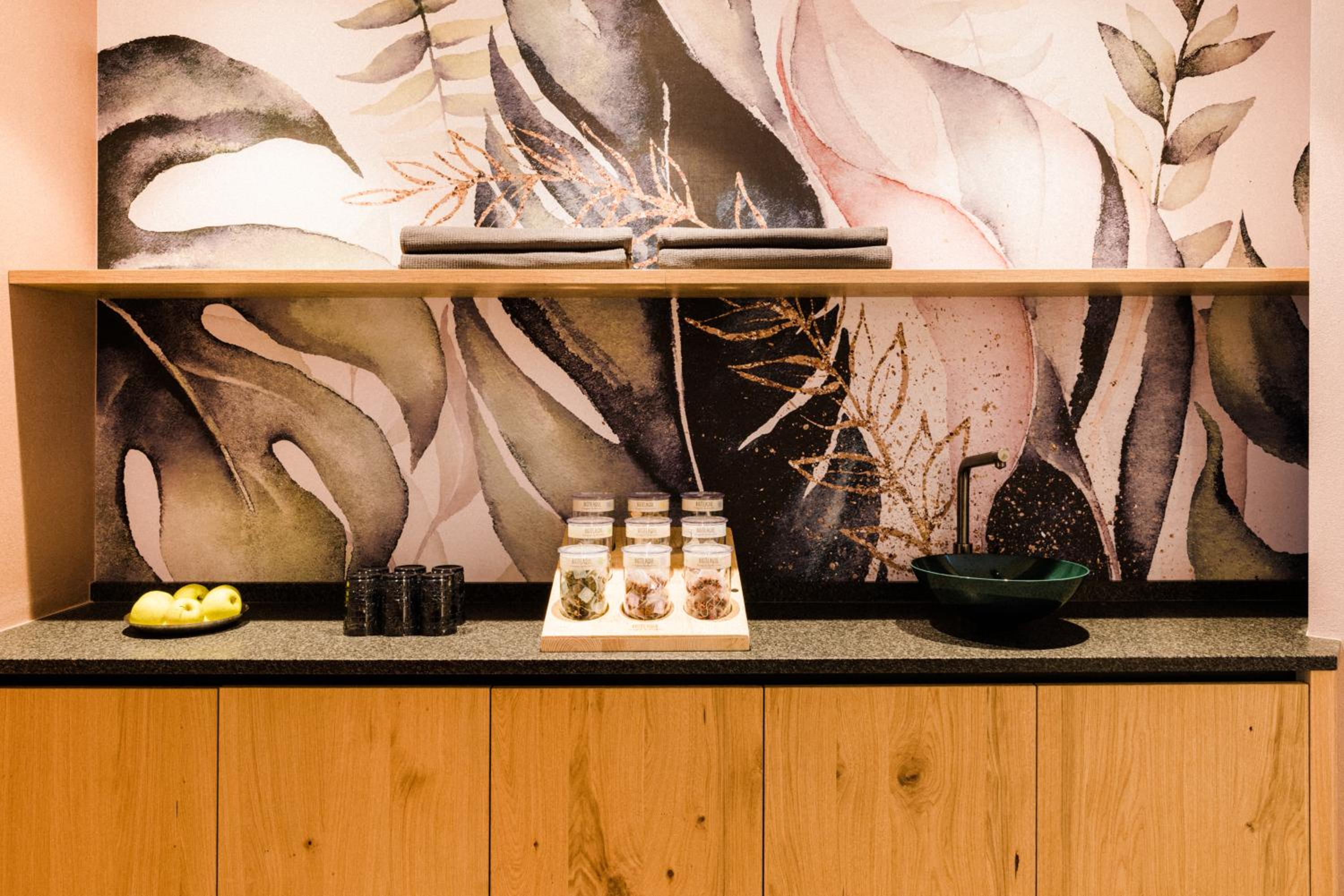 Spa con sauna e bagno turco, angolo tisana e zona relax con divanetti.