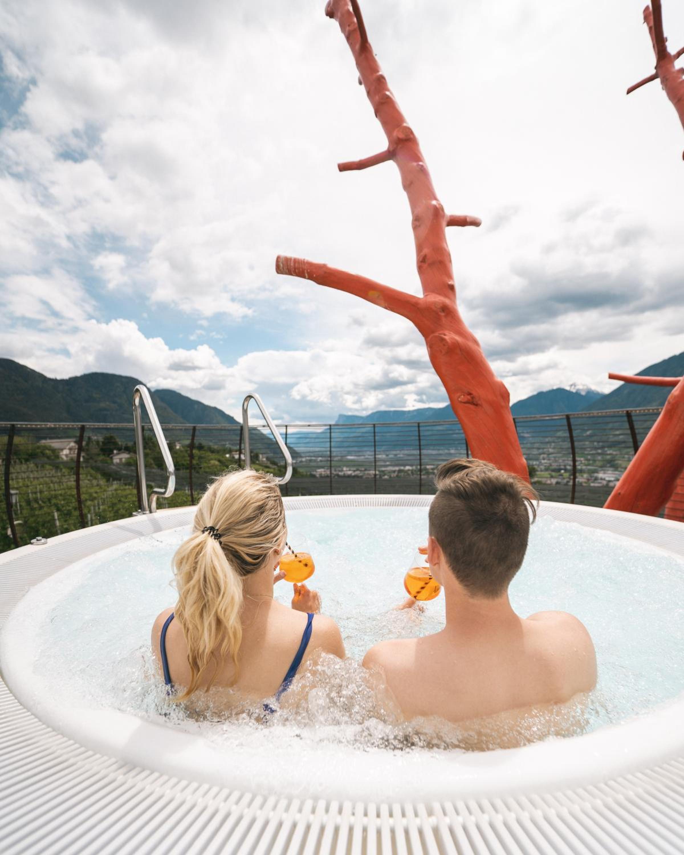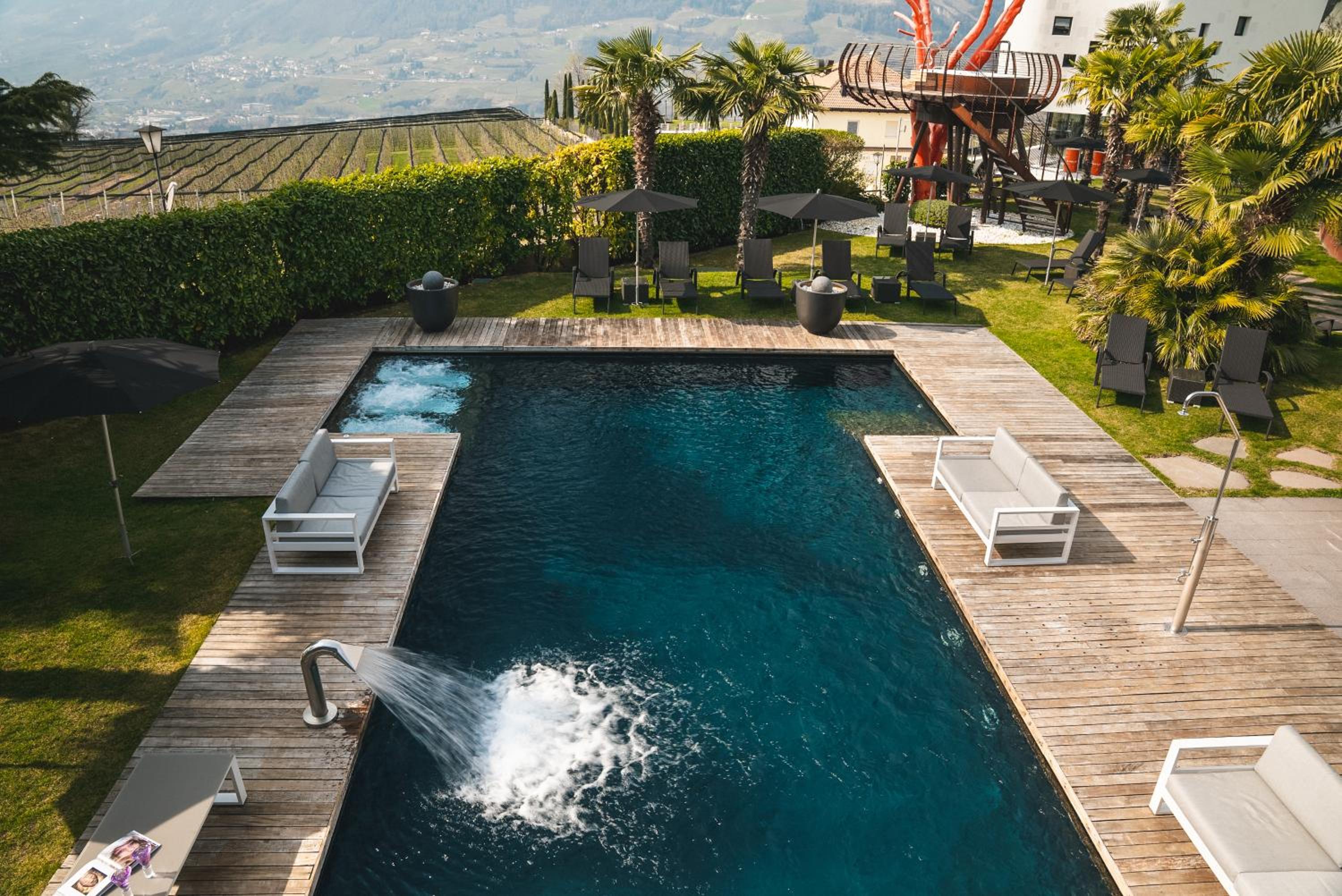 Designhotel Gartner in Tirolo offers a 4-star experience with an outdoor pool, fitness center, and spa facilities. The air-conditioned rooms feature modern amenities and some provide beautiful pool views. Guests can enjoy a Turkish bath and explore the scenic surroundings through hiking and cycling.