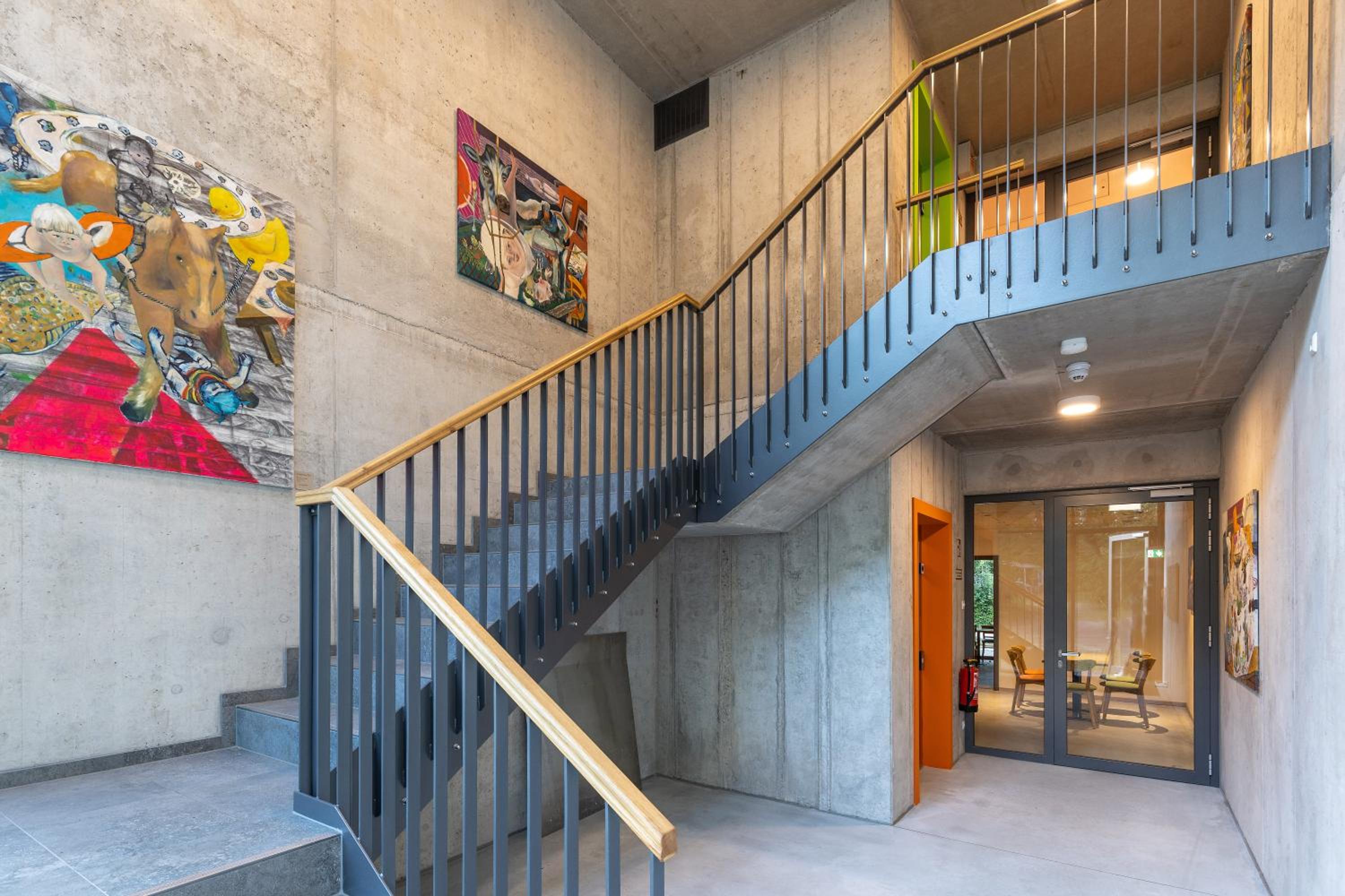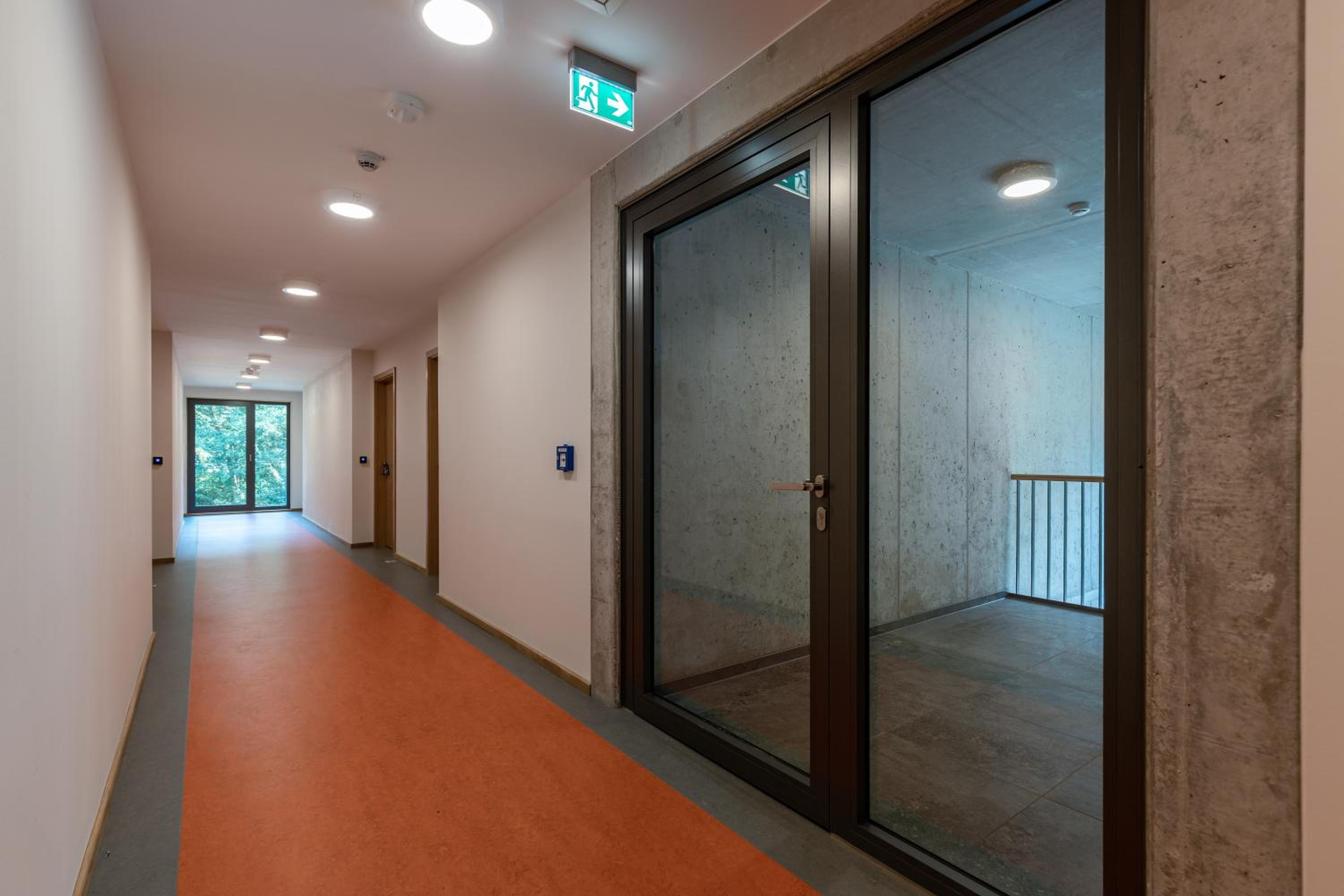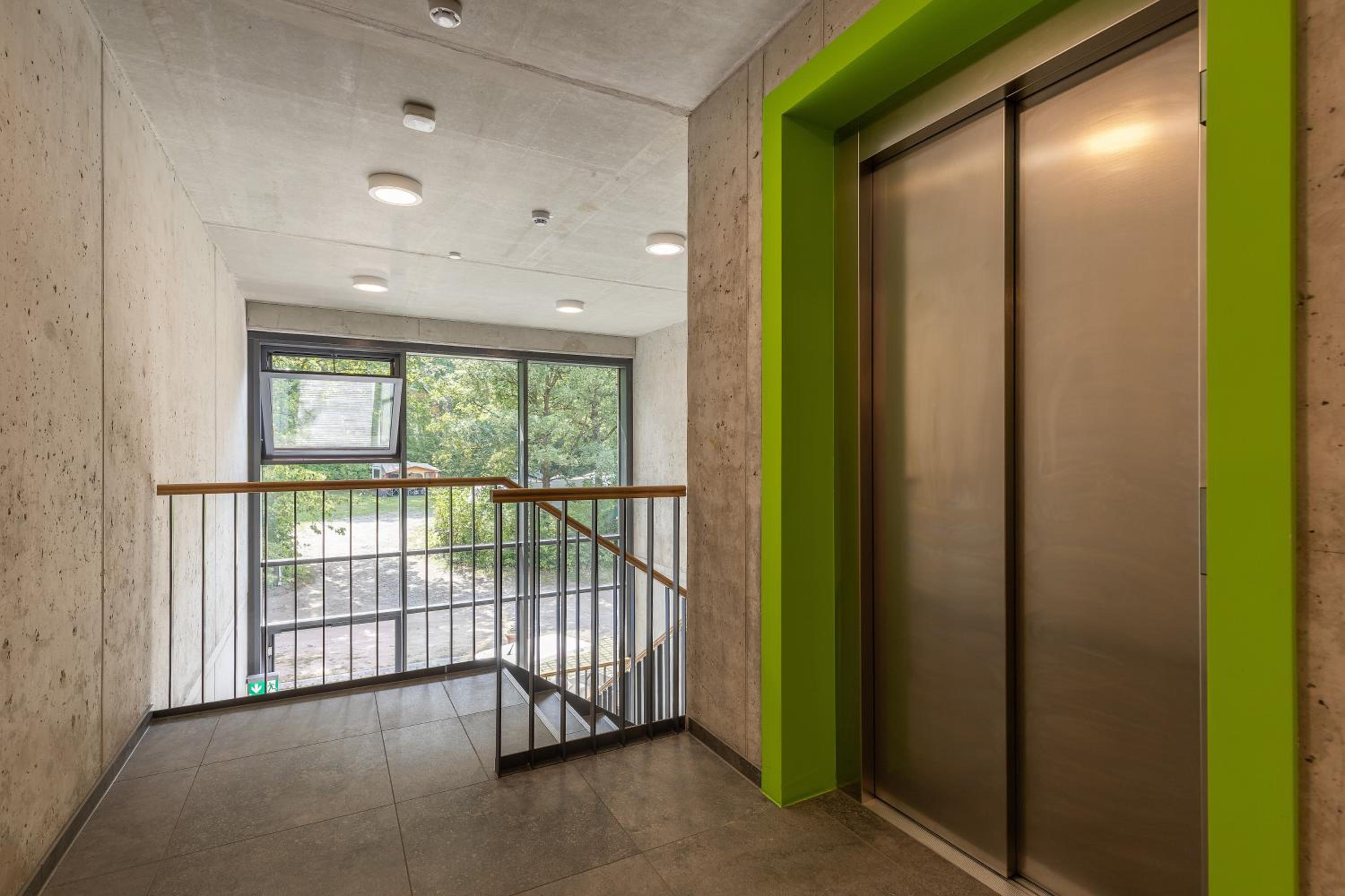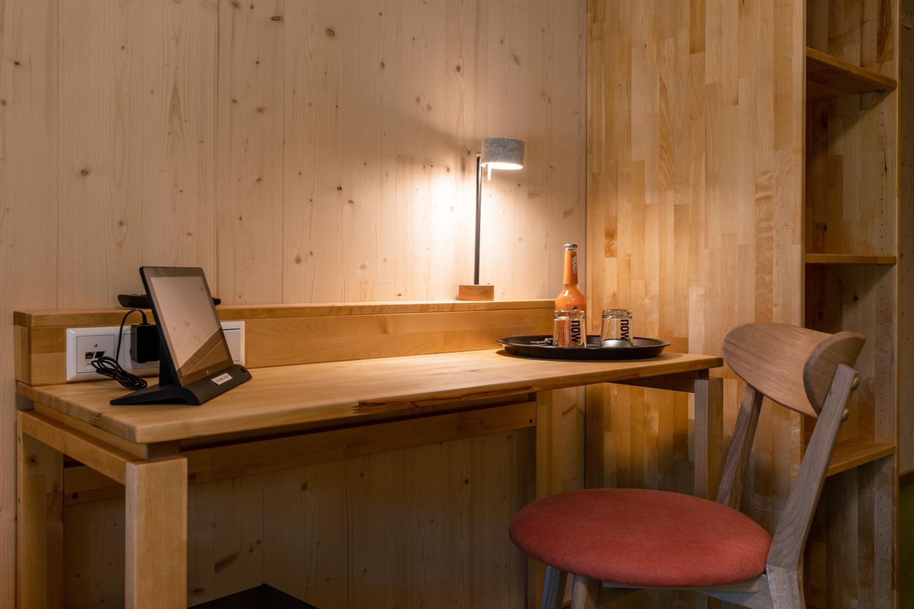 Die Zimmer befinden sich im Bau der Rezeption, welche man durch den Bioladen betritt. Das Zimmer selbst wirkt wie der Mattenabstellraum in einer Turnhalle. Schon beim Betreten des Treppenhauses und dem Flur der Zimmer fühlt man sich wie in einer Turnhalle, statt wie in einem Hotel. Dieser Eindruck setzt sich im Zimmer fort. Das gesamte Gebäude ist innen mit Sichtbeton ausgestattet, der Fußboden mit einem Turnhallen-Fußbodenbelag ausgekleidet. So riecht es auch im gesamten Gebäude. Das Ambiente ist kalt und die Akustik entsprechend der glatten Betonflächen. Der gesamte Eindruck strahlt keine Gemütlichkeit oder Behaglichkeit aus. Es gibt kein Restaurant. Als Teil des Bioladens gibt es einen Imbiss mit sehr begrenzter und überteuerter Speisenauswahl (einfache Currywurst mit Pommes für knapp 16 €), welcher auch lediglich bis 19 Uhr geöffnet hat.