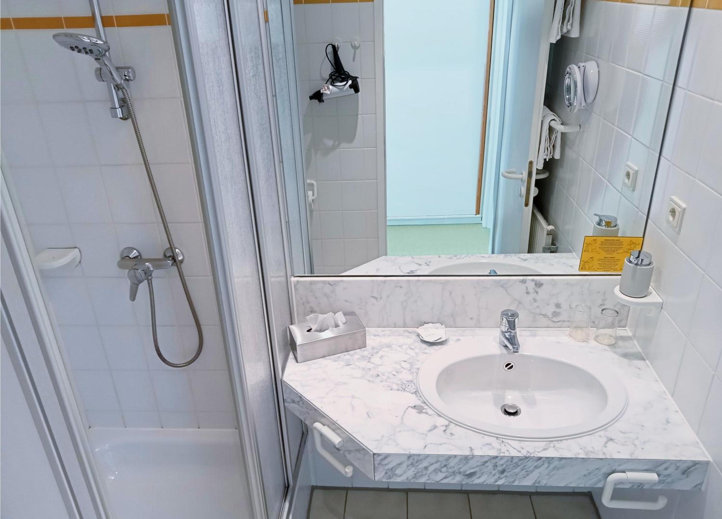 Die in mittlerweile auch in vielen anderen Hotels eingebaute Milchglas-Schiebetür zum Bad.