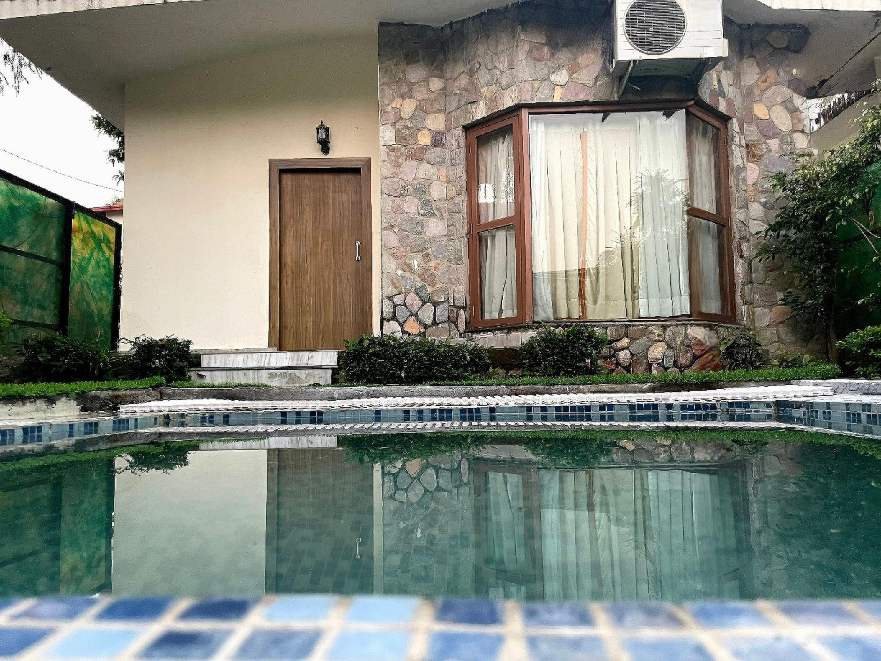 There is no bench around pool area to sit, no towel or rob after using the swimming pool. Dogs were sweetly swim in the same pool.