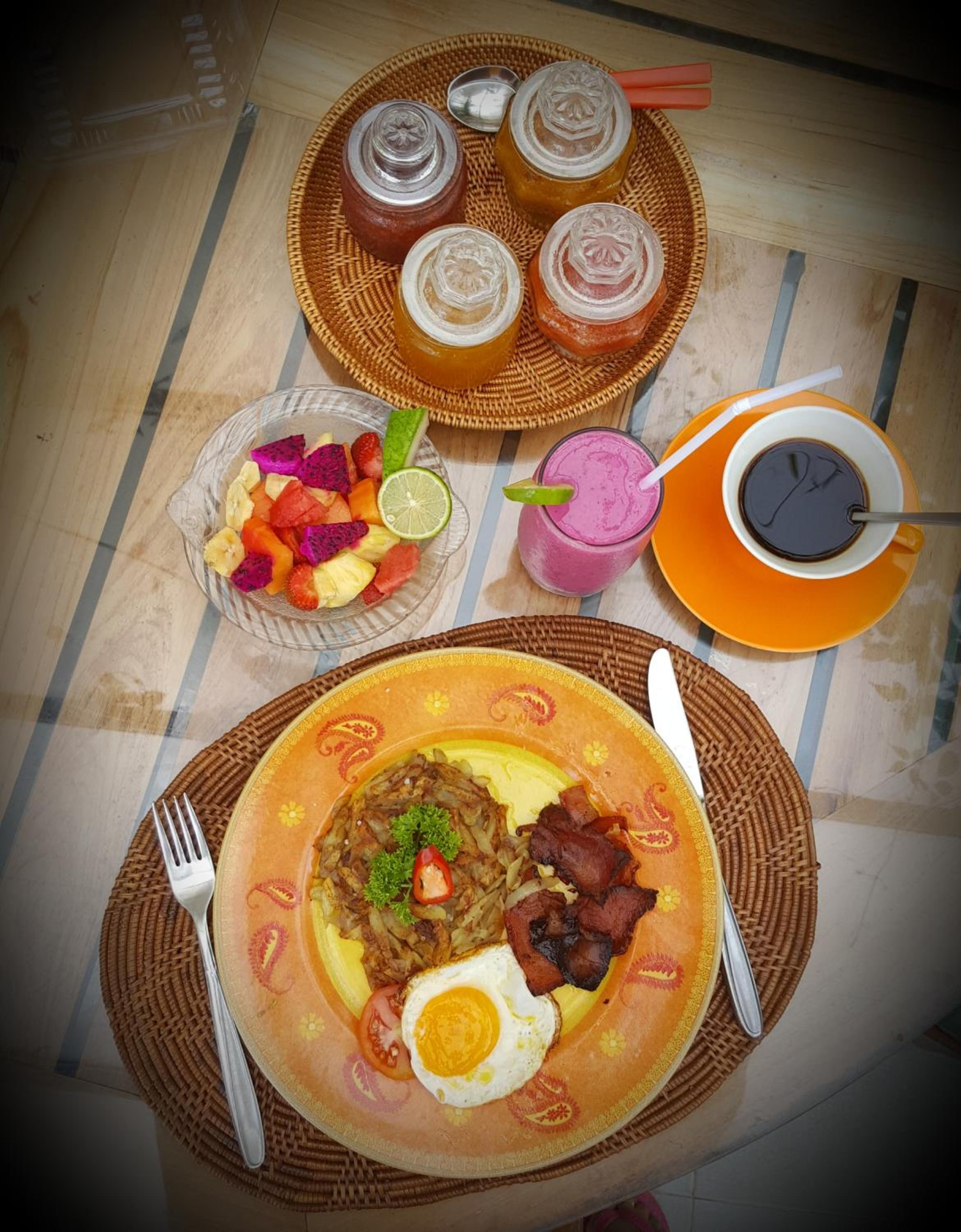 Ontbijt lekker met uitsluitend verse producten. Met zorg bereide rösti, gebakken eieren, vers fruitsap naar keuze, Bali -koffie!
