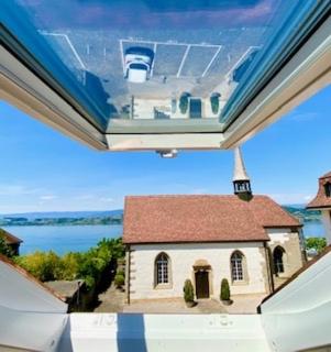 J’ai été un peu déçue par la vue sur le lac car j’imaginais une vue plus large alors qu’il y a le clocher de l’église en plein milieu et que c’est depuis une fenêtre de toit donc pas vraiment la possibilité de se poser devant le vue sur le lac.
