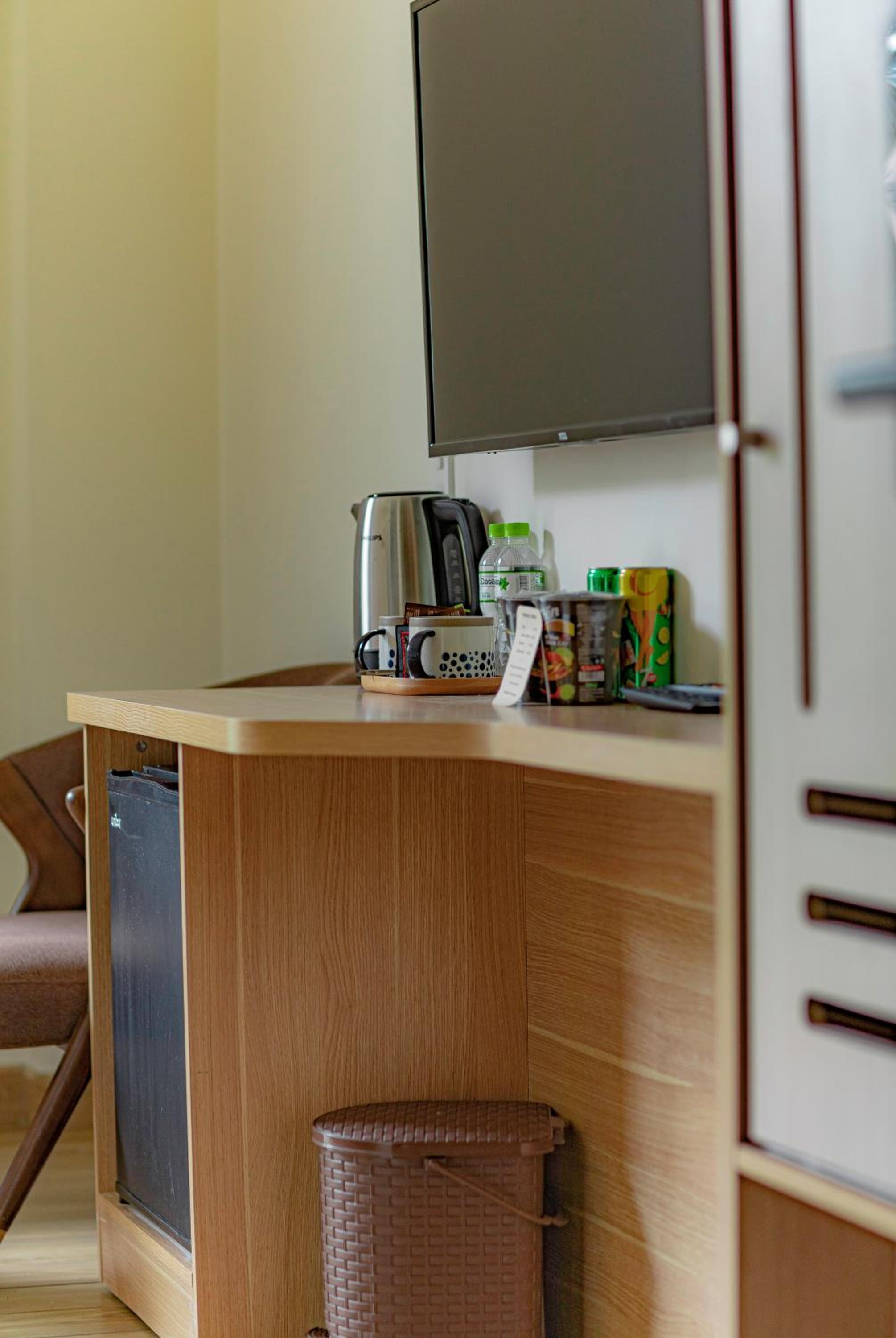 Provided iron upon request. Stand fan provided even outside cold but when we close all window and door no air circulation . So it really glad to have stand fan inside the room. 4 slipper provided and enough power socket for charging phone and etc. Also , love the light mirror in the bathroom .